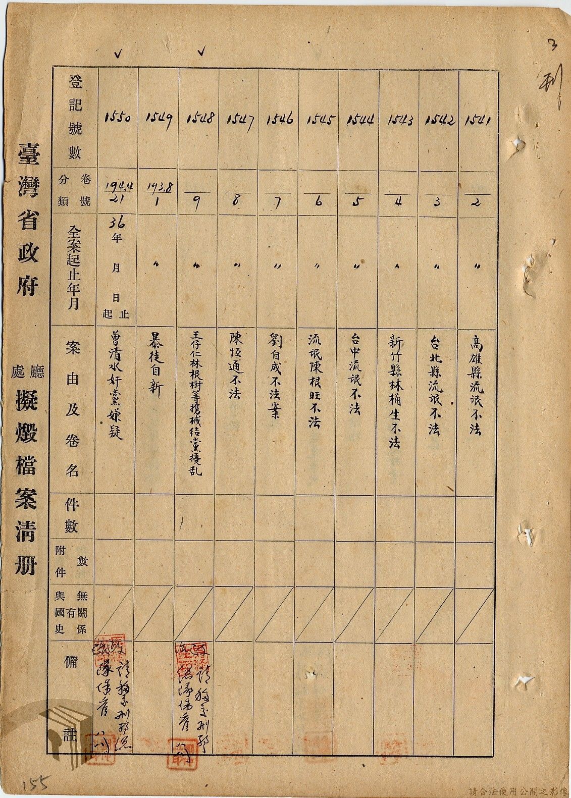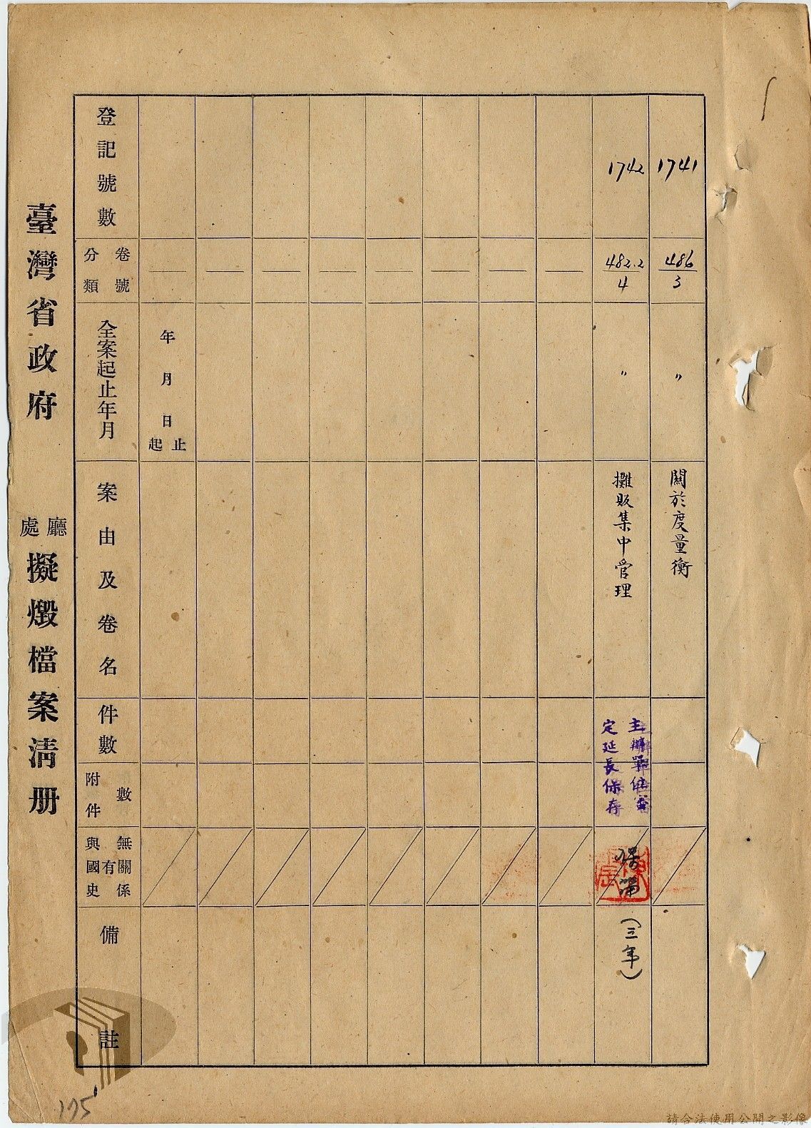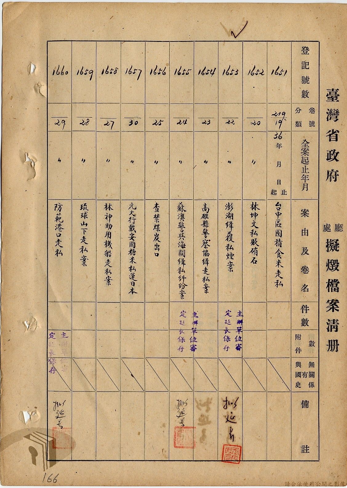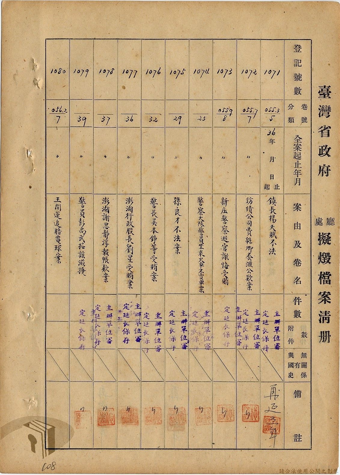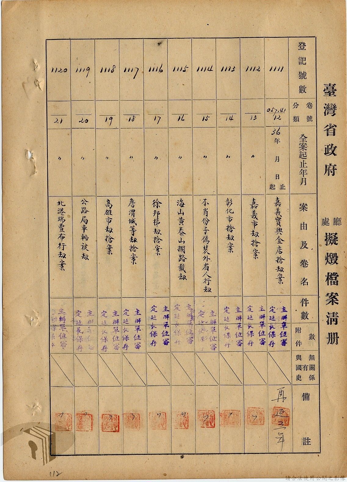 本案為35至36年間,臺灣省政府警務處銷毀檔案清冊,銷毀內容包括:規定辦公時間、推行夏令時間、各警察機關長警人數分配表、警察員工通行證、不錄用人員、警察職員錄、警務人員對調服務、現職人員投考警訓班、衛生講習班事項等。