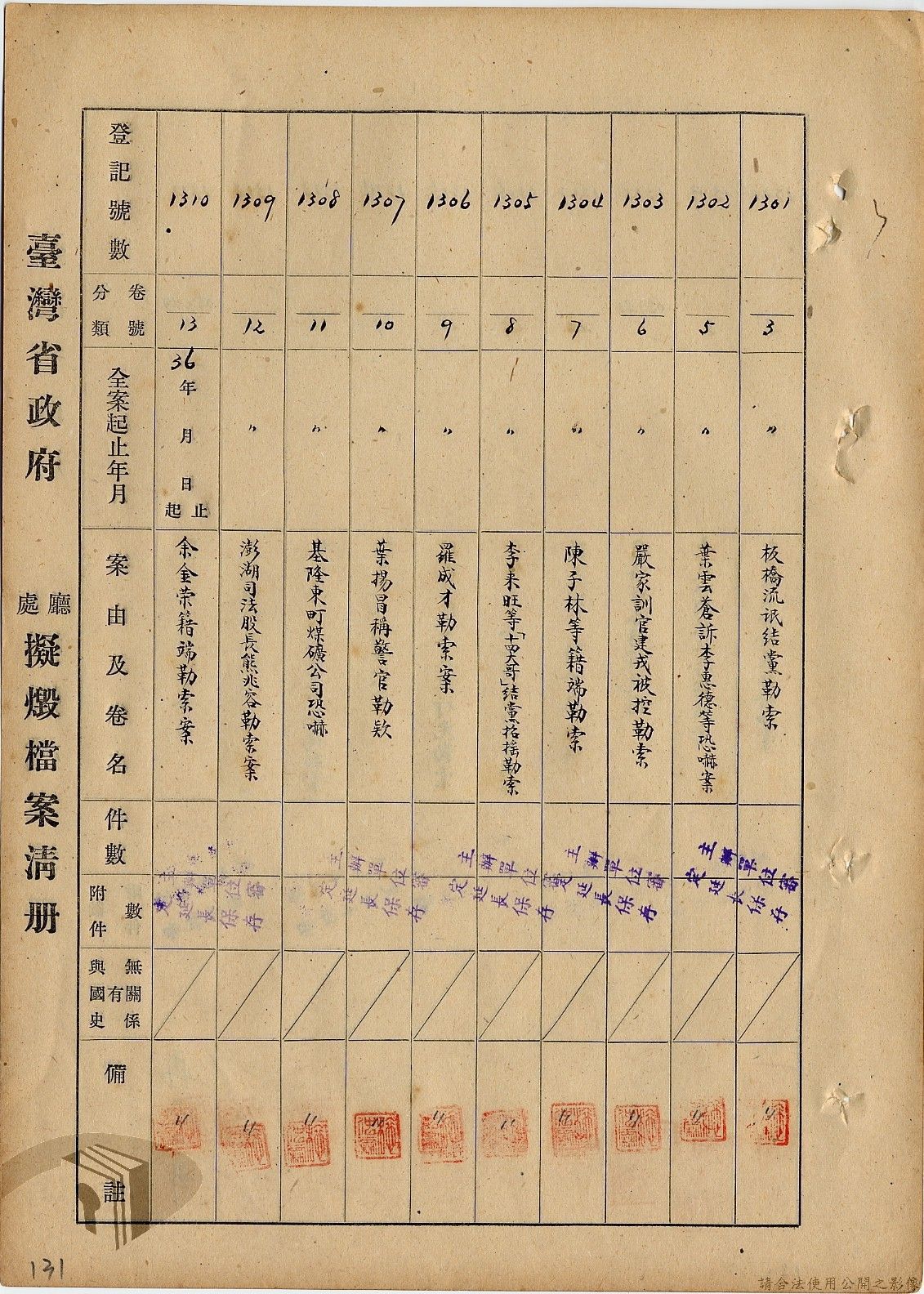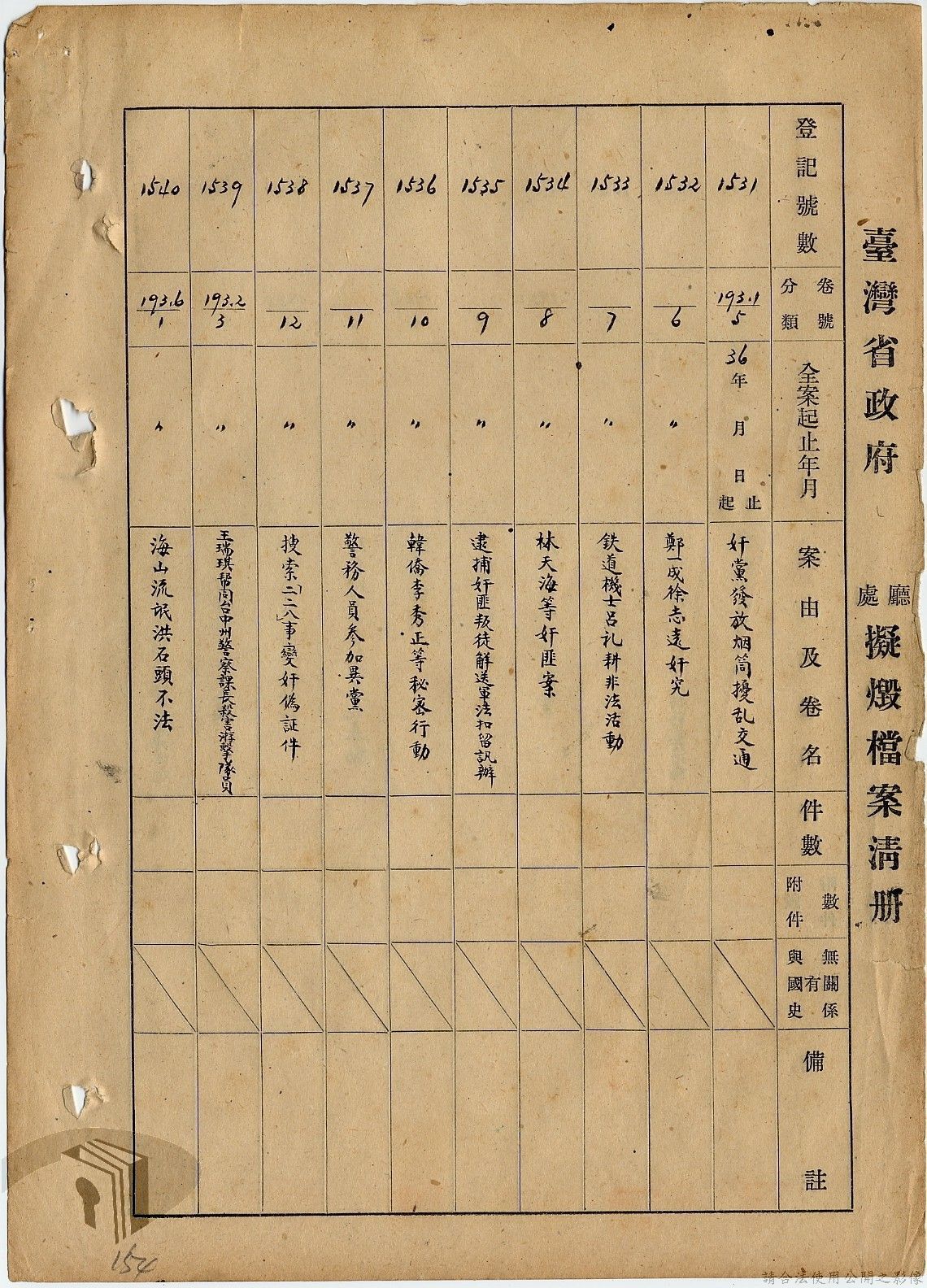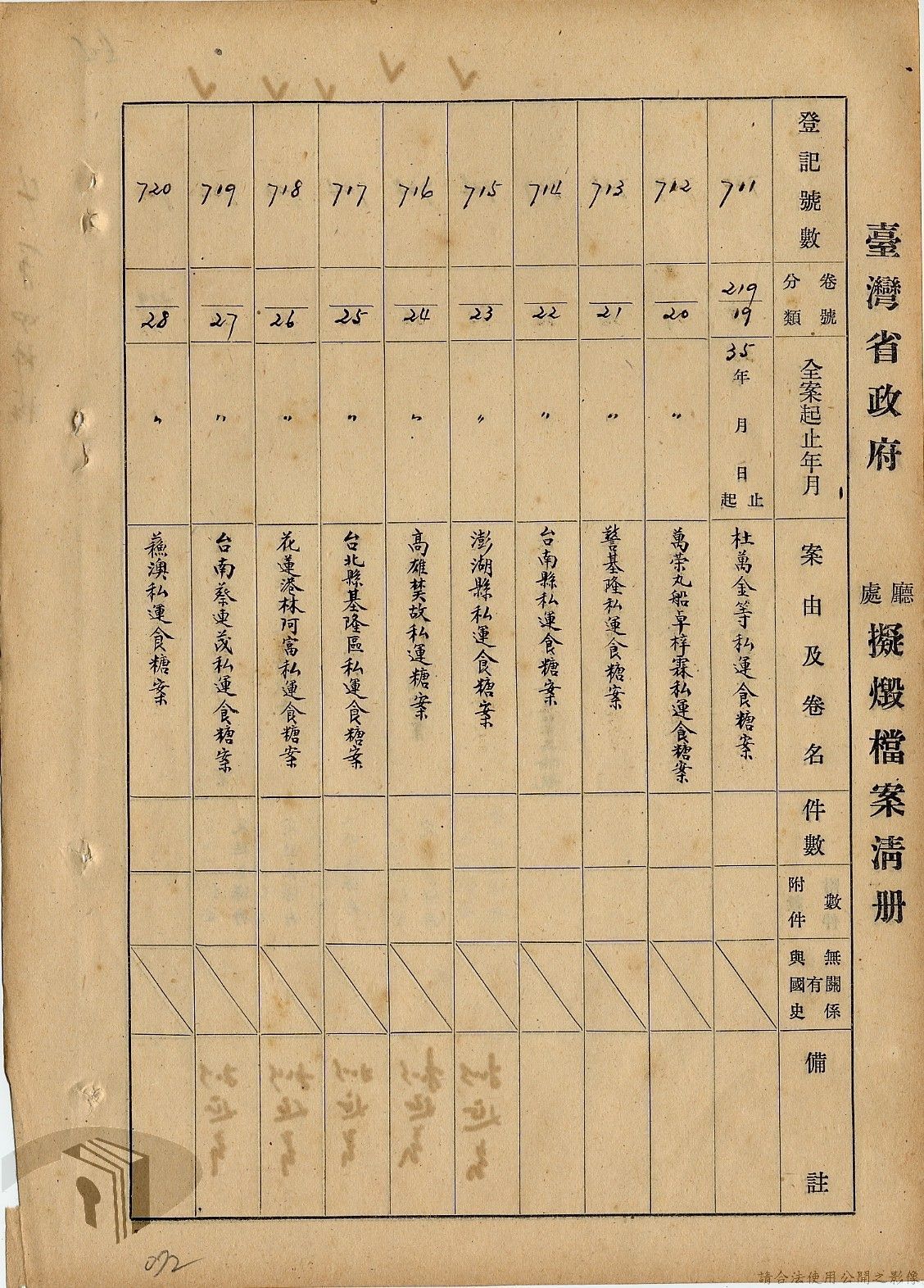 警務處擬燬檔案清冊(一)自卅五年五月份起至卅六年五月底止
