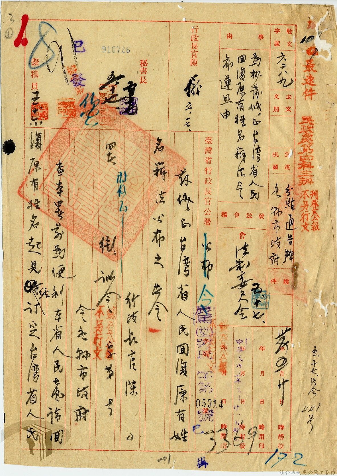 本案為35年間,臺灣省行政長官公署依行政院公布之「臺灣省人民回復原有姓名辦法」發送修改臺灣省人民回復原有姓名辦法及申請書給行政院,經行政院指示刪除申請書內「當時改為日本姓名原因」及「申請回復原姓名之條款依據」兩項後,訓令行政長官公署公布之,後行政長官公署抄發該修正辦法及申請書給各縣市政府並將其分貼各公告牌。