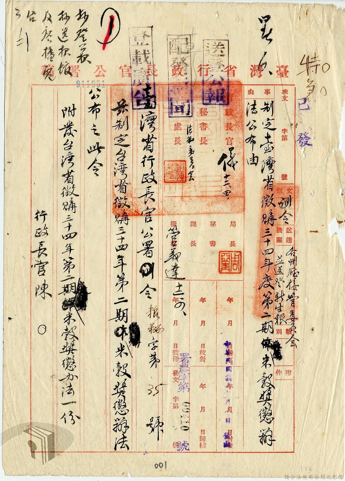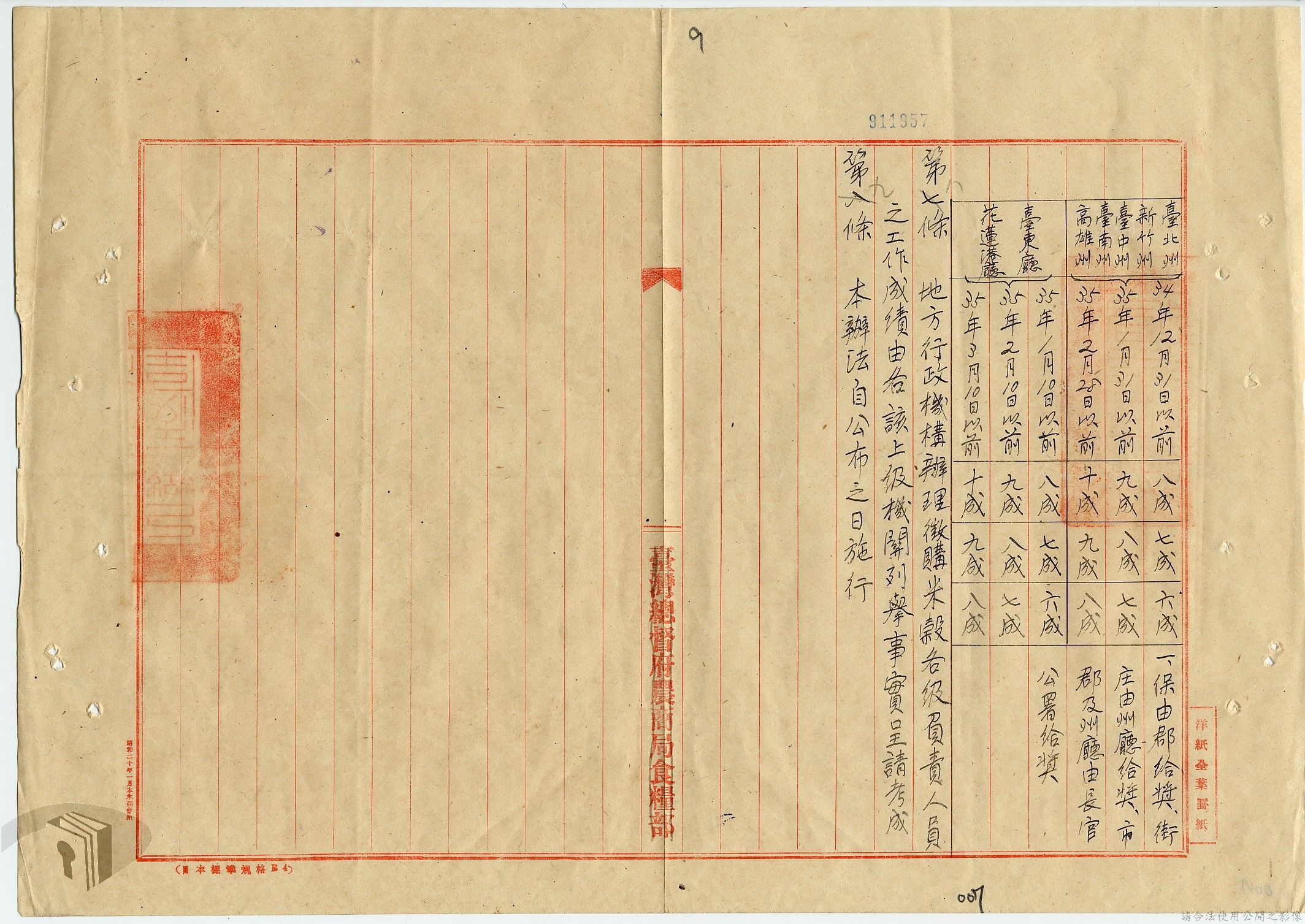 本案為34年間,臺灣省行政長官公署農林處原擬之「三十四年度第二期米榖獎懲辦法草案」因該年收穫日期較晚且需要補繳第一期欠額,故將繳納期限及競賽考核方式加以補充修正,再將修正版本陳送公署核示並獲其同意,後該署公布「臺灣省徵購三十四年第二期米榖獎懲辦法」,該辦法內容為以地域區分繳納期限,並按土地所有者、佃戶加以區分給獎辦法,以及各地方行政機構、負責人辦理徵購米榖之給獎及考核辦法等。