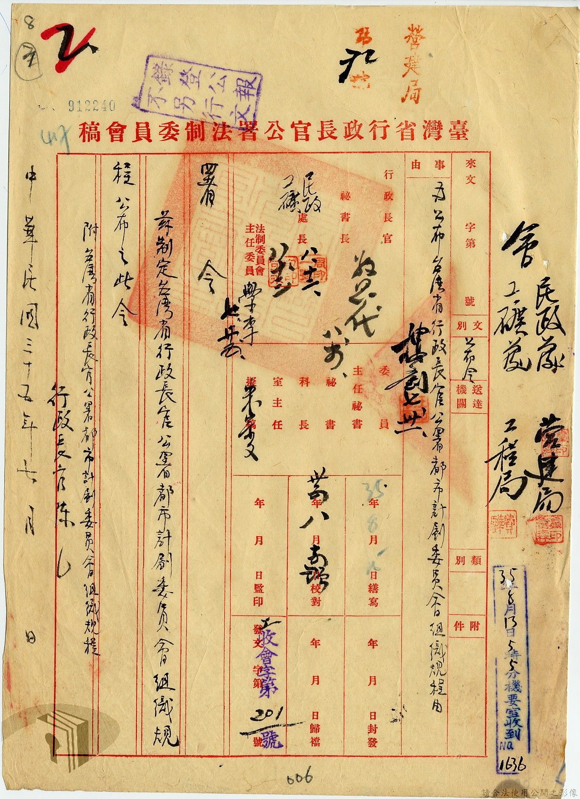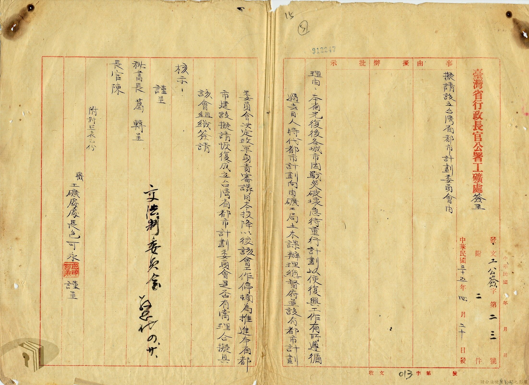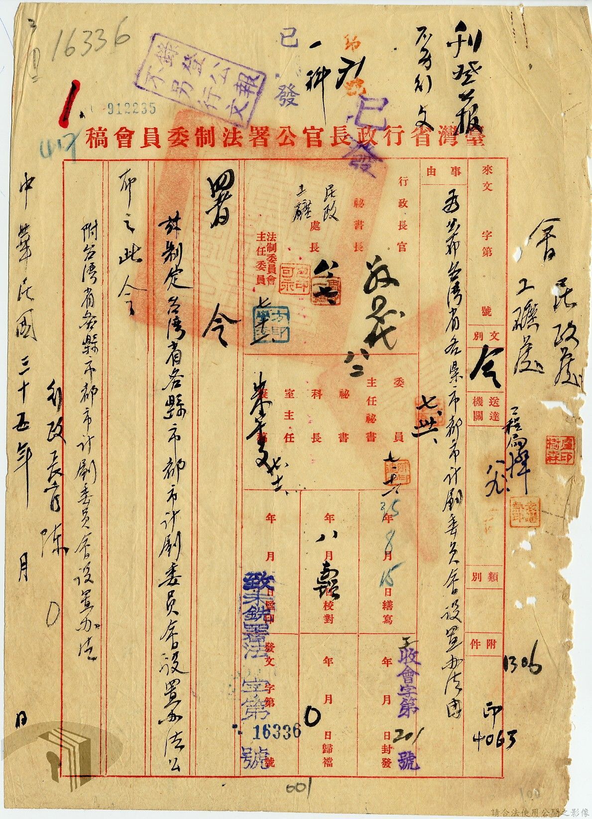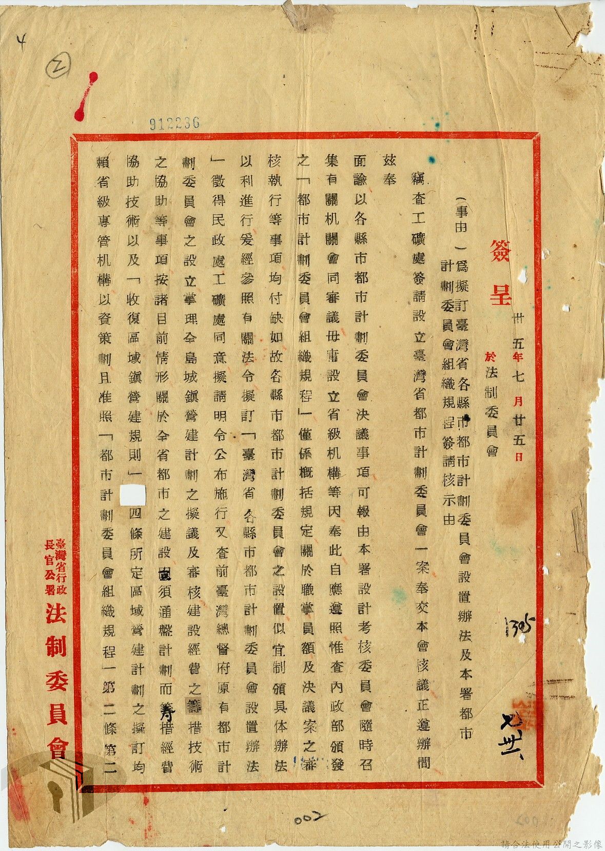 本案為35年間,臺灣省行政長官公署工礦處擬請該署設立臺灣都市計劃委員會以推動都市建設,並檢附「舊臺灣都市計劃委員會規則」、「臺灣省都市計劃委員會組織暫行條例」及試擬委員名單,後經行政長官公署法制委會研擬修正,制定「臺灣省行政長官公署都市計劃委員會組織規程」及「臺灣省行政長官公署各縣市都市計劃委員會設置辦法」,並經公署核示通過頒行。