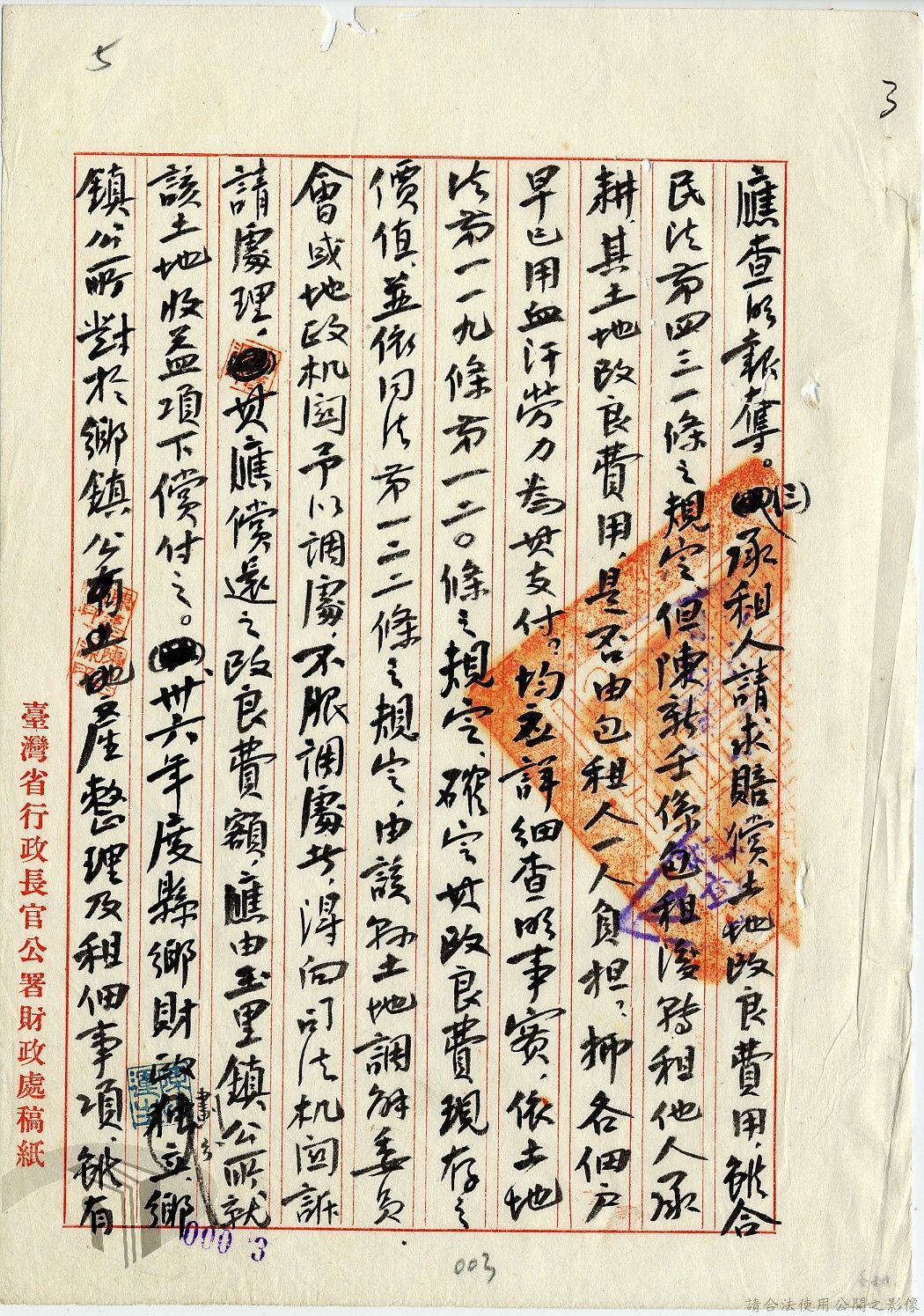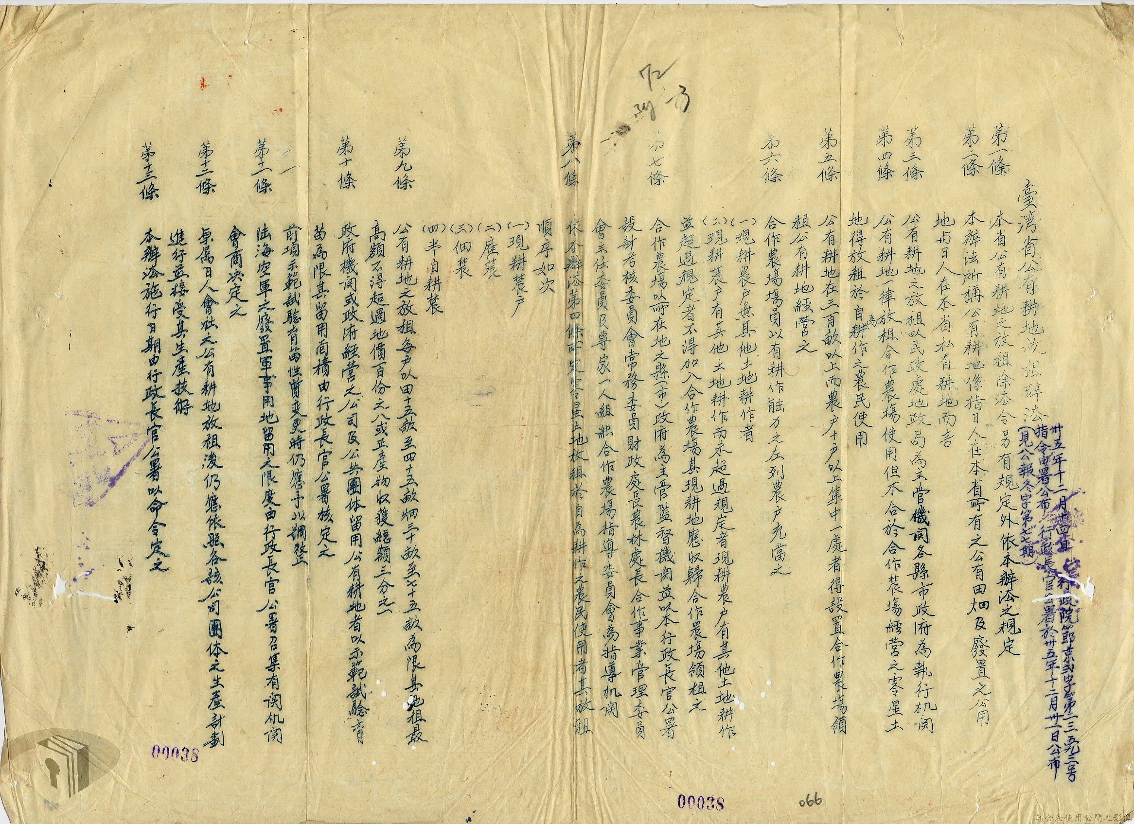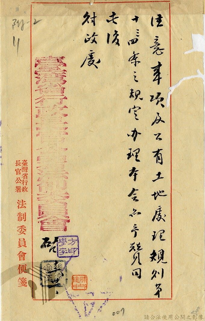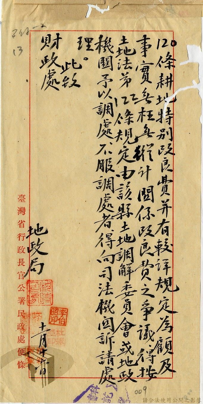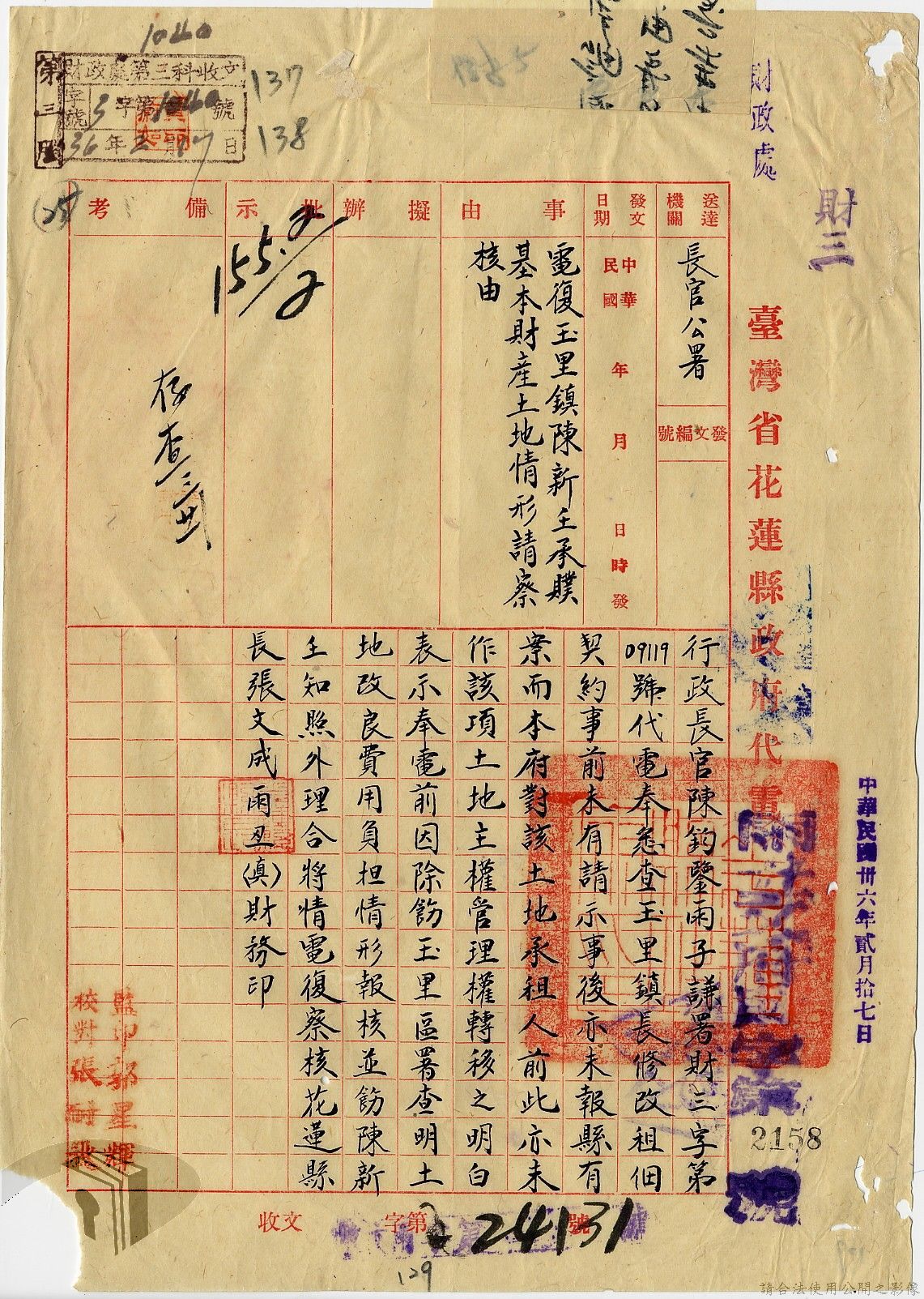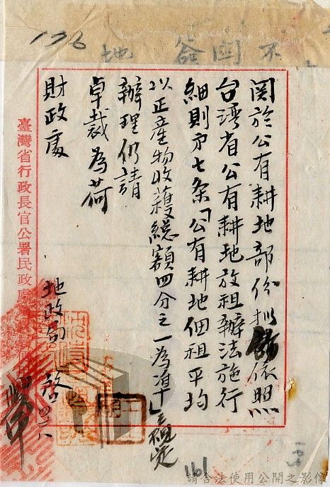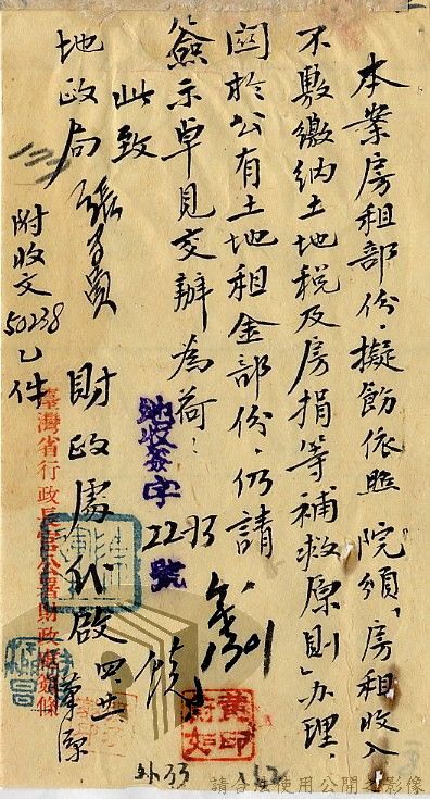 本案為35至36年間,臺灣省行政長官公署處理各縣市公有土地放租承購、土地產權登記等工作情形;行政長官公署受理花蓮縣玉里鎮民因包租公有地與佃農產生之糾紛;臺南縣參議會建議行政長官公署將各鄉鎮公有土地劃歸鄉鎮以裕財政,公署回覆依照36年度財政劃分辦法,應劃歸鄉鎮處理等。