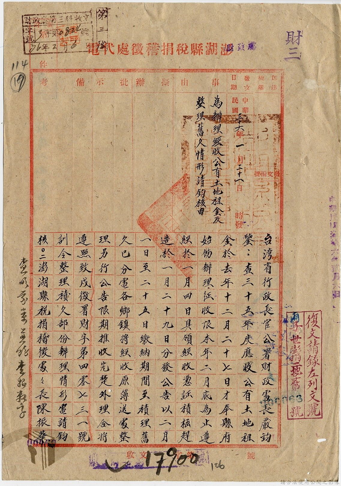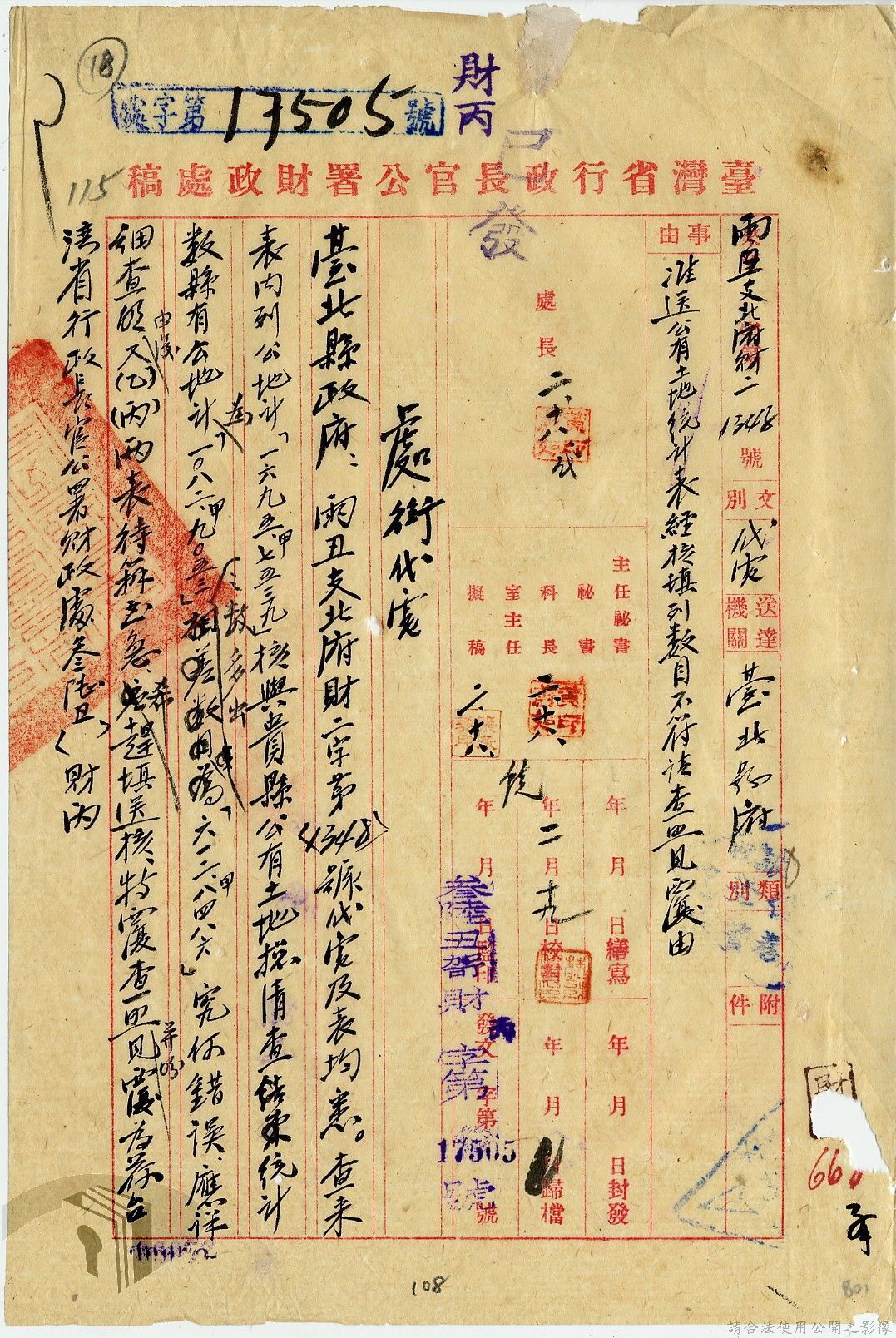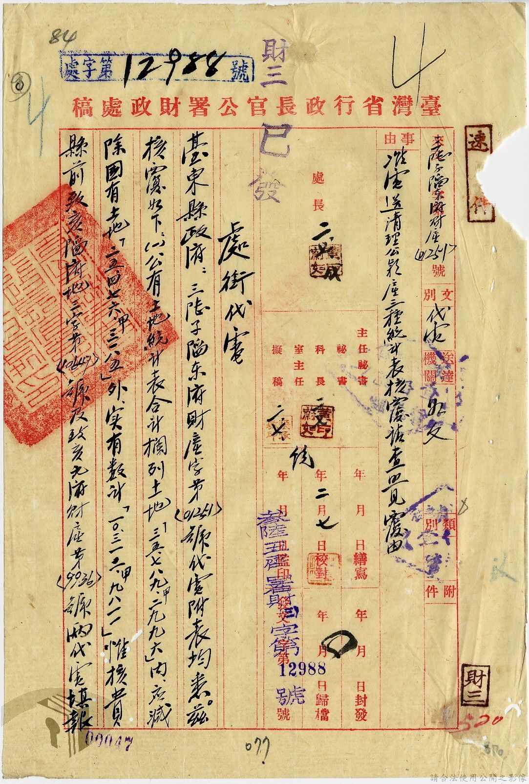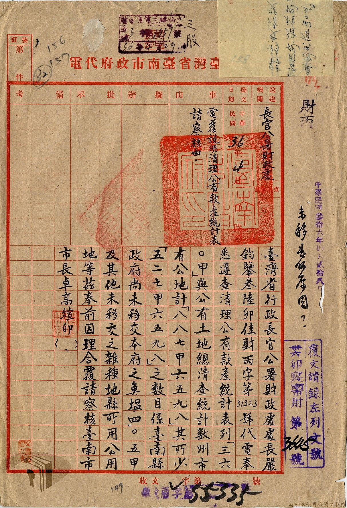 本案為35至36年間,臺灣省行政長官公署處理各縣市公有土地放租承購、土地產權登記等工作情形;行政長官公署受理花蓮縣玉里鎮民因包租公有地與佃農產生之糾紛;臺南縣參議會建議行政長官公署將各鄉鎮公有土地劃歸鄉鎮以裕財政,公署回覆依照36年度財政劃分辦法,應劃歸鄉鎮處理等。