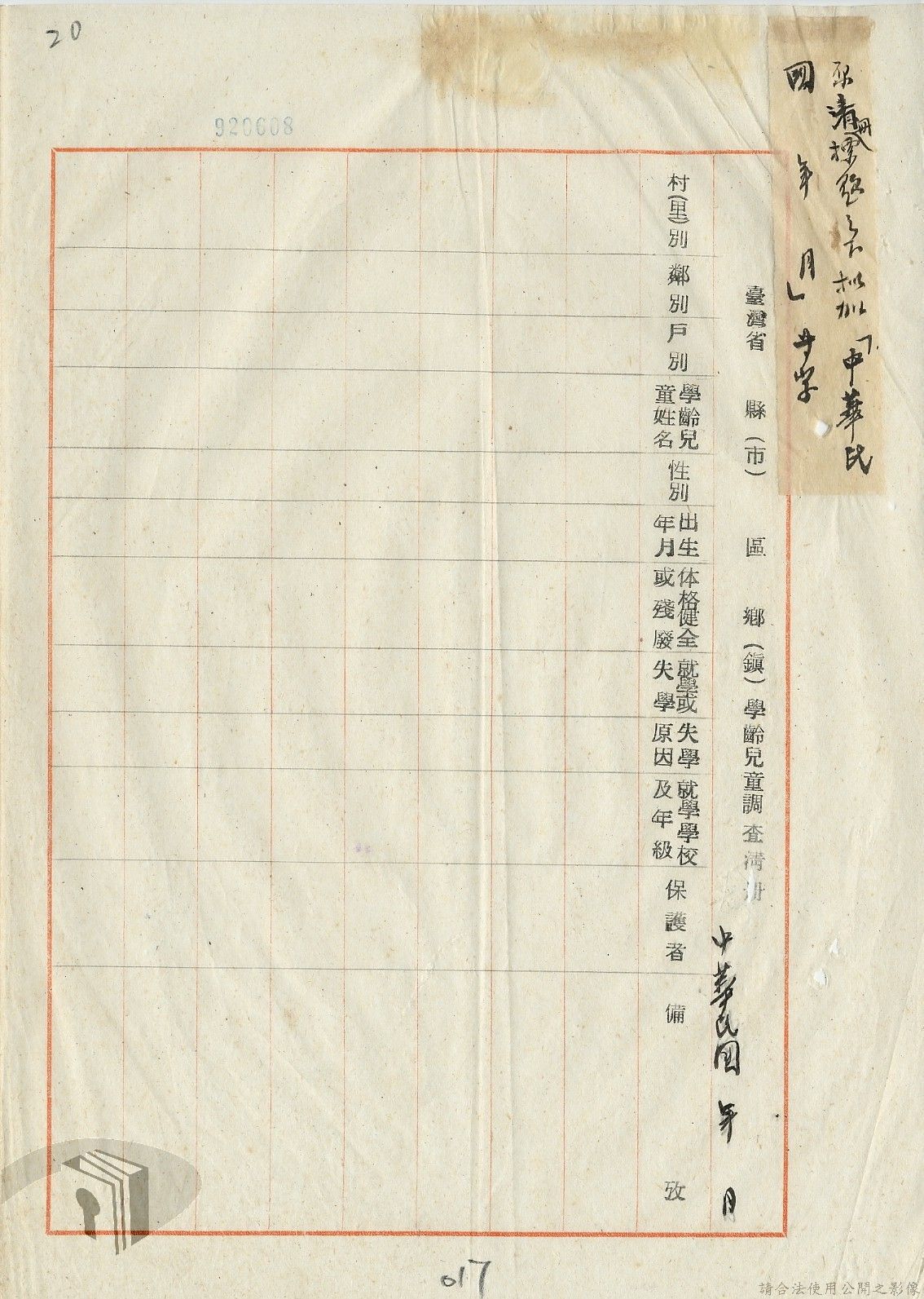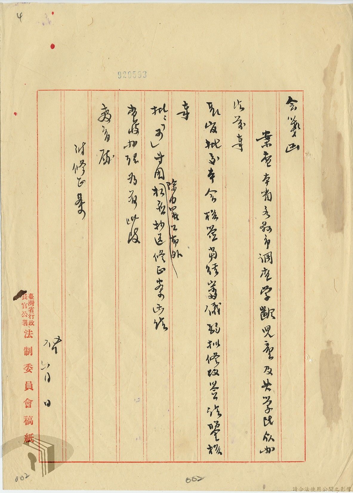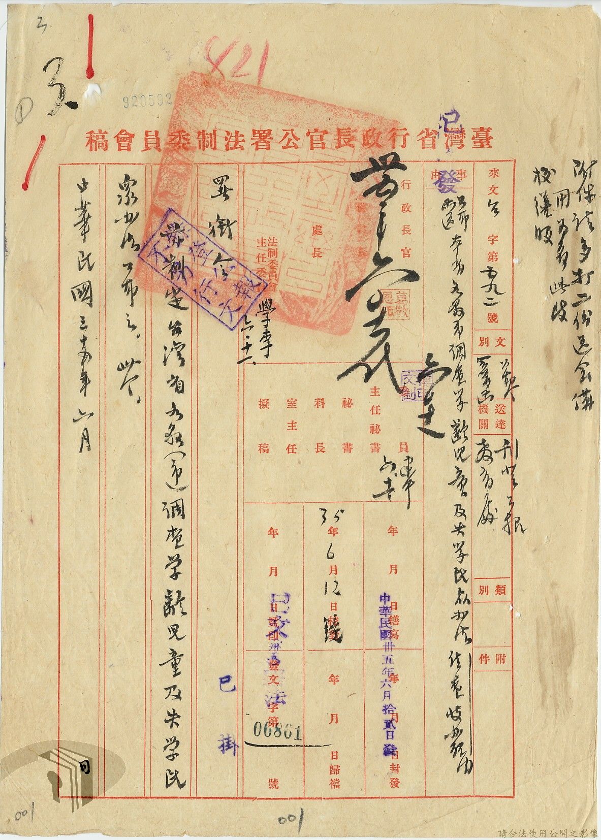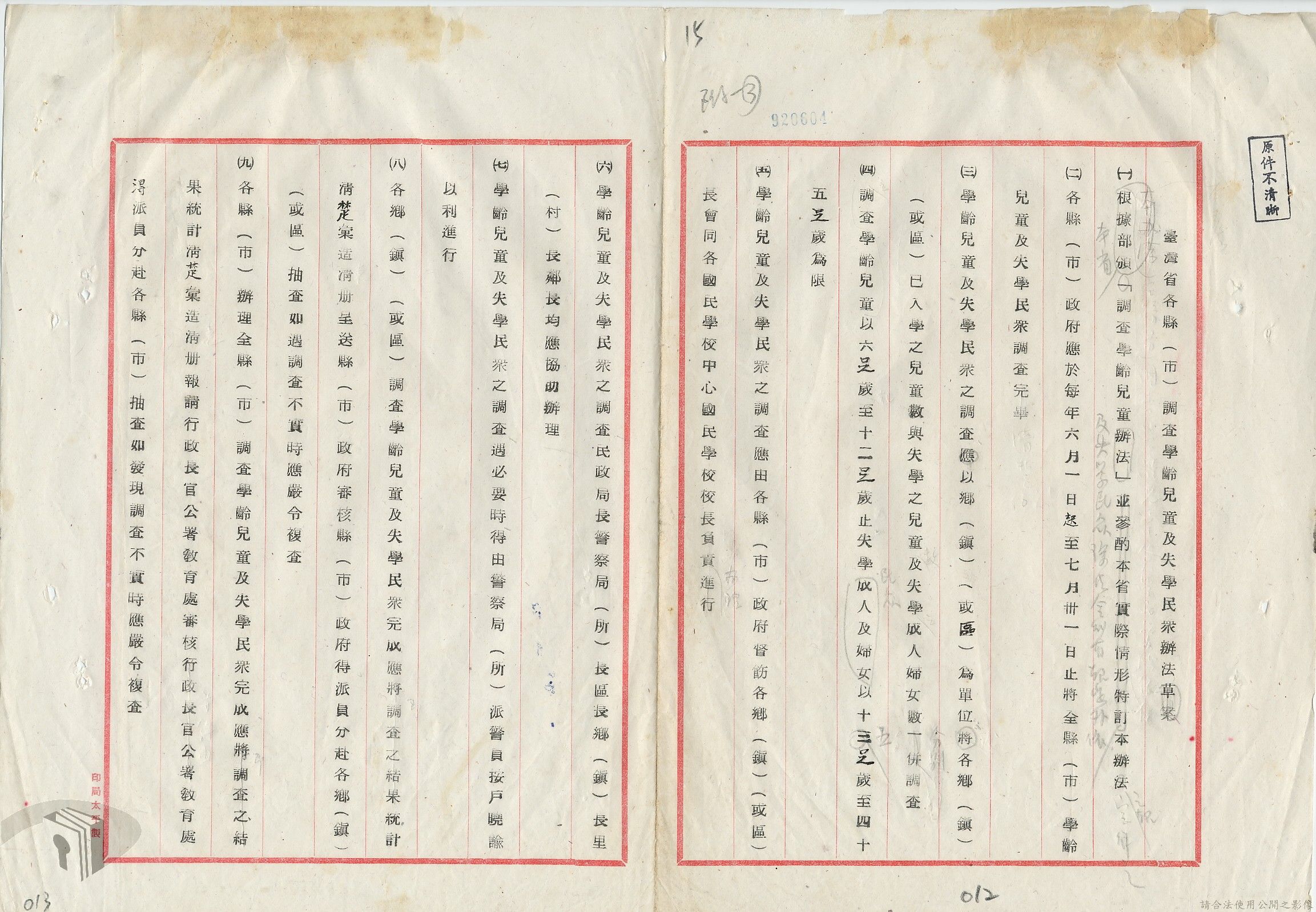 本案為35年間,臺灣省行政長官公署教育處制定有關「臺灣省各縣市地調查學齡兒童及失學民眾辦法草案」,另附各縣市學齡兒童及失學民眾調查清冊,經法制委員會修正後定案,由公署核示通過後正式實施並刊登於公報。附調查清冊。