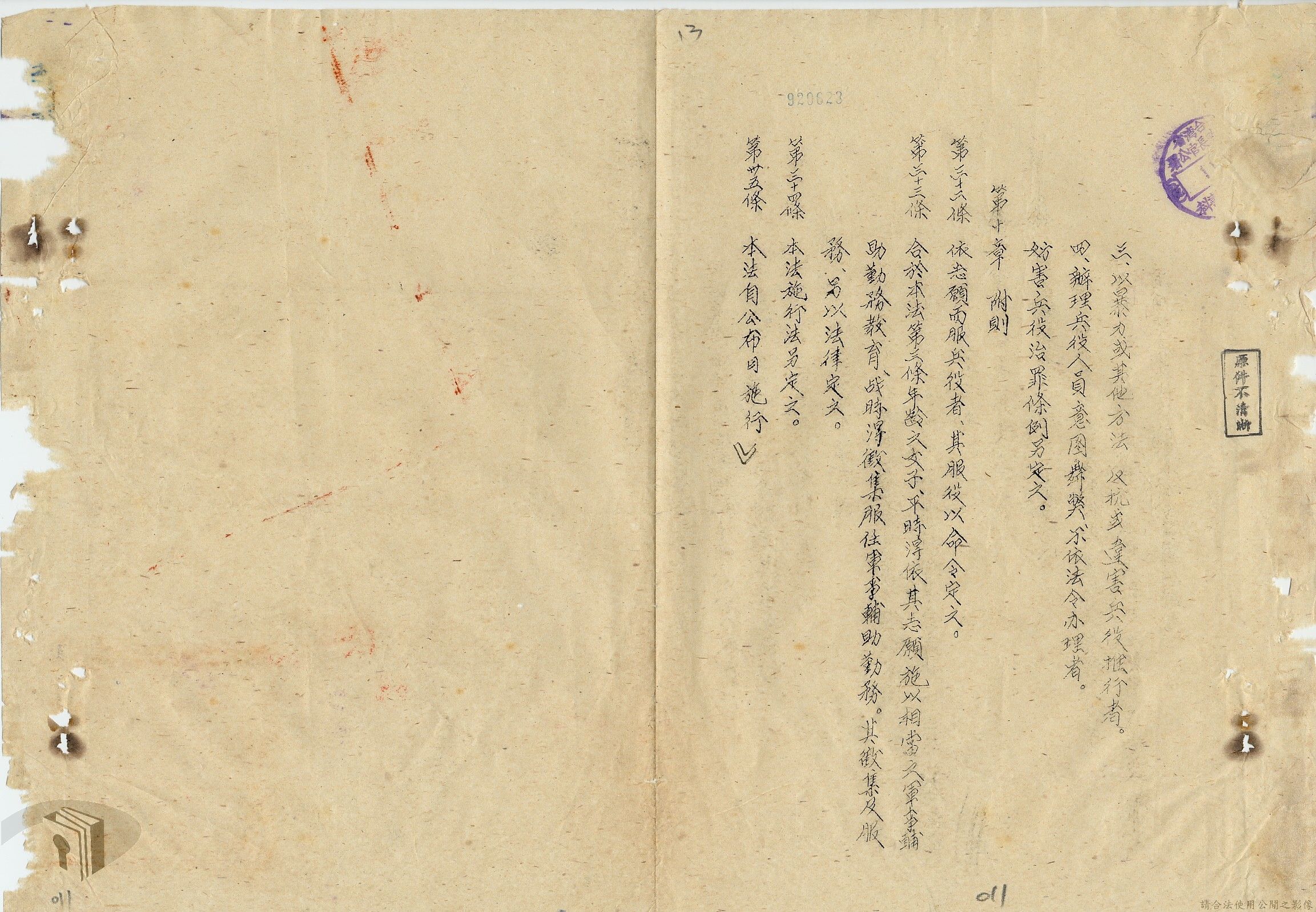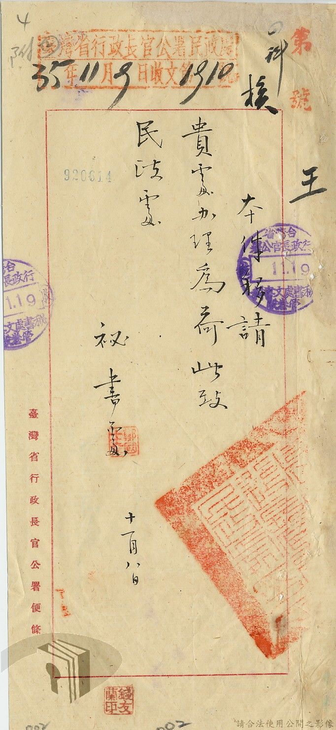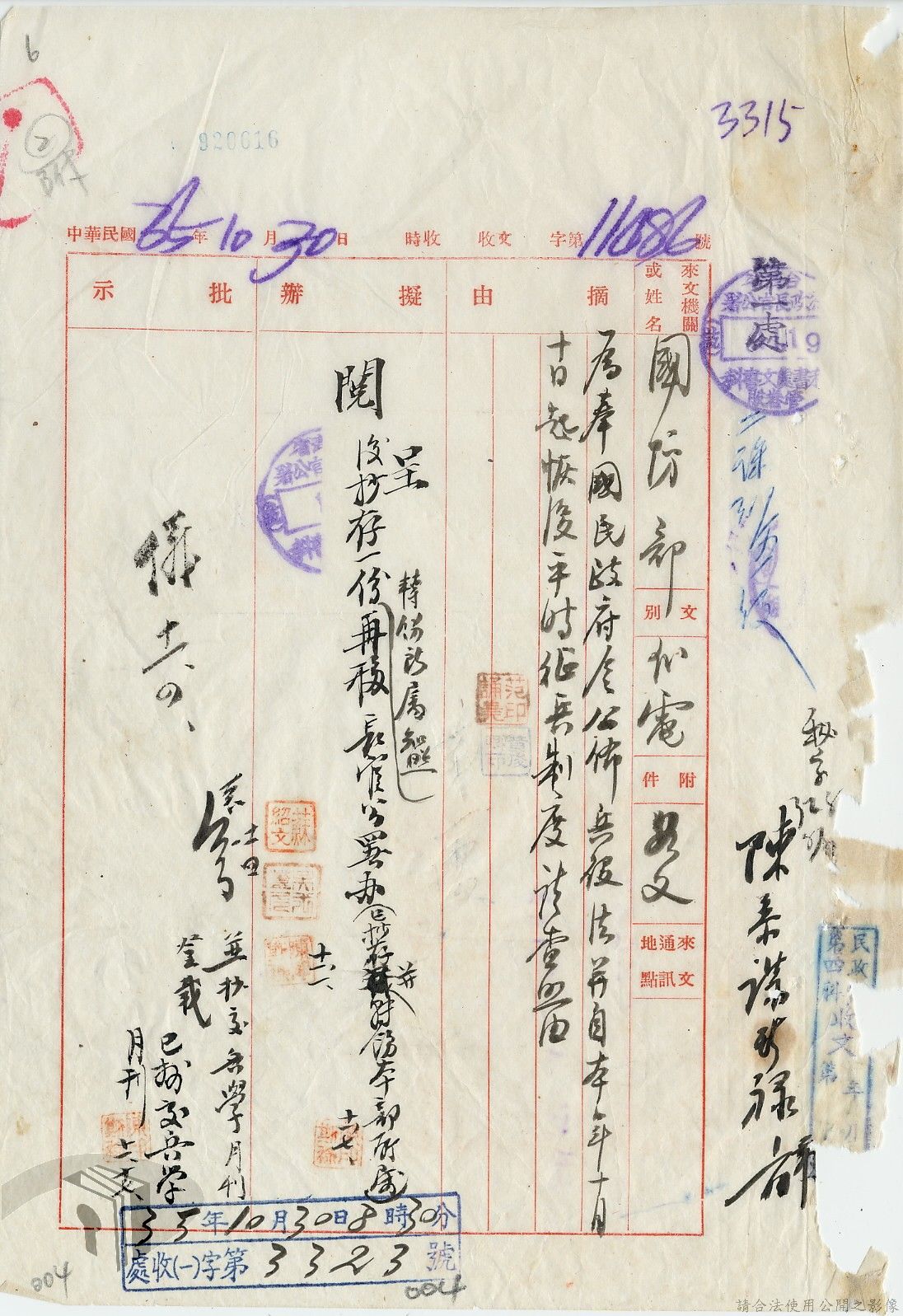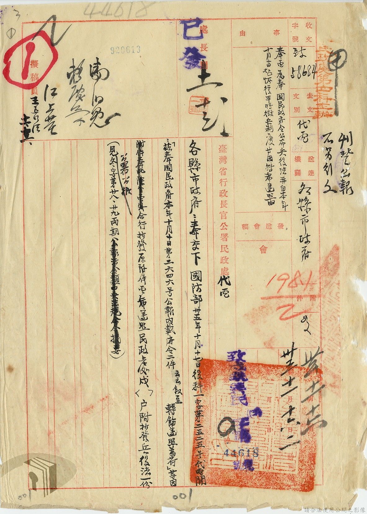 本案為35年間,國防部因為國民政府命令公布之兵役法關於自該年10月10日起恢復平時徵兵制度一事,而將該事函知臺灣省行政長官公署,後由臺灣省行政長官公署民政處將國防部命令公布恢復平時徵兵制度一事轉知各縣市政府。附兵役法。