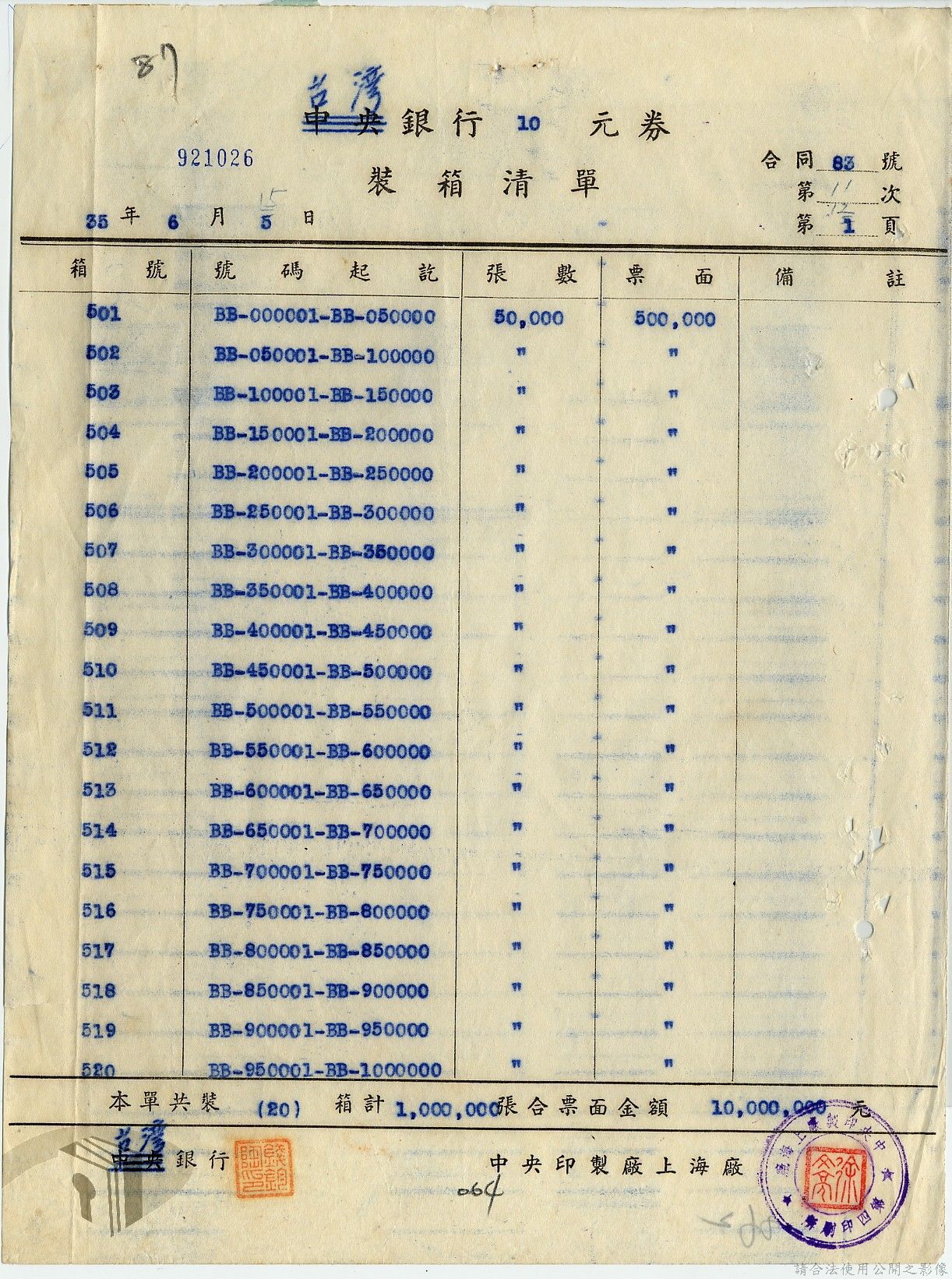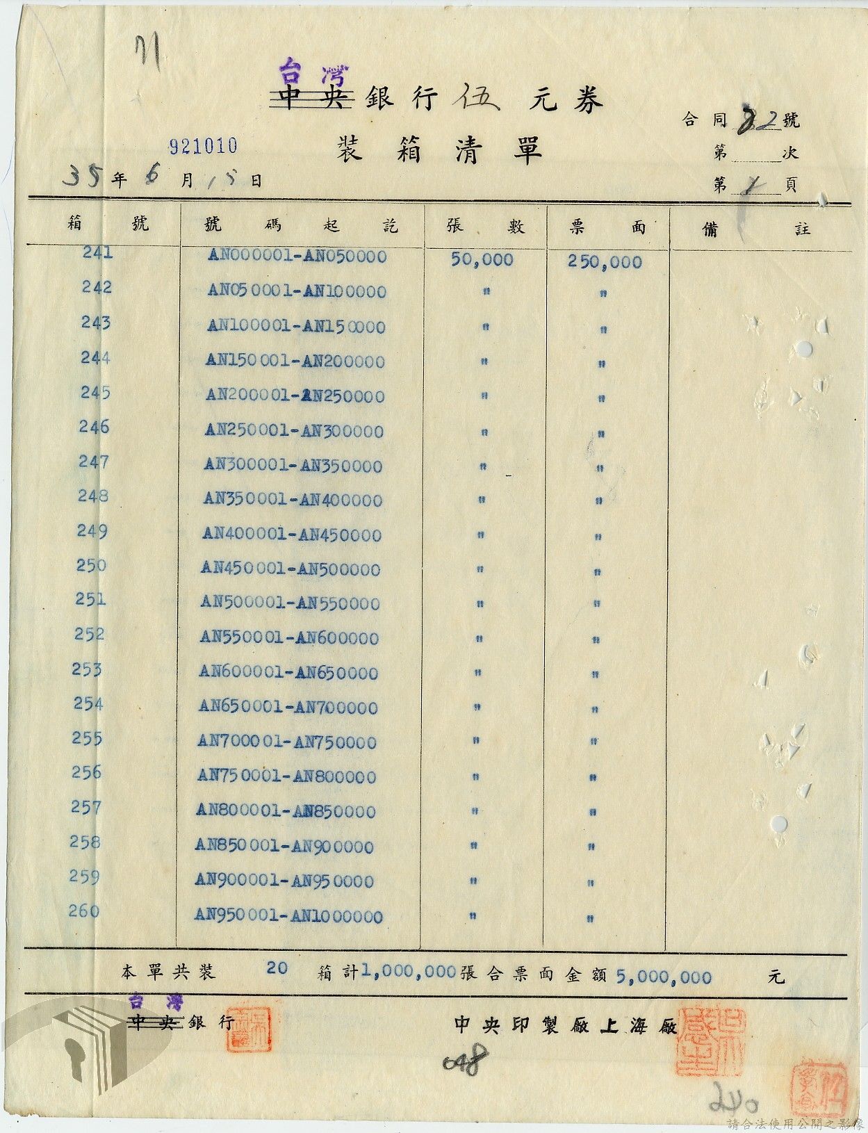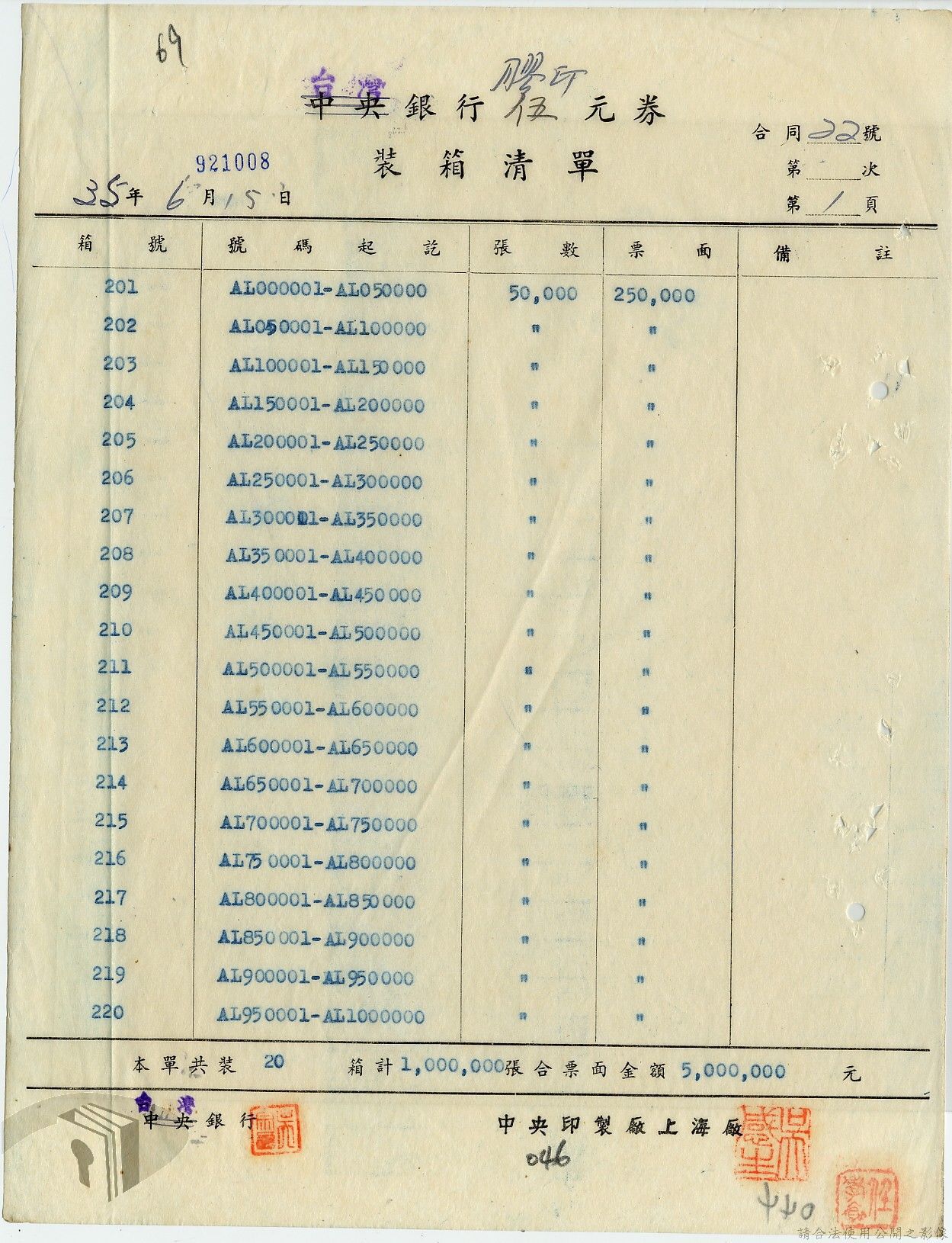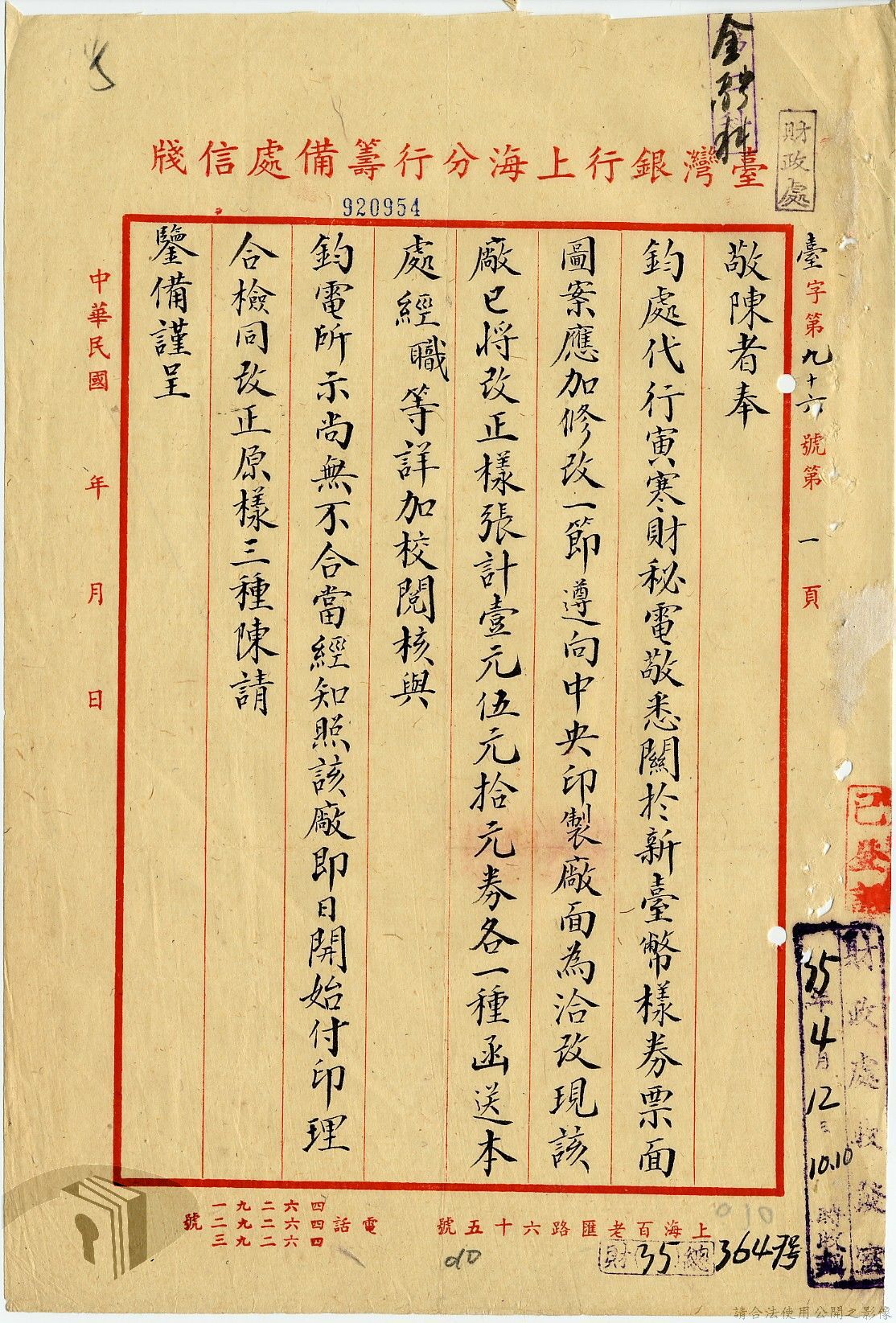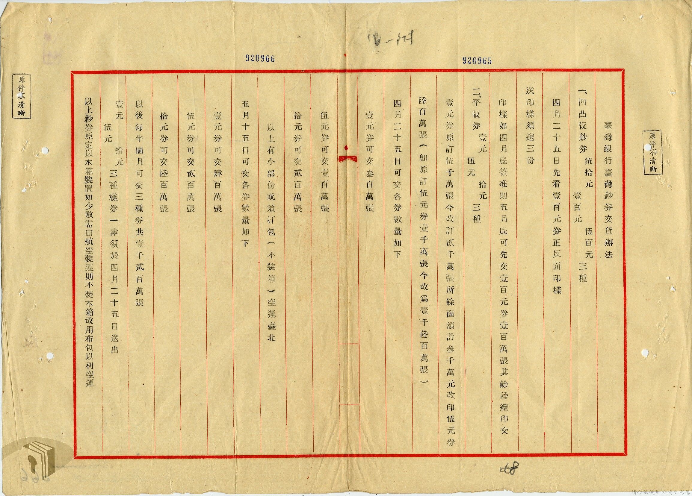 本案為35年間,臺灣省行長官公署財政處與臺灣銀行辦理新臺幣印製及運臺之經過事,公署財政處派員赴上海臺灣銀行分行檢核新臺幣樣張,及財政處對擬印鈔票之面值、數量之意見,以及因為協調新鈔運臺之船運、空運事宜的關係多次電催上海分行速運等,並於該年計有十一批新臺幣先後運臺,併附各批點收清單紀錄,以及新臺幣各種面值鈔票樣張。