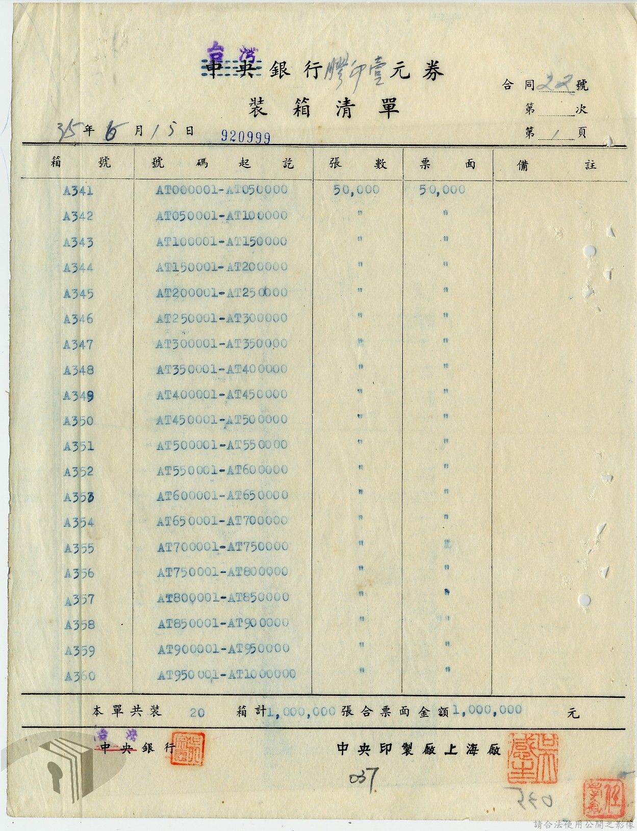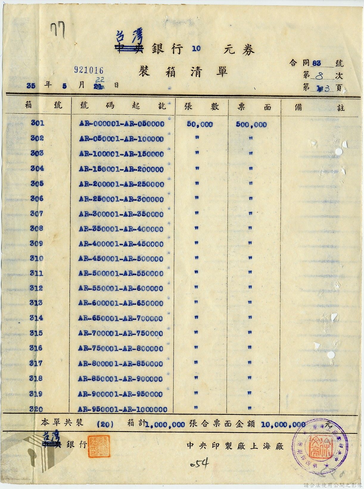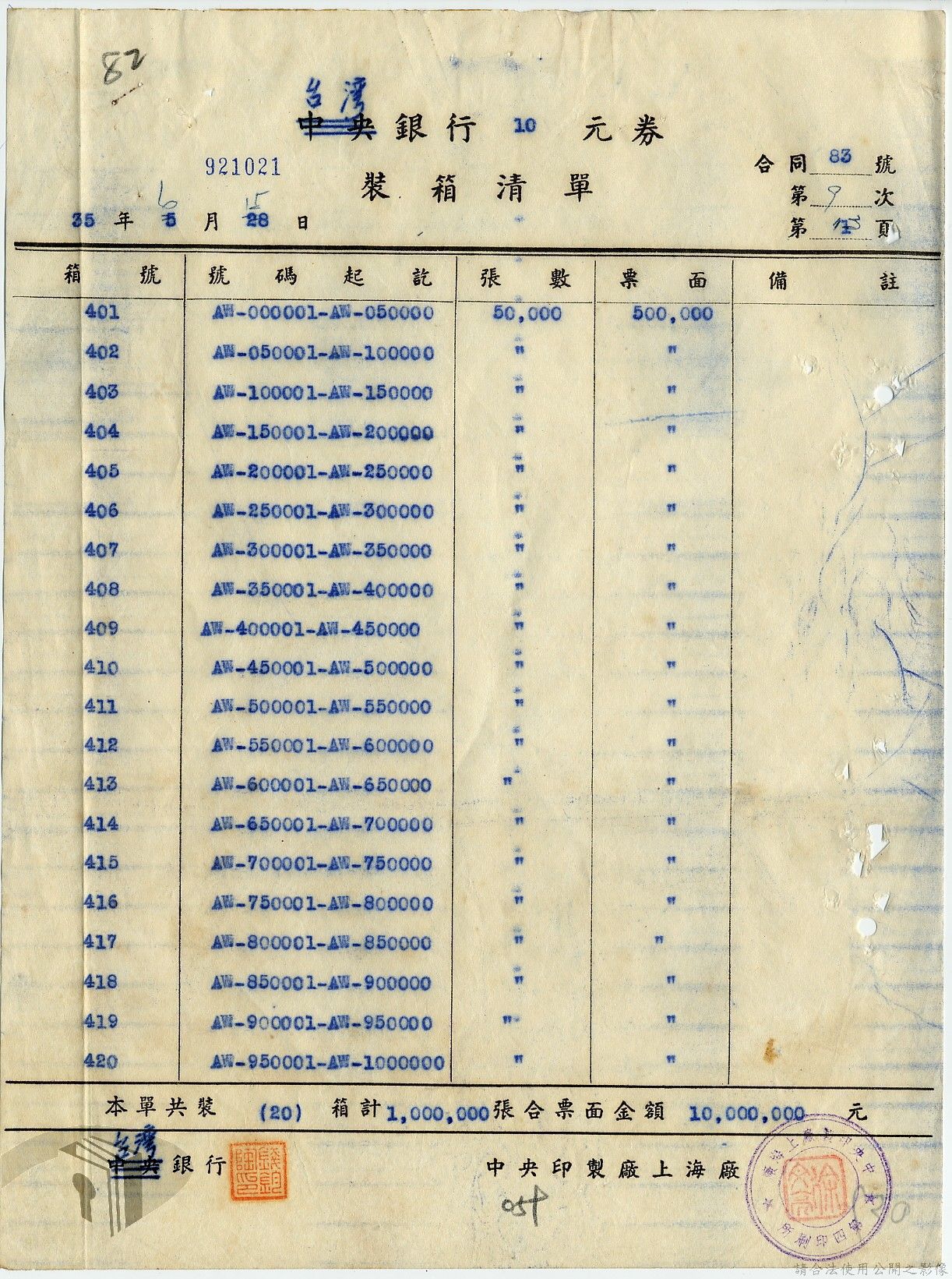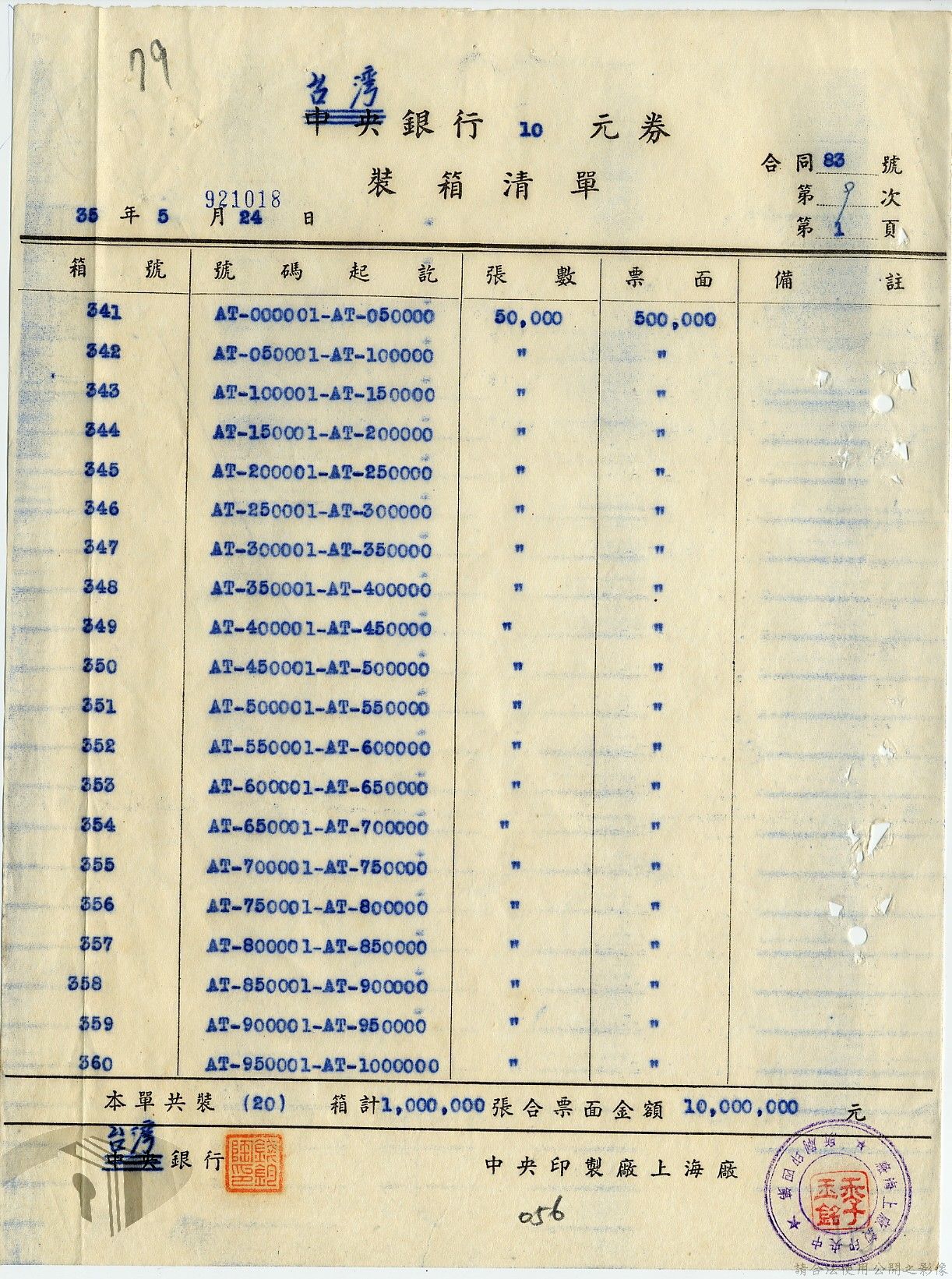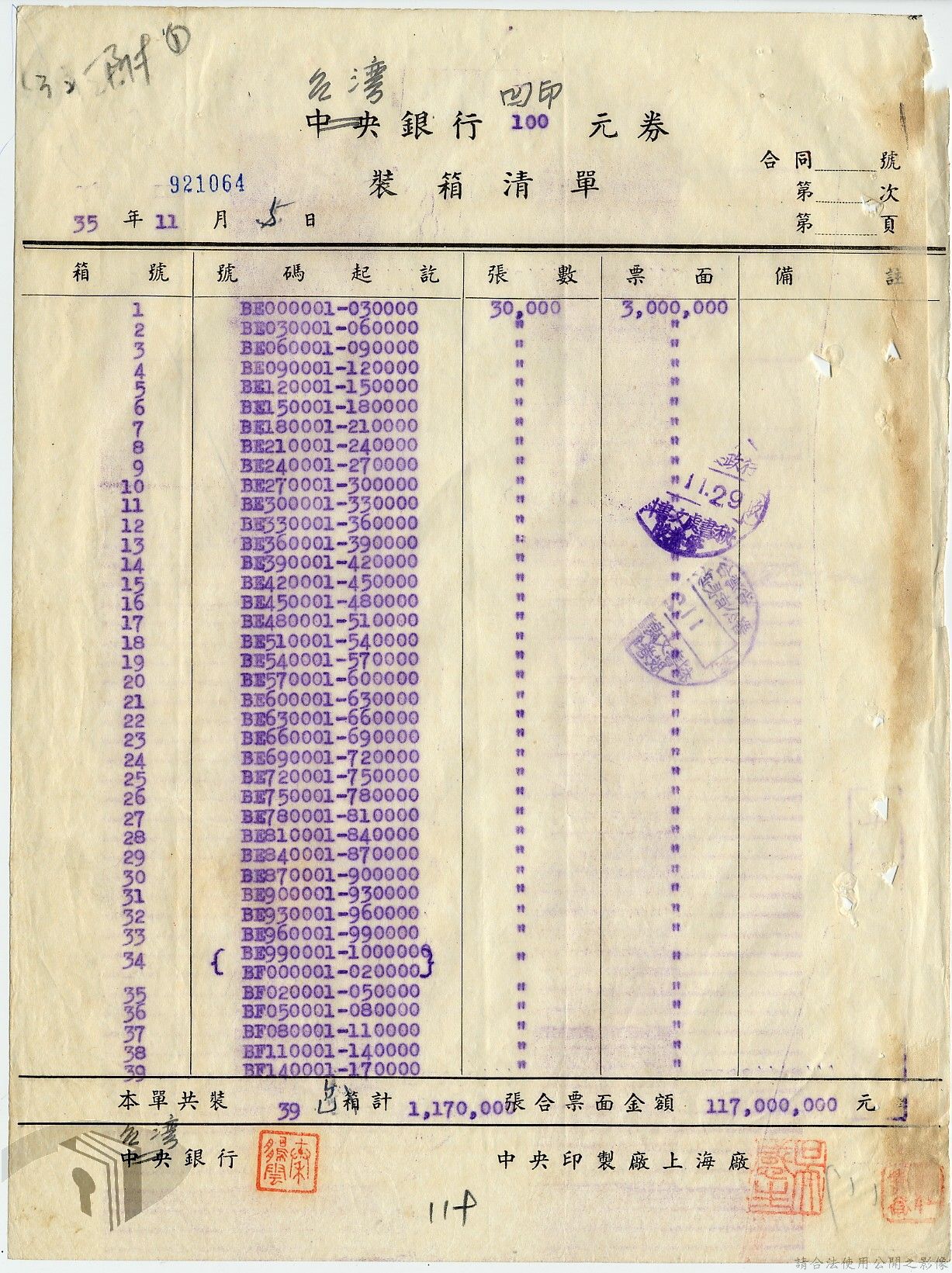 本案為35年間,臺灣省行長官公署財政處與臺灣銀行辦理新臺幣印製及運臺之經過事,公署財政處派員赴上海臺灣銀行分行檢核新臺幣樣張,及財政處對擬印鈔票之面值、數量之意見,以及因為協調新鈔運臺之船運、空運事宜的關係多次電催上海分行速運等,並於該年計有十一批新臺幣先後運臺,併附各批點收清單紀錄,以及新臺幣各種面值鈔票樣張。