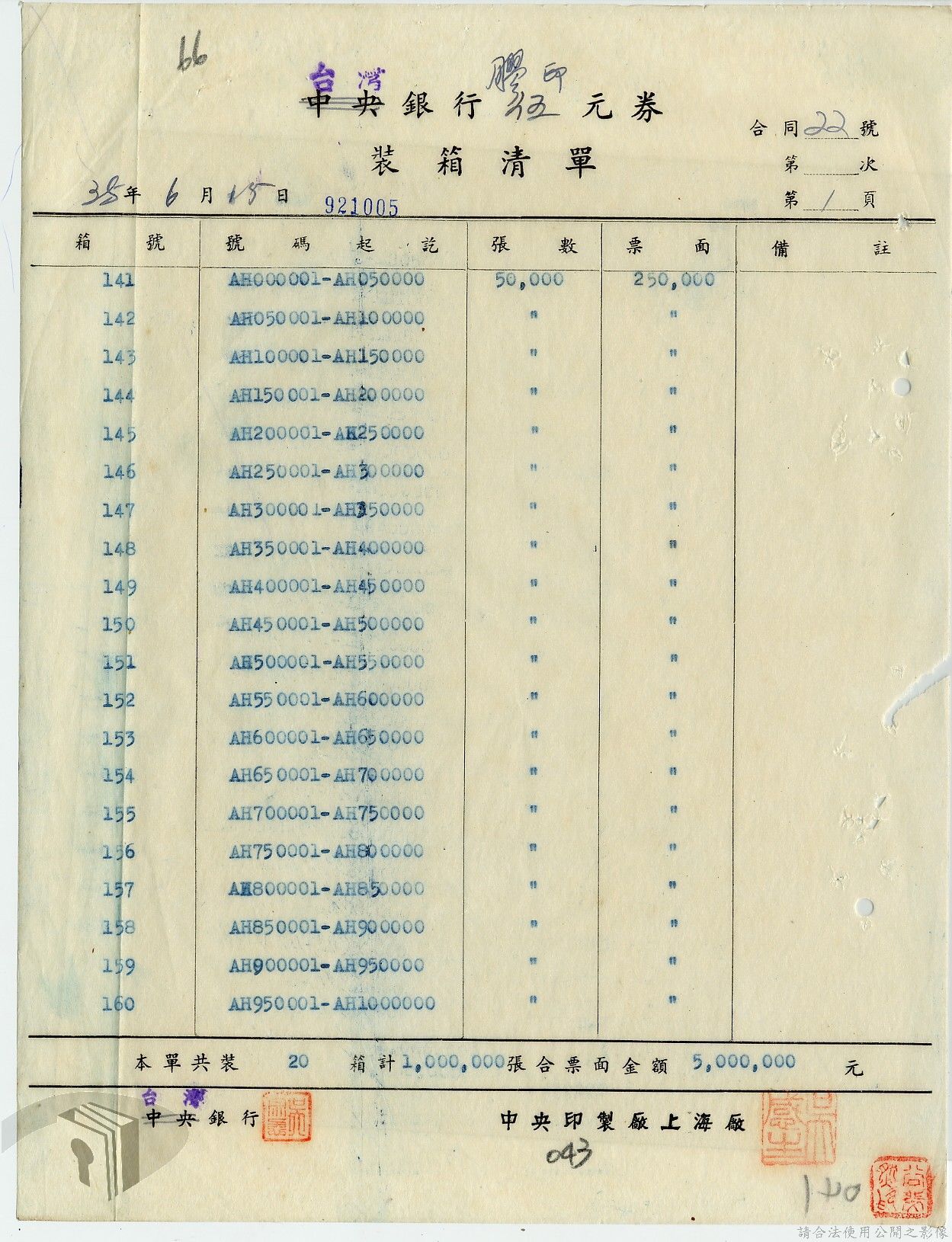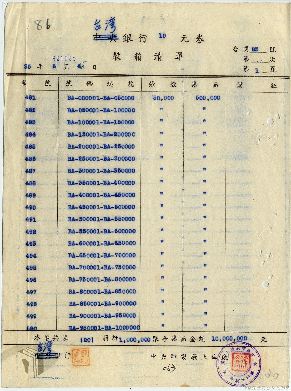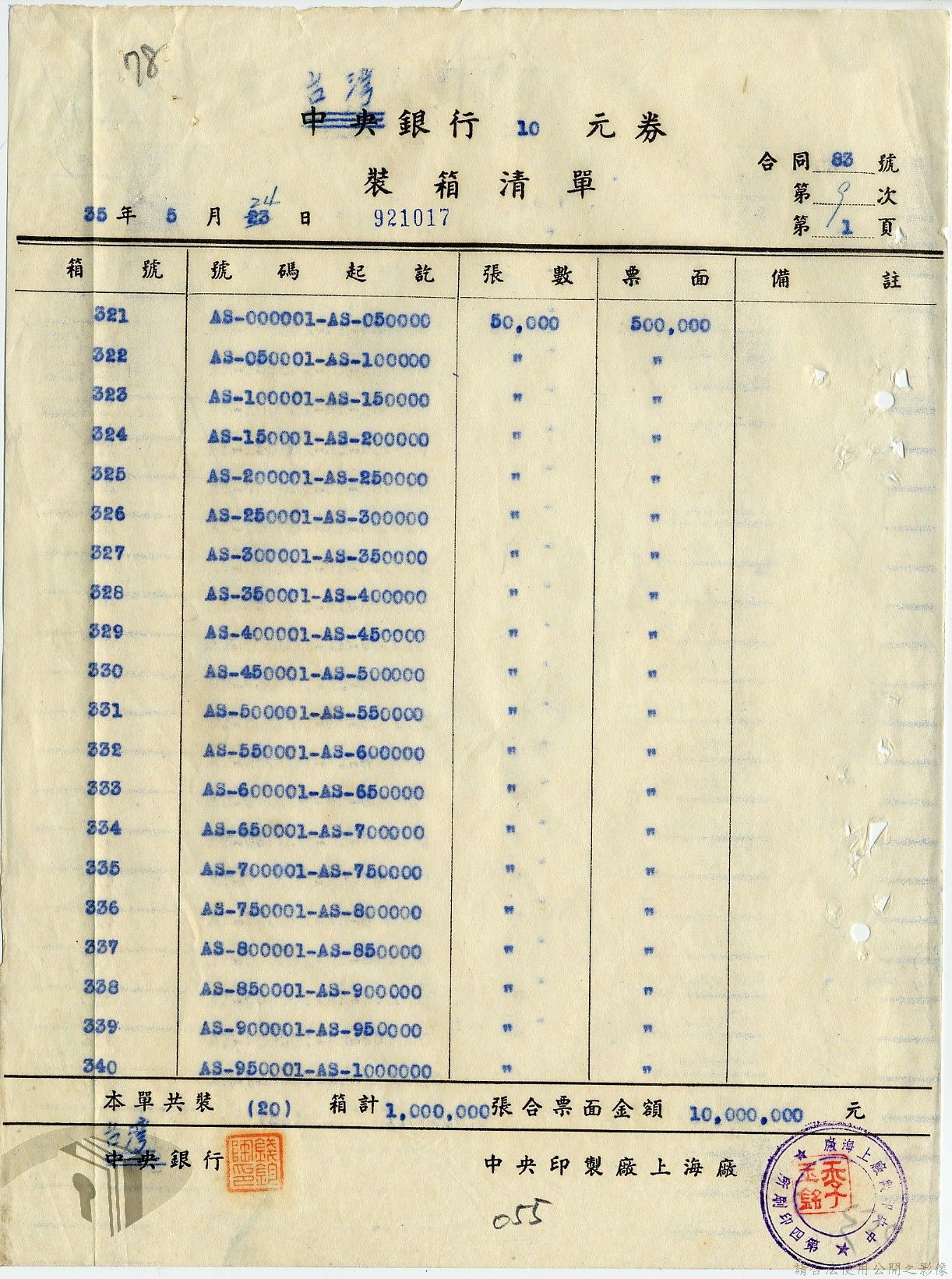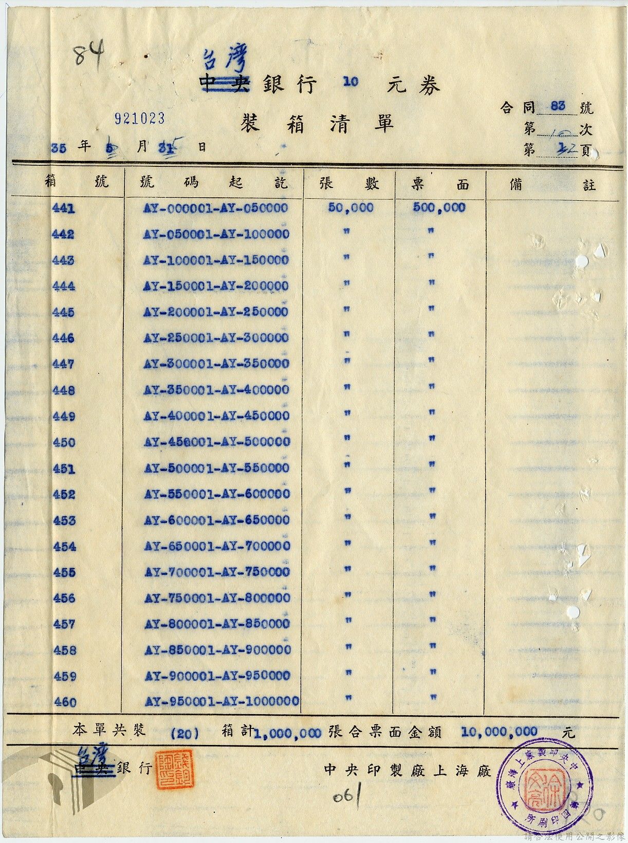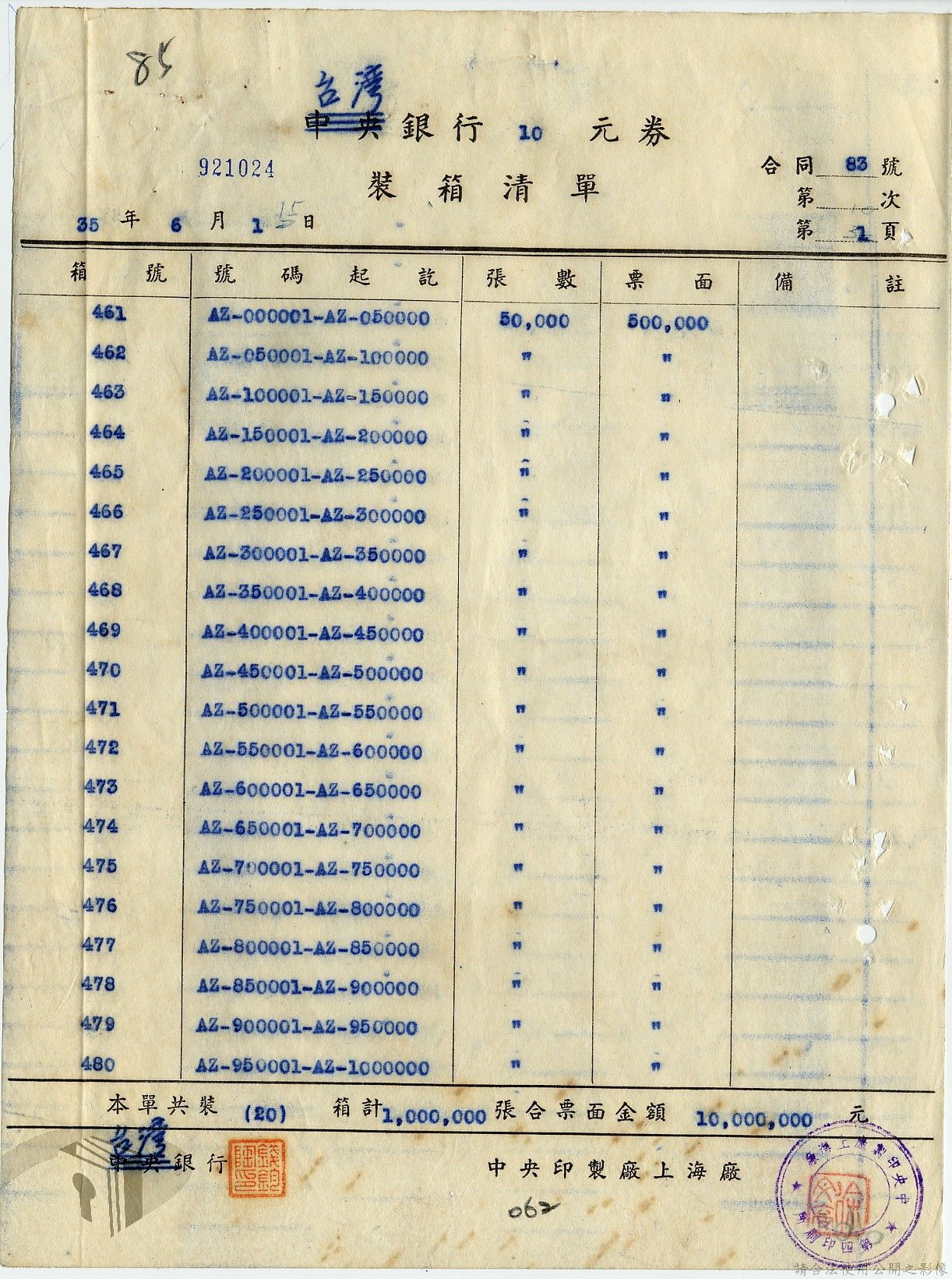 本案為35年間,臺灣省行長官公署財政處與臺灣銀行辦理新臺幣印製及運臺之經過事,公署財政處派員赴上海臺灣銀行分行檢核新臺幣樣張,及財政處對擬印鈔票之面值、數量之意見,以及因為協調新鈔運臺之船運、空運事宜的關係多次電催上海分行速運等,並於該年計有十一批新臺幣先後運臺,併附各批點收清單紀錄,以及新臺幣各種面值鈔票樣張。