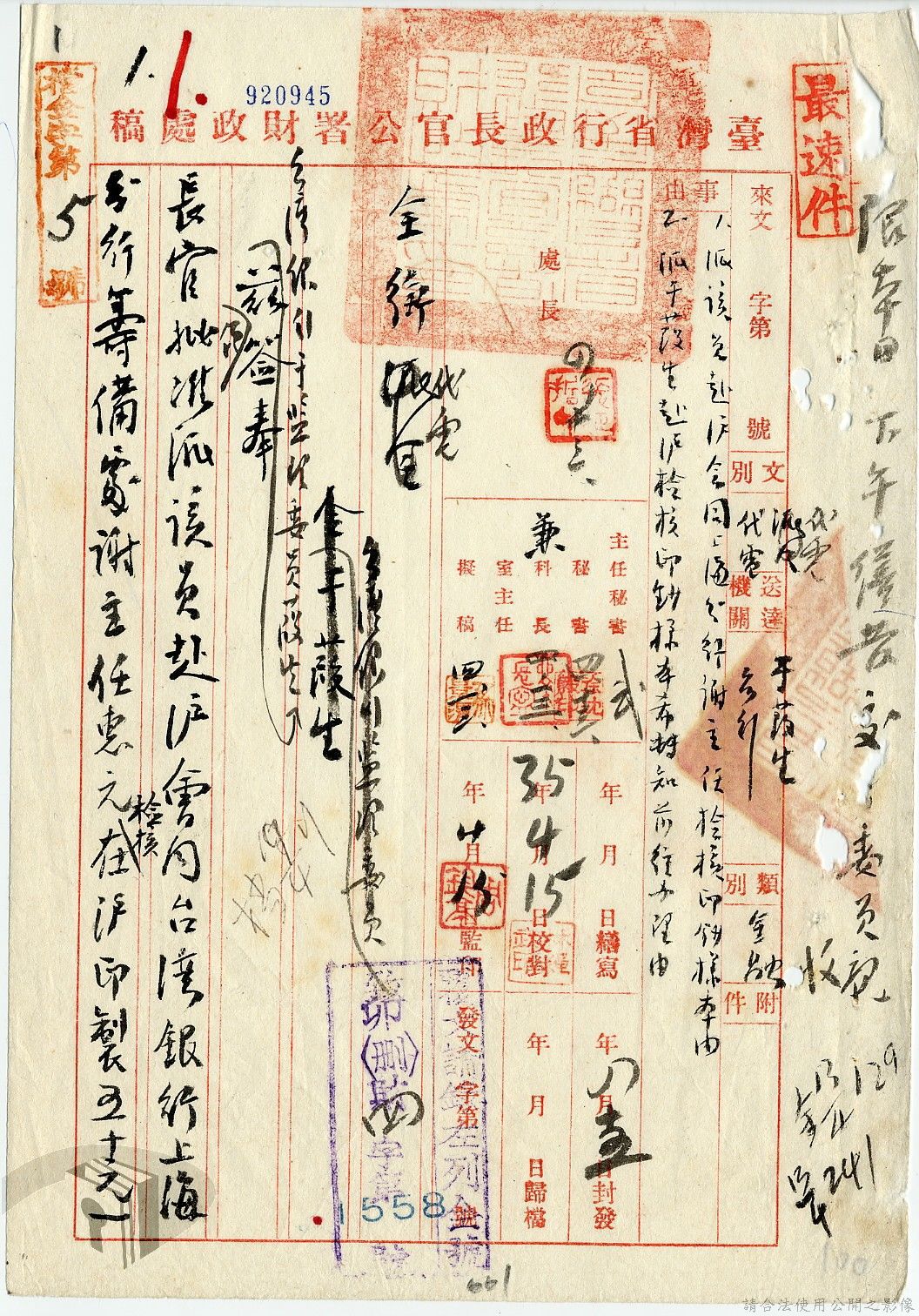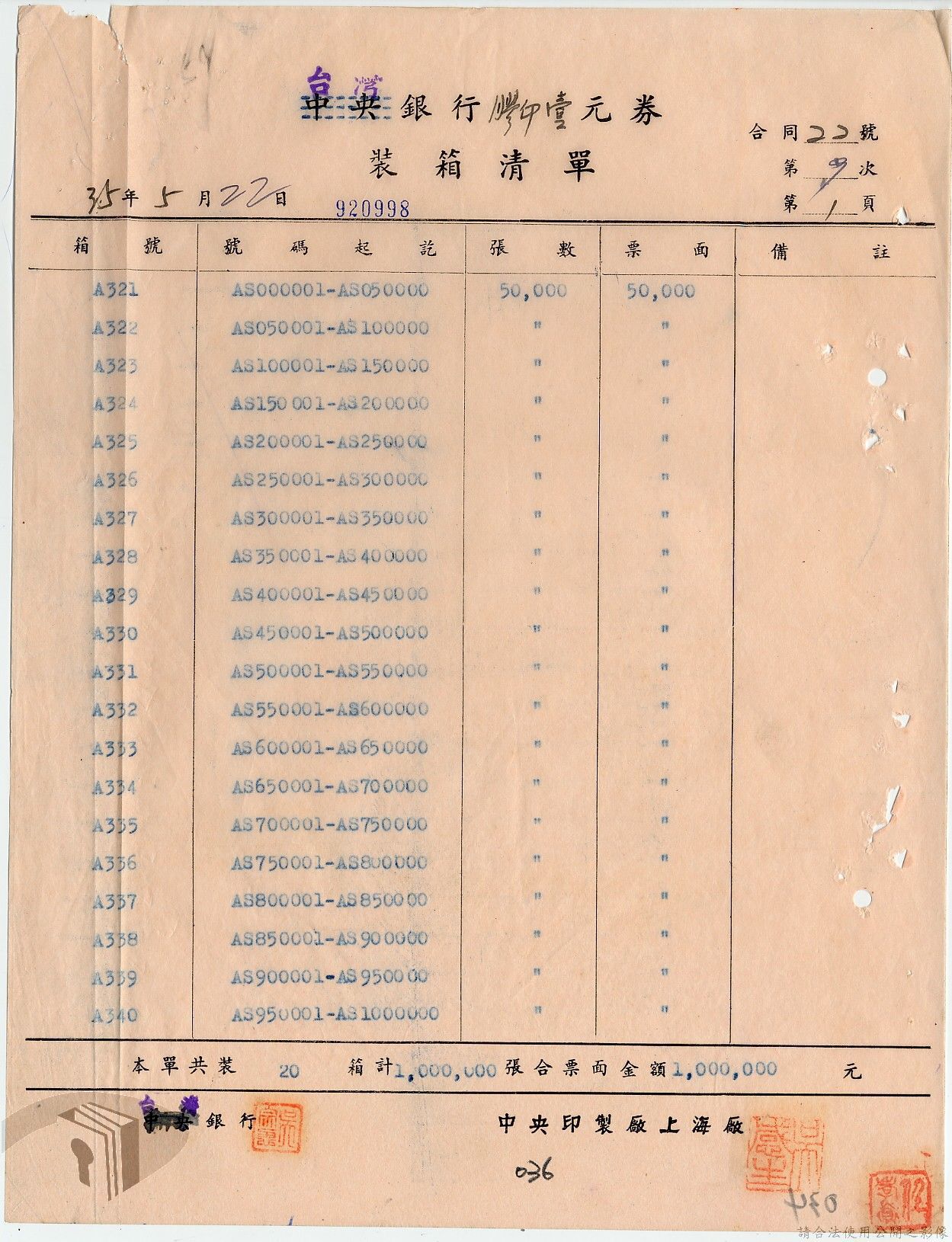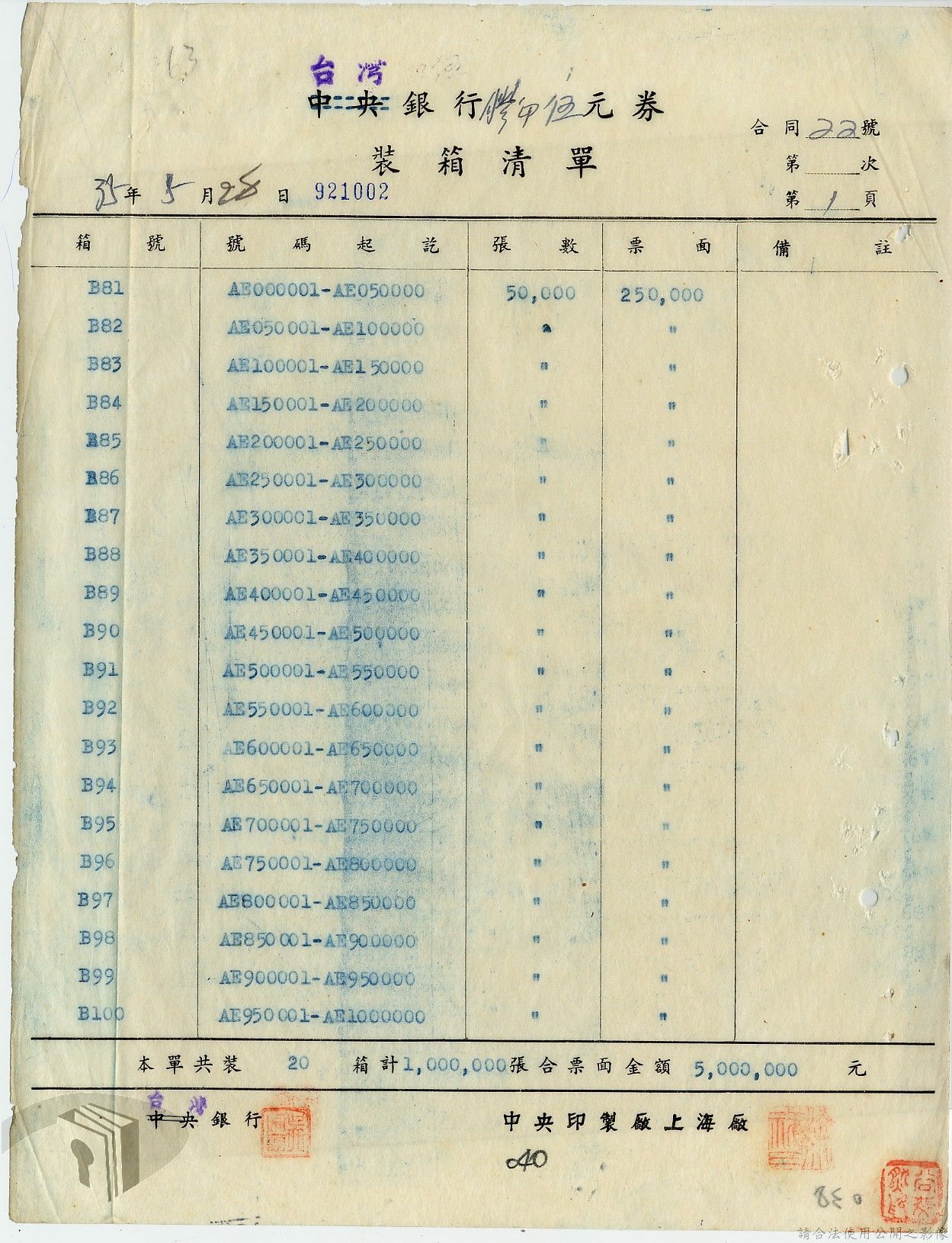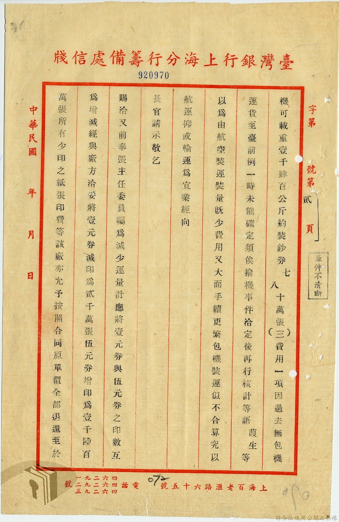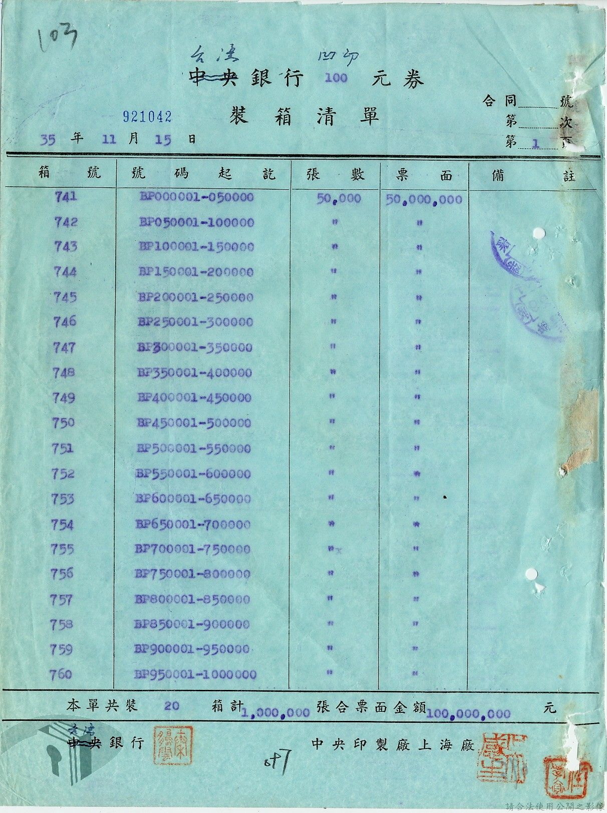 本案為35年間,臺灣省行長官公署財政處與臺灣銀行辦理新臺幣印製及運臺之經過事,公署財政處派員赴上海臺灣銀行分行檢核新臺幣樣張,及財政處對擬印鈔票之面值、數量之意見,以及因為協調新鈔運臺之船運、空運事宜的關係多次電催上海分行速運等,並於該年計有十一批新臺幣先後運臺,併附各批點收清單紀錄,以及新臺幣各種面值鈔票樣張。
