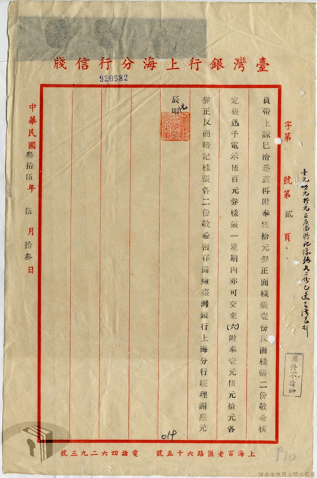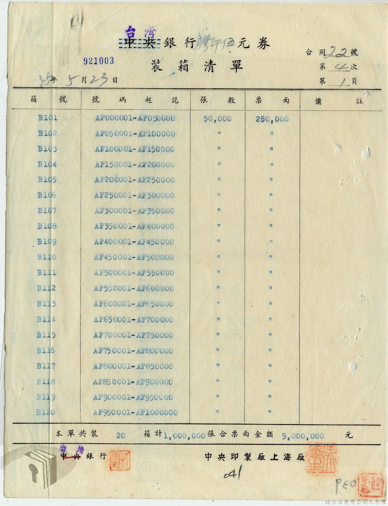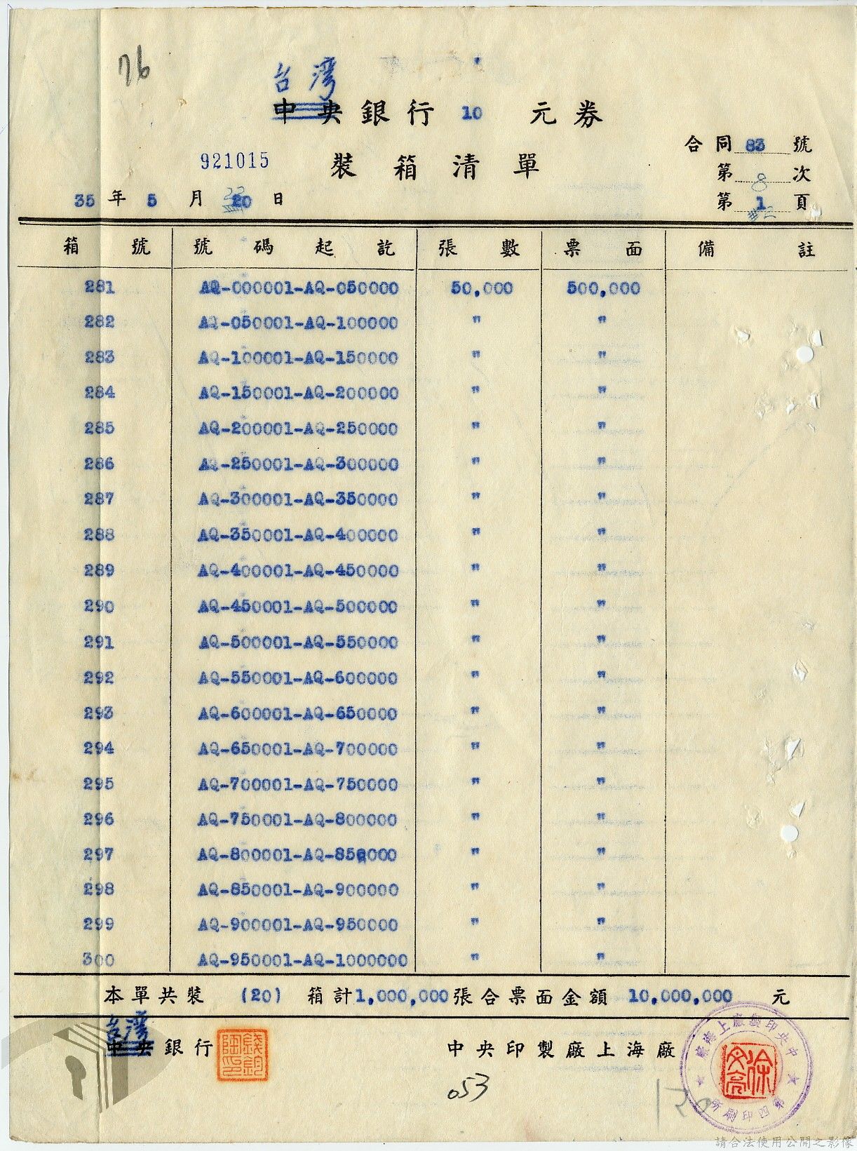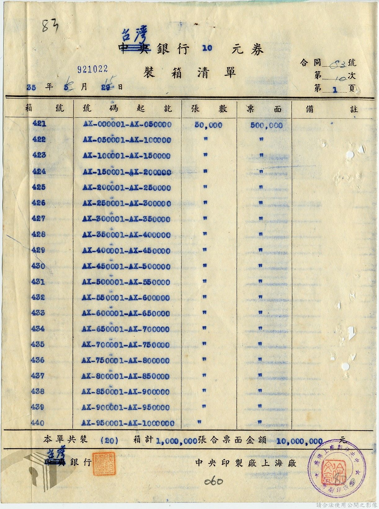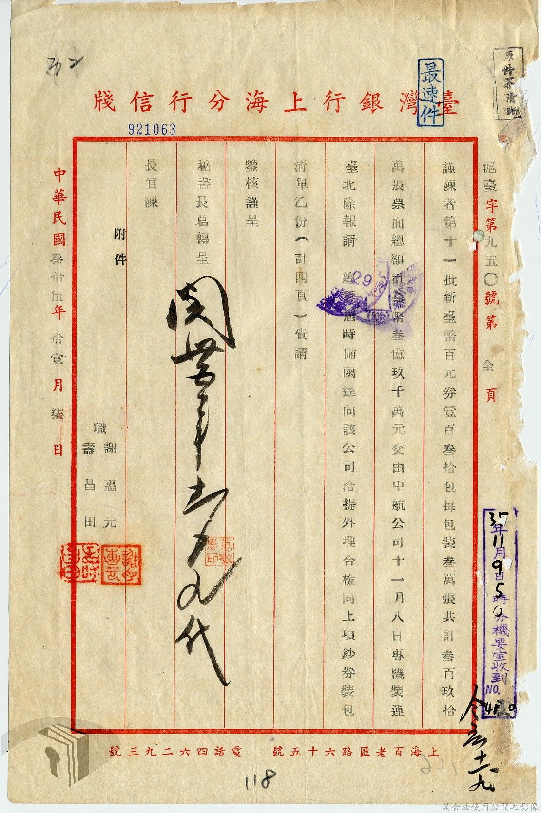 本案為35年間,臺灣省行長官公署財政處與臺灣銀行辦理新臺幣印製及運臺之經過事,公署財政處派員赴上海臺灣銀行分行檢核新臺幣樣張,及財政處對擬印鈔票之面值、數量之意見,以及因為協調新鈔運臺之船運、空運事宜的關係多次電催上海分行速運等,並於該年計有十一批新臺幣先後運臺,併附各批點收清單紀錄,以及新臺幣各種面值鈔票樣張。