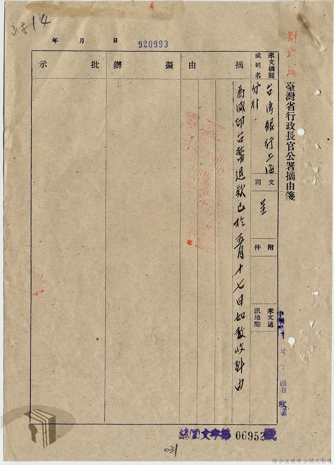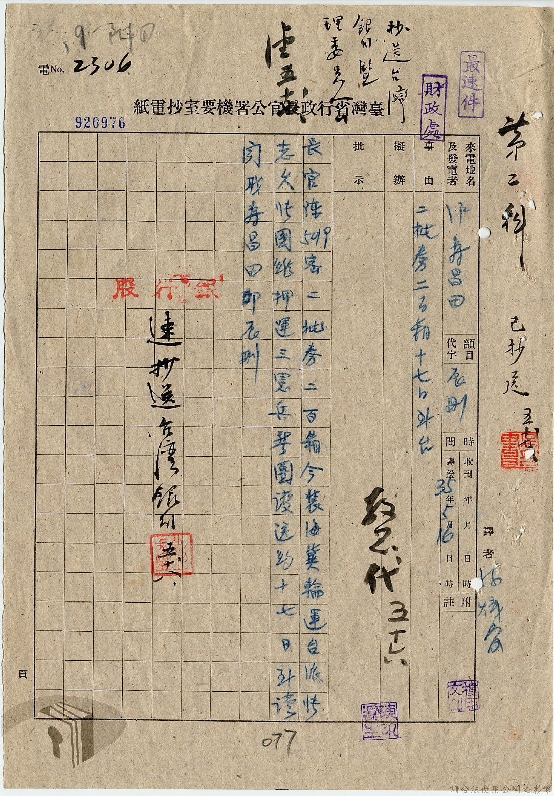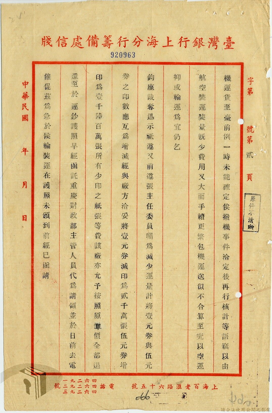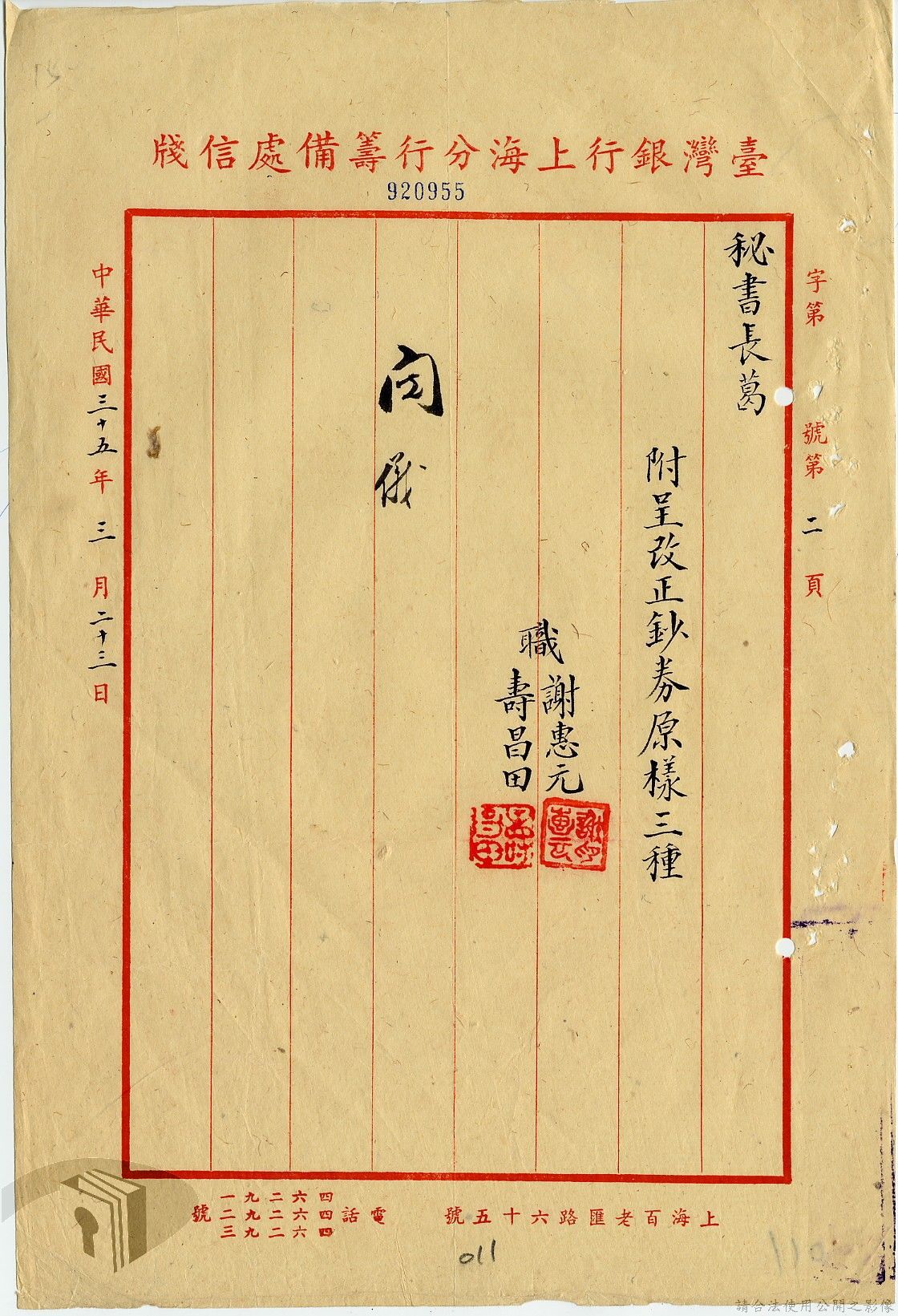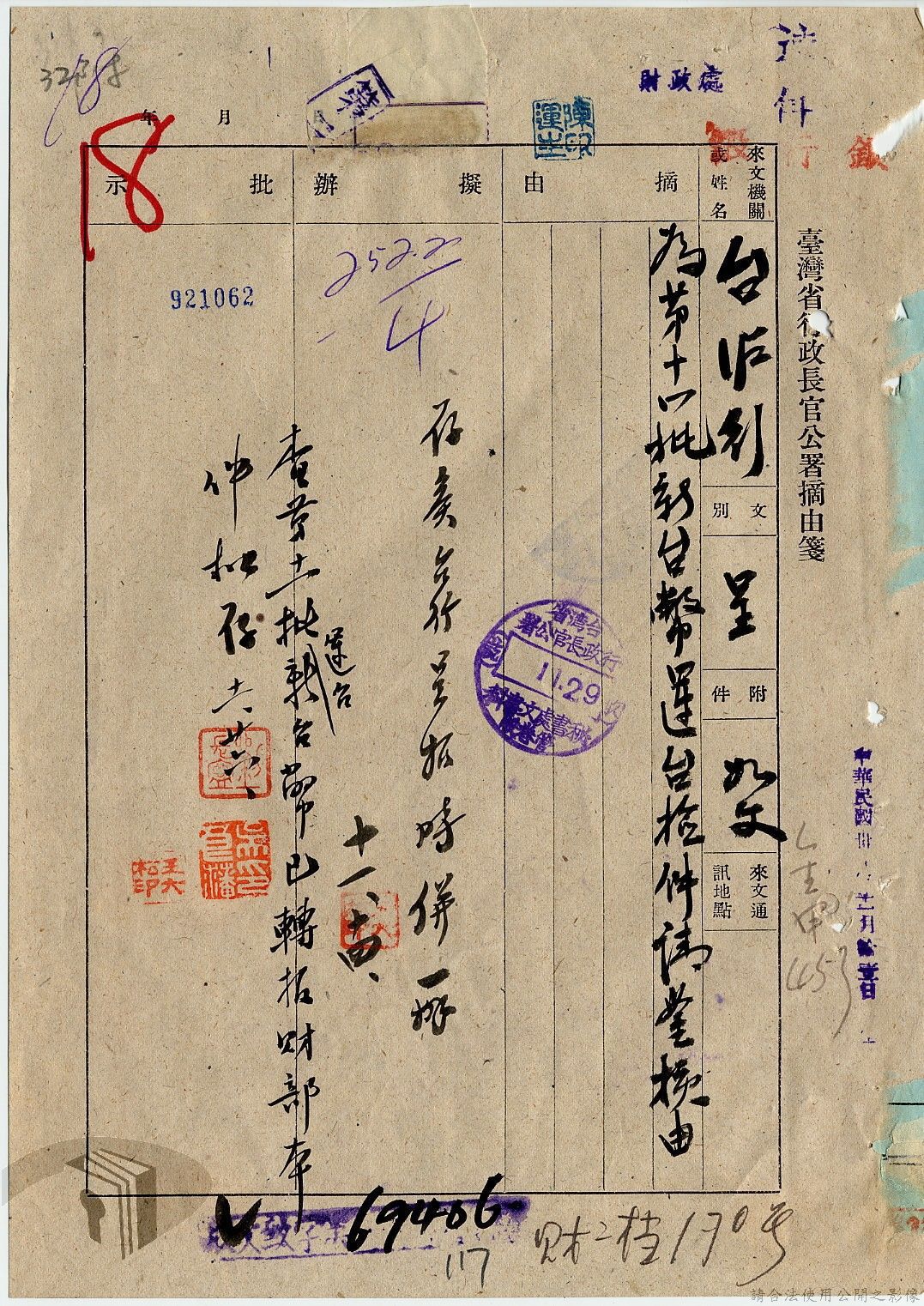 本案為35年間,臺灣省行長官公署財政處與臺灣銀行辦理新臺幣印製及運臺之經過事,公署財政處派員赴上海臺灣銀行分行檢核新臺幣樣張,及財政處對擬印鈔票之面值、數量之意見,以及因為協調新鈔運臺之船運、空運事宜的關係多次電催上海分行速運等,並於該年計有十一批新臺幣先後運臺,併附各批點收清單紀錄,以及新臺幣各種面值鈔票樣張。