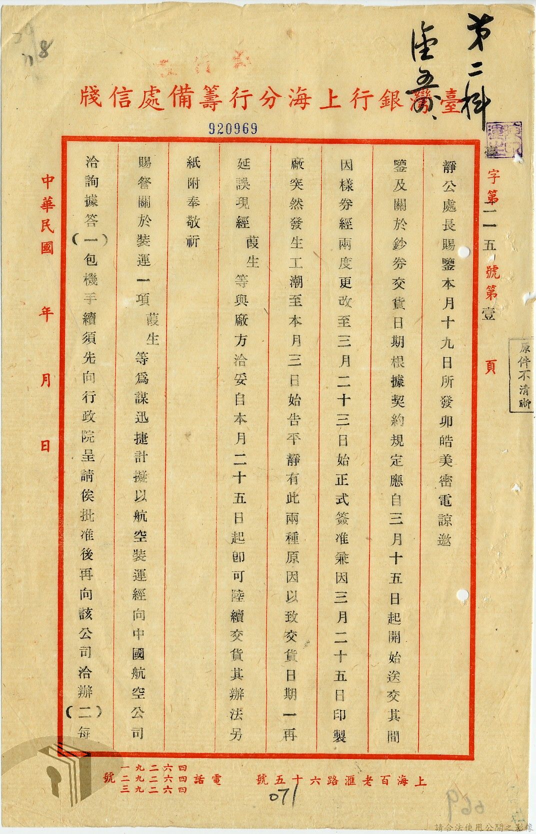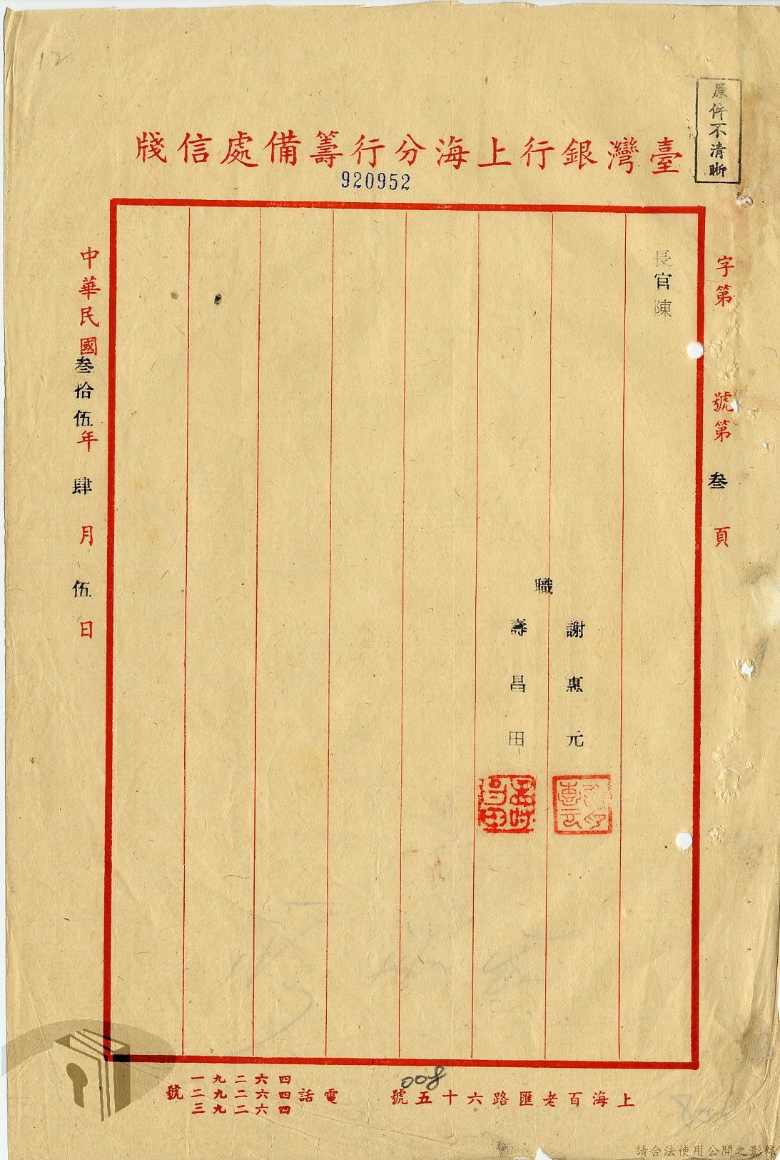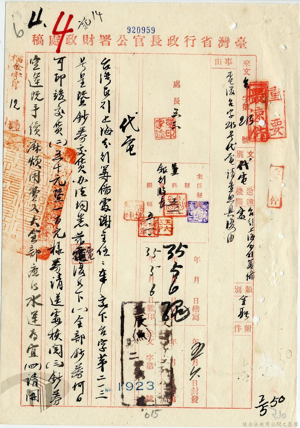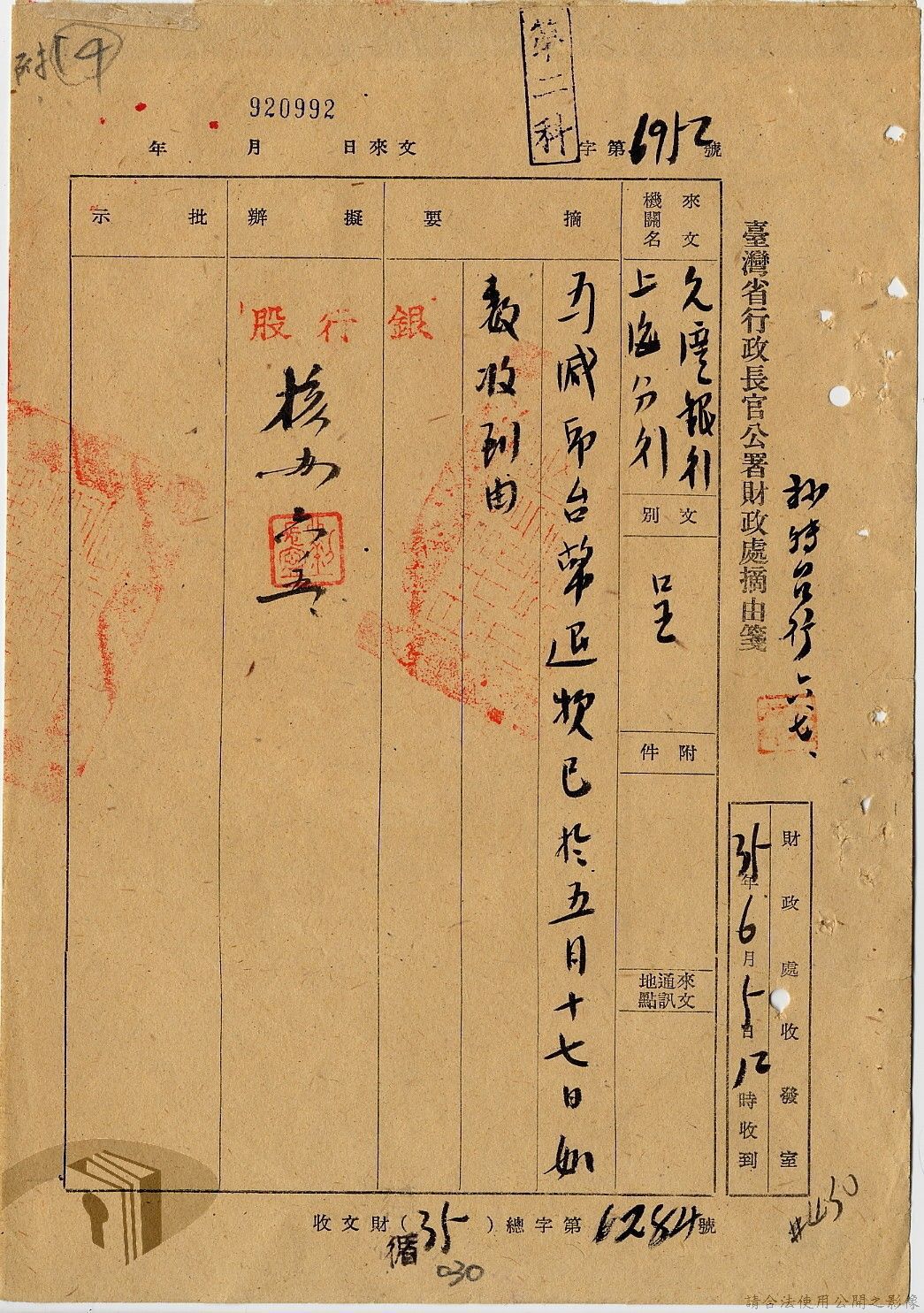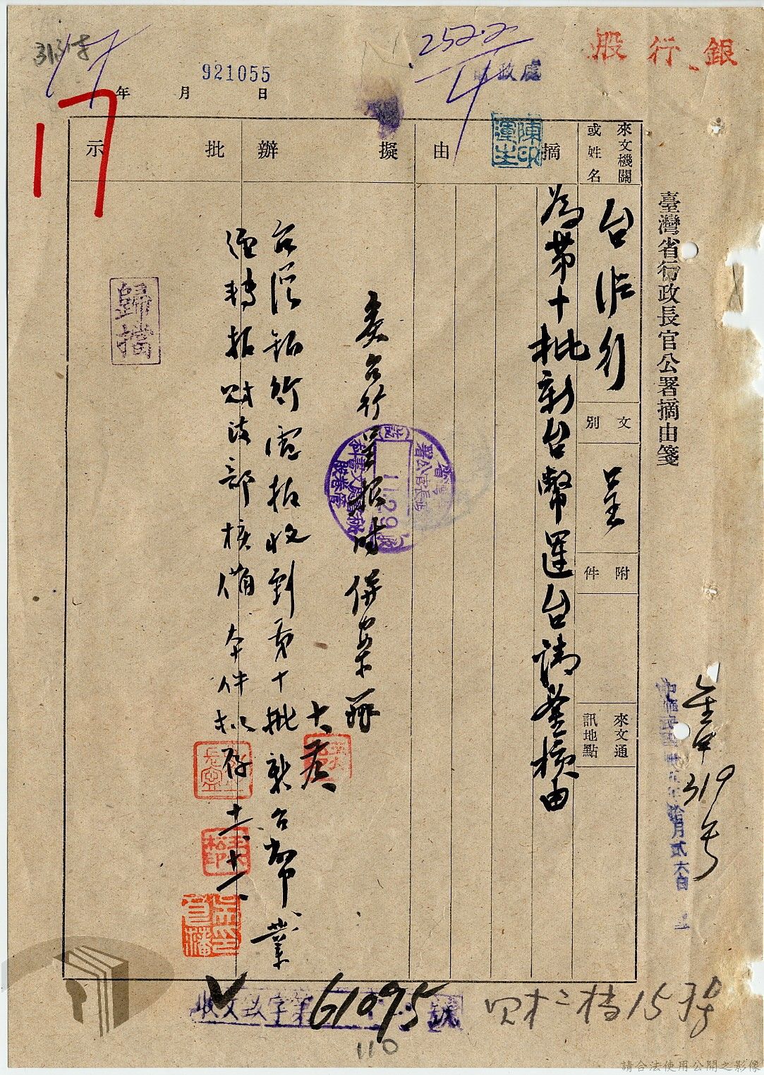 本案為35年間,臺灣省行長官公署財政處與臺灣銀行辦理新臺幣印製及運臺之經過事,公署財政處派員赴上海臺灣銀行分行檢核新臺幣樣張,及財政處對擬印鈔票之面值、數量之意見,以及因為協調新鈔運臺之船運、空運事宜的關係多次電催上海分行速運等,並於該年計有十一批新臺幣先後運臺,併附各批點收清單紀錄,以及新臺幣各種面值鈔票樣張。