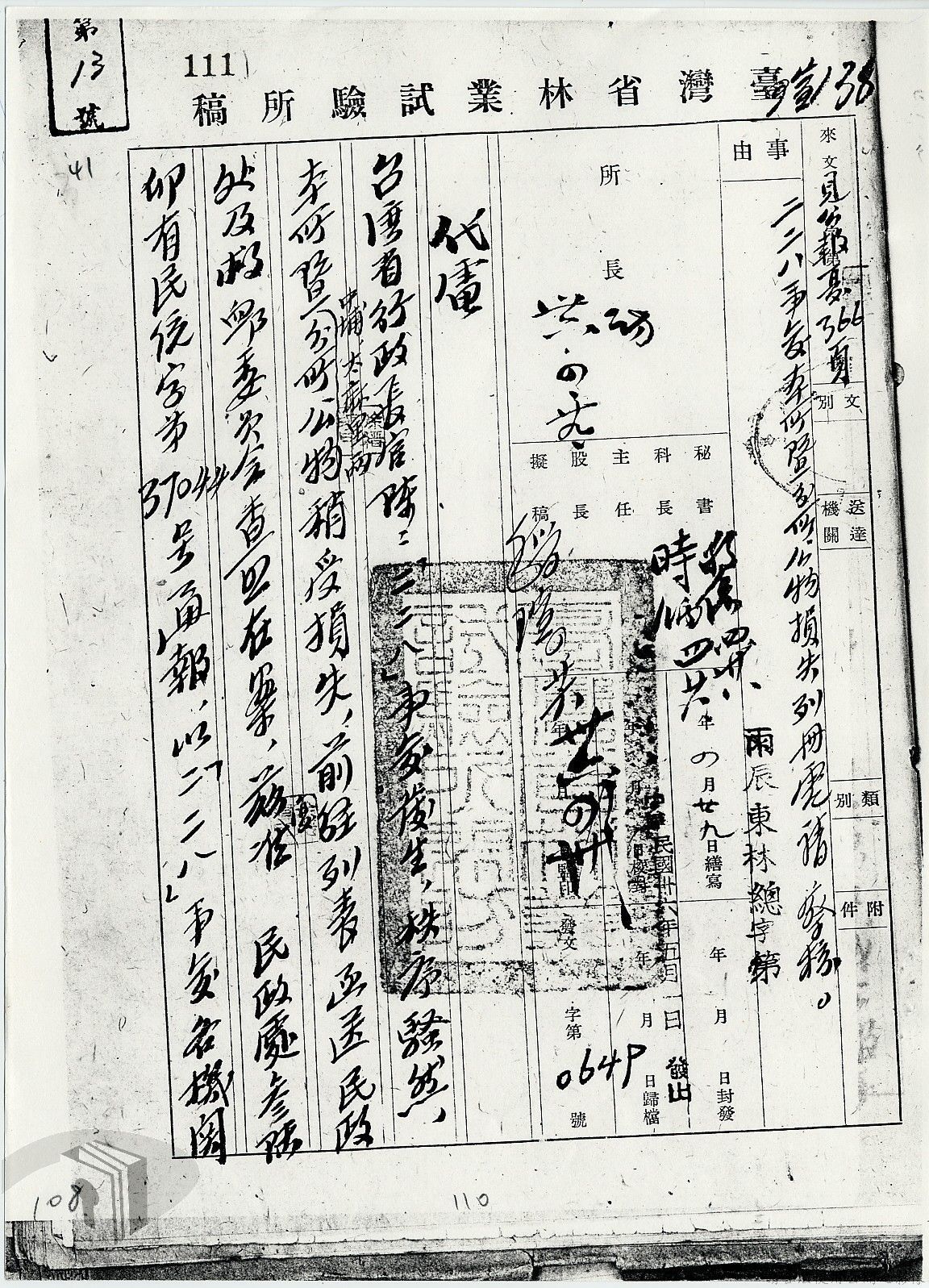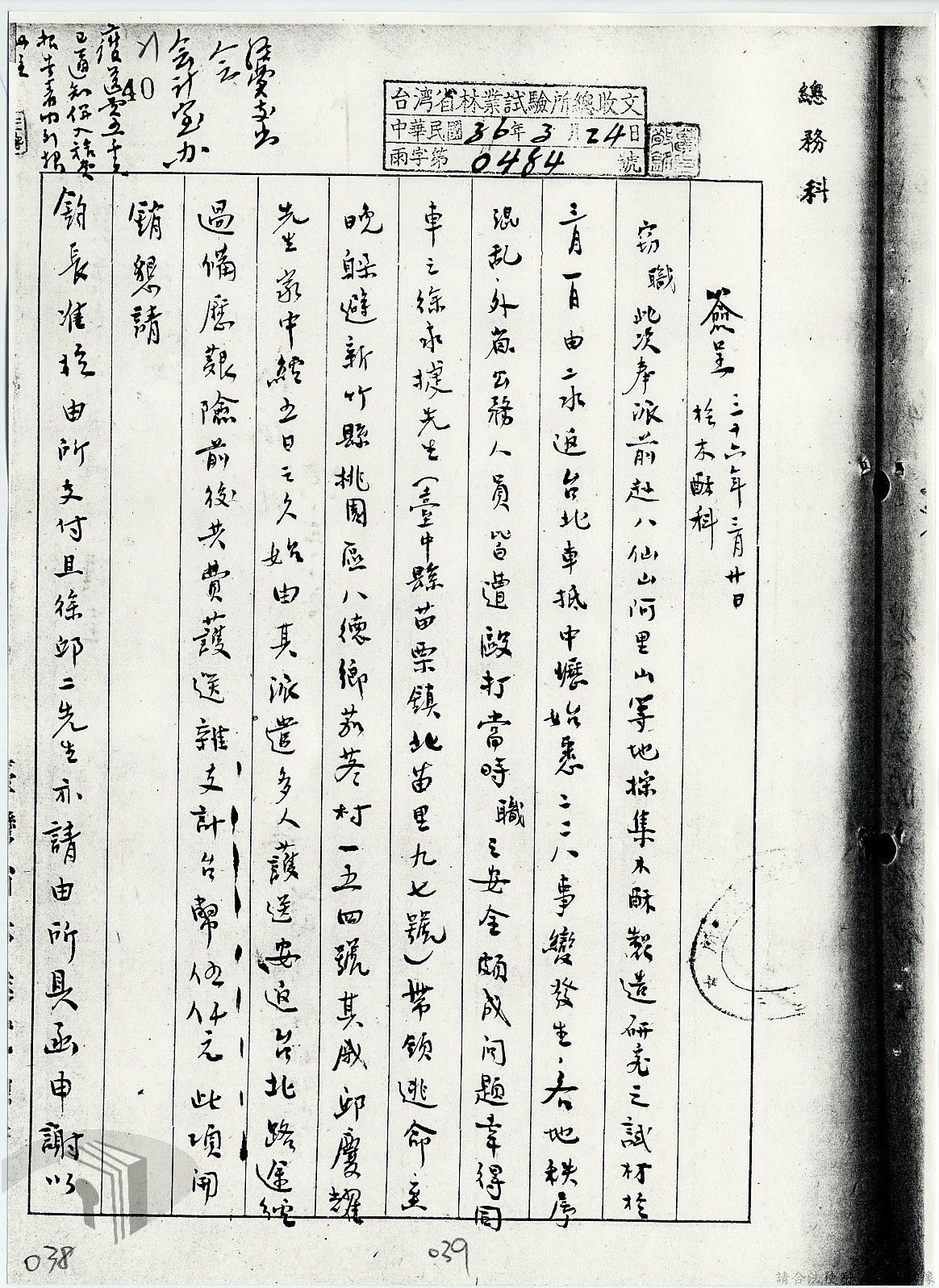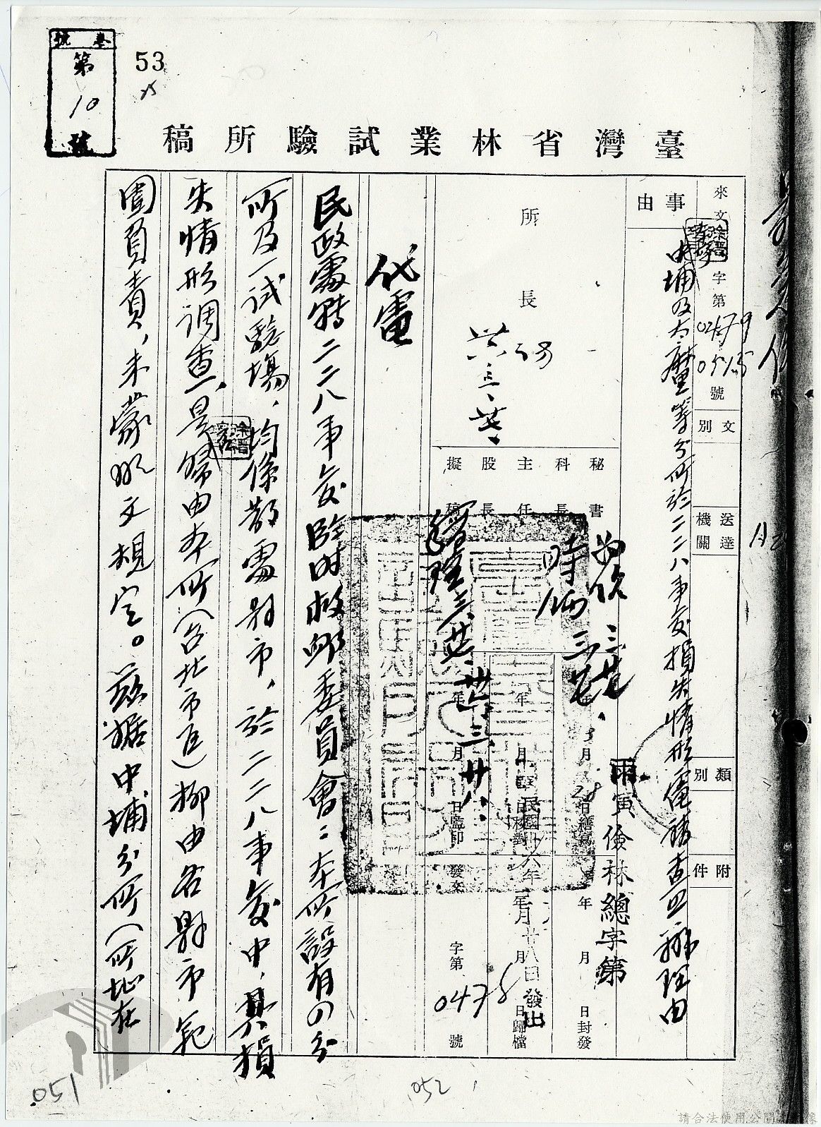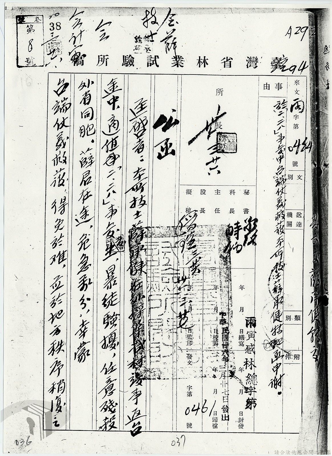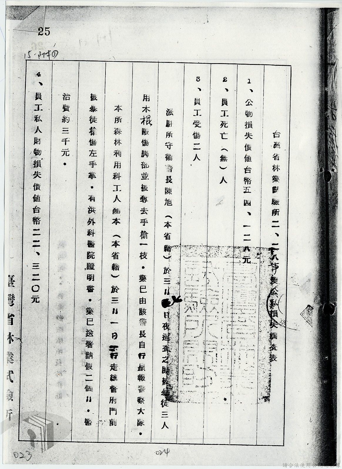 本案為36年間,臺灣省林業試驗所於二二八事件後,所屬各分所向林業所陳報所署人員傷亡撫恤、財產損失核銷以及有功人員獎勵等情形;林業試驗所於事件期間轉發公署處理政策,並要求各分所回報狀況,太麻里、恆春、中埔等各分所回報人員械彈損失情況、林木盜伐情況並檢送公物公產損失調查清冊予林業試驗所等。
