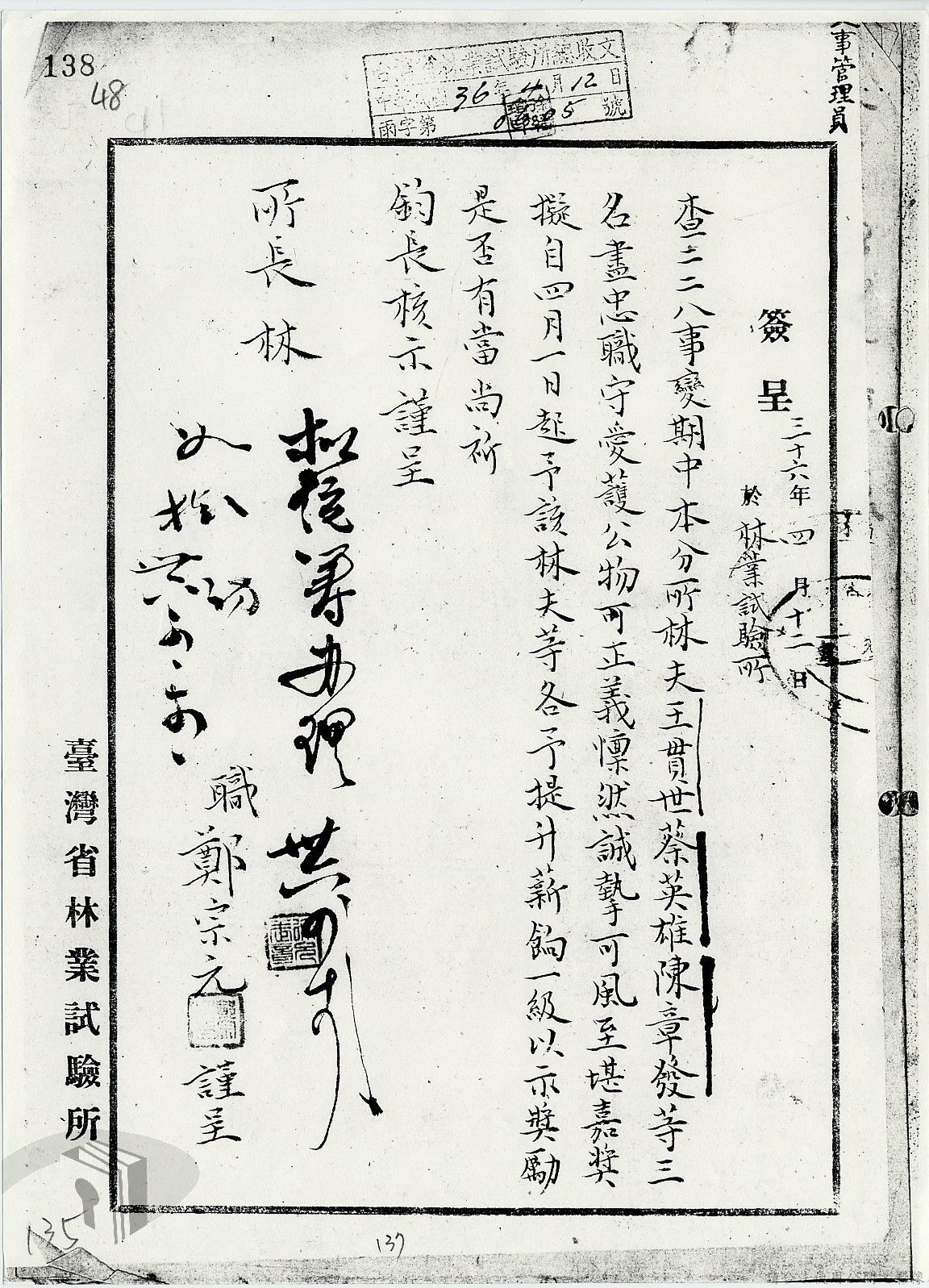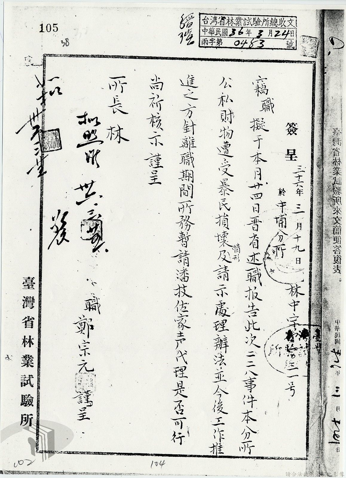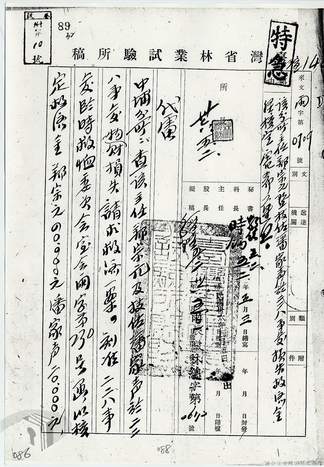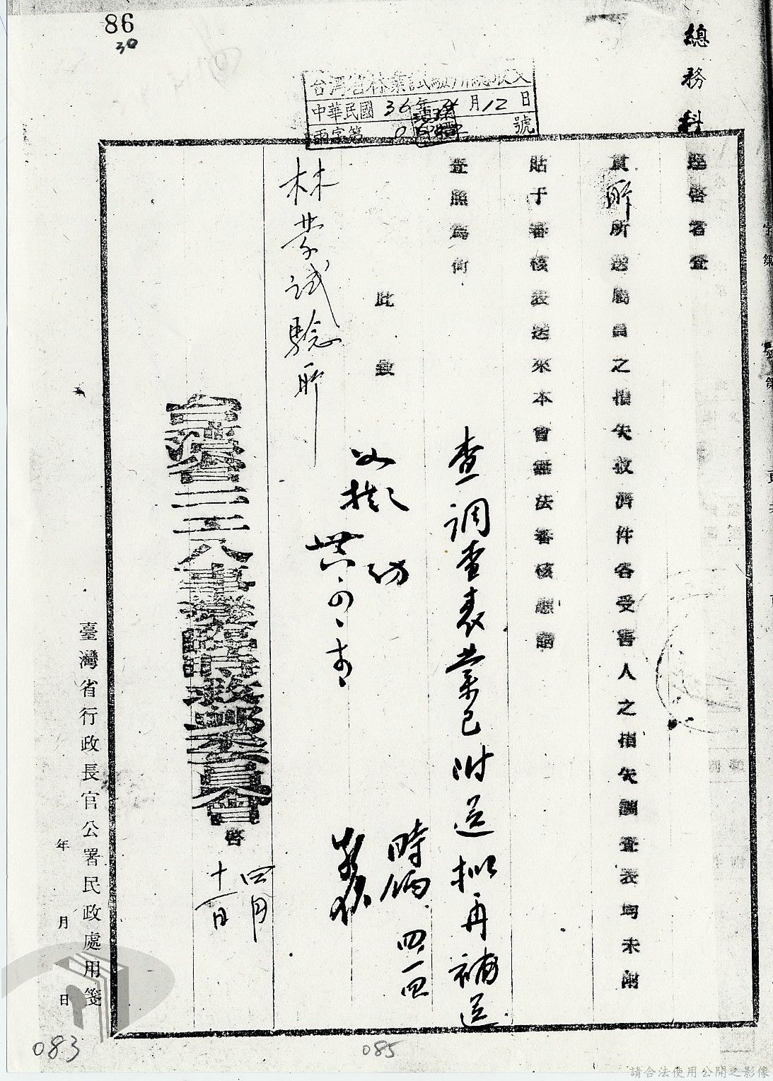 本案為36年間,臺灣省林業試驗所於二二八事件後,所屬各分所向林業所陳報所署人員傷亡撫恤、財產損失核銷以及有功人員獎勵等情形;林業試驗所於事件期間轉發公署處理政策,並要求各分所回報狀況,太麻里、恆春、中埔等各分所回報人員械彈損失情況、林木盜伐情況並檢送公物公產損失調查清冊予林業試驗所等。