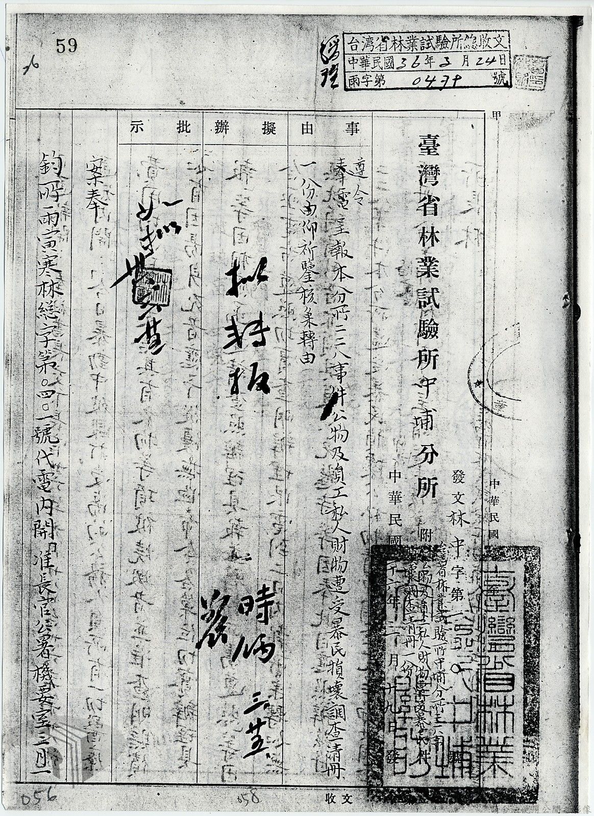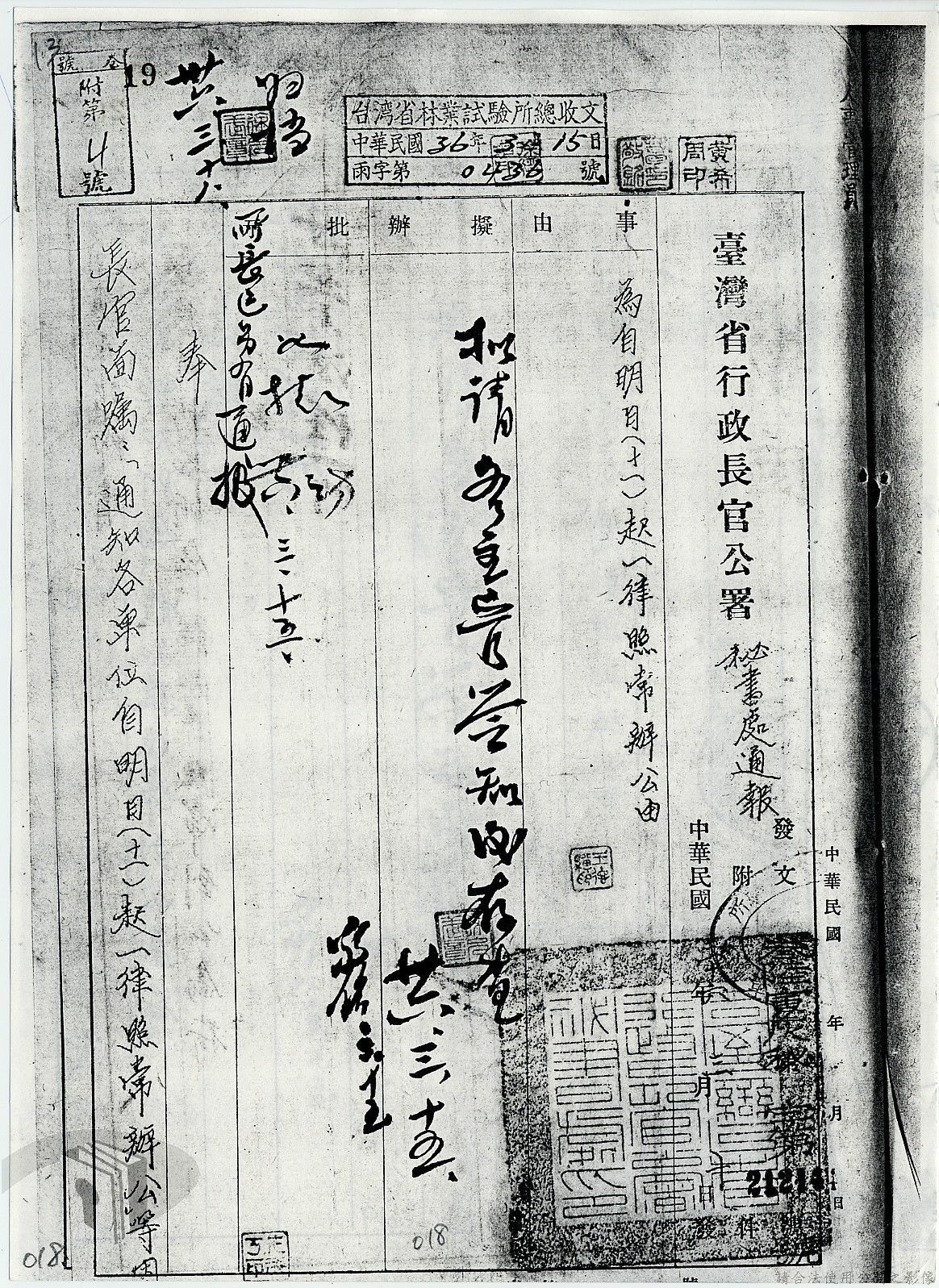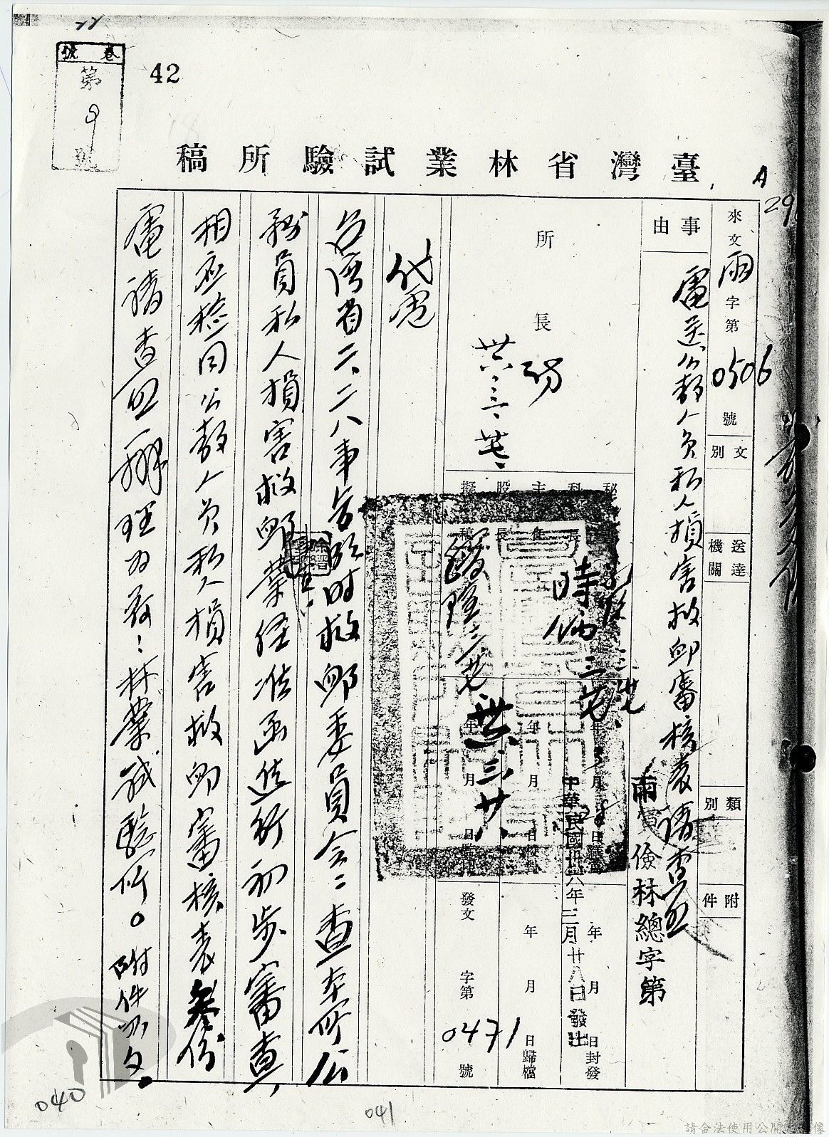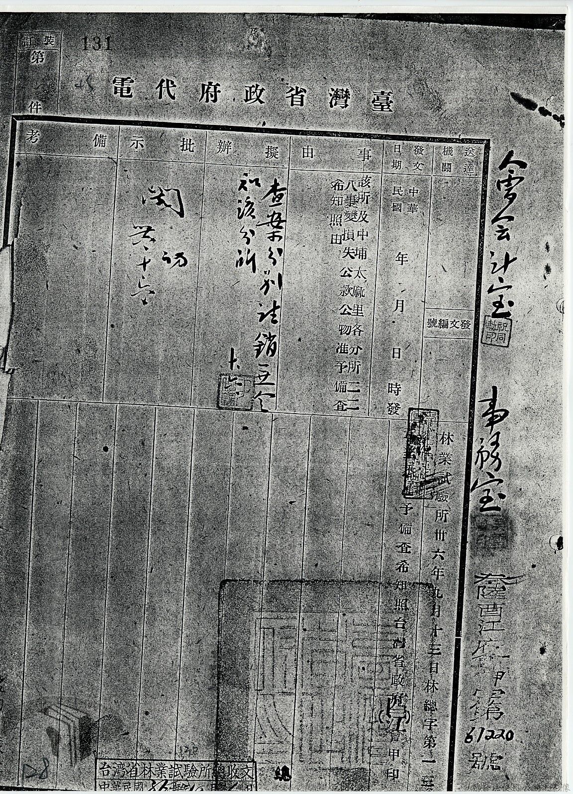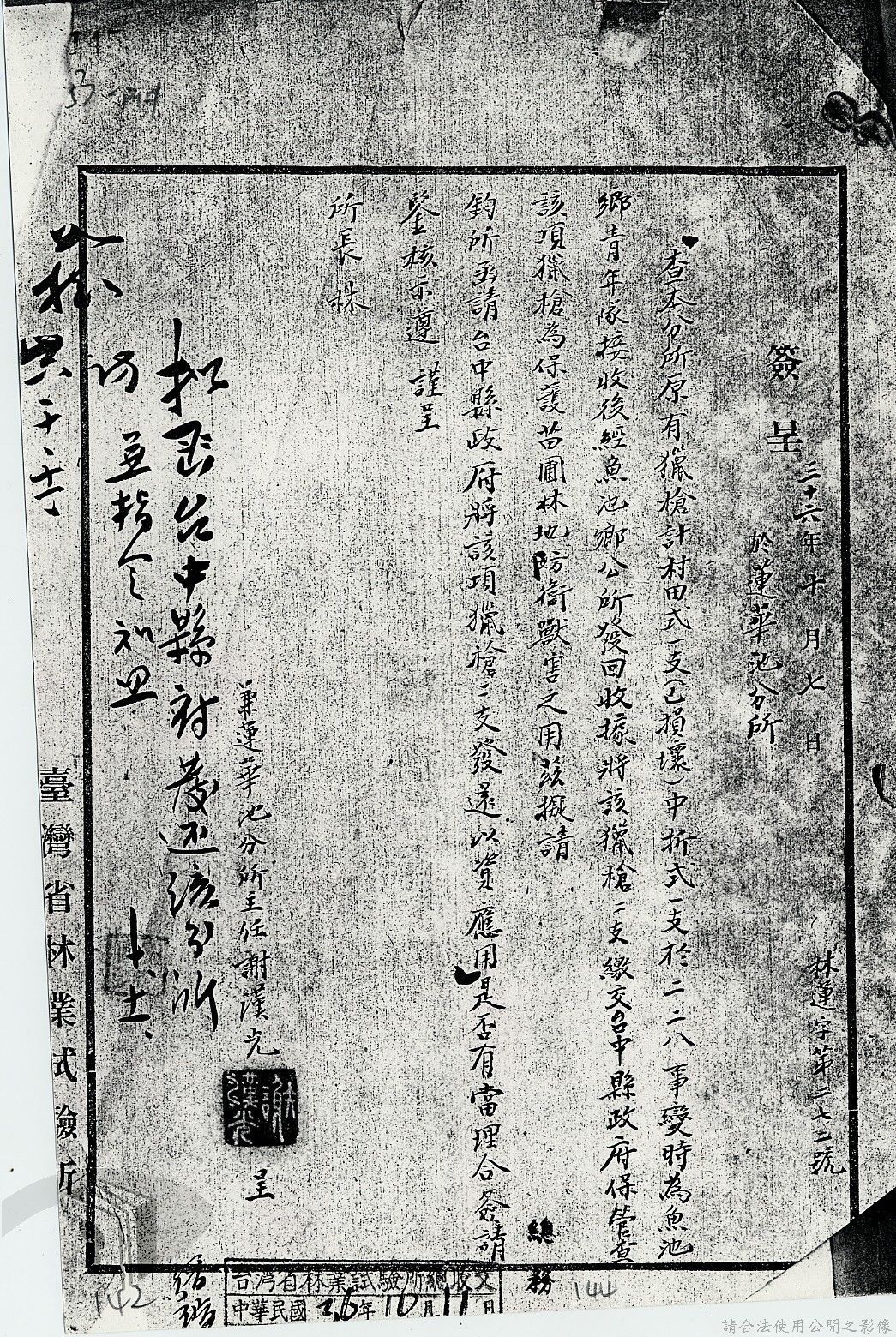 本案為36年間,臺灣省林業試驗所於二二八事件後,所屬各分所向林業所陳報所署人員傷亡撫恤、財產損失核銷以及有功人員獎勵等情形;林業試驗所於事件期間轉發公署處理政策,並要求各分所回報狀況,太麻里、恆春、中埔等各分所回報人員械彈損失情況、林木盜伐情況並檢送公物公產損失調查清冊予林業試驗所等。