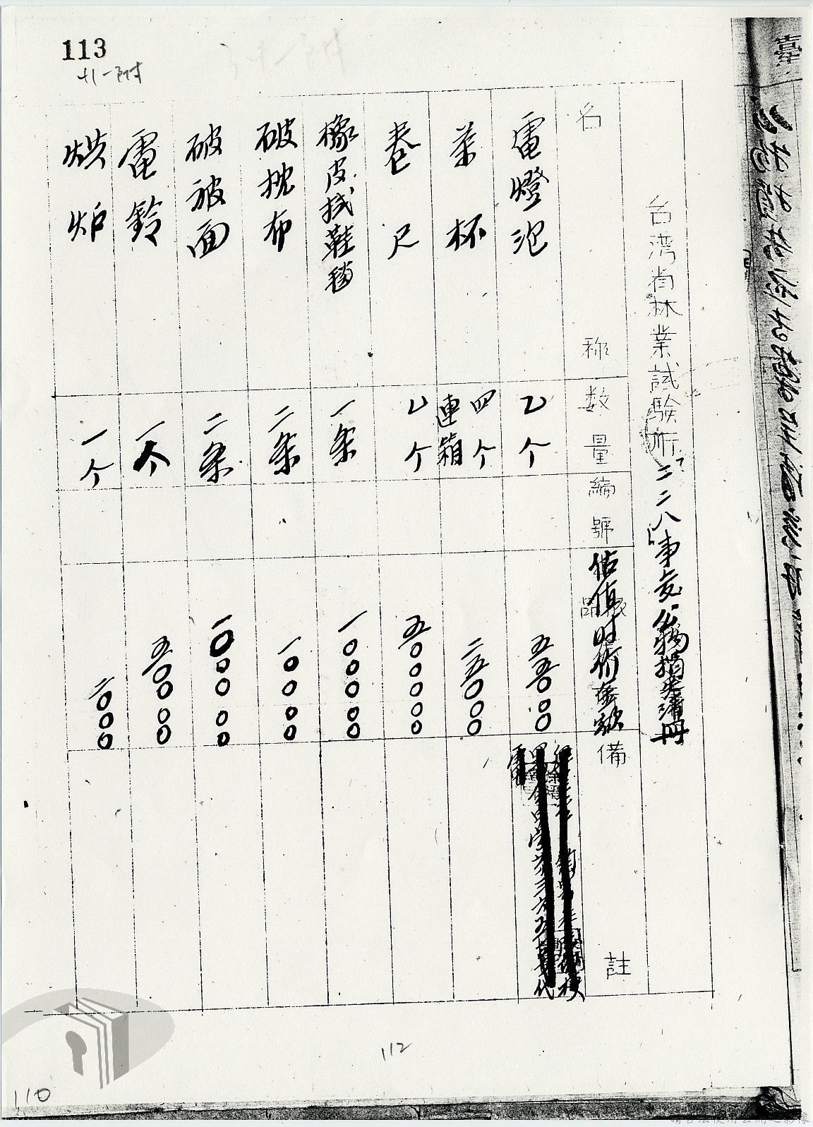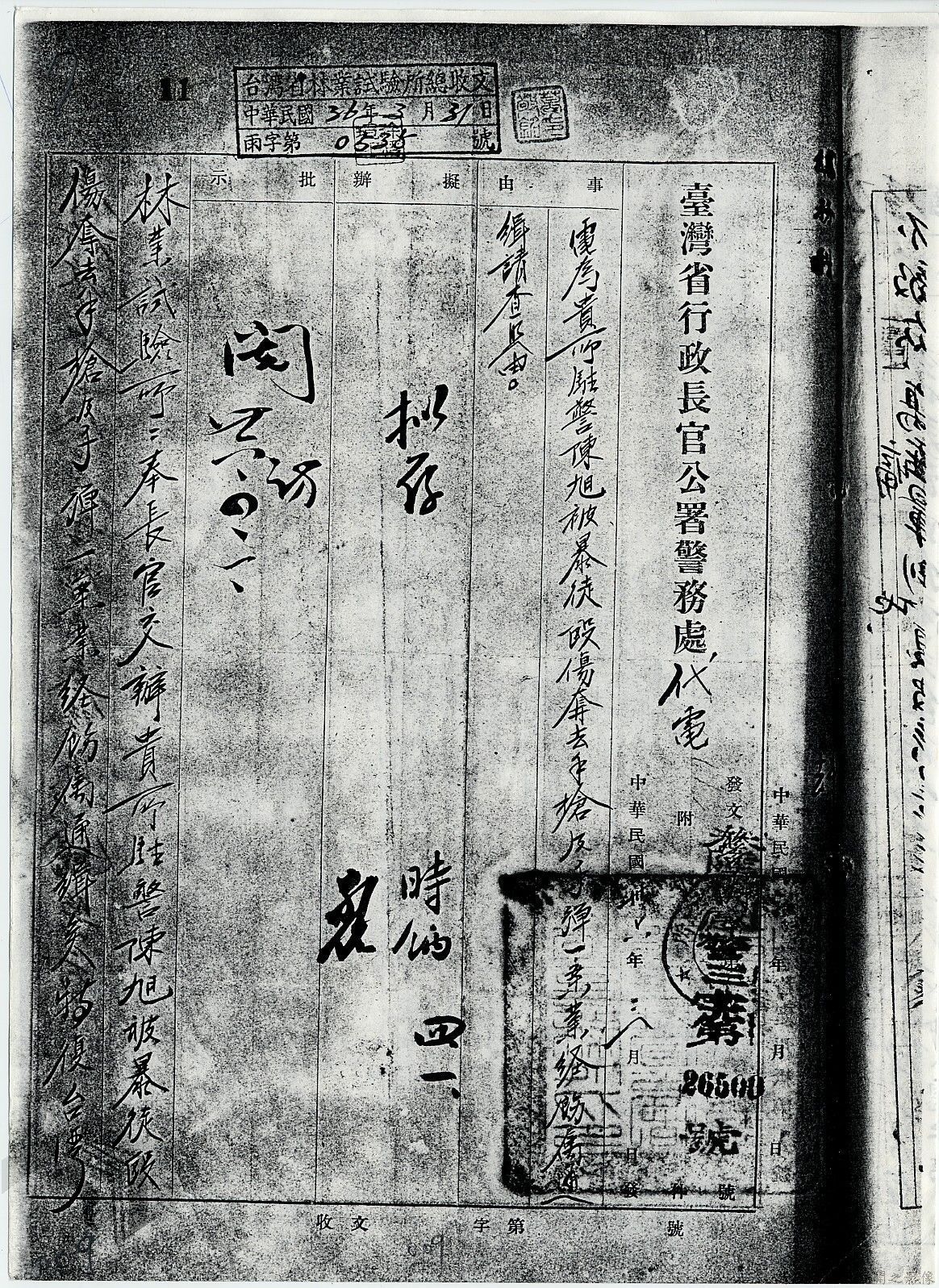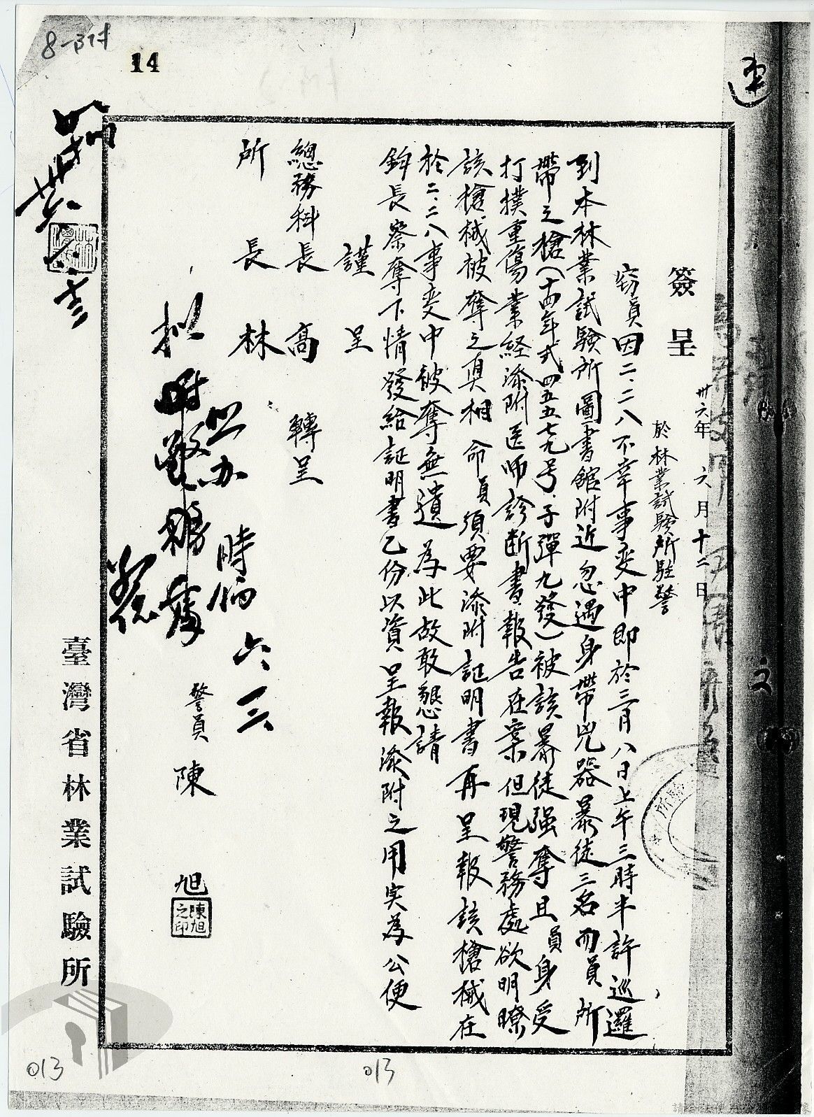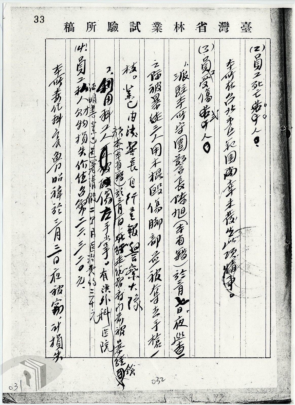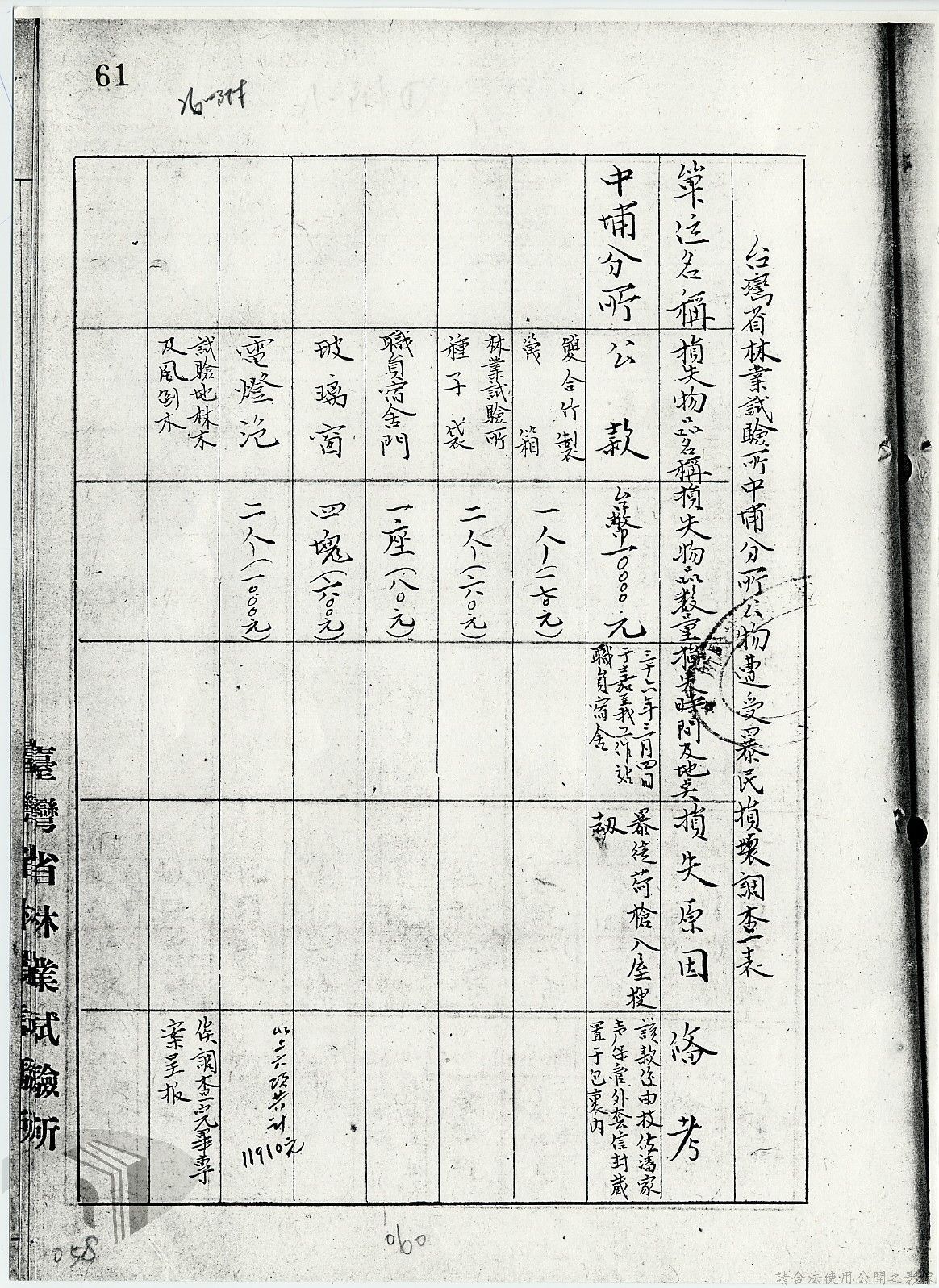 本案為36年間,臺灣省林業試驗所於二二八事件後,所屬各分所向林業所陳報所署人員傷亡撫恤、財產損失核銷以及有功人員獎勵等情形;林業試驗所於事件期間轉發公署處理政策,並要求各分所回報狀況,太麻里、恆春、中埔等各分所回報人員械彈損失情況、林木盜伐情況並檢送公物公產損失調查清冊予林業試驗所等。