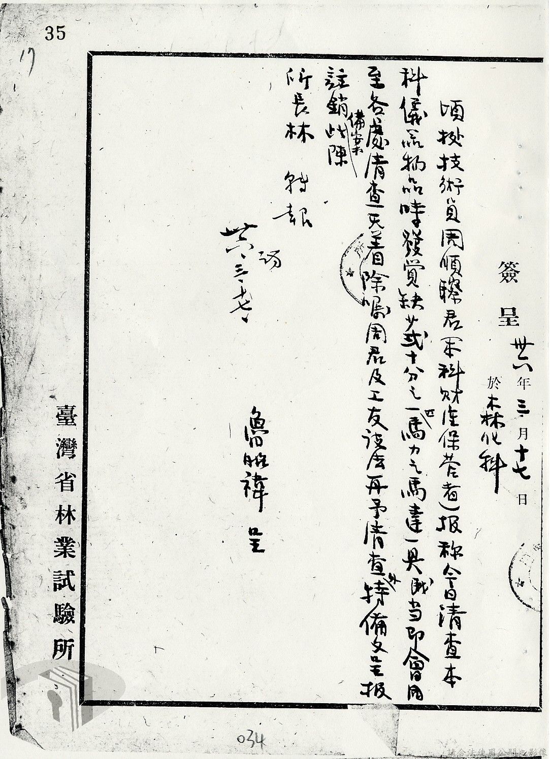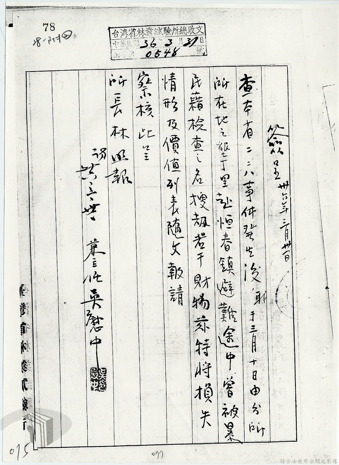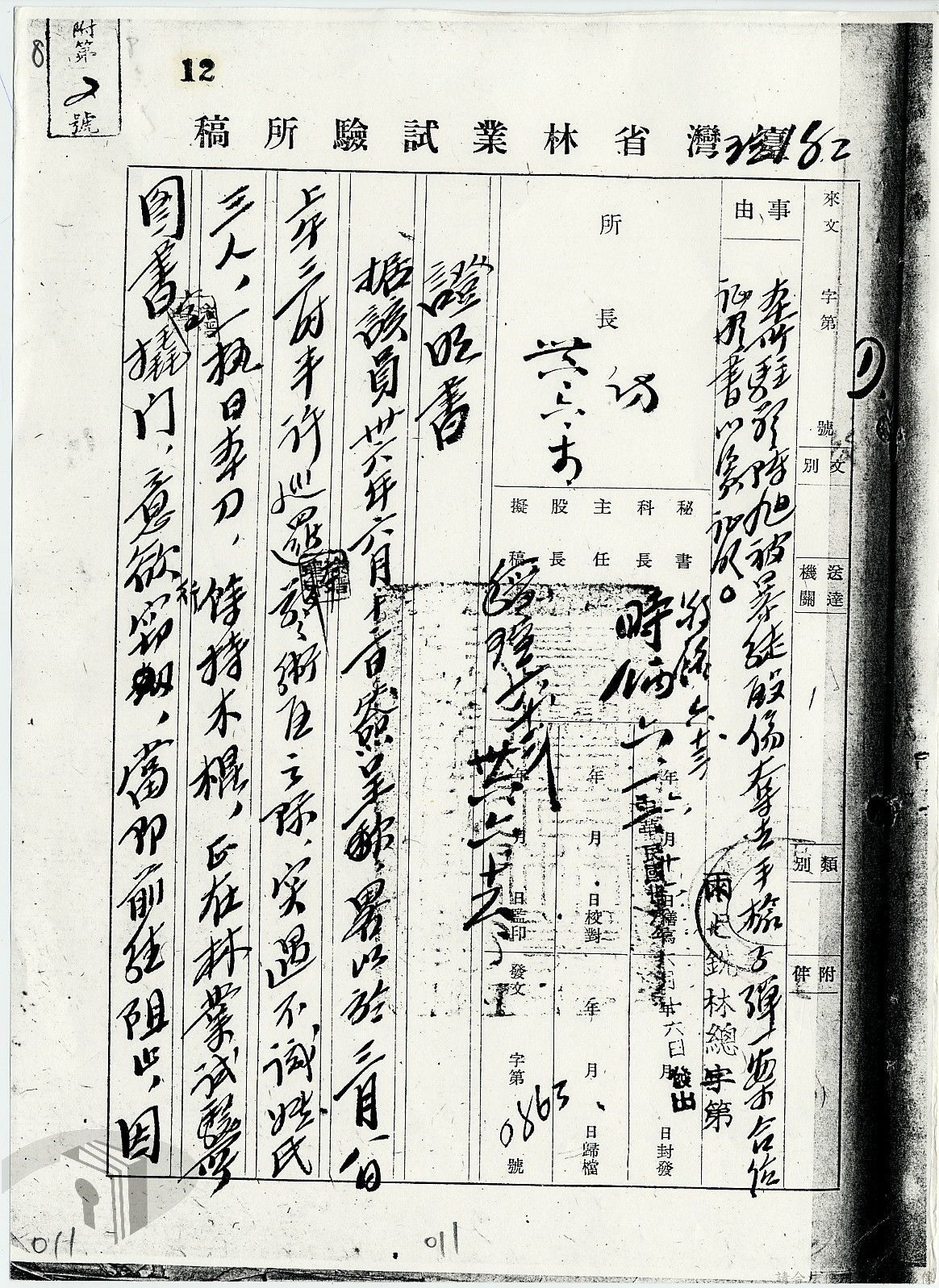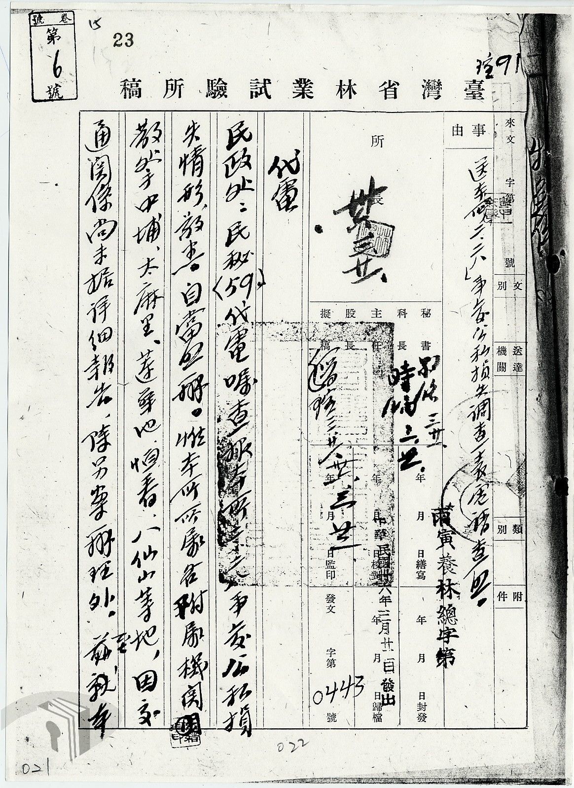 本案為36年間,臺灣省林業試驗所於二二八事件後,所屬各分所向林業所陳報所署人員傷亡撫恤、財產損失核銷以及有功人員獎勵等情形;林業試驗所於事件期間轉發公署處理政策,並要求各分所回報狀況,太麻里、恆春、中埔等各分所回報人員械彈損失情況、林木盜伐情況並檢送公物公產損失調查清冊予林業試驗所等。