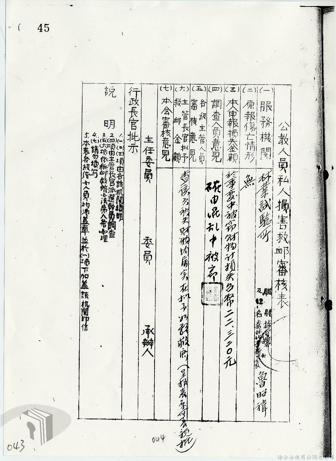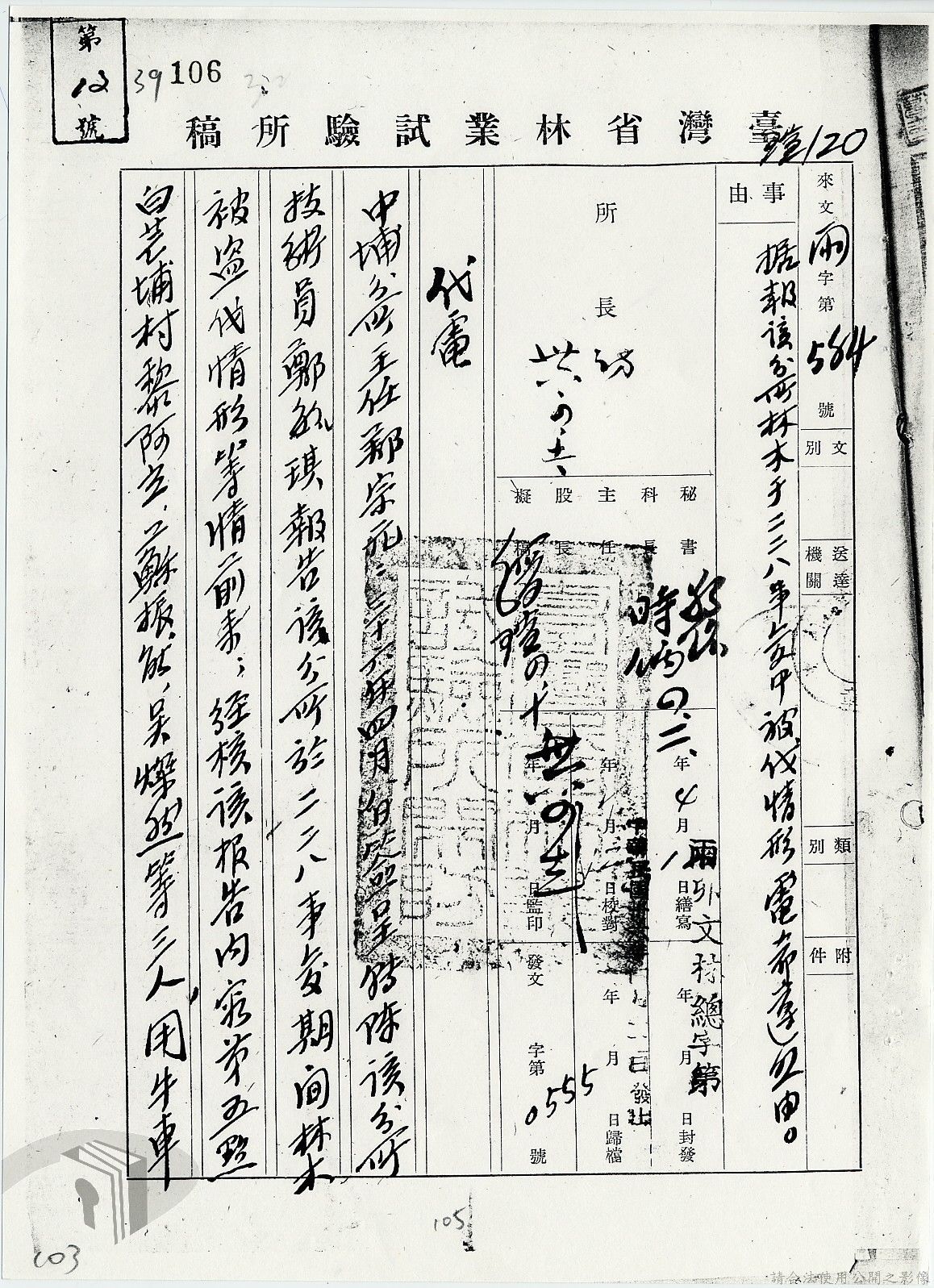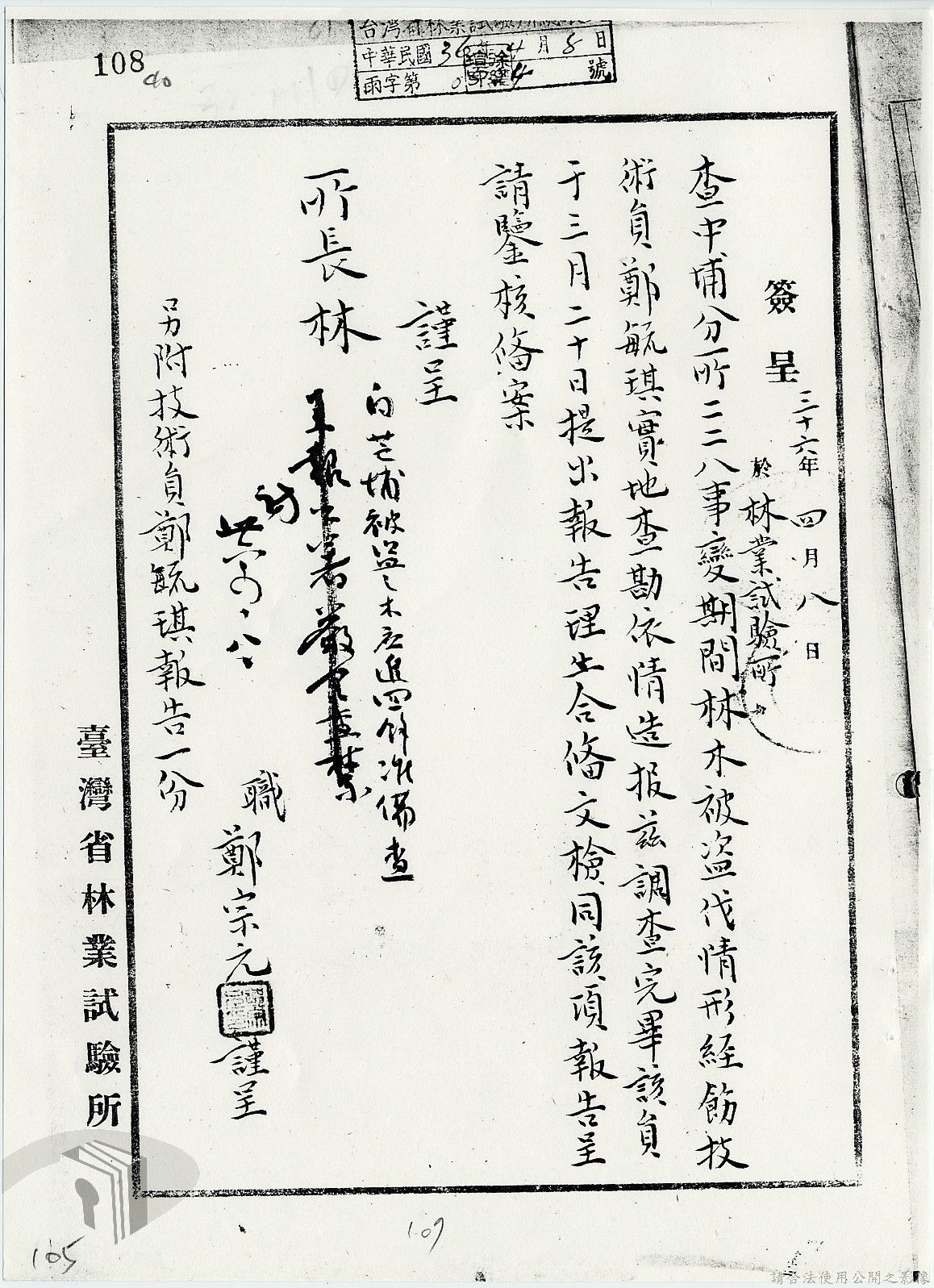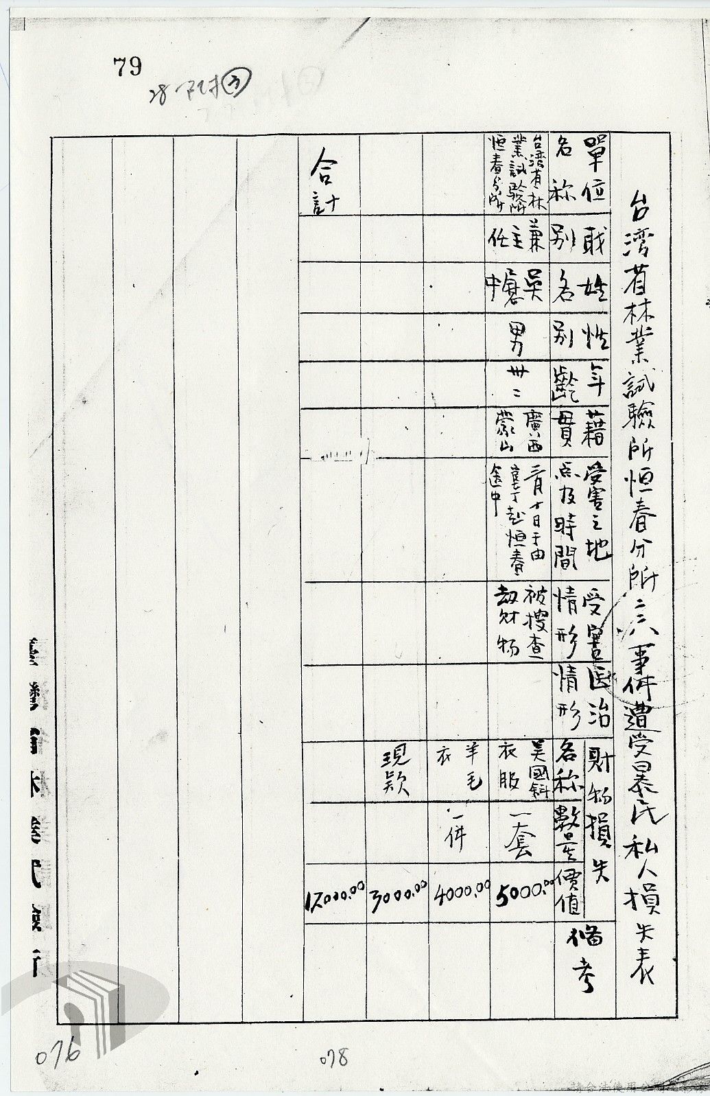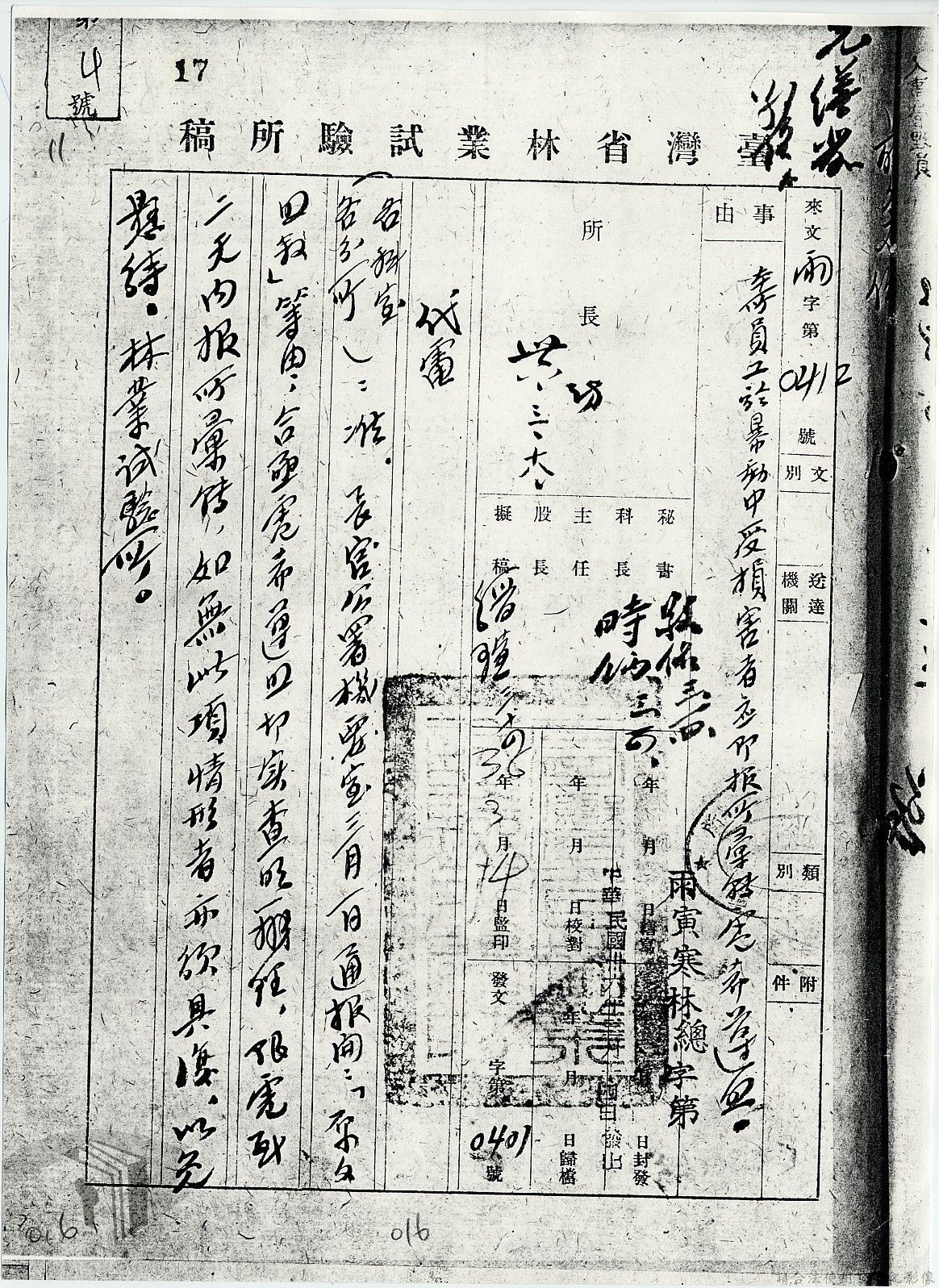 本案為36年間,臺灣省林業試驗所於二二八事件後,所屬各分所向林業所陳報所署人員傷亡撫恤、財產損失核銷以及有功人員獎勵等情形;林業試驗所於事件期間轉發公署處理政策,並要求各分所回報狀況,太麻里、恆春、中埔等各分所回報人員械彈損失情況、林木盜伐情況並檢送公物公產損失調查清冊予林業試驗所等。