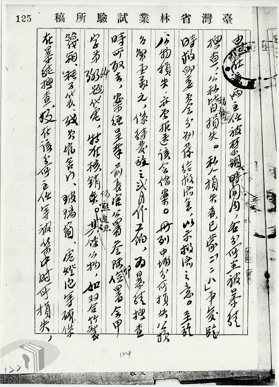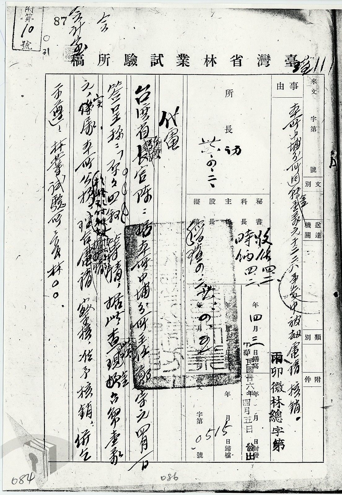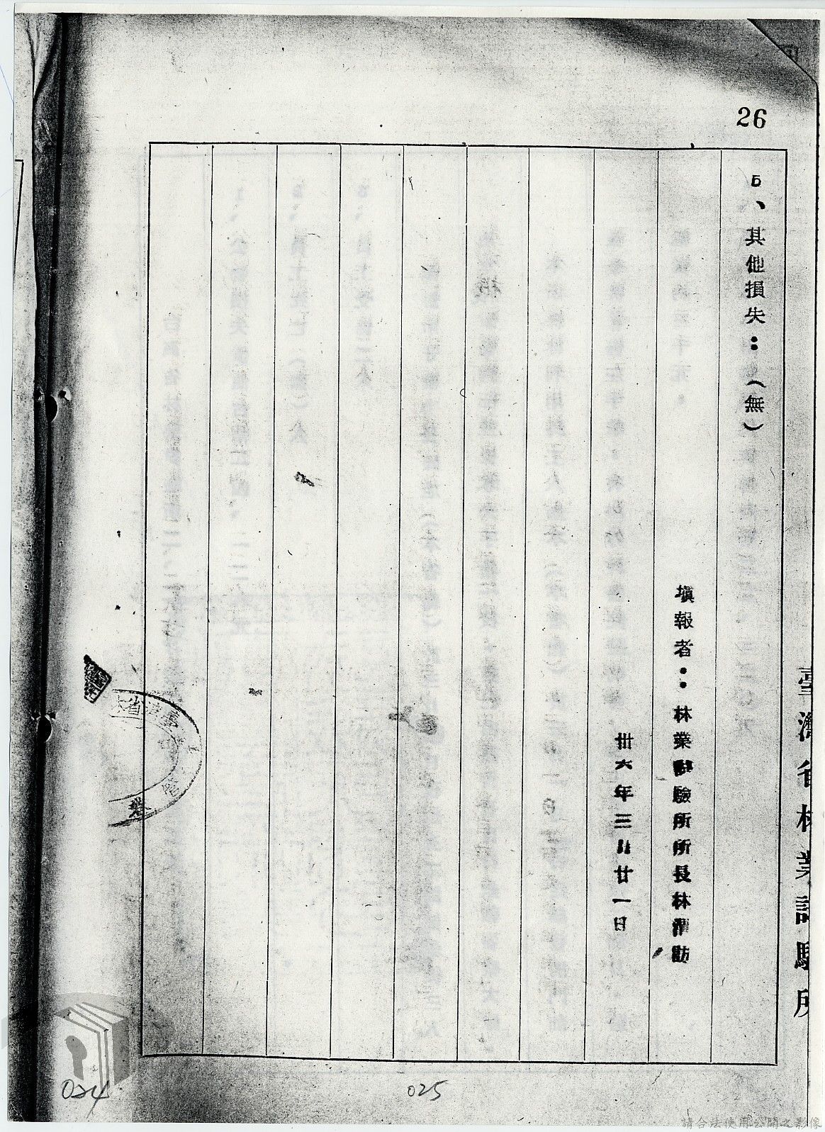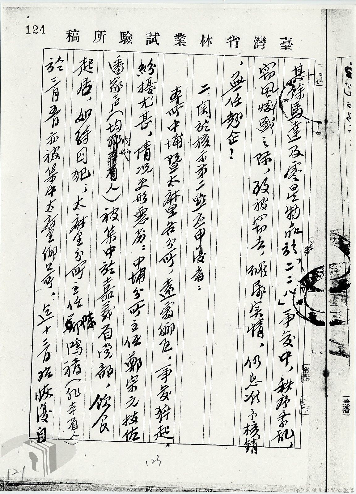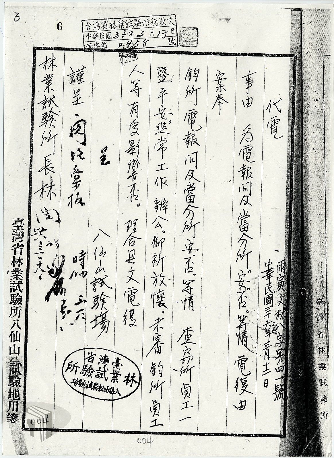 本案為36年間,臺灣省林業試驗所於二二八事件後,所屬各分所向林業所陳報所署人員傷亡撫恤、財產損失核銷以及有功人員獎勵等情形;林業試驗所於事件期間轉發公署處理政策,並要求各分所回報狀況,太麻里、恆春、中埔等各分所回報人員械彈損失情況、林木盜伐情況並檢送公物公產損失調查清冊予林業試驗所等。