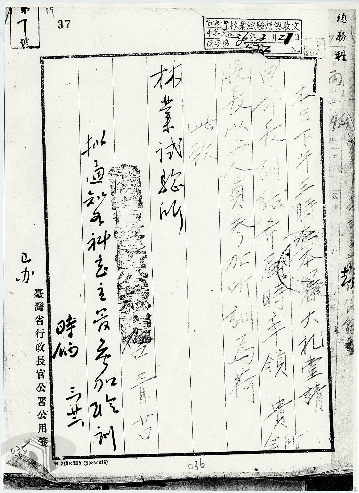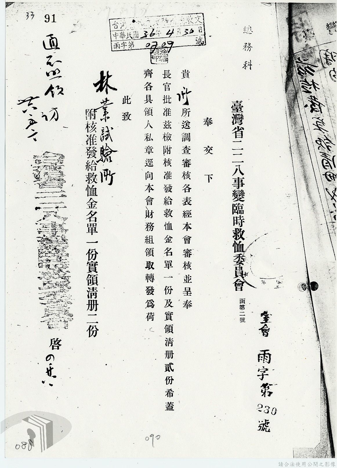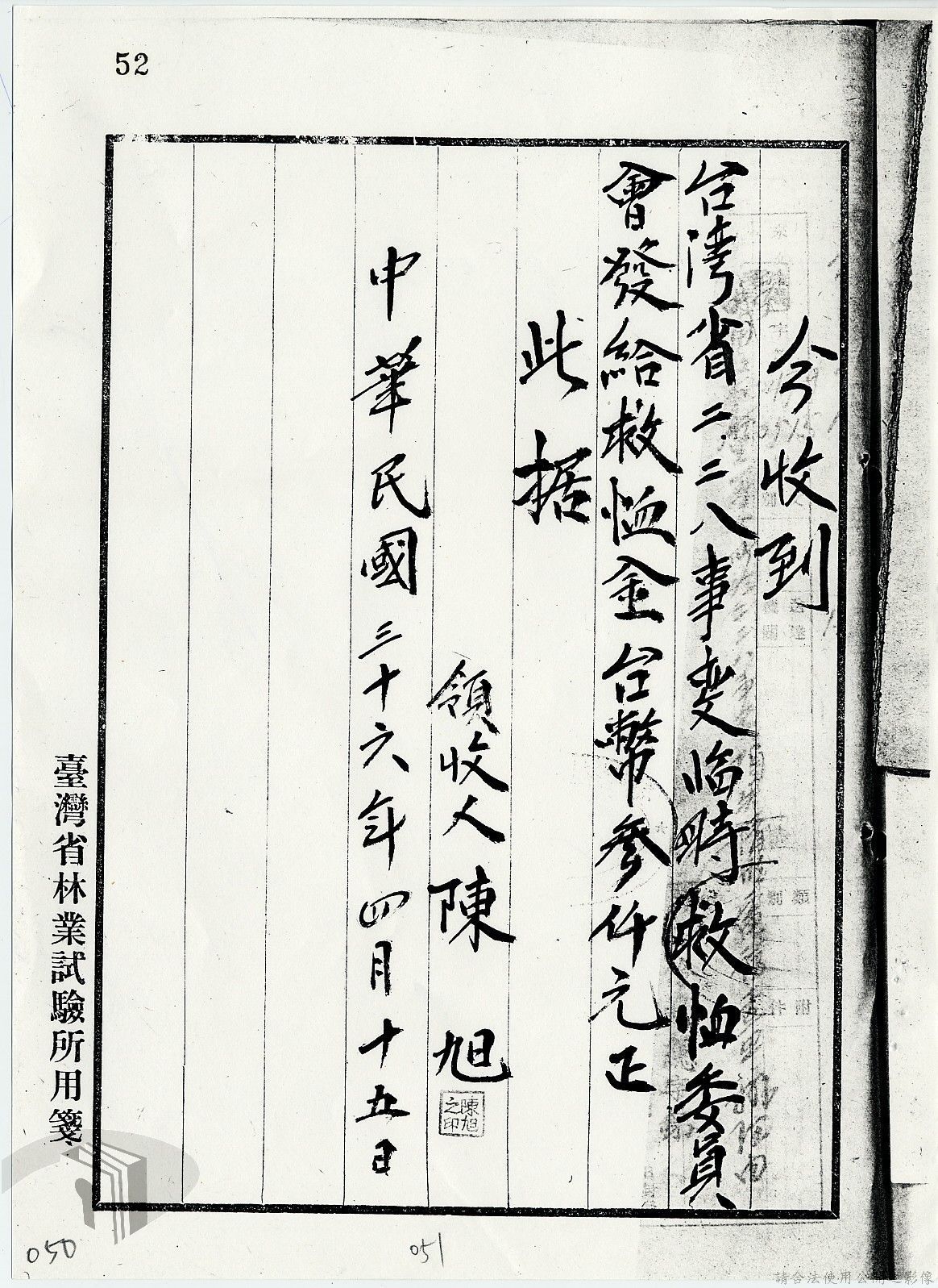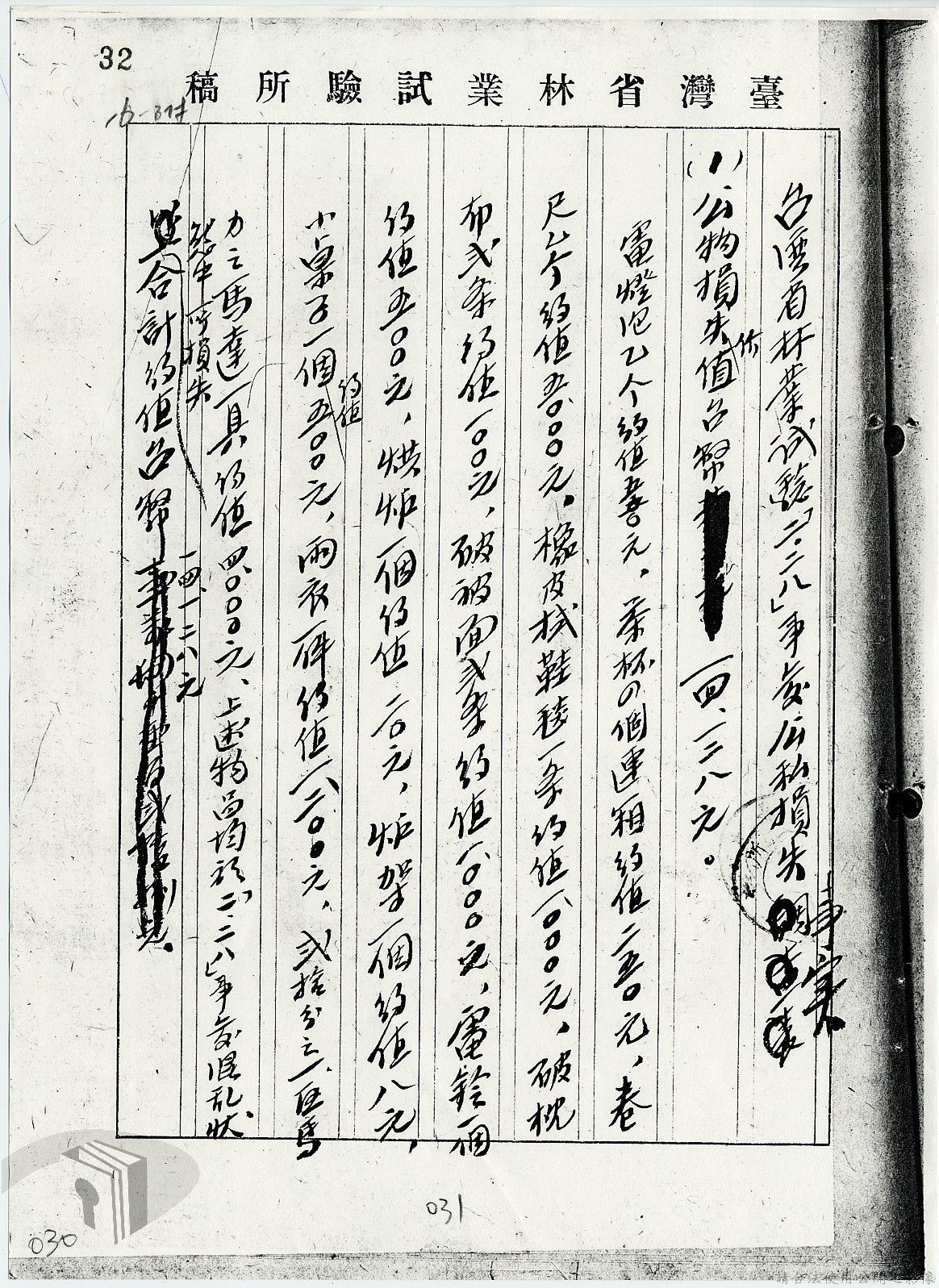 本案為36年間,臺灣省林業試驗所於二二八事件後,所屬各分所向林業所陳報所署人員傷亡撫恤、財產損失核銷以及有功人員獎勵等情形;林業試驗所於事件期間轉發公署處理政策,並要求各分所回報狀況,太麻里、恆春、中埔等各分所回報人員械彈損失情況、林木盜伐情況並檢送公物公產損失調查清冊予林業試驗所等。