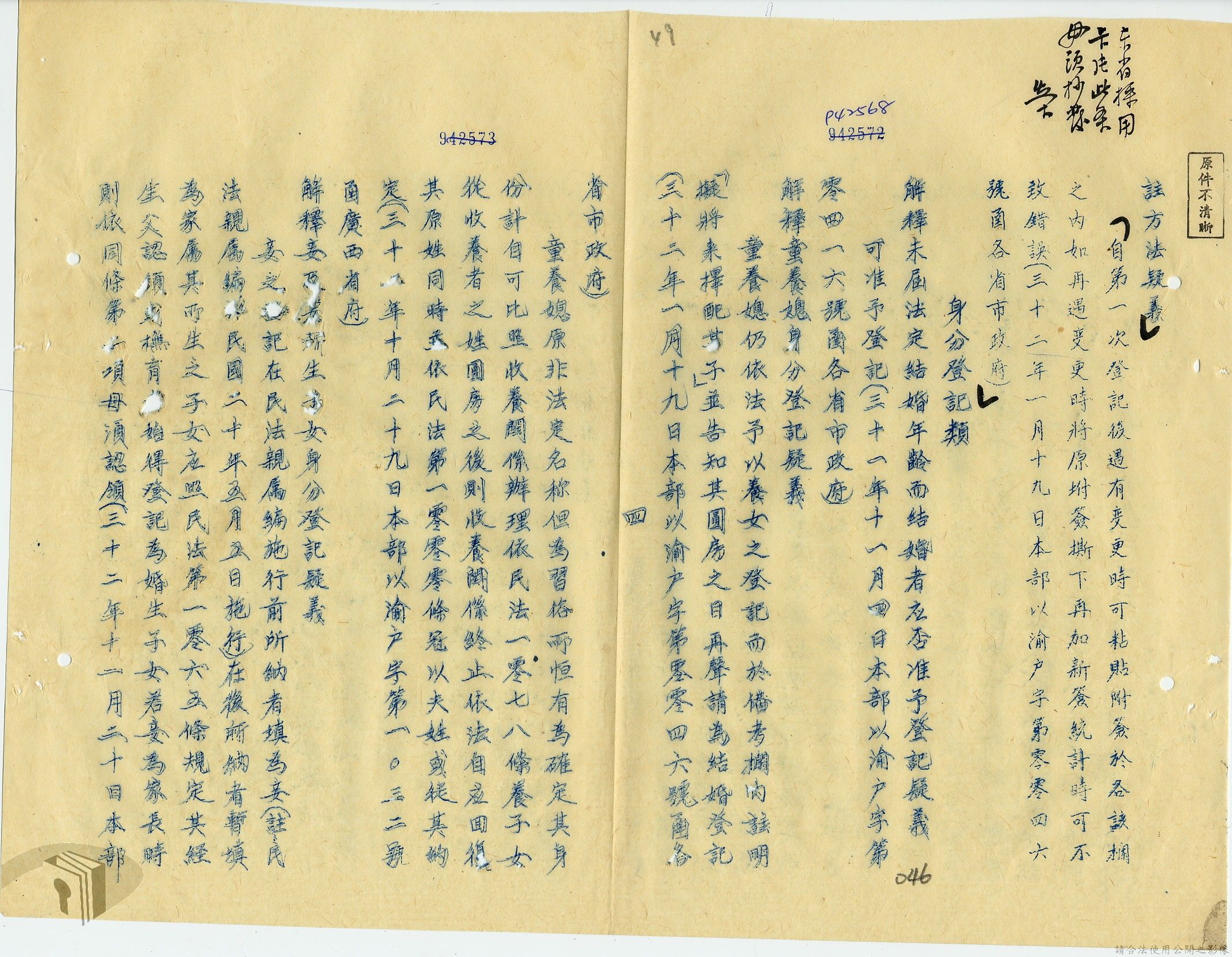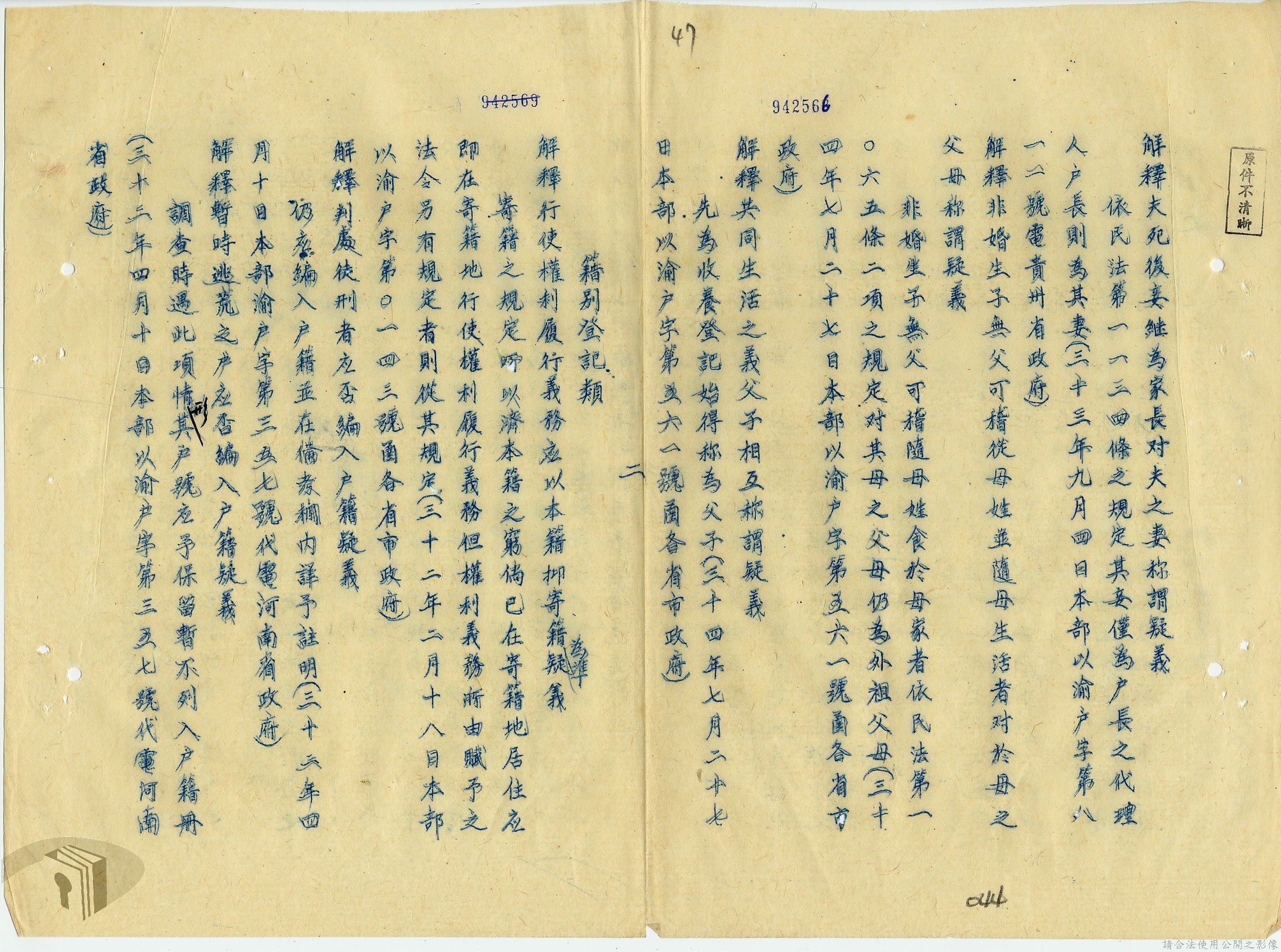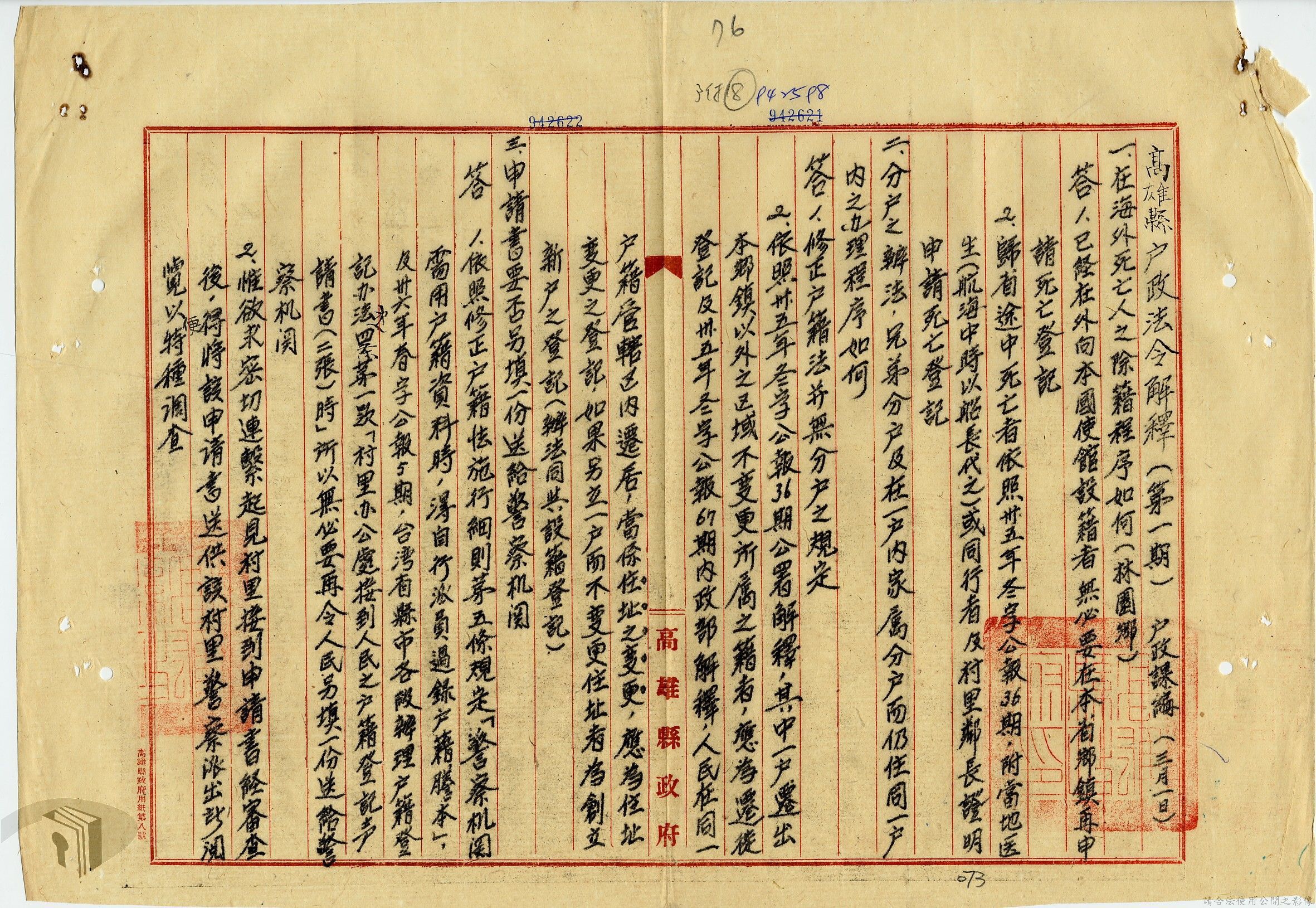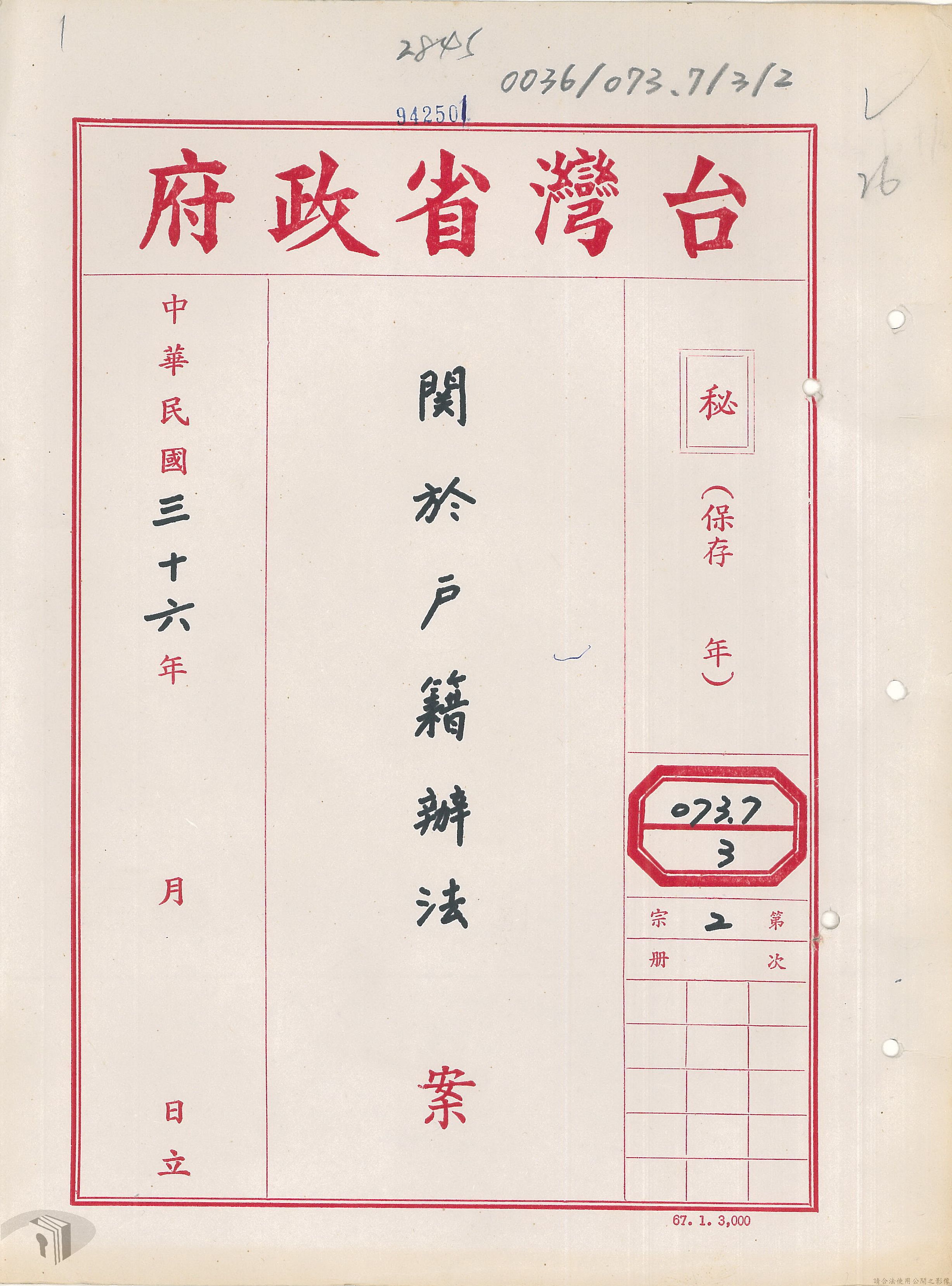 本案為36年間,臺灣省行政長官公署辦理戶籍登記清查工作經過以及所頒行之各項相關法令;長官公署處理各縣市辦理戶籍登記之疑義,包括出生年月日修改、父子姓氏不合、日本姓名改正等,公署分行予以答復或請示內政部核示之,並抄發戶籍法疑義解釋第一、二輯給各縣市政府查照;二二八事件發生後,公署及警備司令部執行清鄉計劃,並頒發臨時清查戶口實施辦法及聯保切結書格式給二十一師司令部。