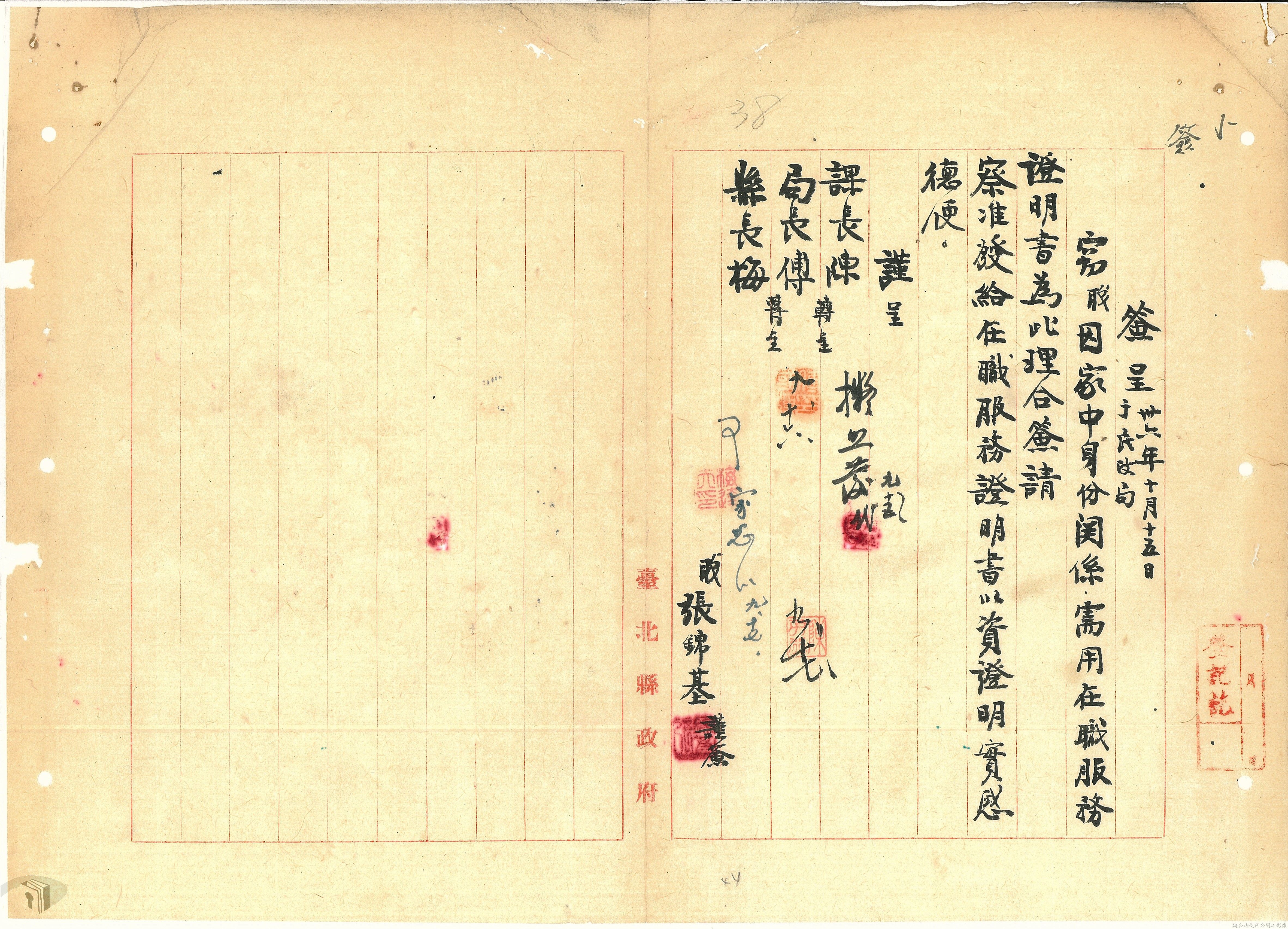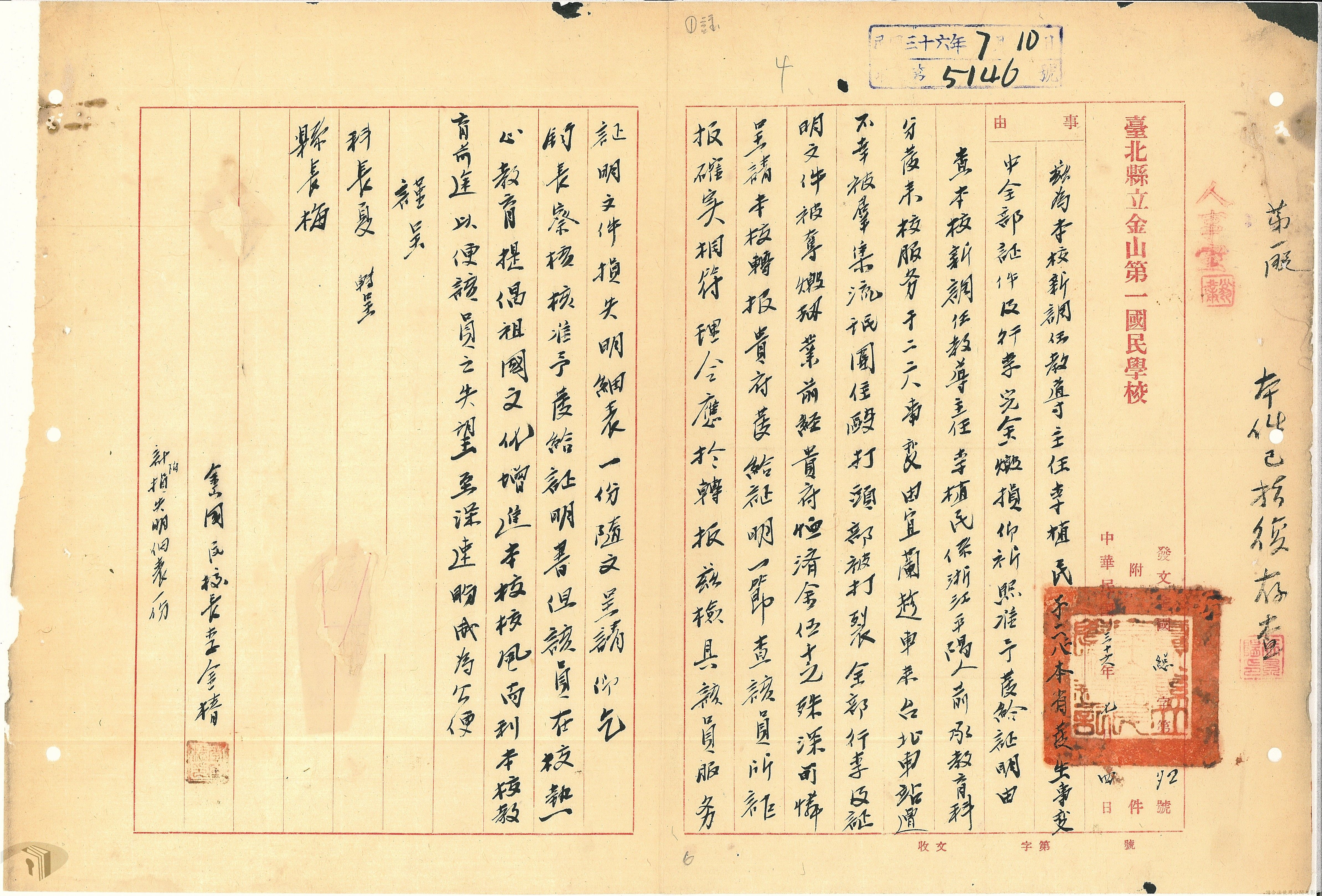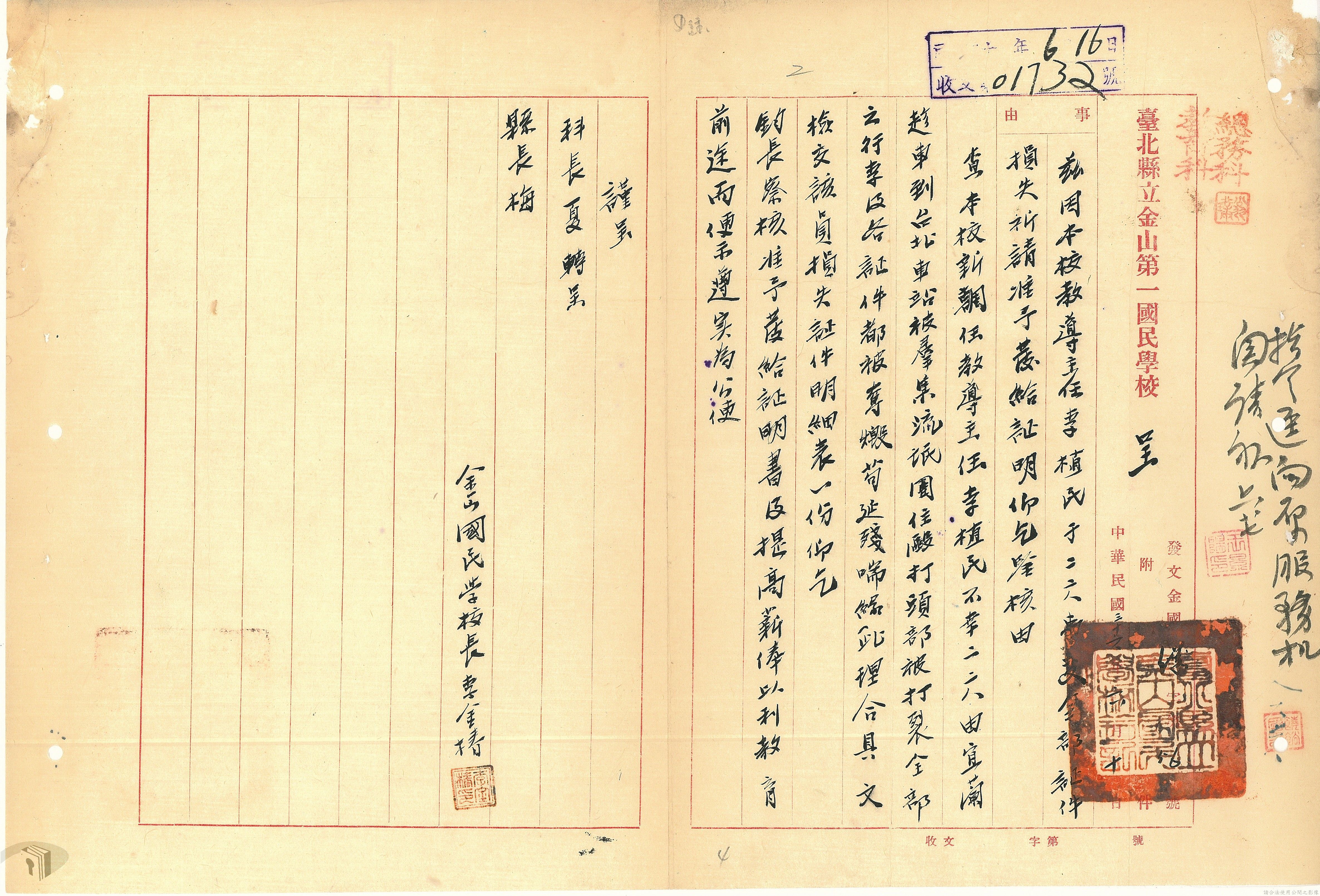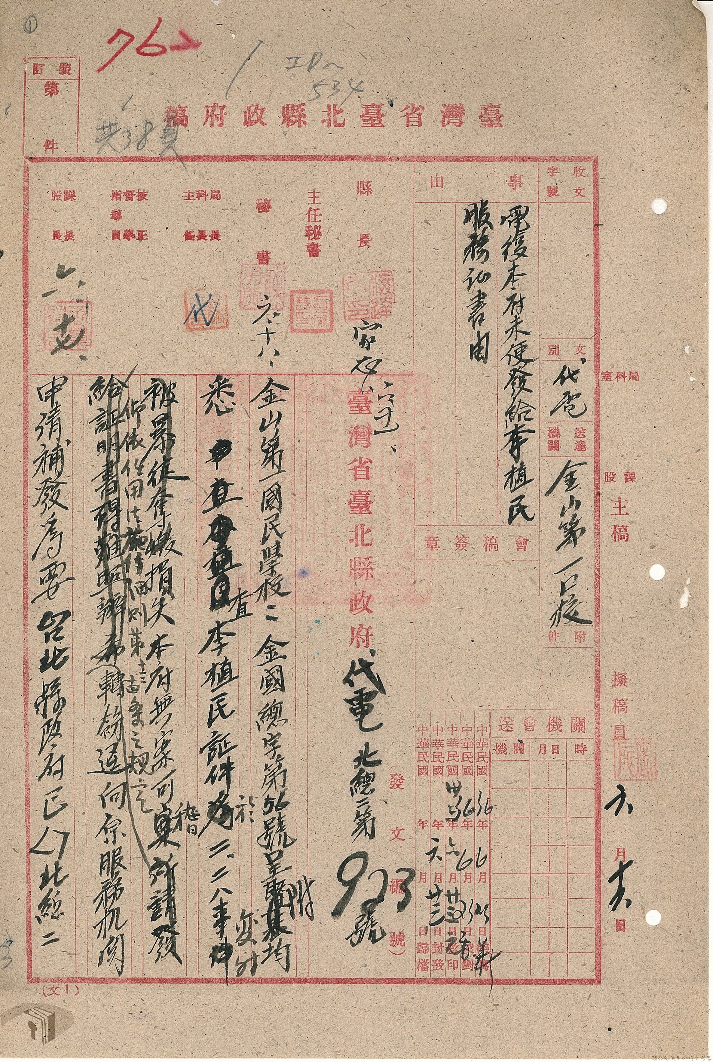 本案為36年間,臺北縣立金山第一國民學校及臺北縣政府所屬職員等人陳請縣政府同意發給各項證明書,該府同意將證明書發給當事人,以及發電報告知金山第一國民學校不便發給服務證書。附服務證件明細表、資歷證件損失明細表等文件資料。