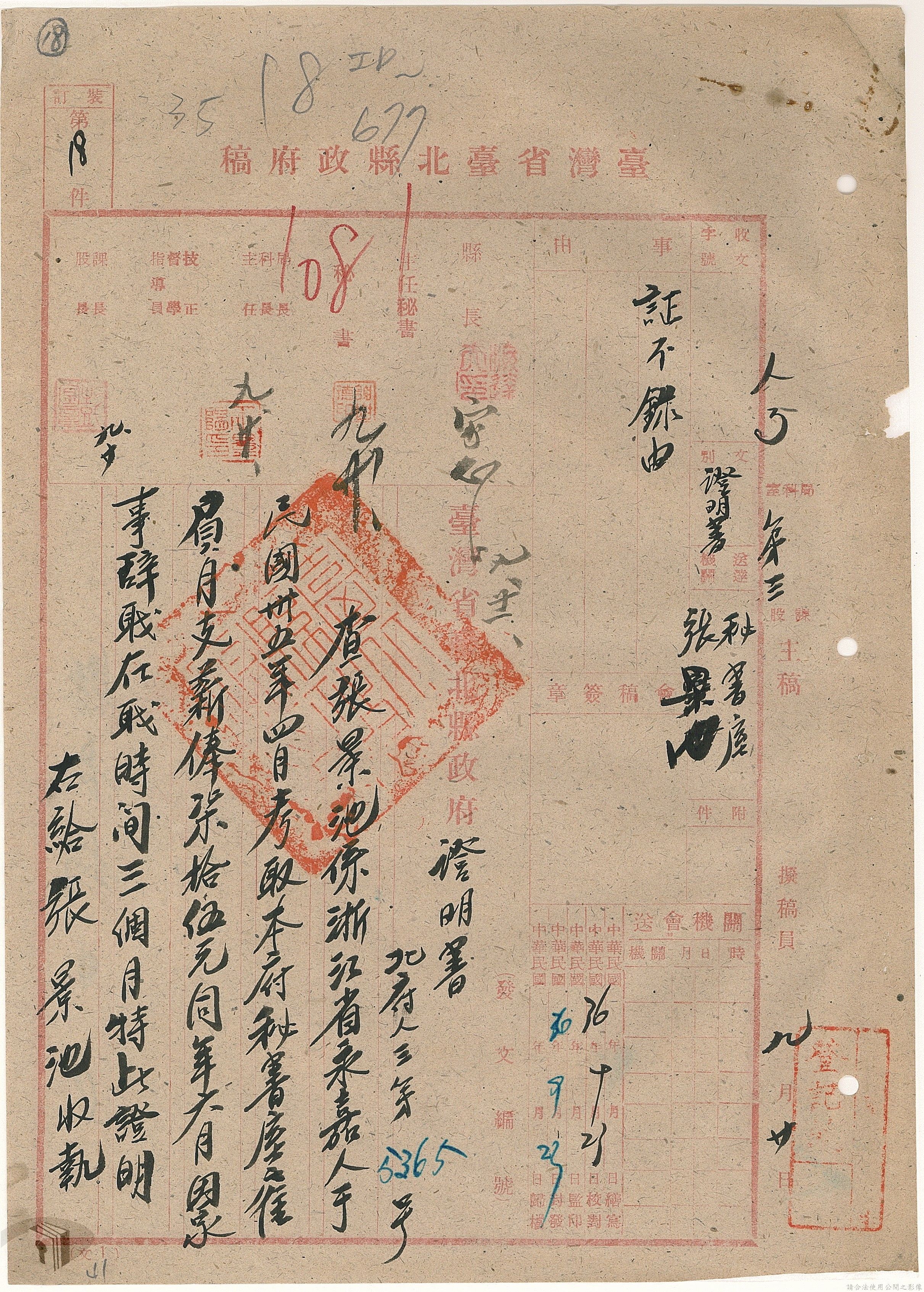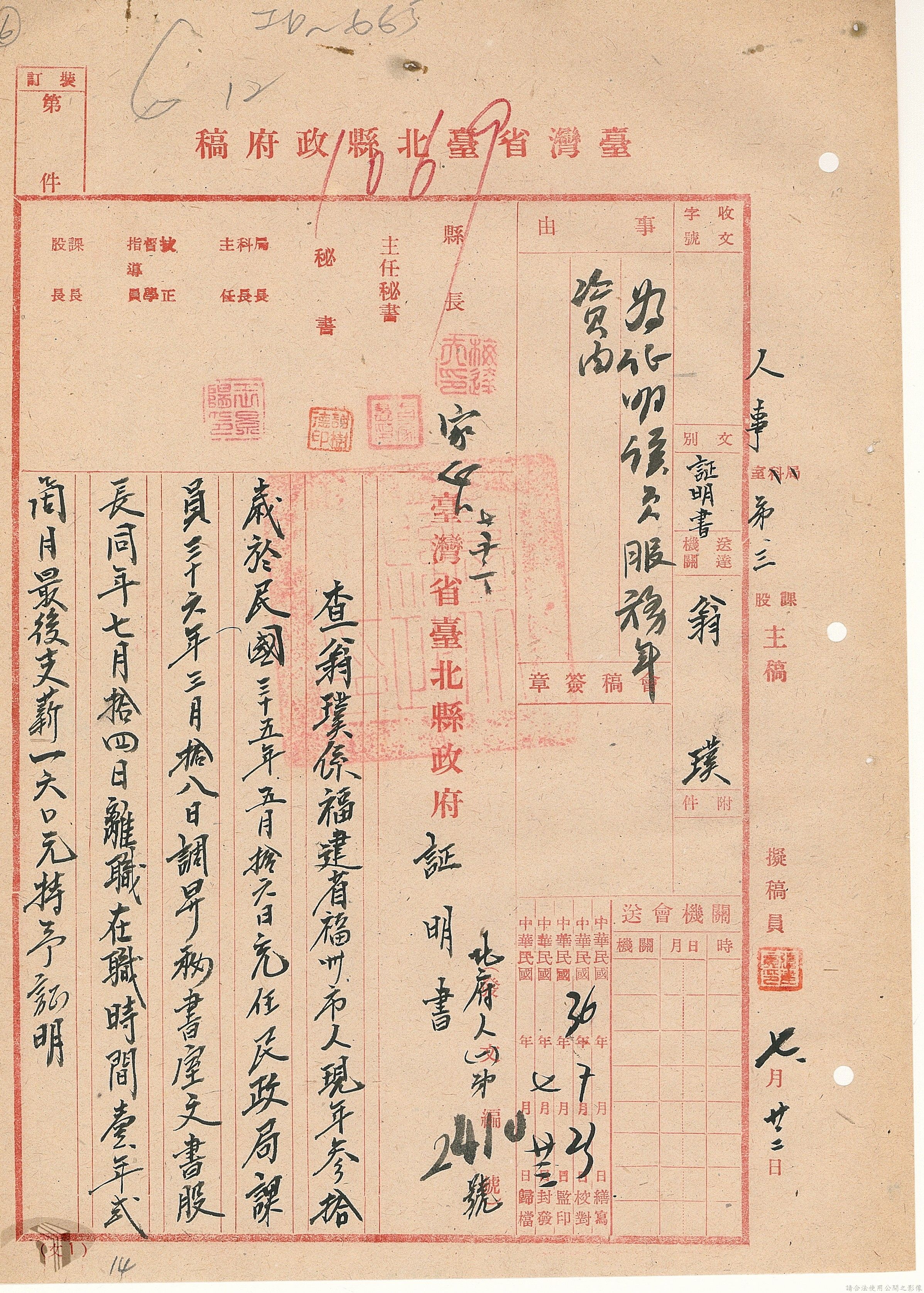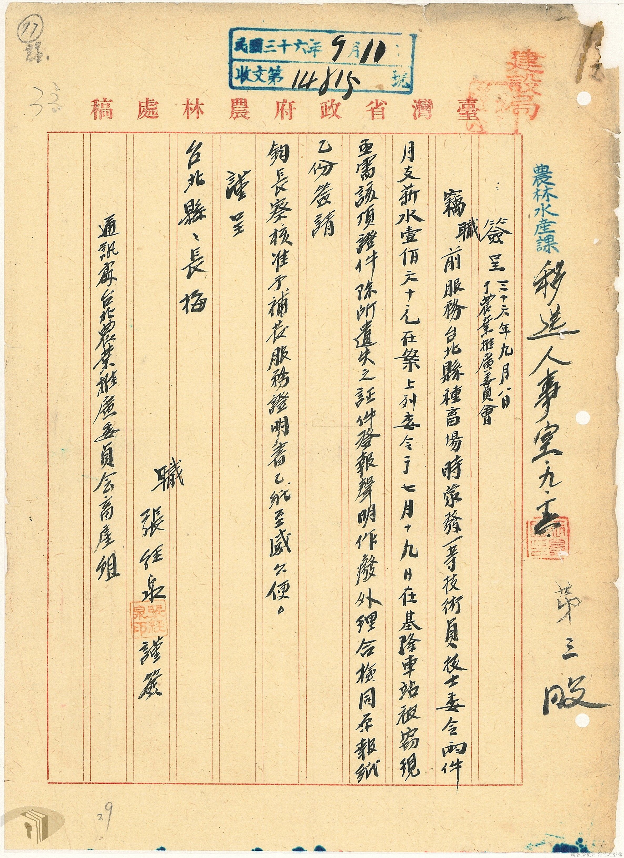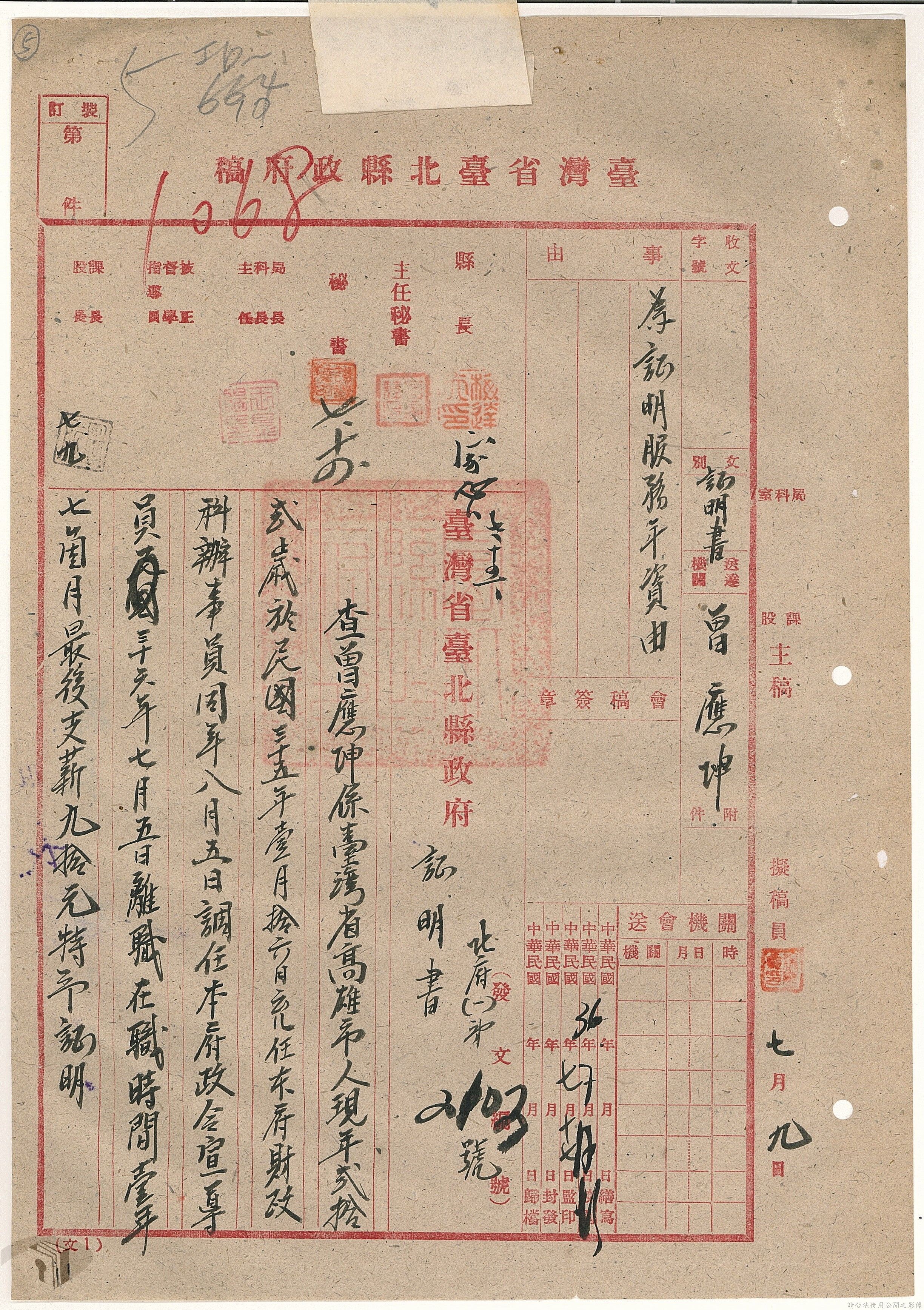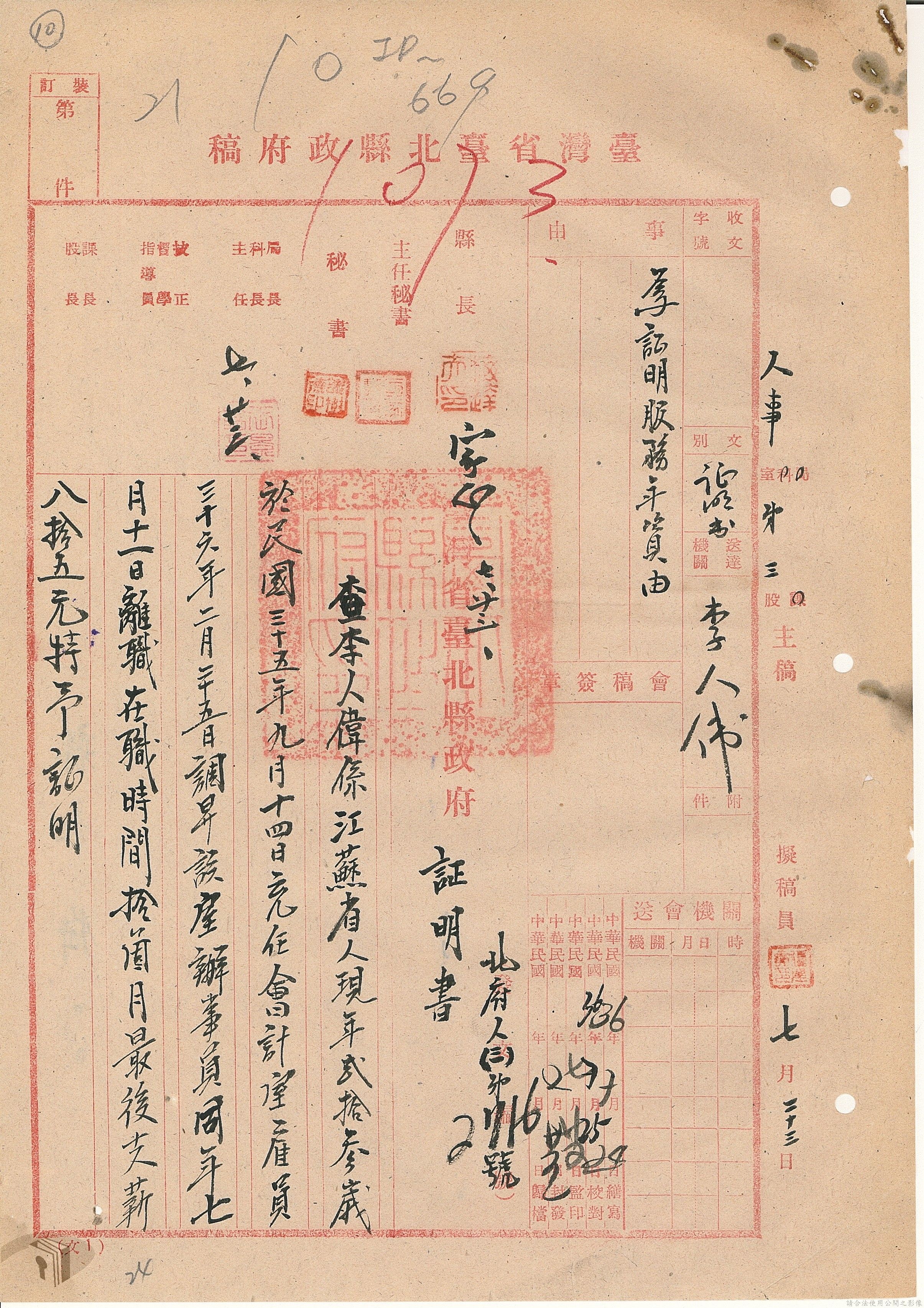 本案為36年間,臺北縣立金山第一國民學校及臺北縣政府所屬職員等人陳請縣政府同意發給各項證明書,該府同意將證明書發給當事人,以及發電報告知金山第一國民學校不便發給服務證書。附服務證件明細表、資歷證件損失明細表等文件資料。