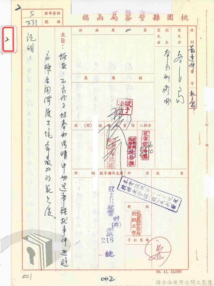 本案為67年間,內政部警政署刑事警察局因接獲消息指出中壢事件涉案人員移動至高雄且企圖出境,函請桃園縣警察局加以查證處理後回報臺灣警備總司令部,並副知高雄市警察局、苗栗縣警察局、警備總部,桃園縣警察局後函請各分局協助辦理。