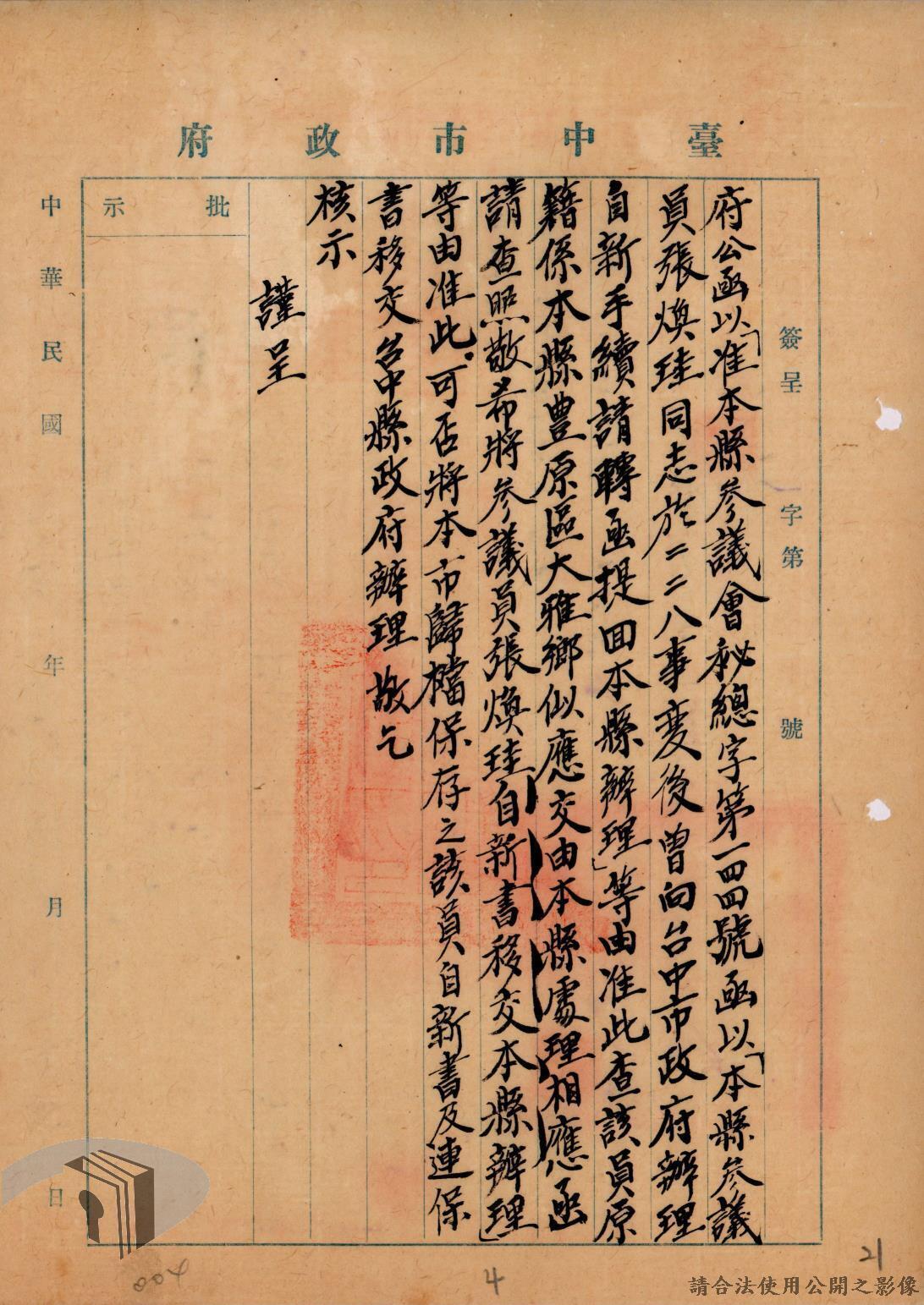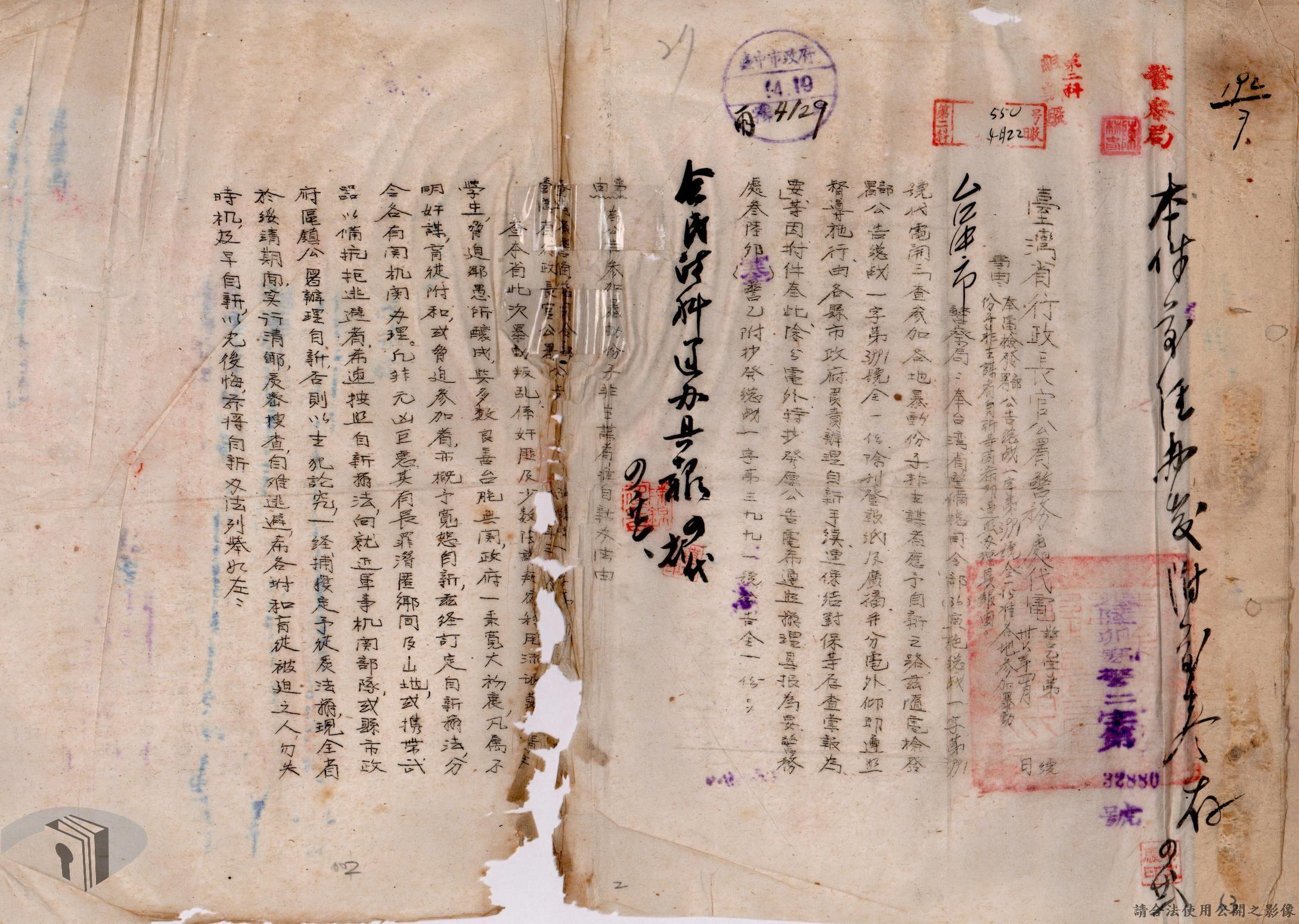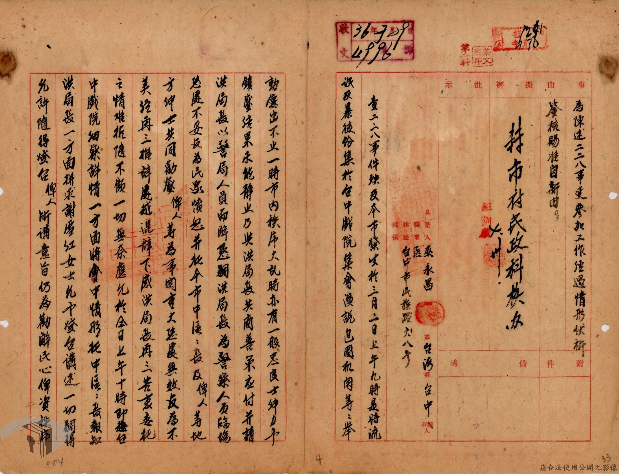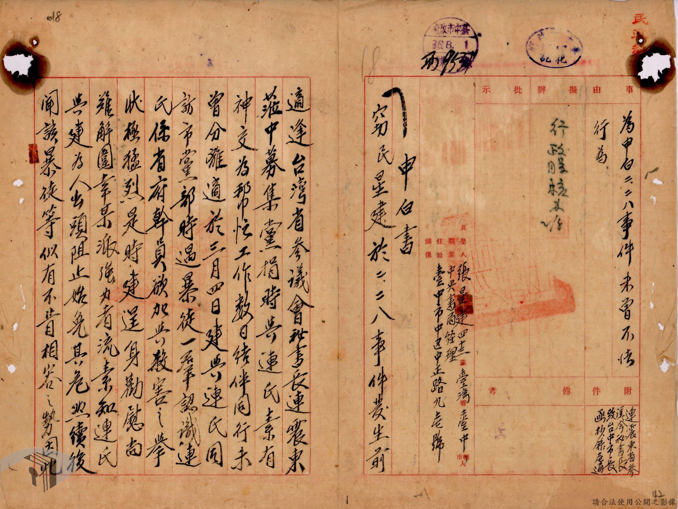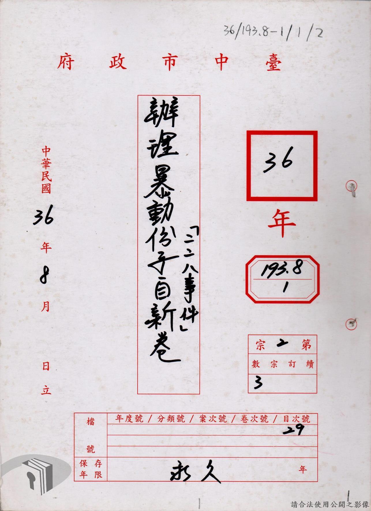 本案為36年間辦理二二八事件參與民眾自新事,臺中市政府依臺灣省行政長官公署及臺灣省警備總司令部所發布公告及自新辦法而函請所屬各區公所、警察局等單位配合辦理參與二二八事件民眾之自新手續,後將自新份子名冊等相關文件函送臺灣省中部綏靖區司令部、警備總部等單位。附自新書、自新辦法等文件資料。