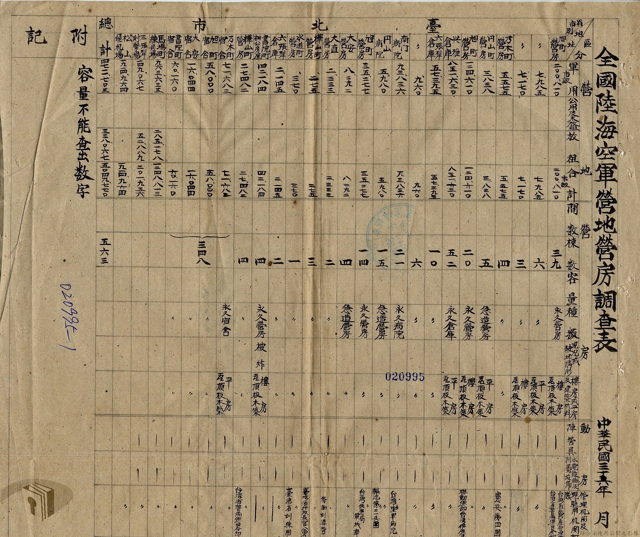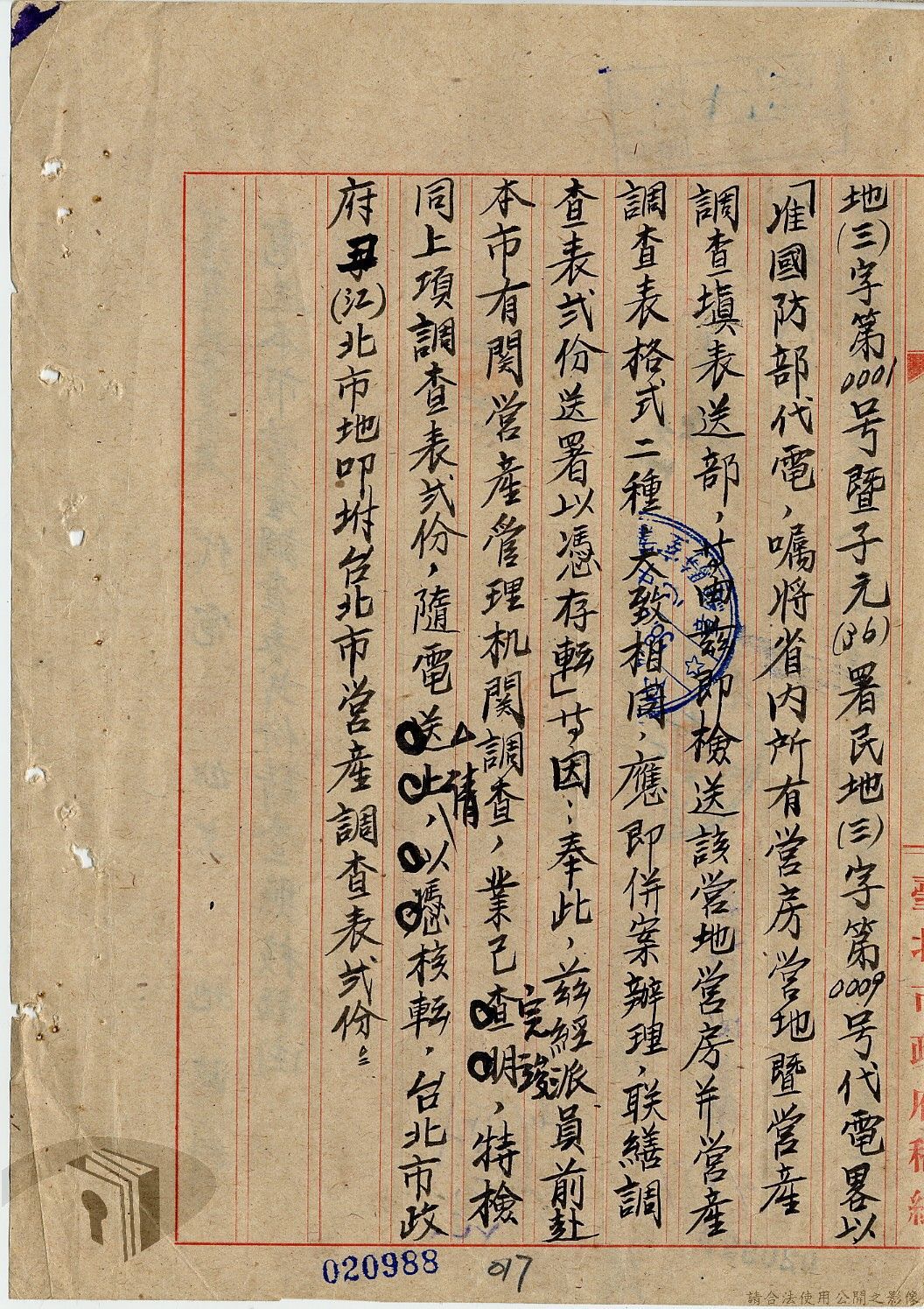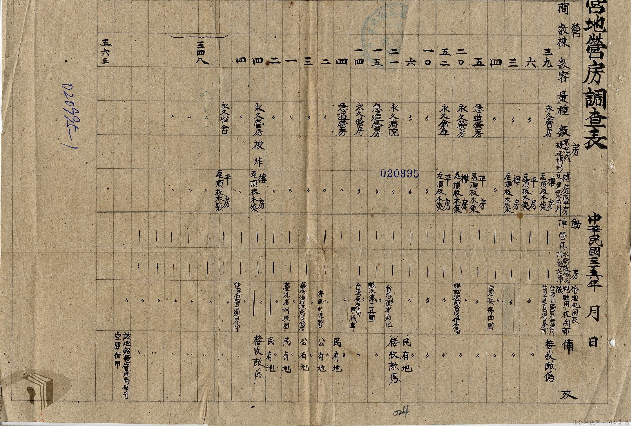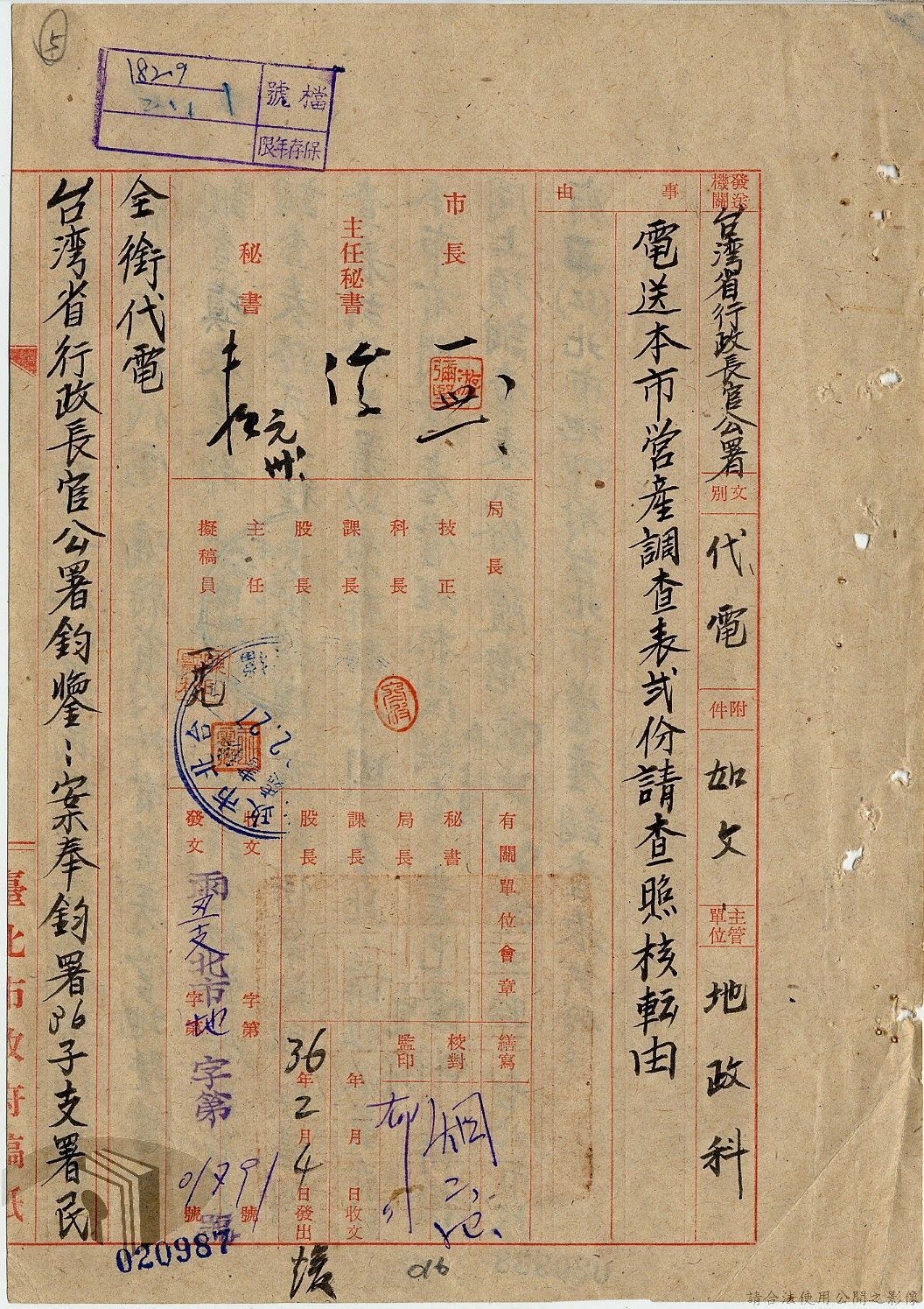 本案為36年間,臺北市政府受理調查轄區之房地產、營地營房之產權資料,包括國防部要求調查全省營產(軍用設施、學校廠庫、機場碼頭及附屬建物等)資料,並檢附填表格式及填表須知,後市府陳送營產營地營房調查表給國防部等;臺北市政府受理臺灣省政府、臺灣航業公司要求調查部分土地產權歸屬等業務。