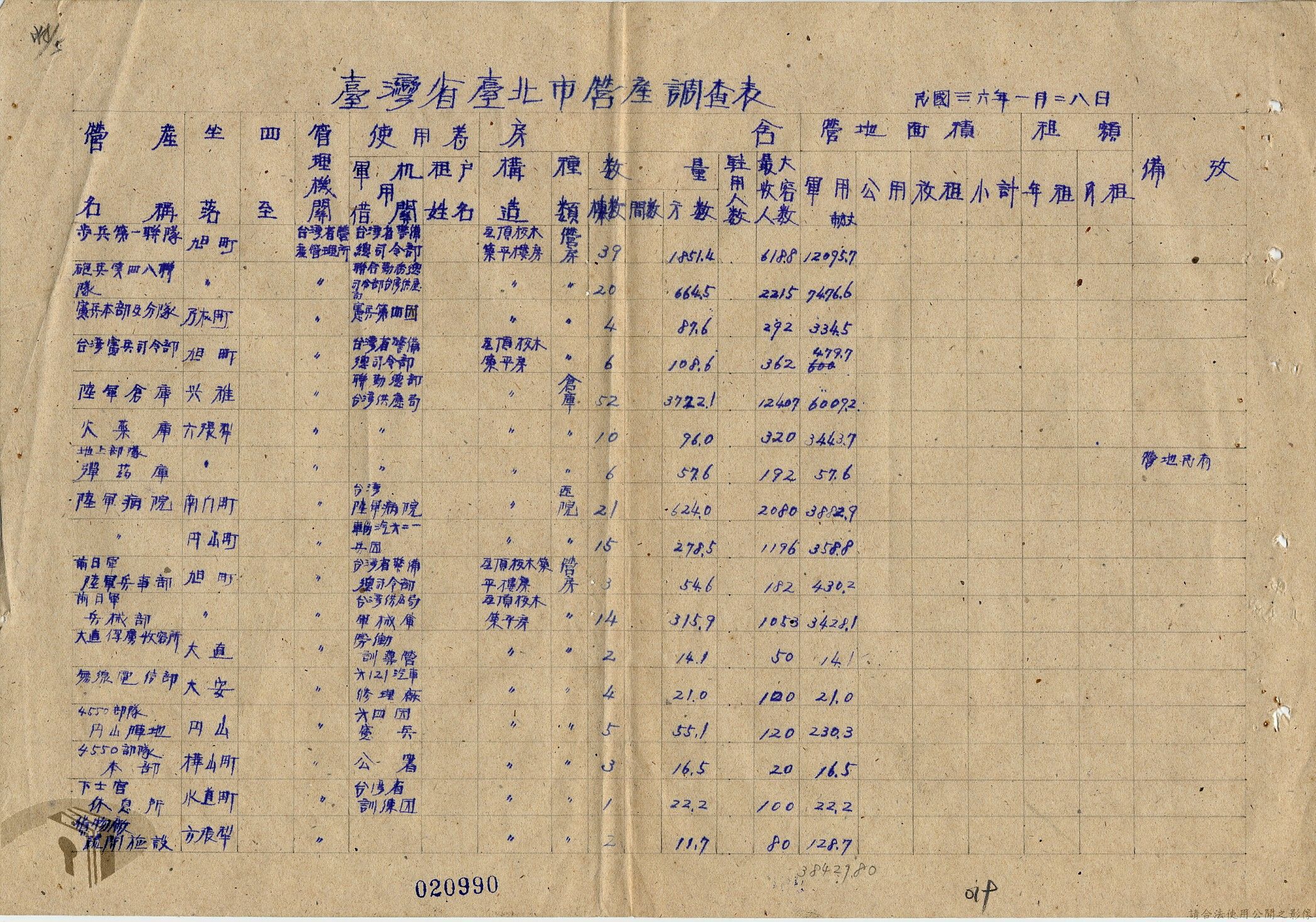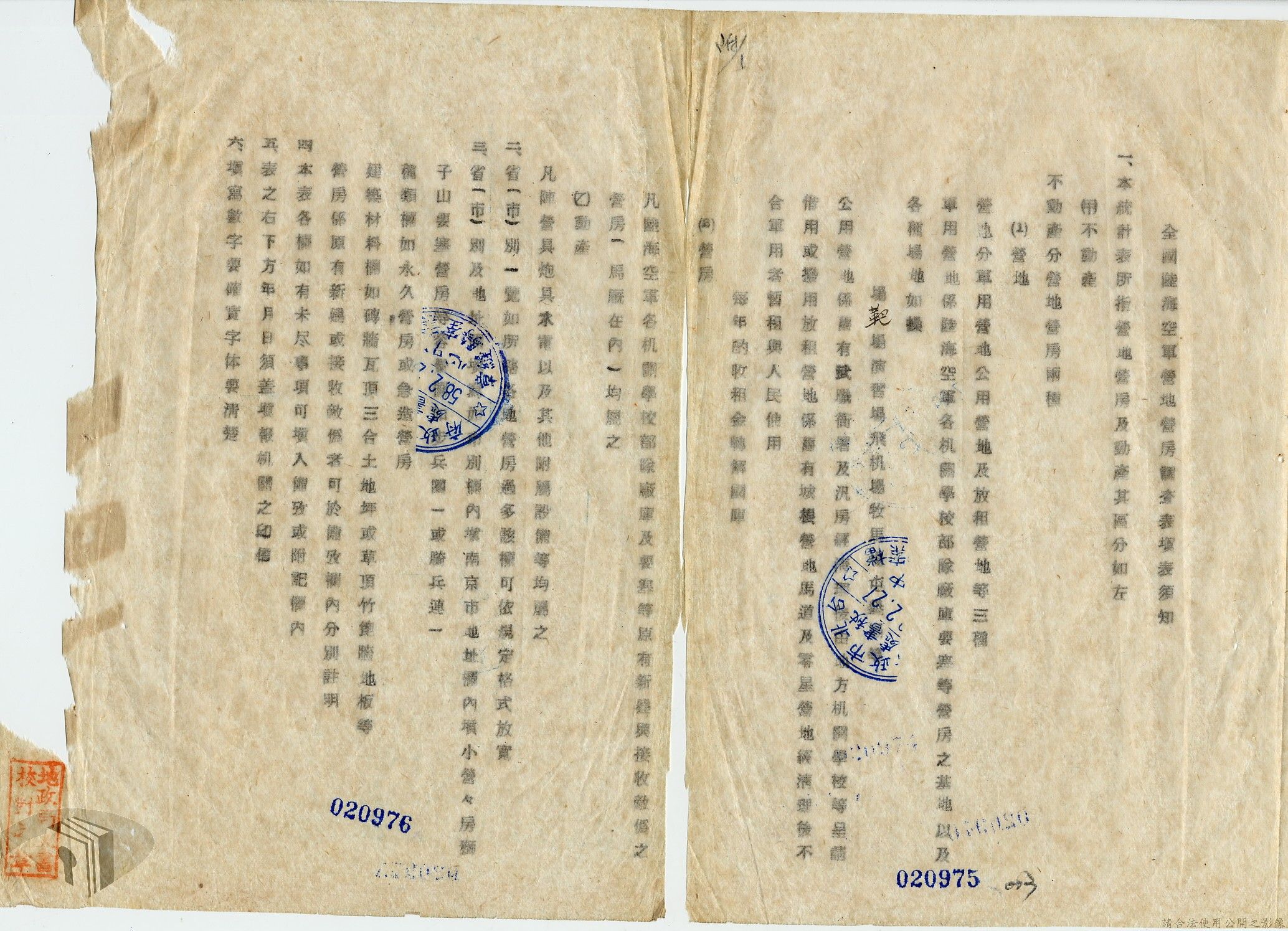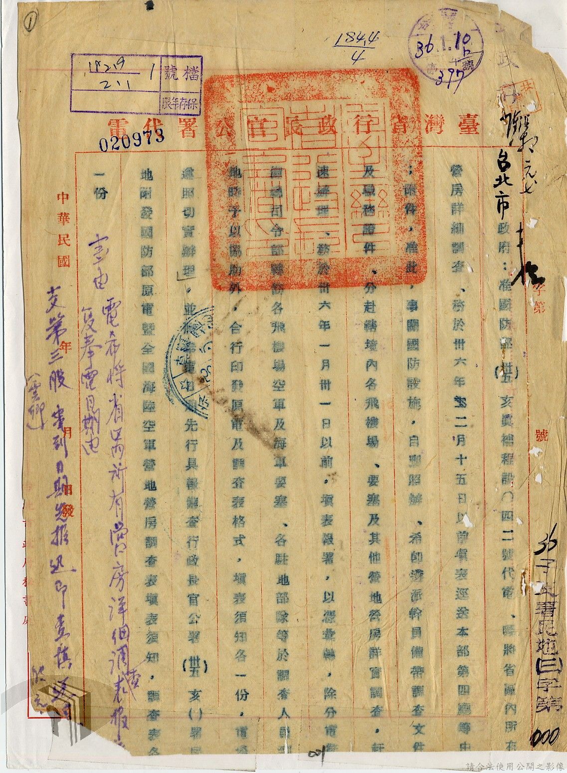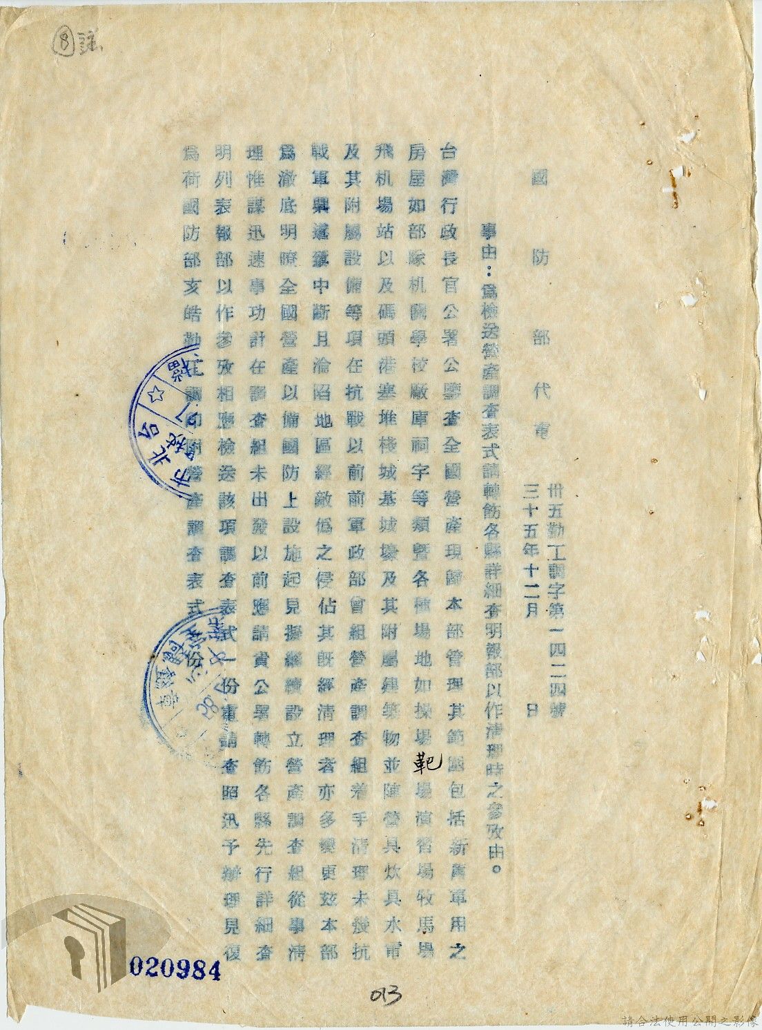 本案為36年間,臺北市政府受理調查轄區之房地產、營地營房之產權資料,包括國防部要求調查全省營產(軍用設施、學校廠庫、機場碼頭及附屬建物等)資料,並檢附填表格式及填表須知,後市府陳送營產營地營房調查表給國防部等;臺北市政府受理臺灣省政府、臺灣航業公司要求調查部分土地產權歸屬等業務。