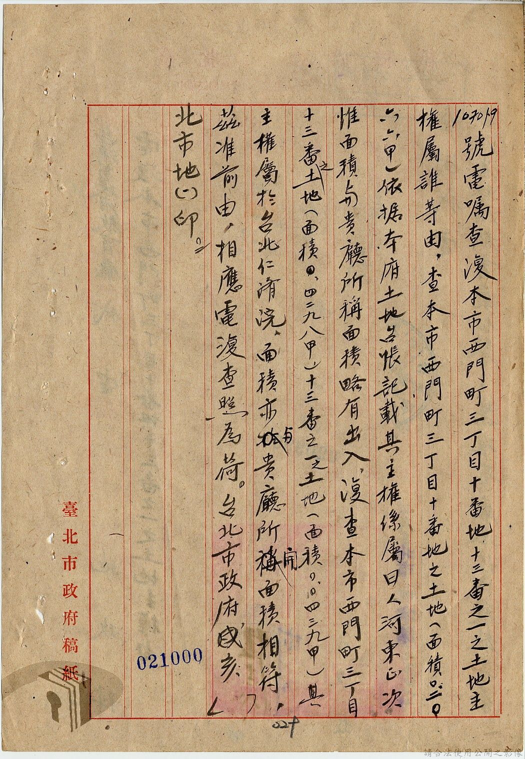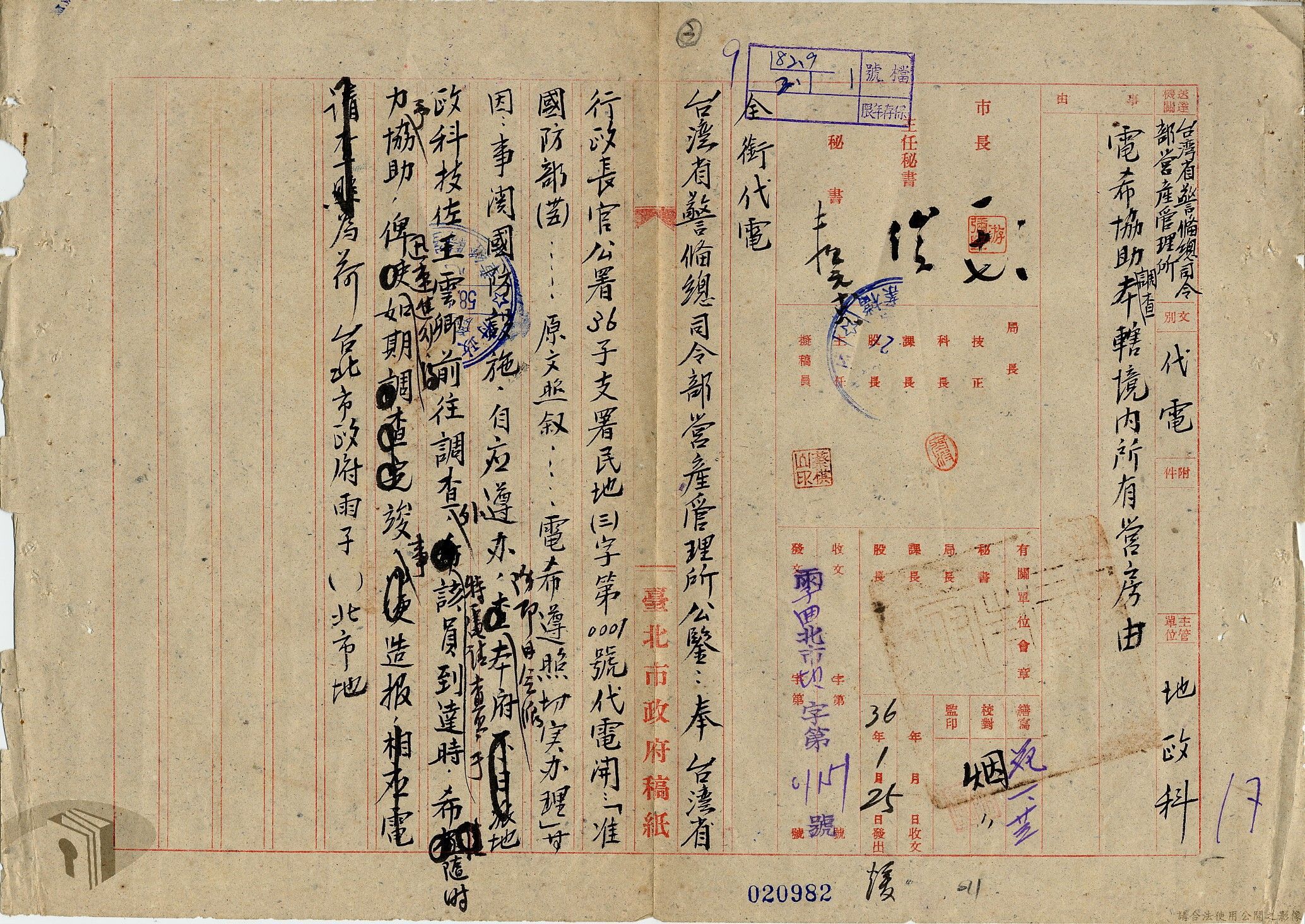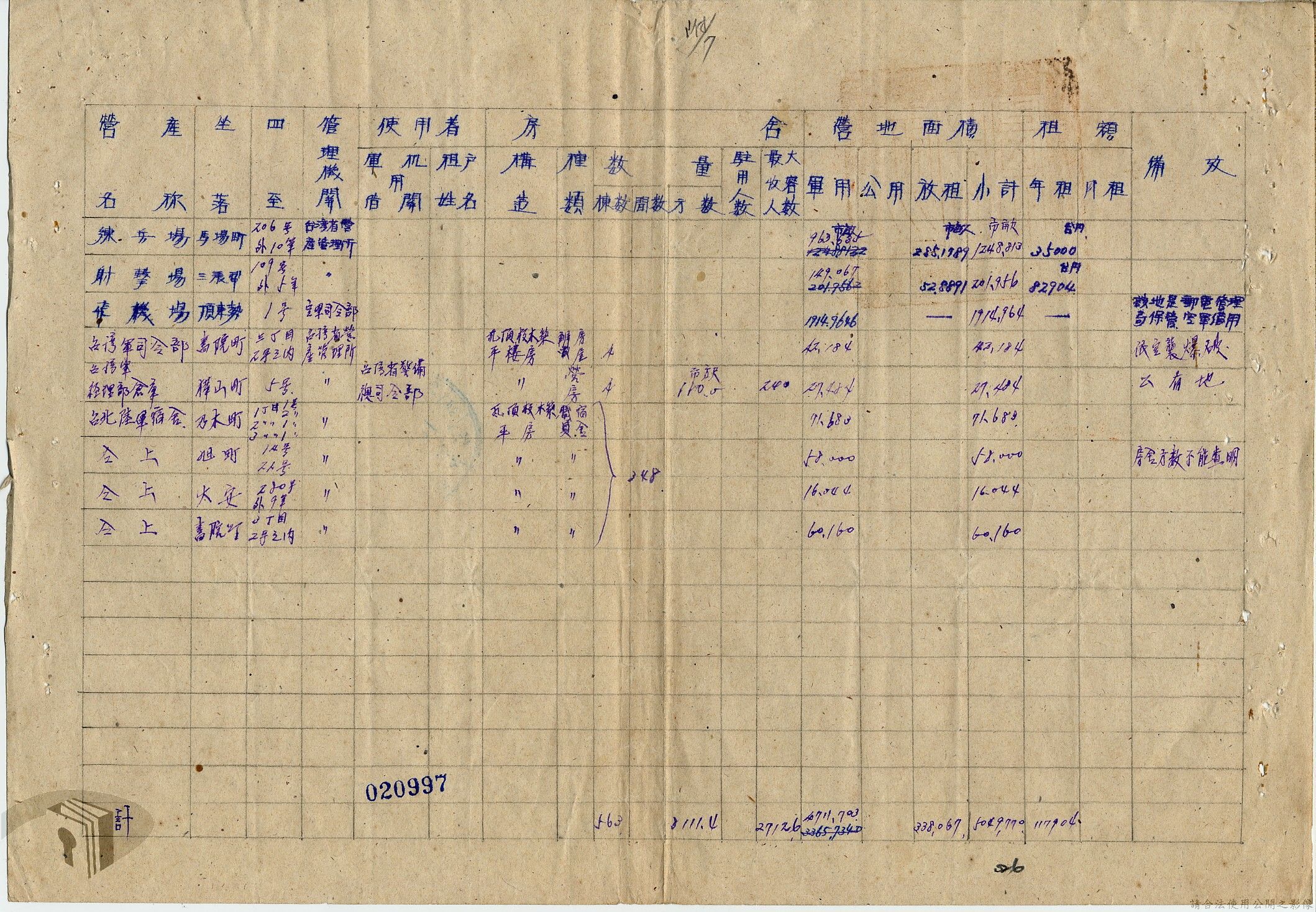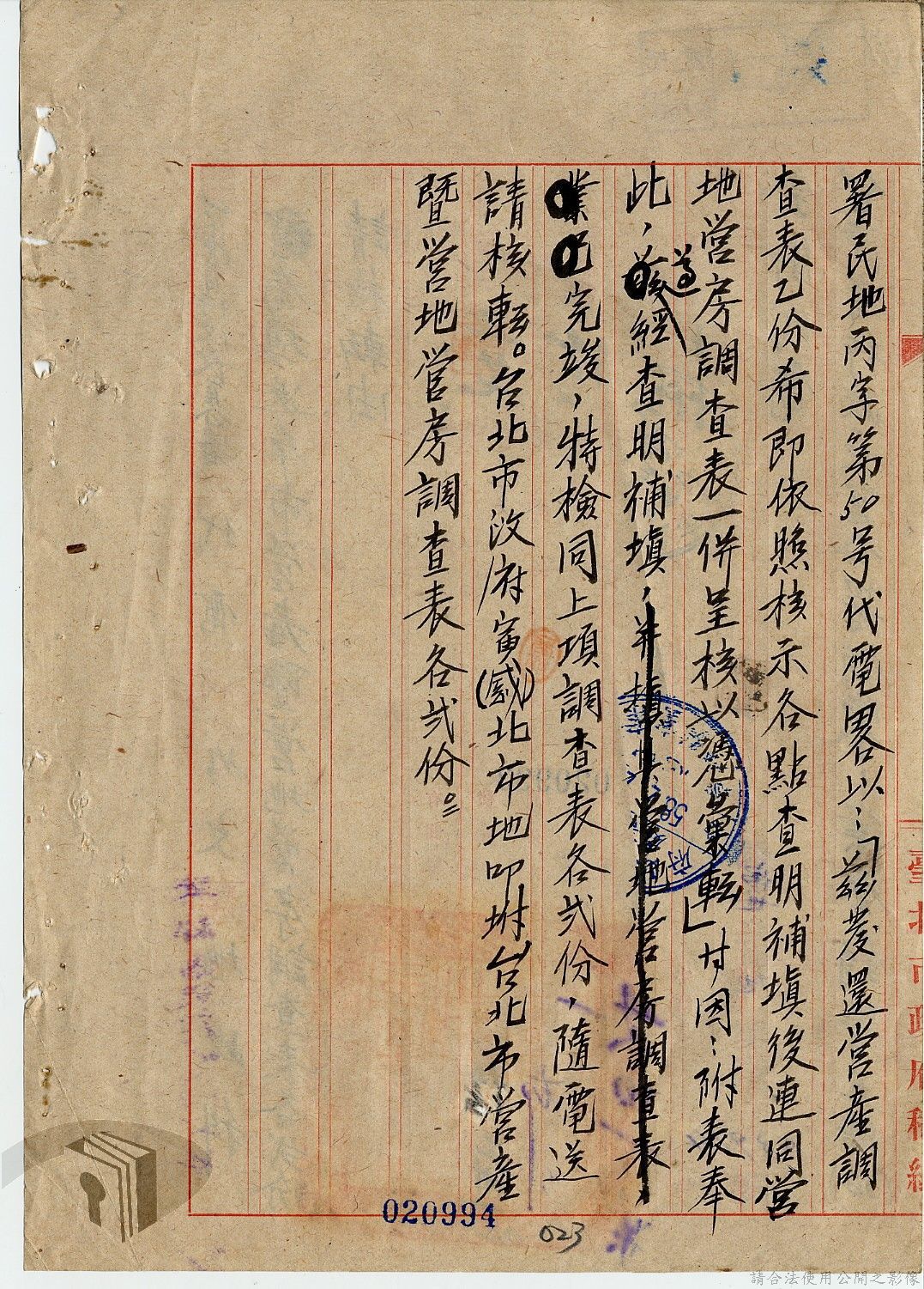本案為36年間,臺北市政府受理調查轄區之房地產、營地營房之產權資料,包括國防部要求調查全省營產(軍用設施、學校廠庫、機場碼頭及附屬建物等)資料,並檢附填表格式及填表須知,後市府陳送營產營地營房調查表給國防部等;臺北市政府受理臺灣省政府、臺灣航業公司要求調查部分土地產權歸屬等業務。