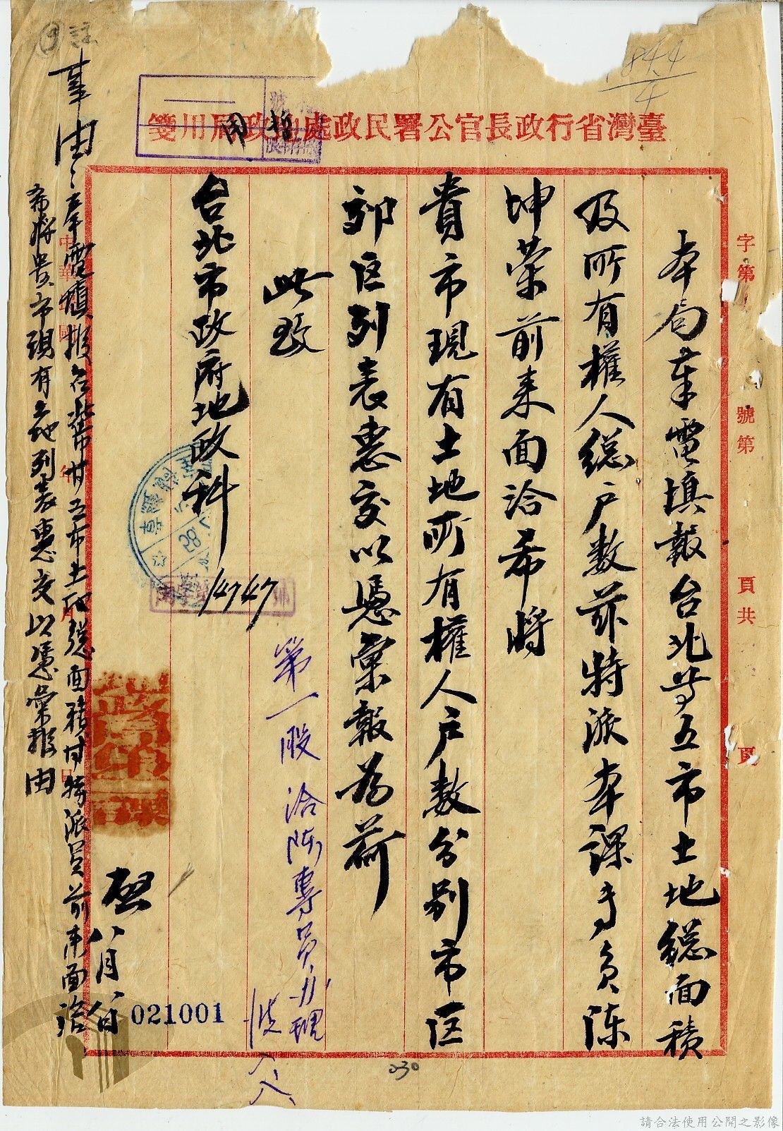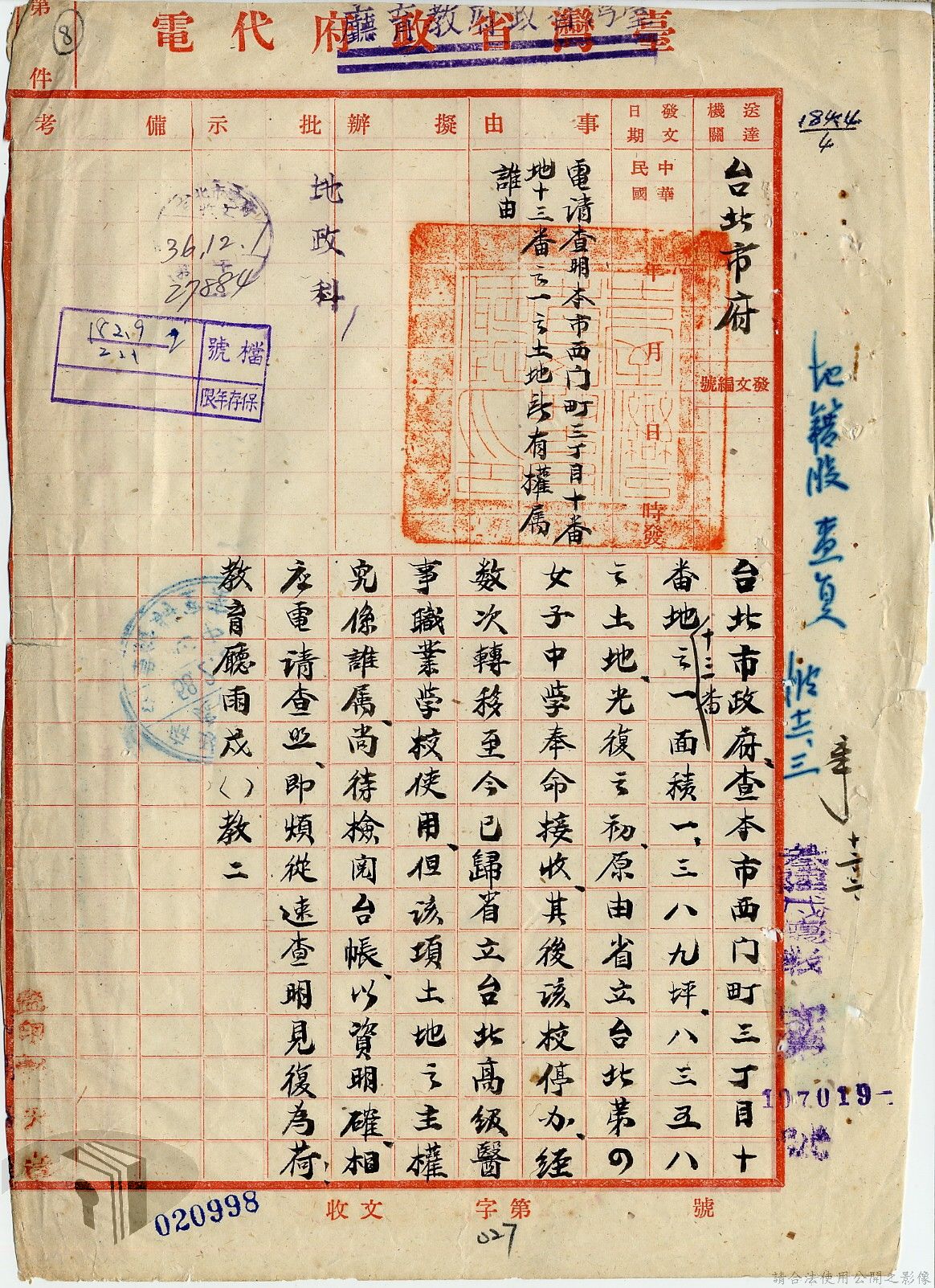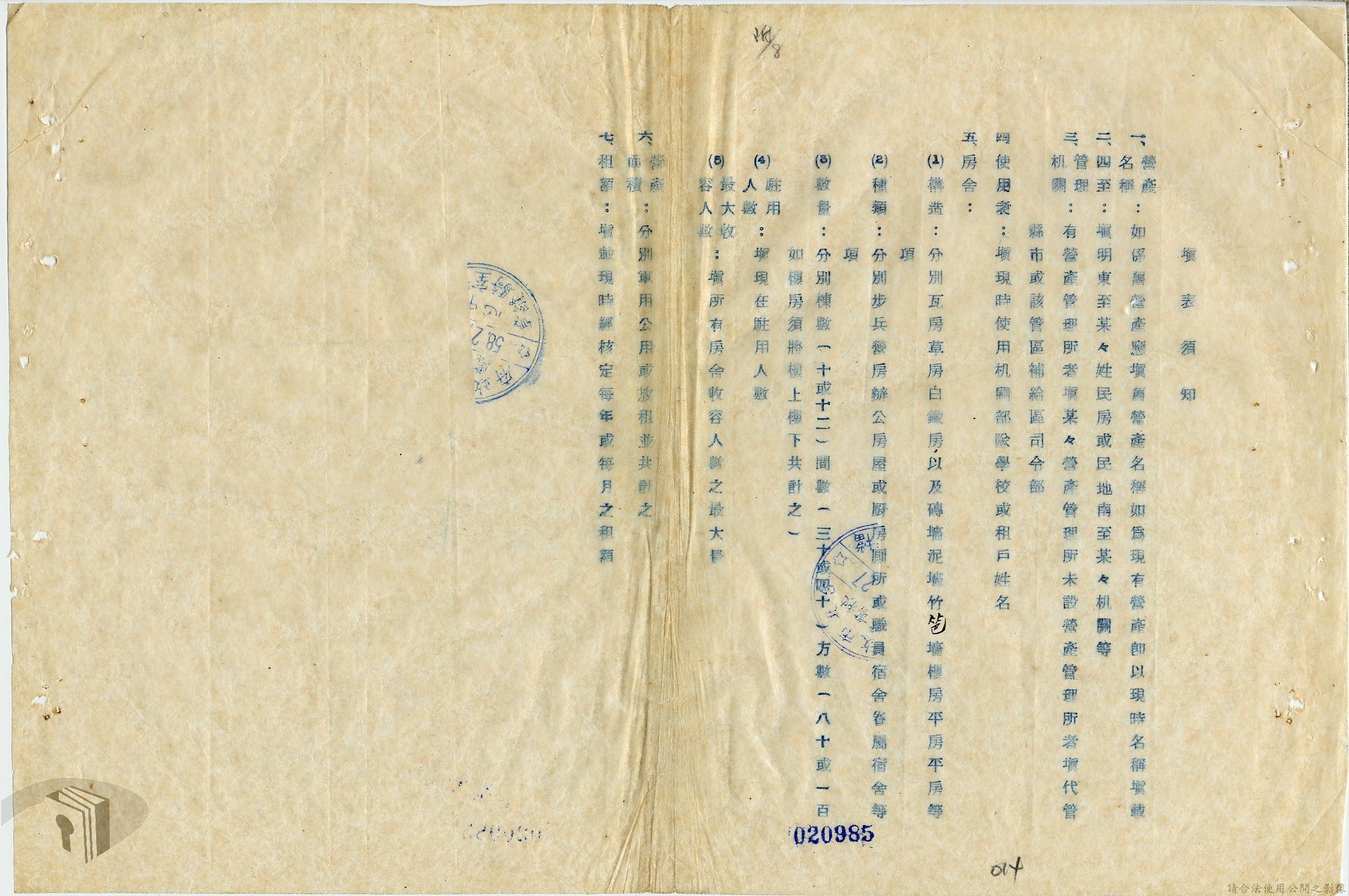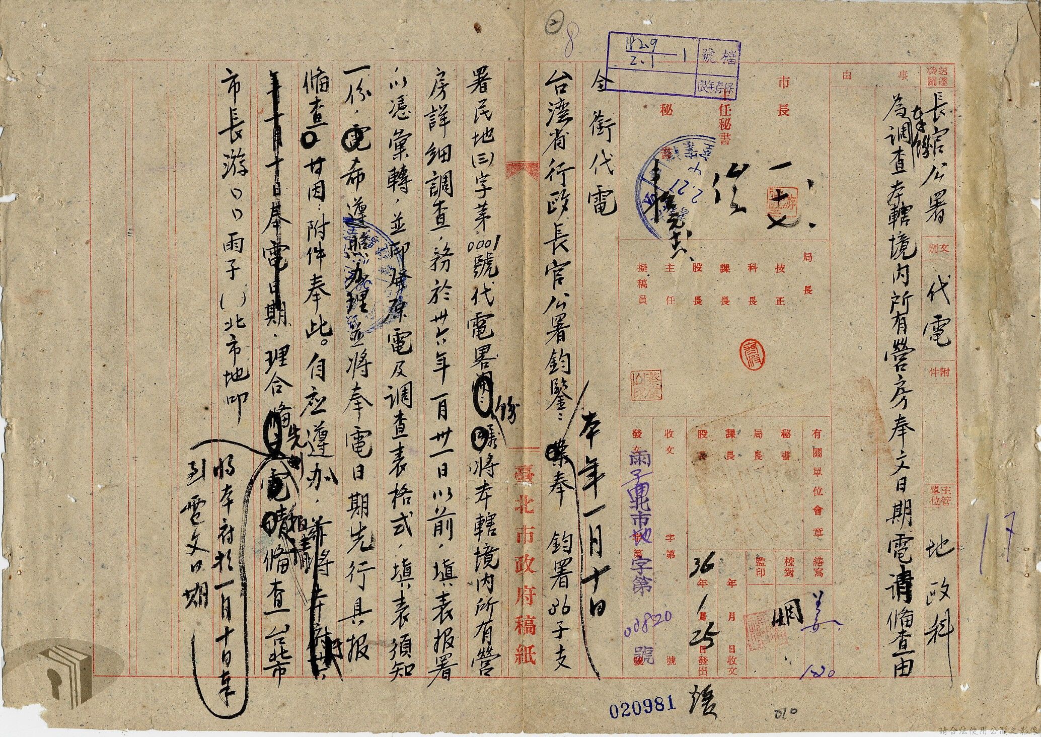 本案為36年間,臺北市政府受理調查轄區之房地產、營地營房之產權資料,包括國防部要求調查全省營產(軍用設施、學校廠庫、機場碼頭及附屬建物等)資料,並檢附填表格式及填表須知,後市府陳送營產營地營房調查表給國防部等;臺北市政府受理臺灣省政府、臺灣航業公司要求調查部分土地產權歸屬等業務。