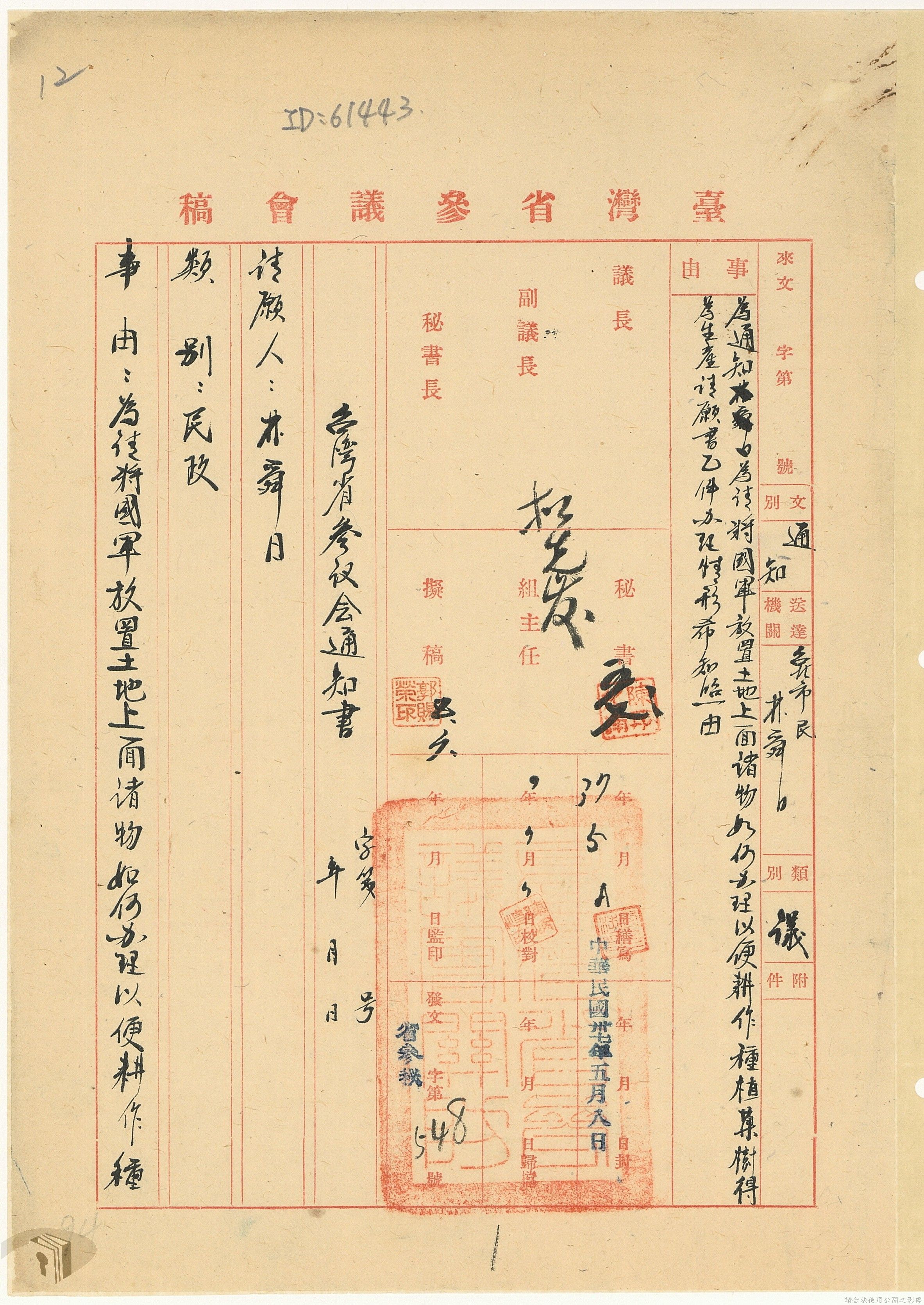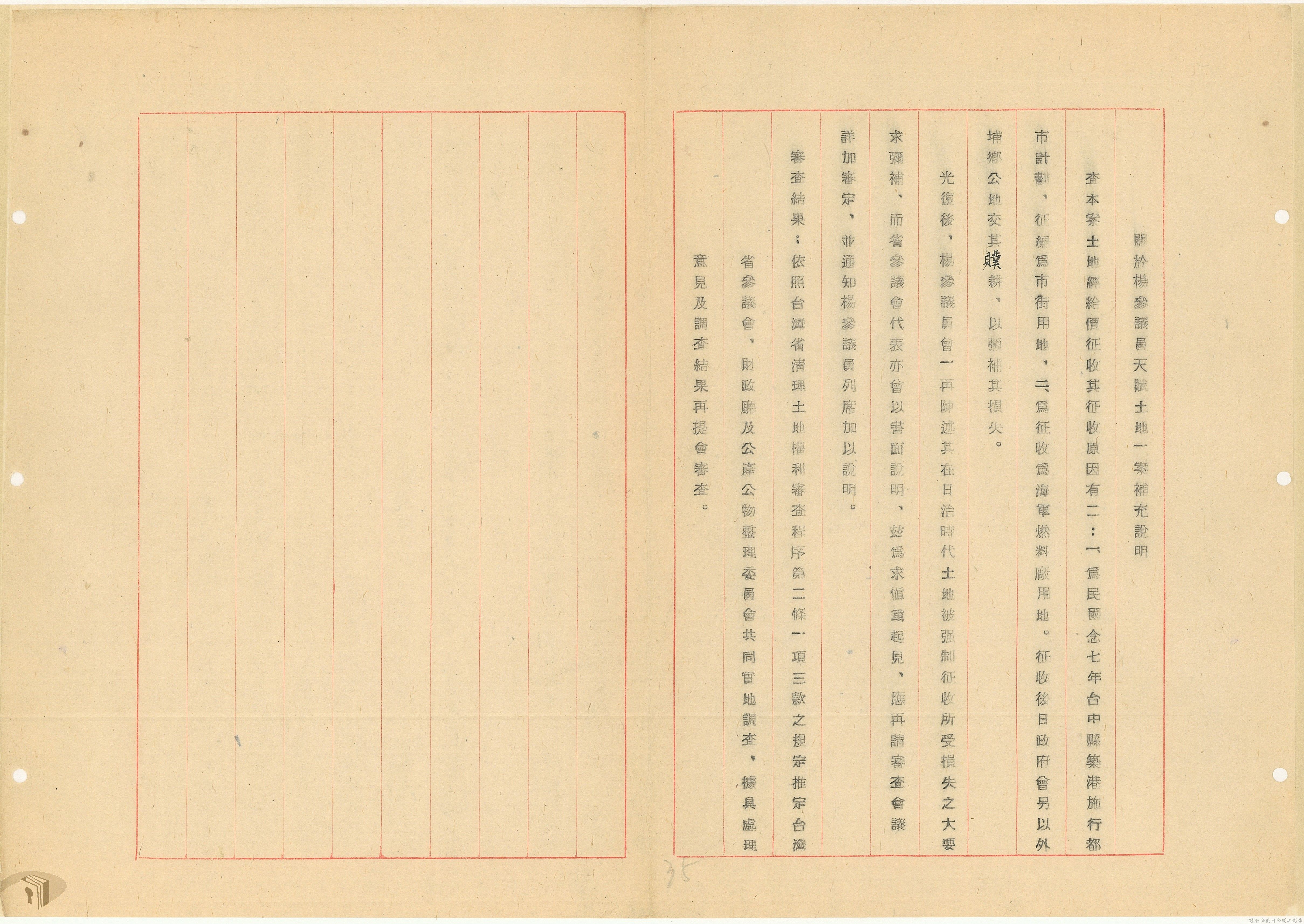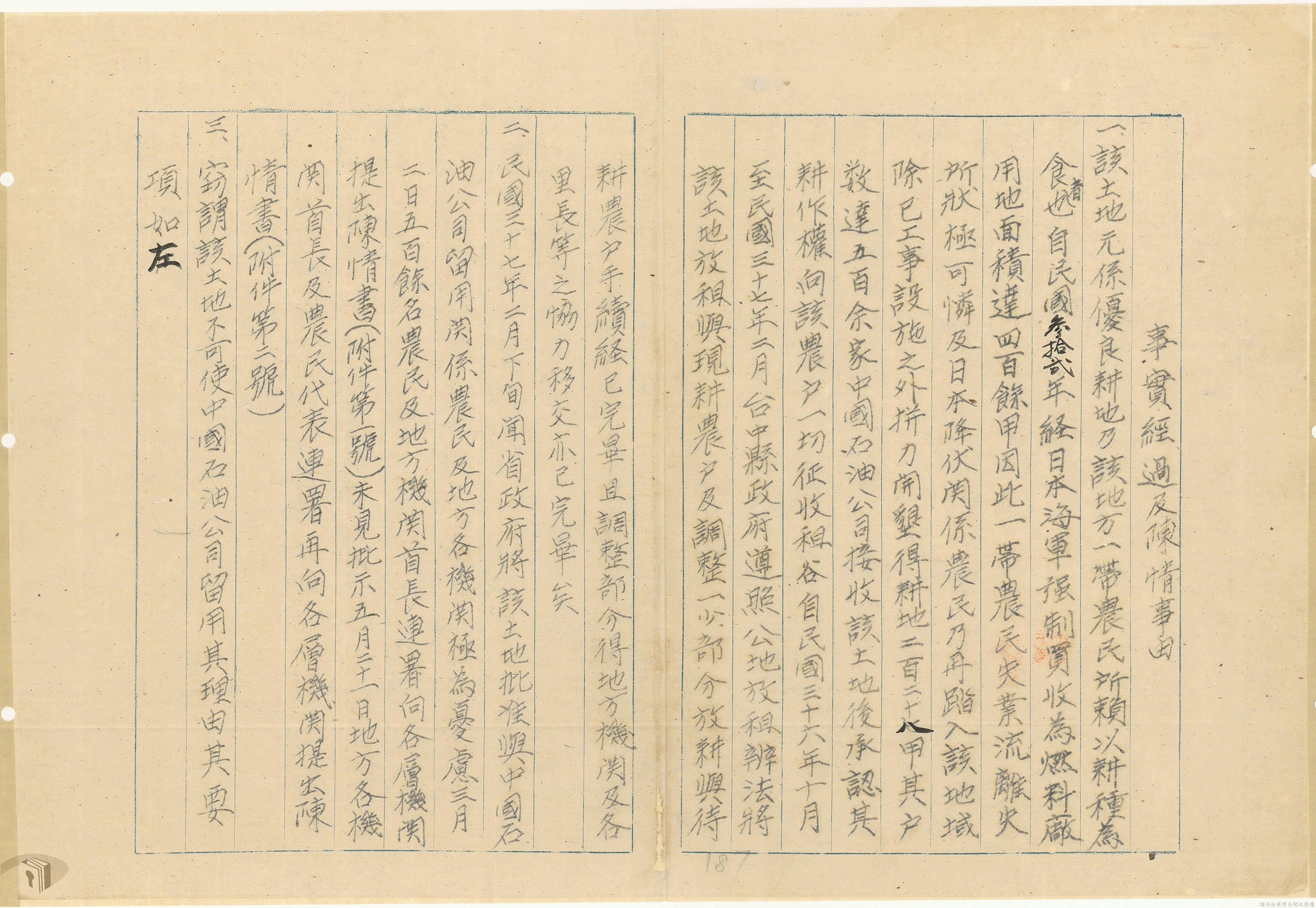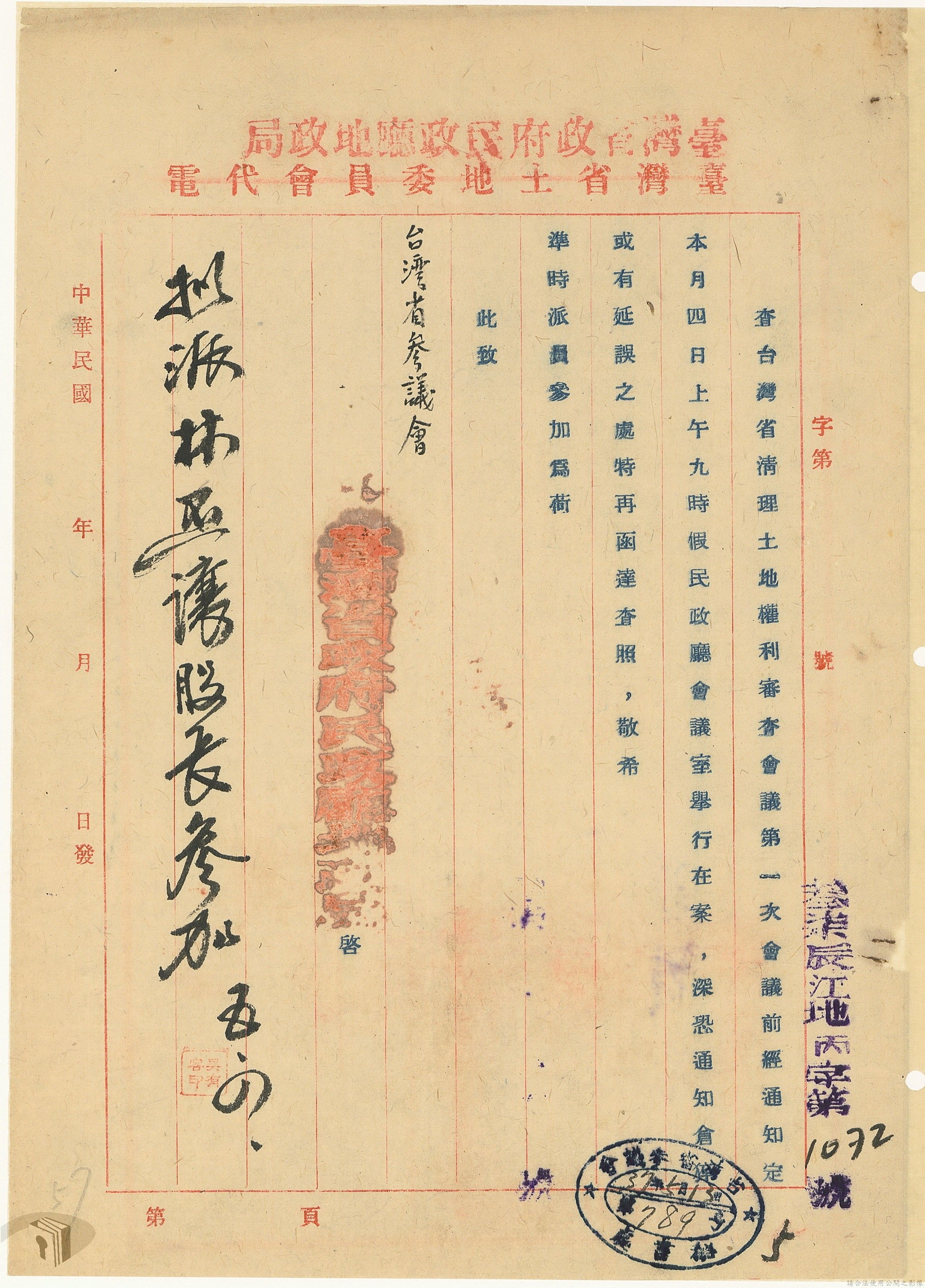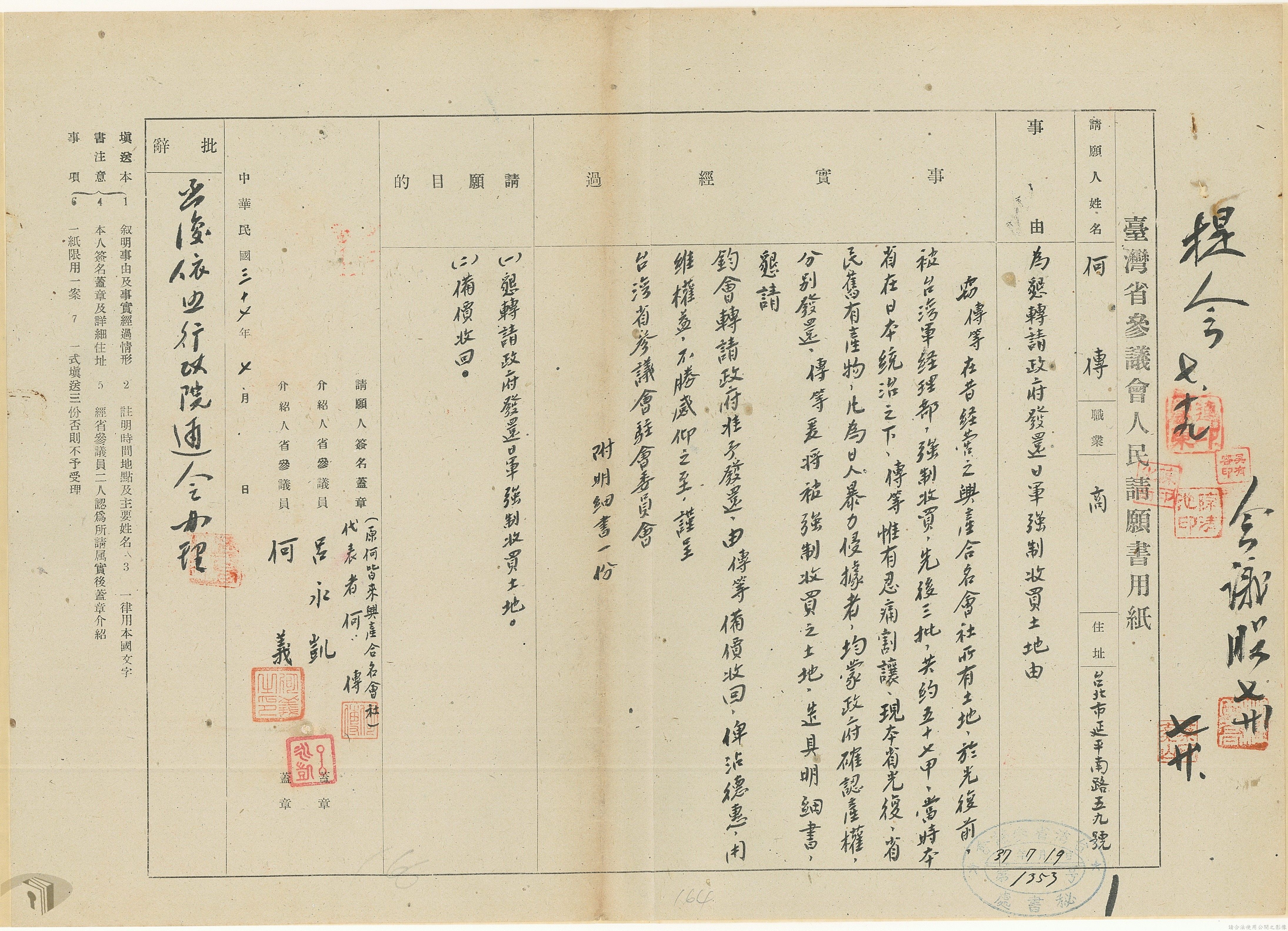 本案為37年間,有關臺灣省參議會向臺灣省政府地政處,查詢日軍設施用地復原及給付地主之地上物賠償金辦理情形;派員實地調查民眾土地案調查報告;檢送本省清理土地權利審查第2次會議記錄;臺灣省民政聽指示土地清理會議須實地勘查;函請國軍遷出民地之營舍以利耕種;發還民眾之土地;參議員強租民地案應限期補辦手續;民眾訴請恢復土地租用權;發還日軍強制徵收土地;臺灣省旅滬同鄉會長之請願書;省政府委託中國石油公司接收日本海軍燃料庫用地;民眾呈請認定永佃權。
