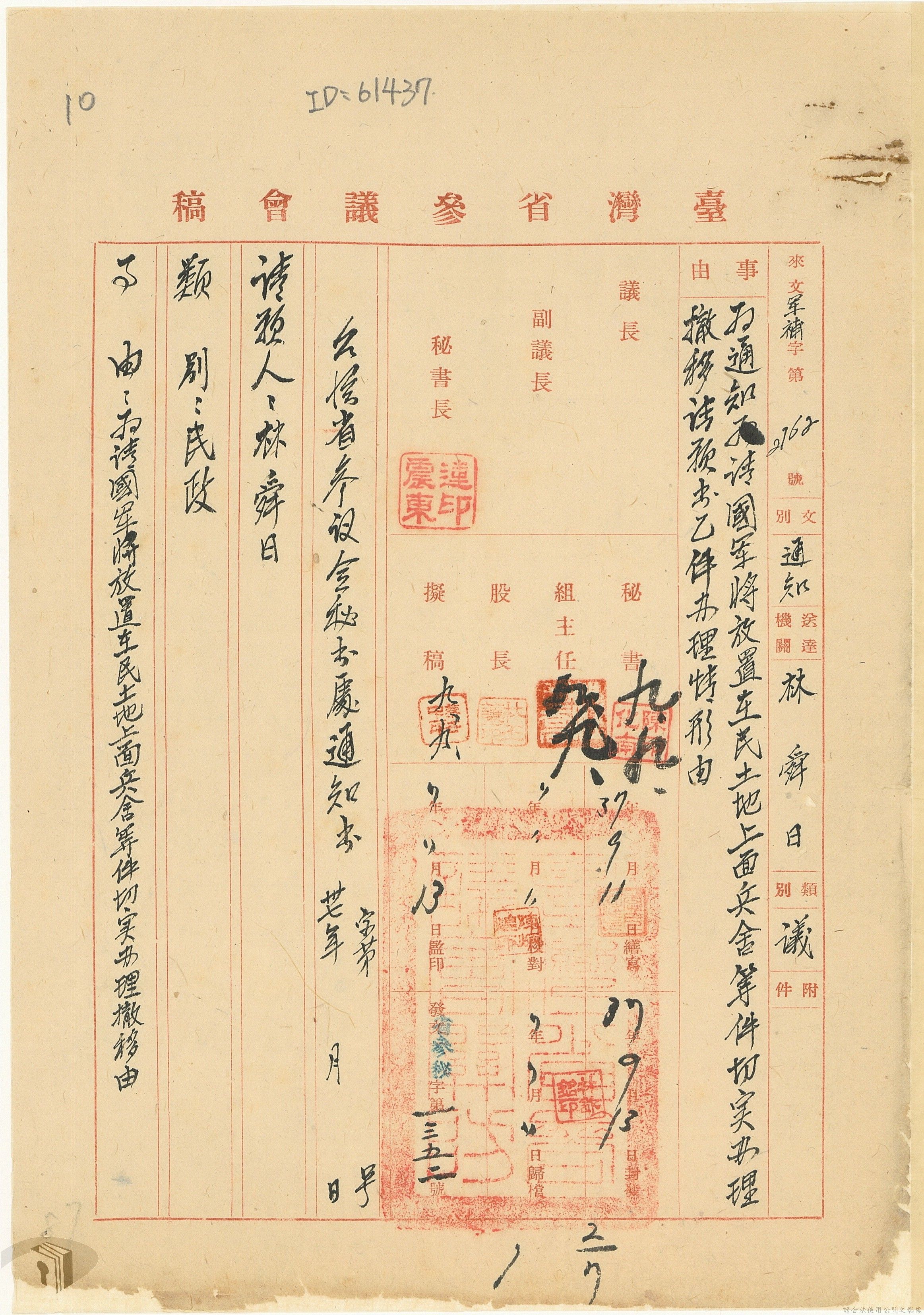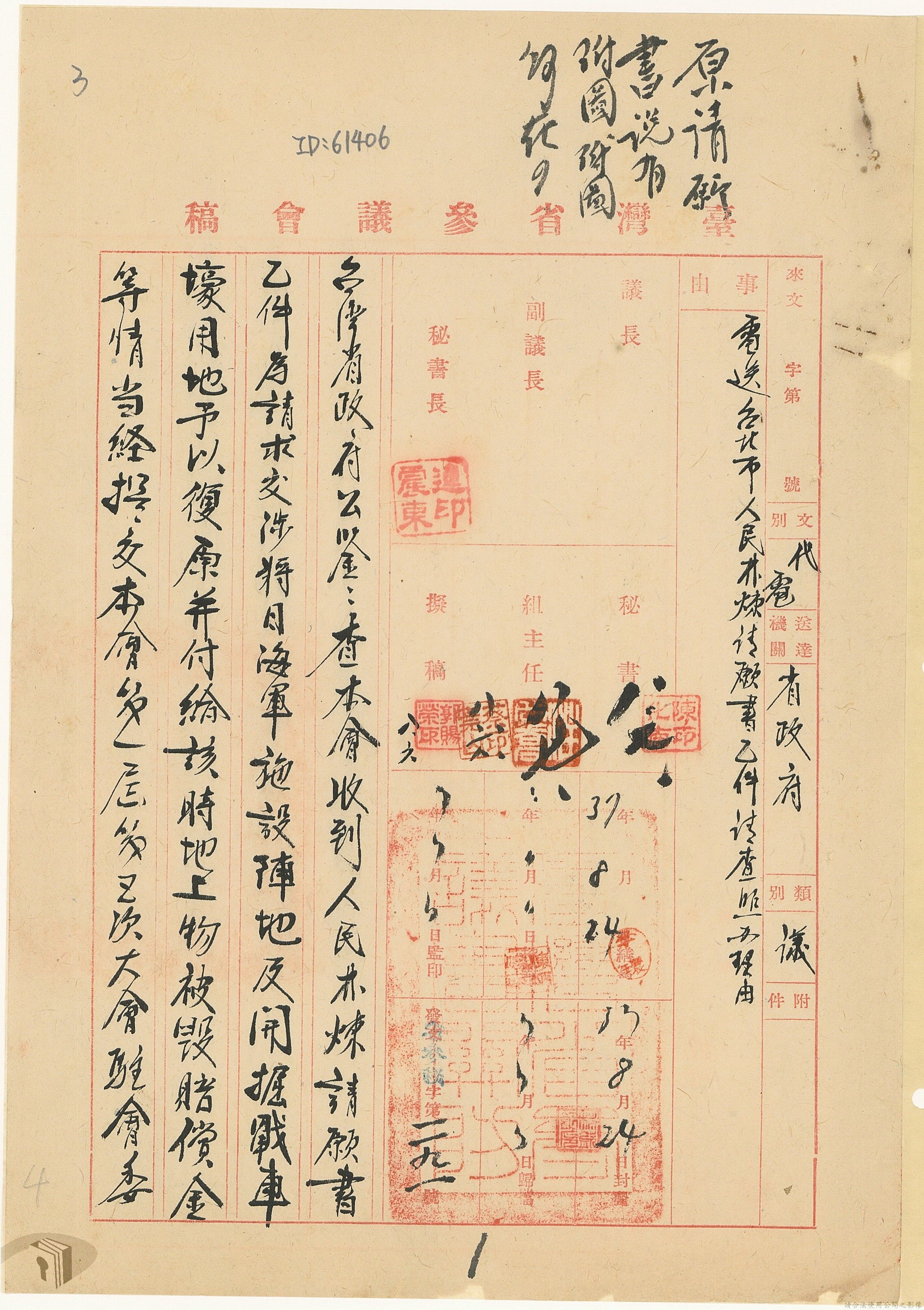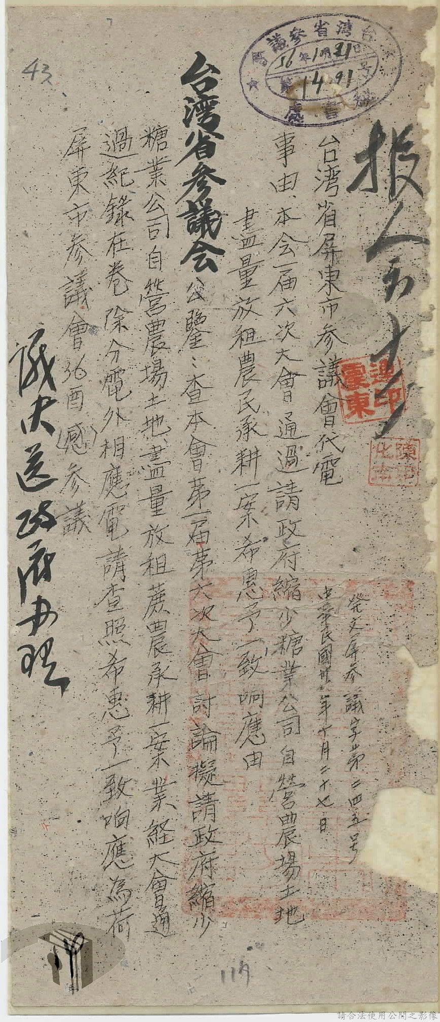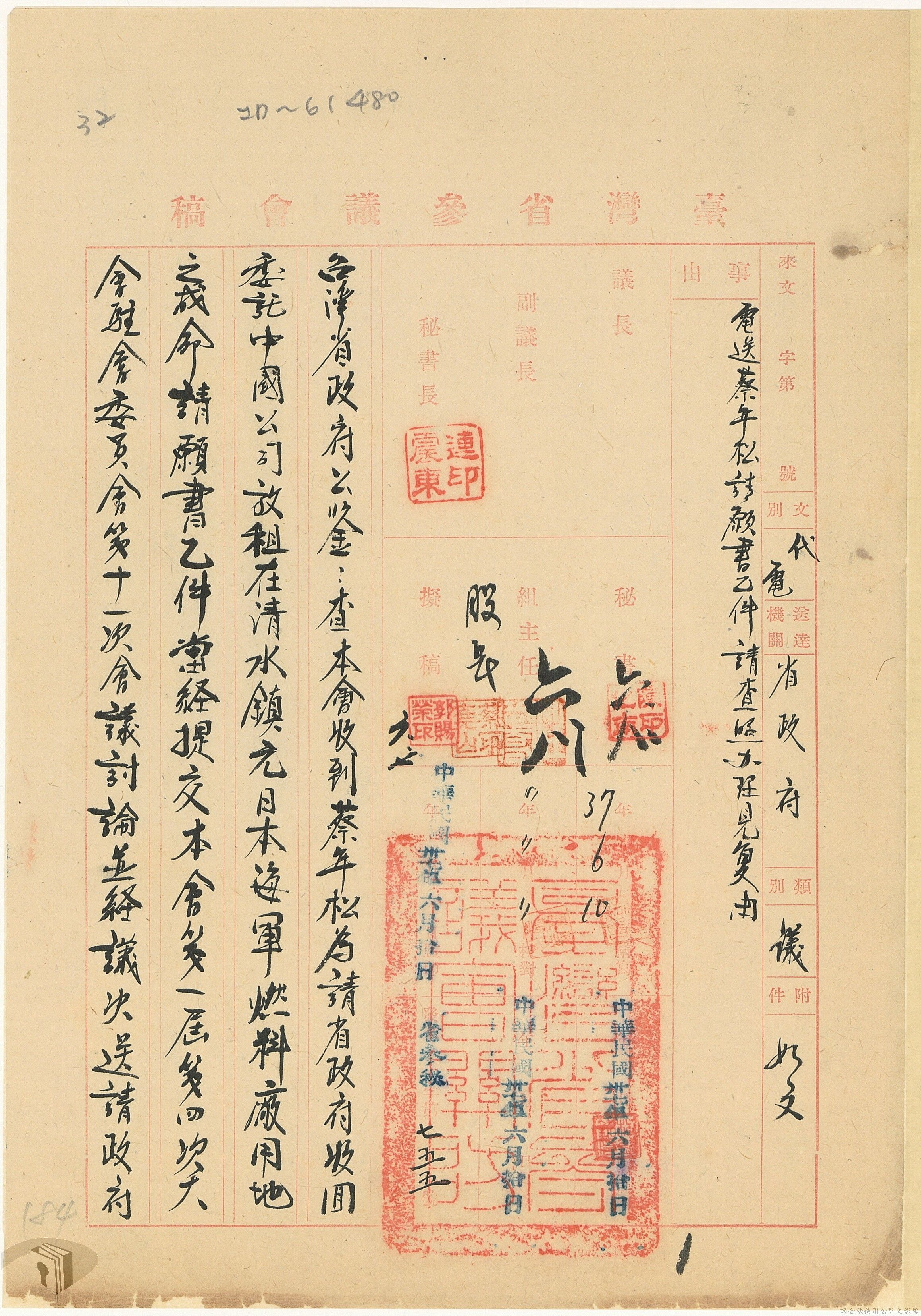 本案為37年間,有關臺灣省參議會向臺灣省政府地政處,查詢日軍設施用地復原及給付地主之地上物賠償金辦理情形;派員實地調查民眾土地案調查報告;檢送本省清理土地權利審查第2次會議記錄;臺灣省民政聽指示土地清理會議須實地勘查;函請國軍遷出民地之營舍以利耕種;發還民眾之土地;參議員強租民地案應限期補辦手續;民眾訴請恢復土地租用權;發還日軍強制徵收土地;臺灣省旅滬同鄉會長之請願書;省政府委託中國石油公司接收日本海軍燃料庫用地;民眾呈請認定永佃權。