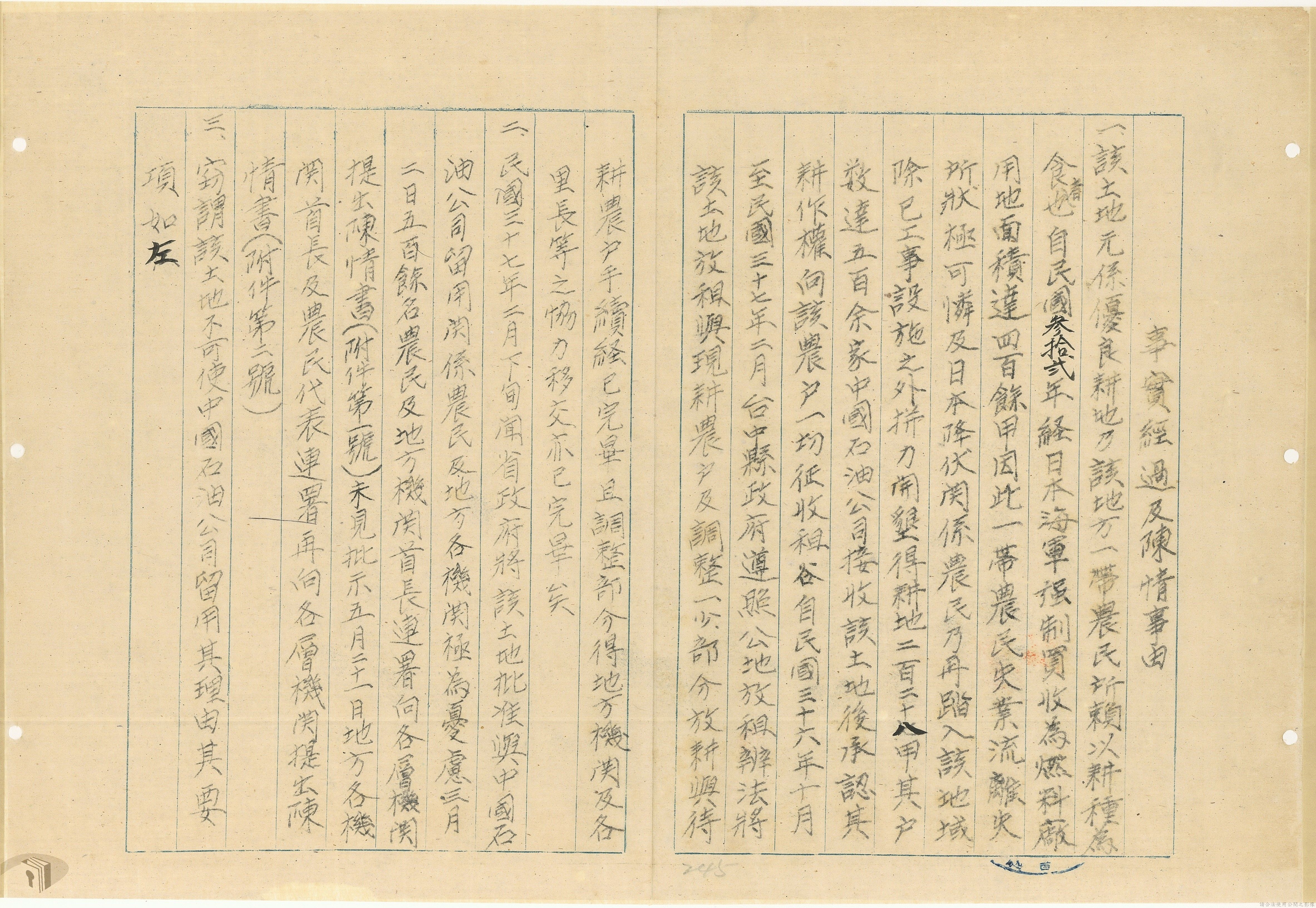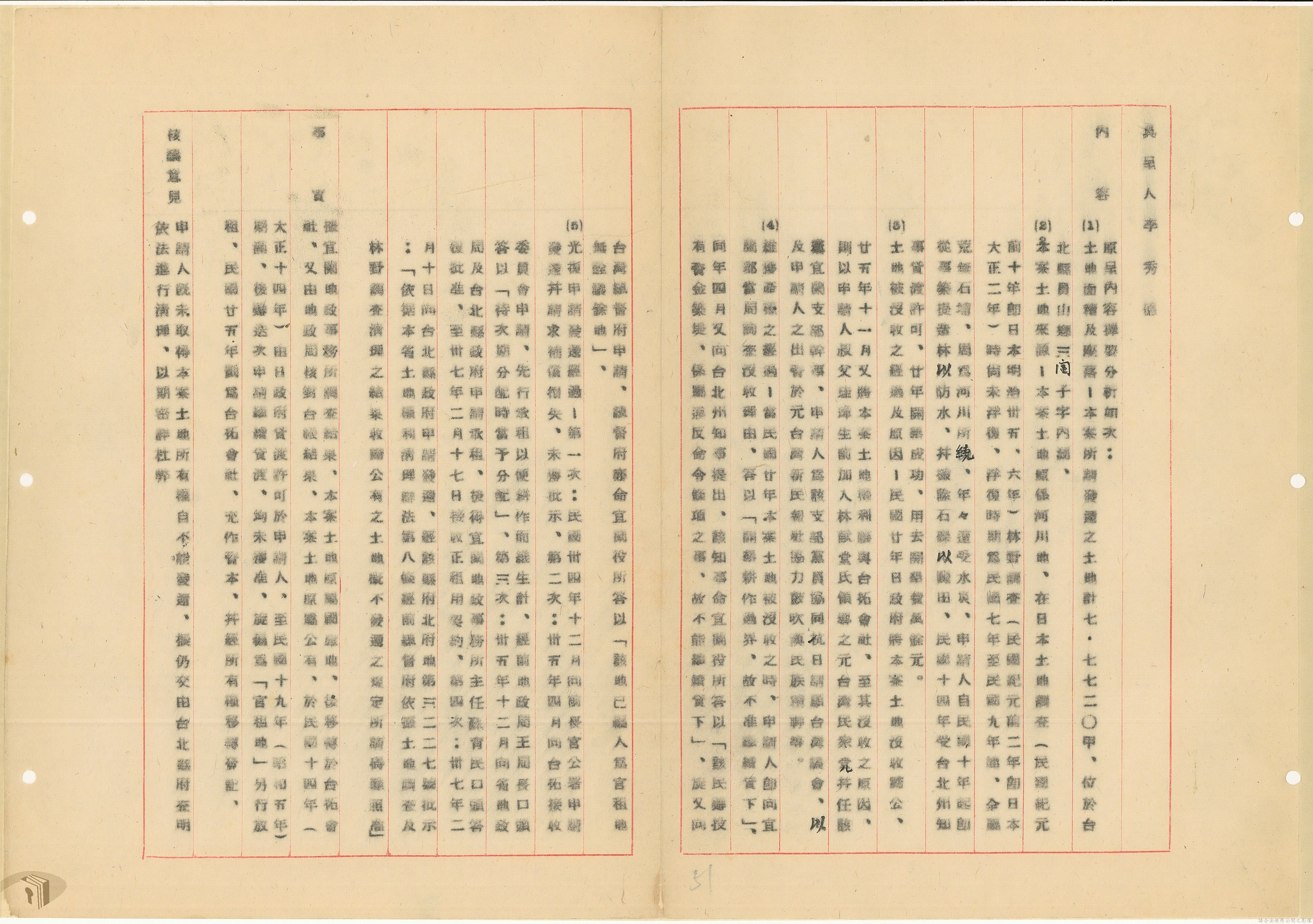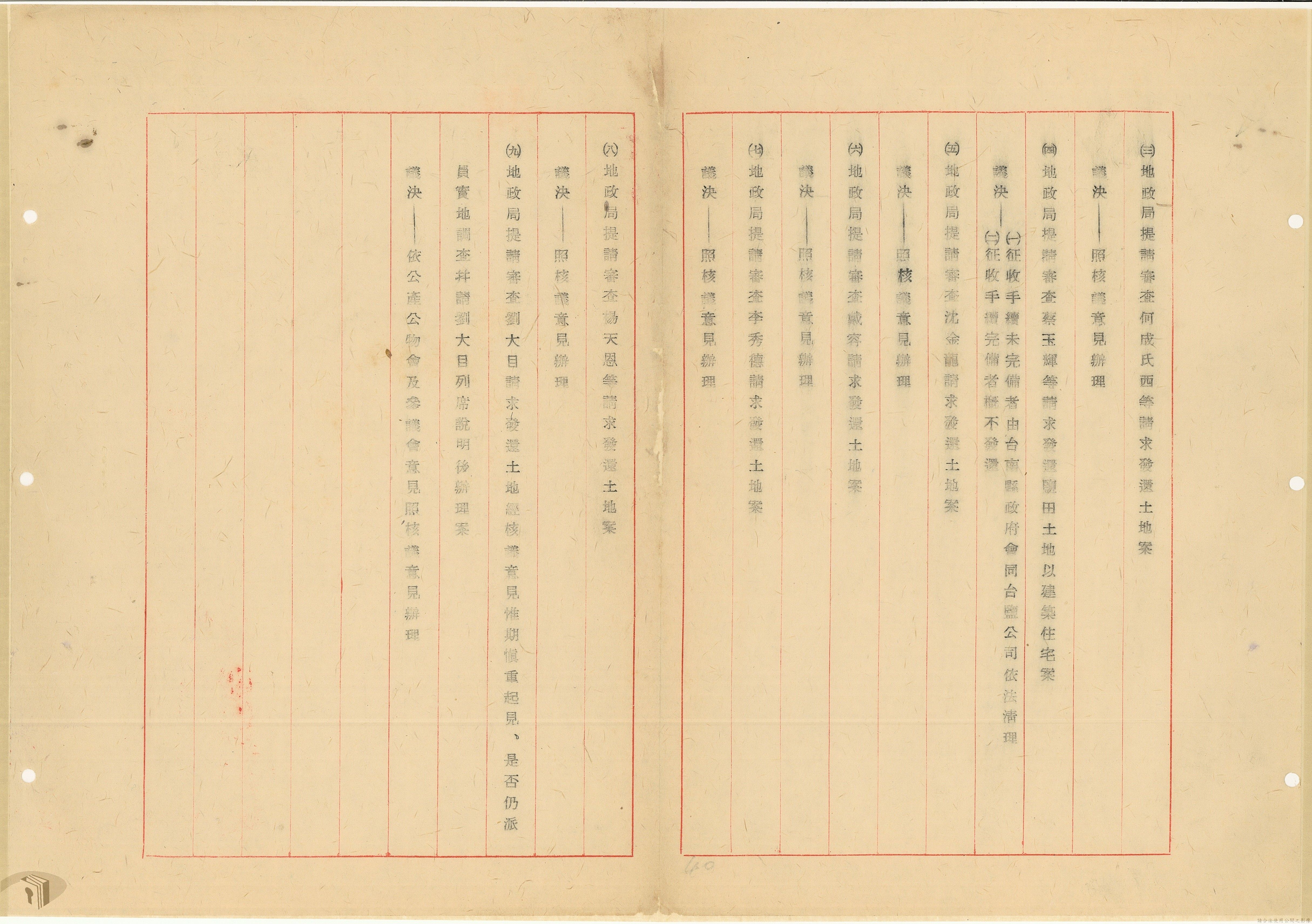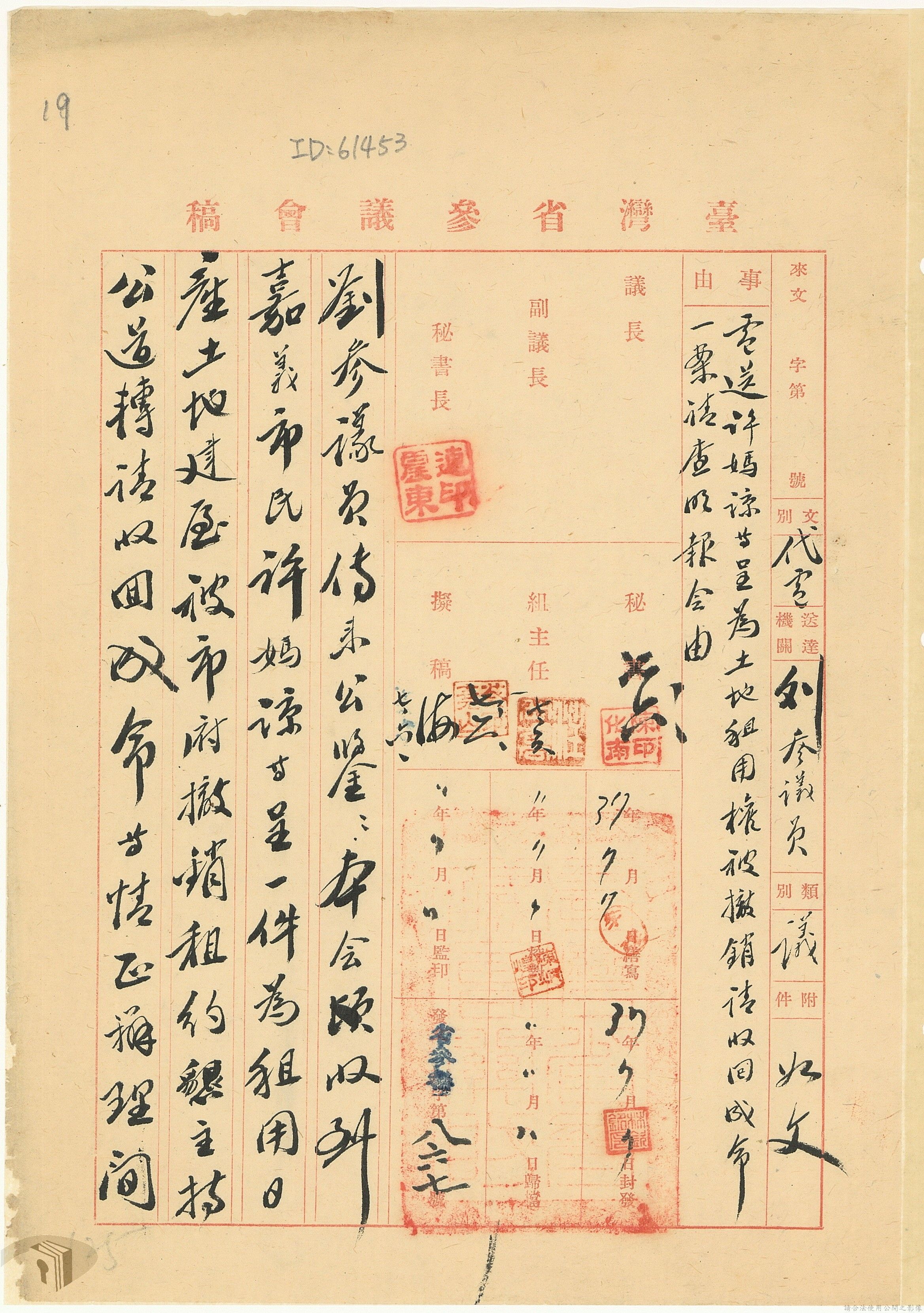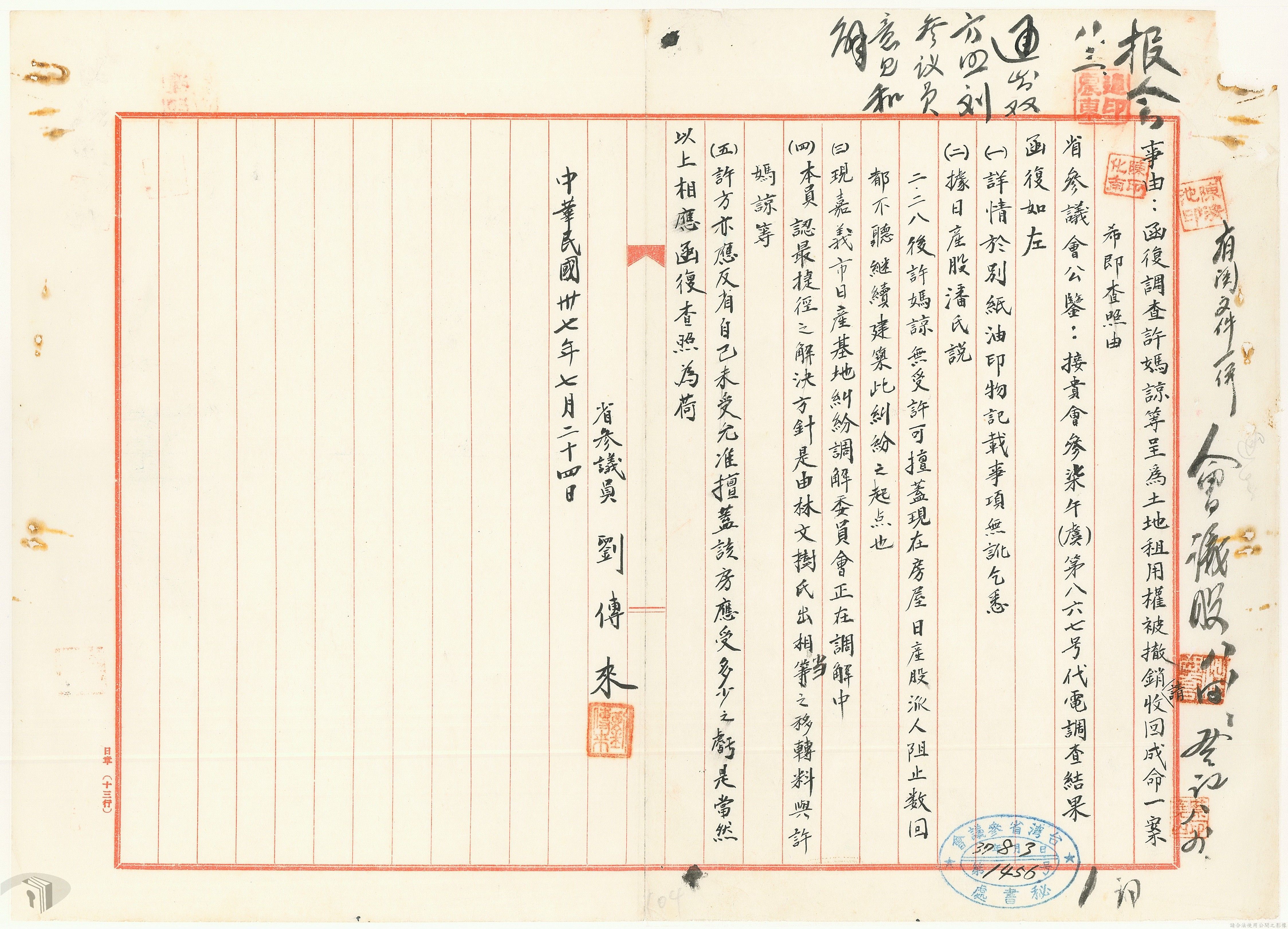 本案為37年間,有關臺灣省參議會向臺灣省政府地政處,查詢日軍設施用地復原及給付地主之地上物賠償金辦理情形;派員實地調查民眾土地案調查報告;檢送本省清理土地權利審查第2次會議記錄;臺灣省民政聽指示土地清理會議須實地勘查;函請國軍遷出民地之營舍以利耕種;發還民眾之土地;參議員強租民地案應限期補辦手續;民眾訴請恢復土地租用權;發還日軍強制徵收土地;臺灣省旅滬同鄉會長之請願書;省政府委託中國石油公司接收日本海軍燃料庫用地;民眾呈請認定永佃權。