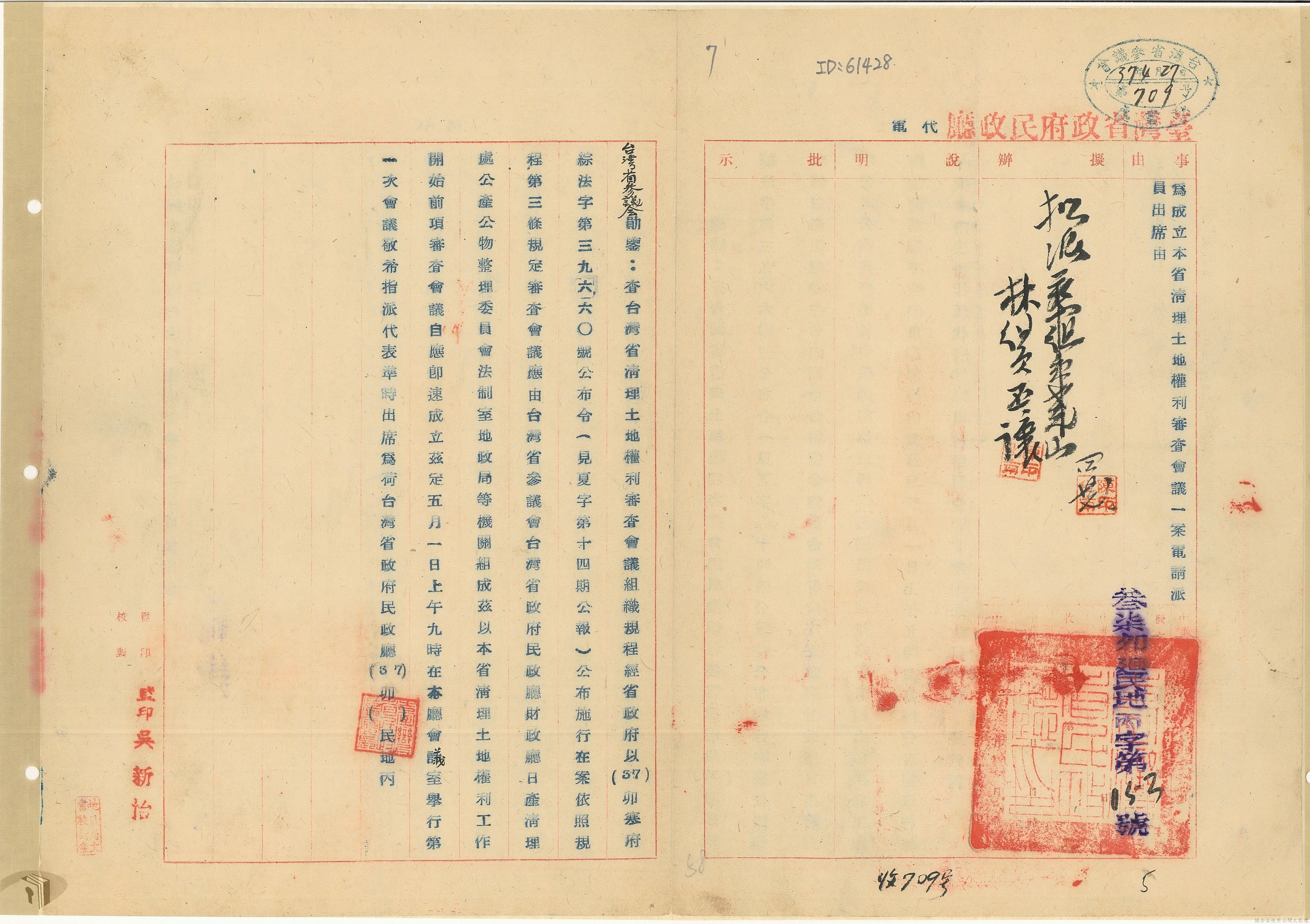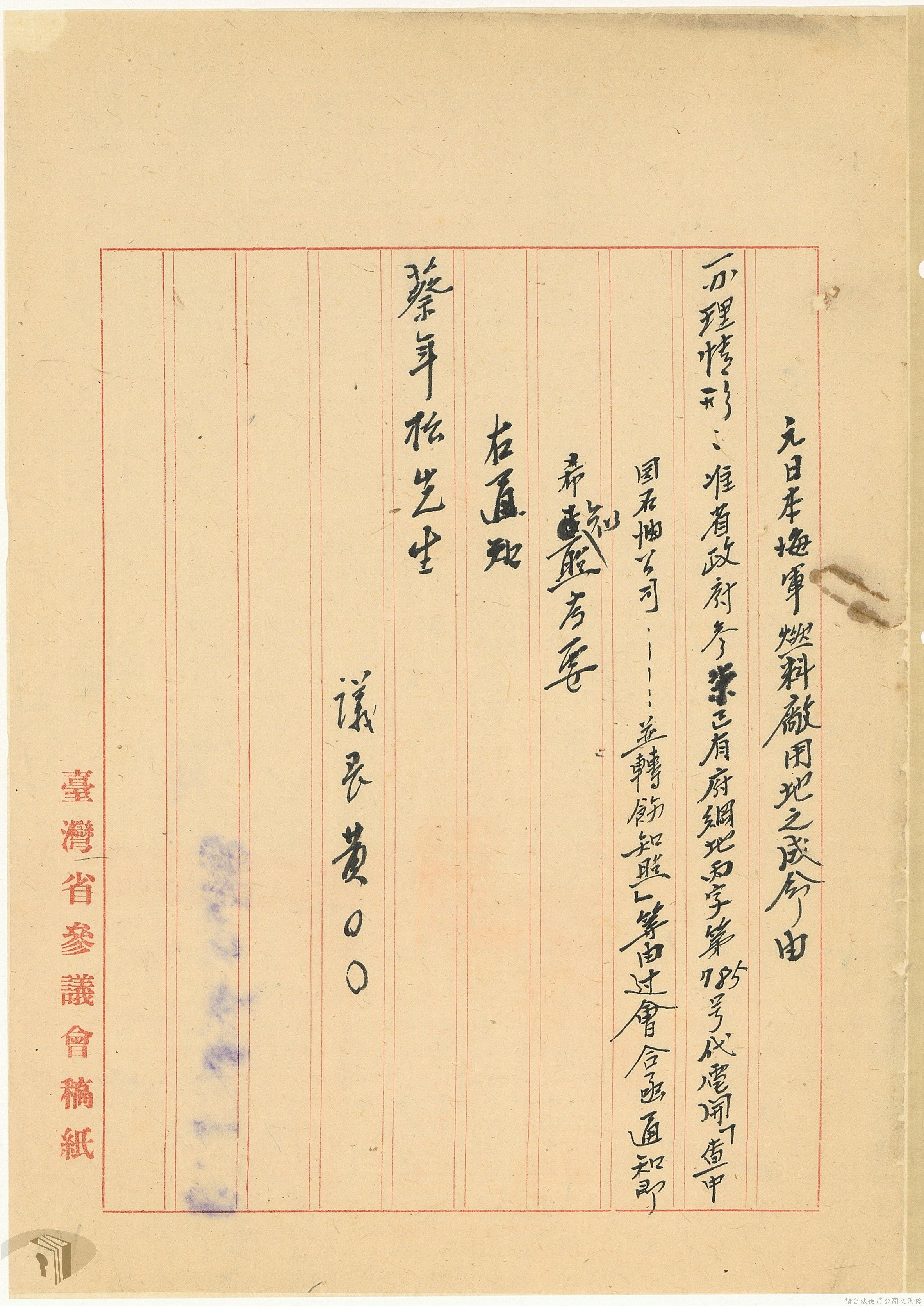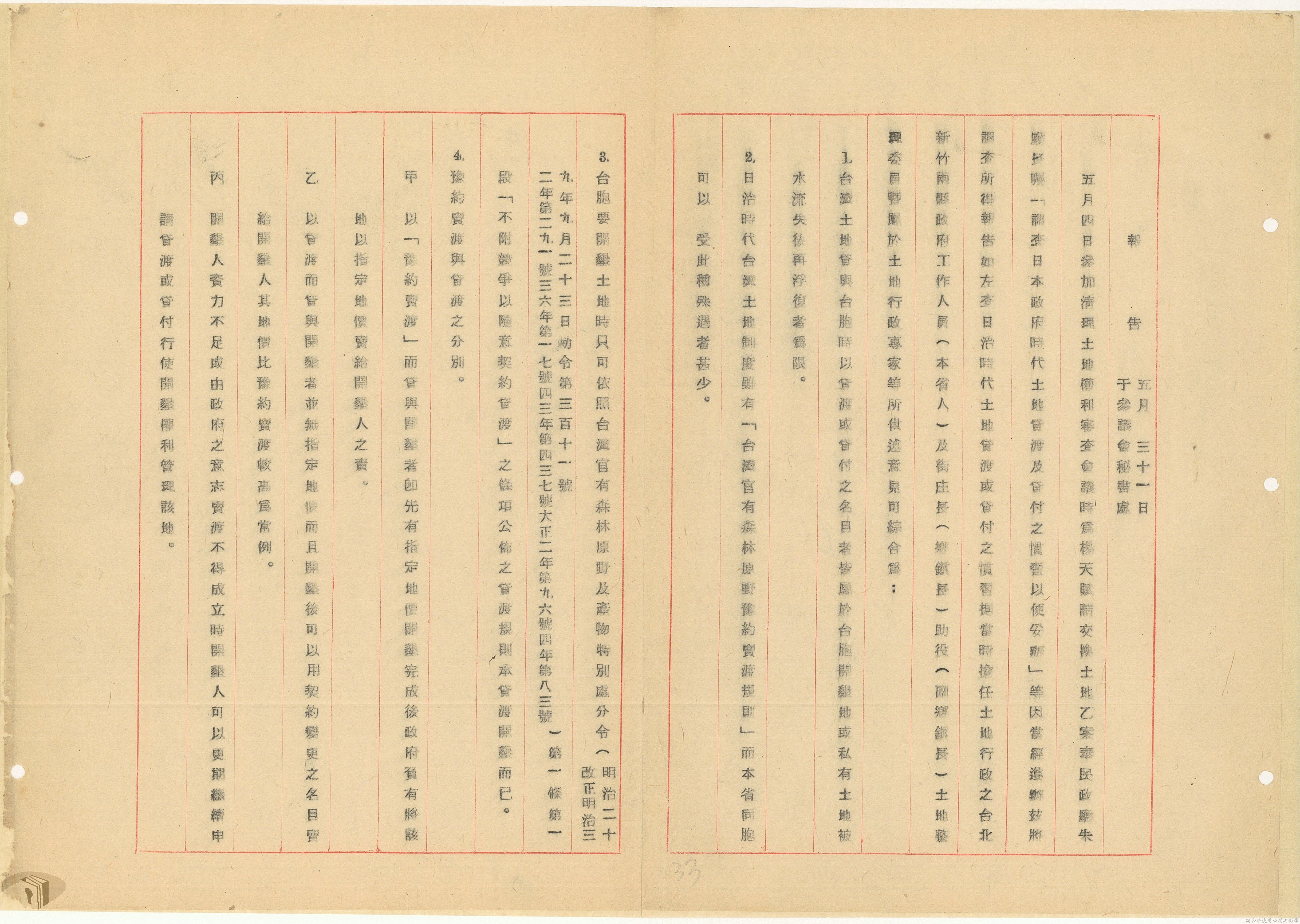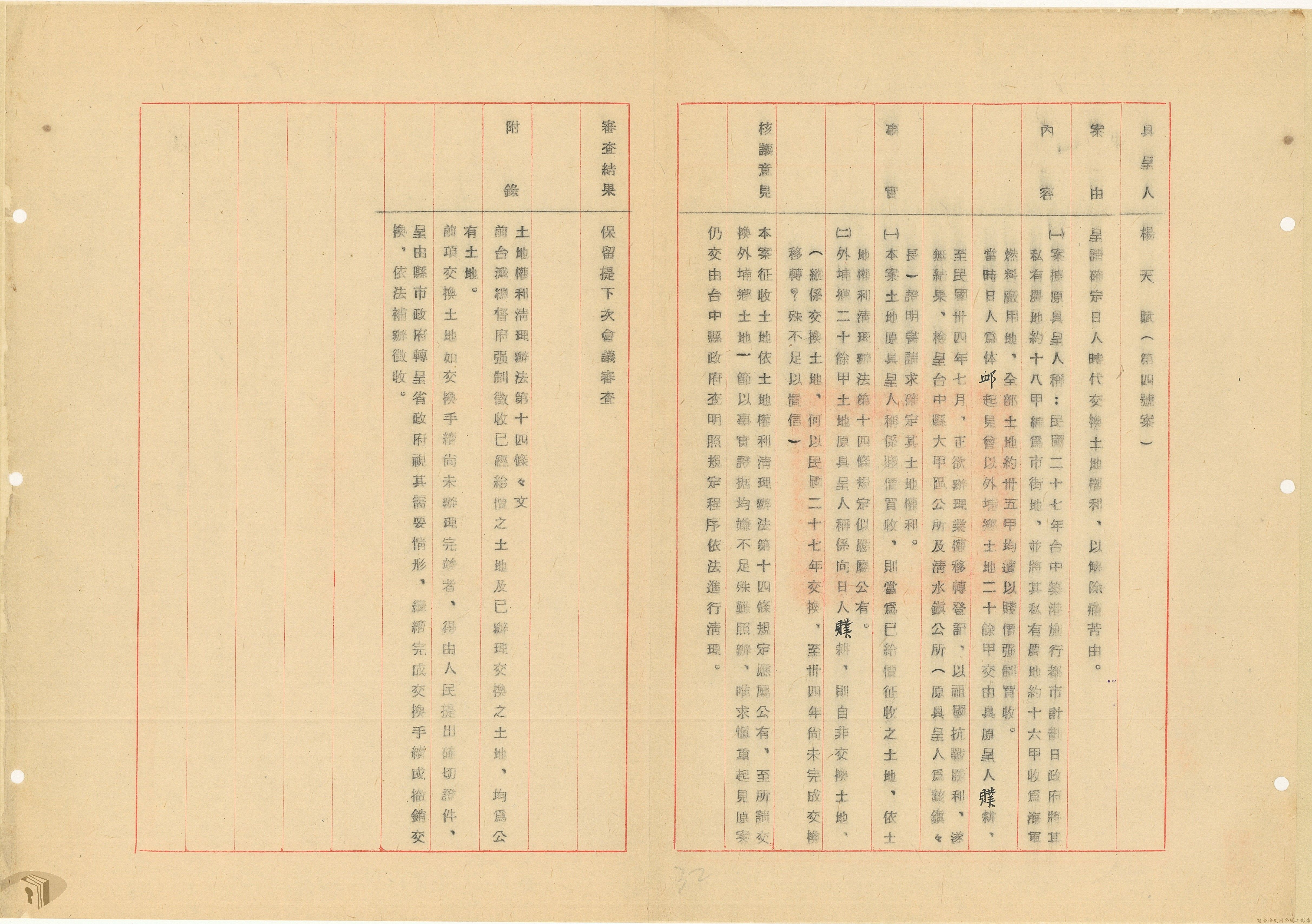 本案為37年間,有關臺灣省參議會向臺灣省政府地政處,查詢日軍設施用地復原及給付地主之地上物賠償金辦理情形;派員實地調查民眾土地案調查報告;檢送本省清理土地權利審查第2次會議記錄;臺灣省民政聽指示土地清理會議須實地勘查;函請國軍遷出民地之營舍以利耕種;發還民眾之土地;參議員強租民地案應限期補辦手續;民眾訴請恢復土地租用權;發還日軍強制徵收土地;臺灣省旅滬同鄉會長之請願書;省政府委託中國石油公司接收日本海軍燃料庫用地;民眾呈請認定永佃權。