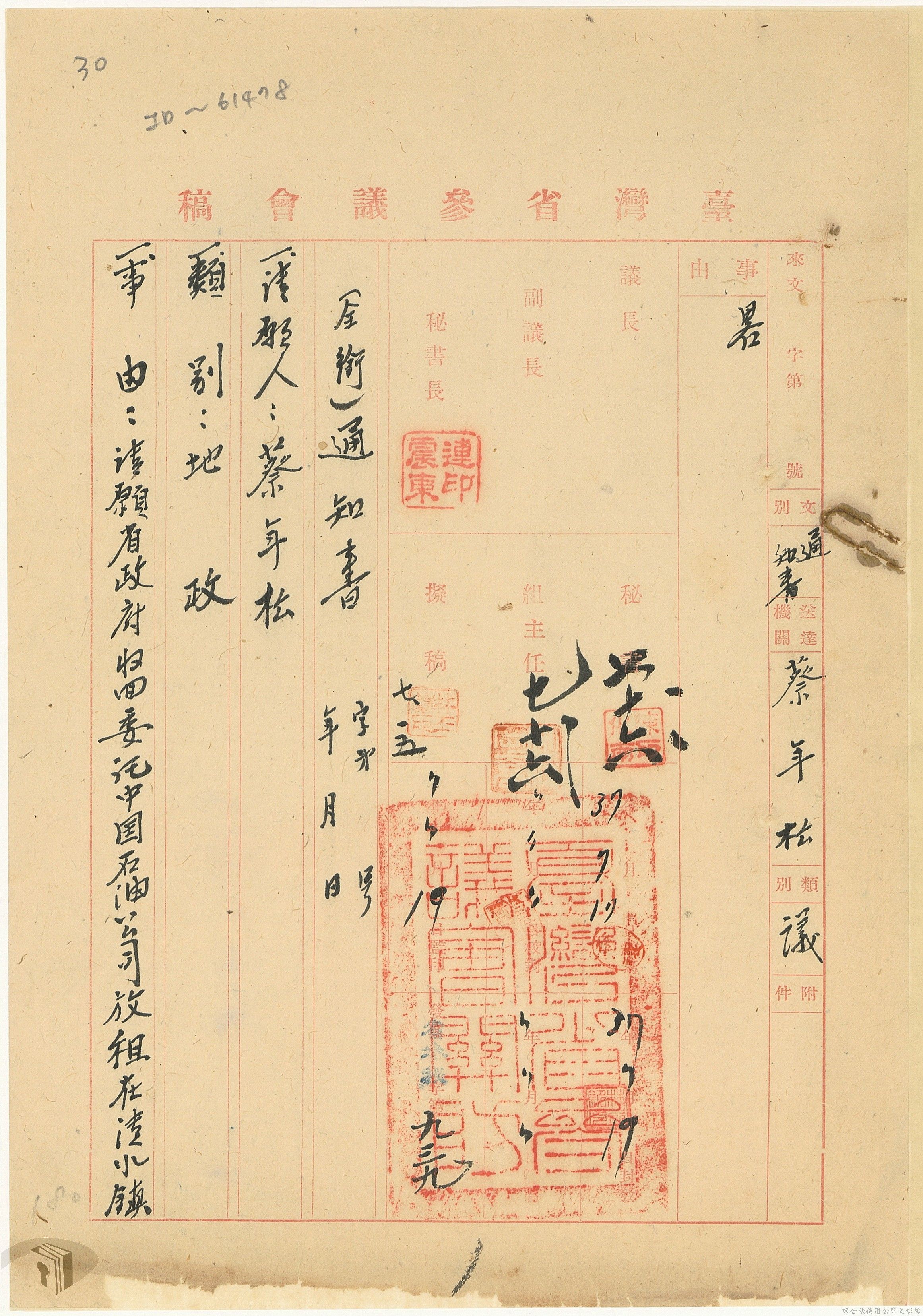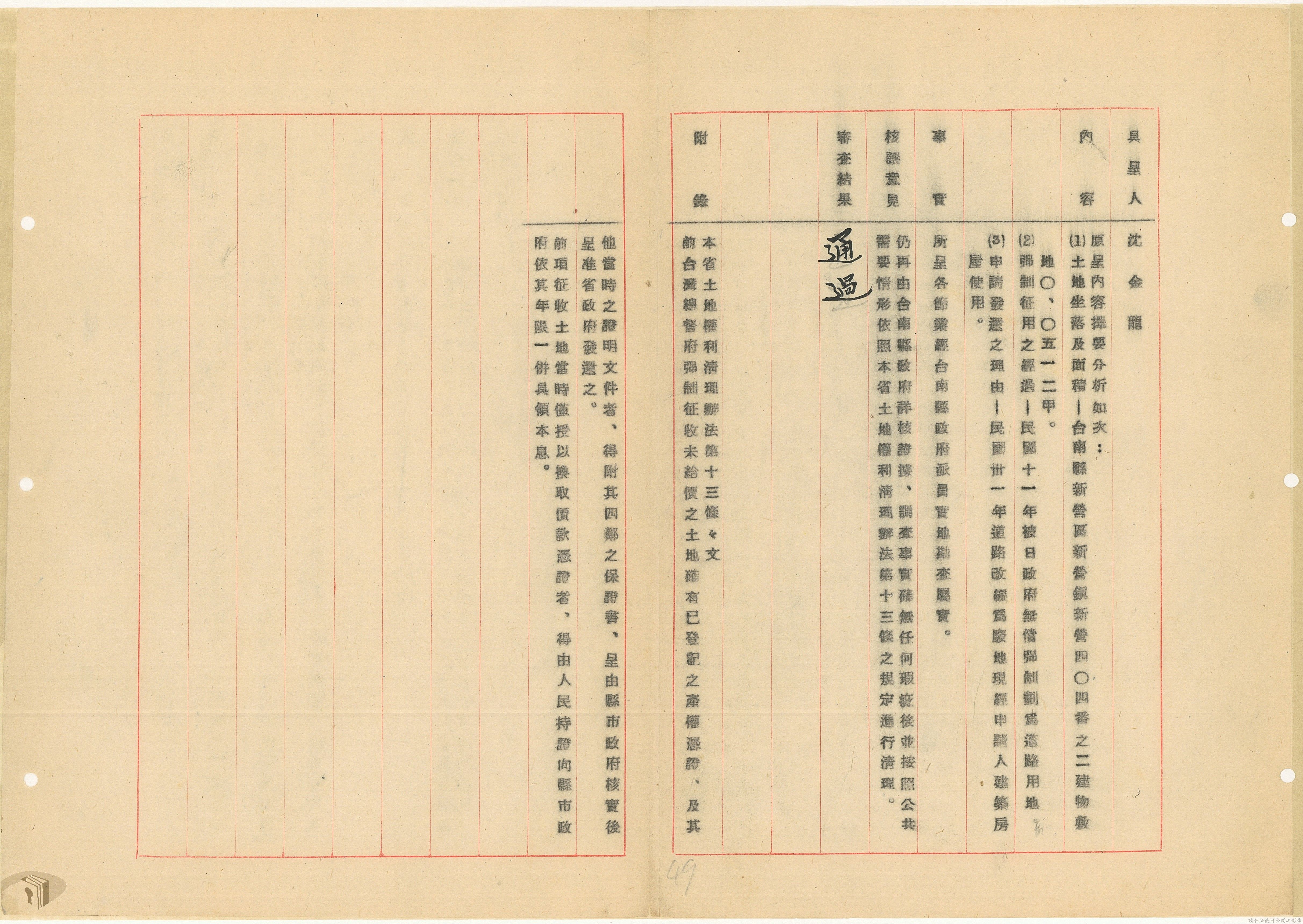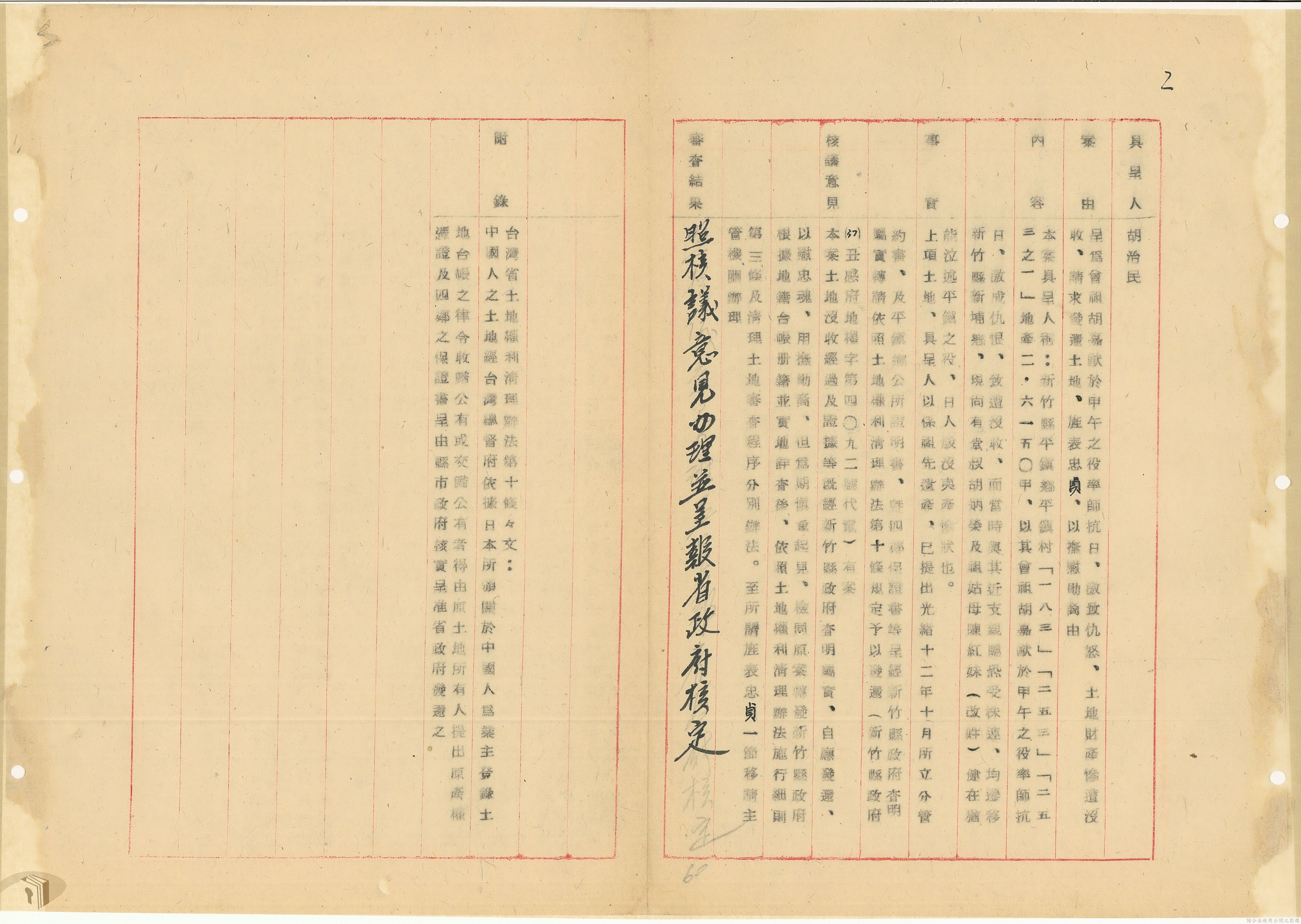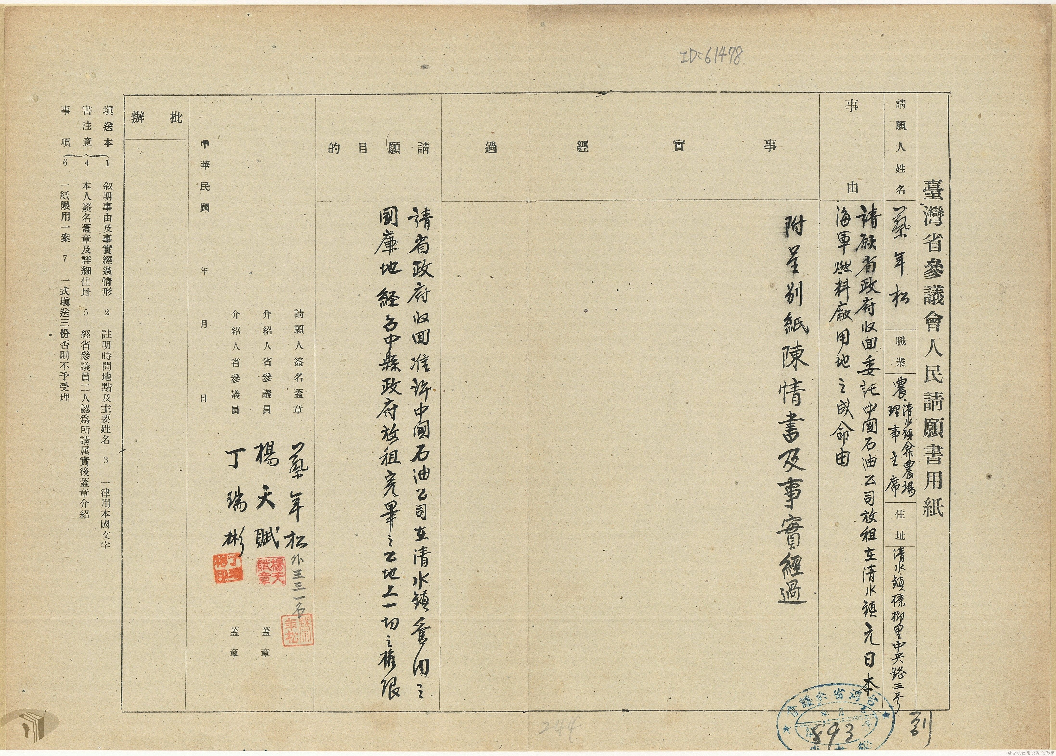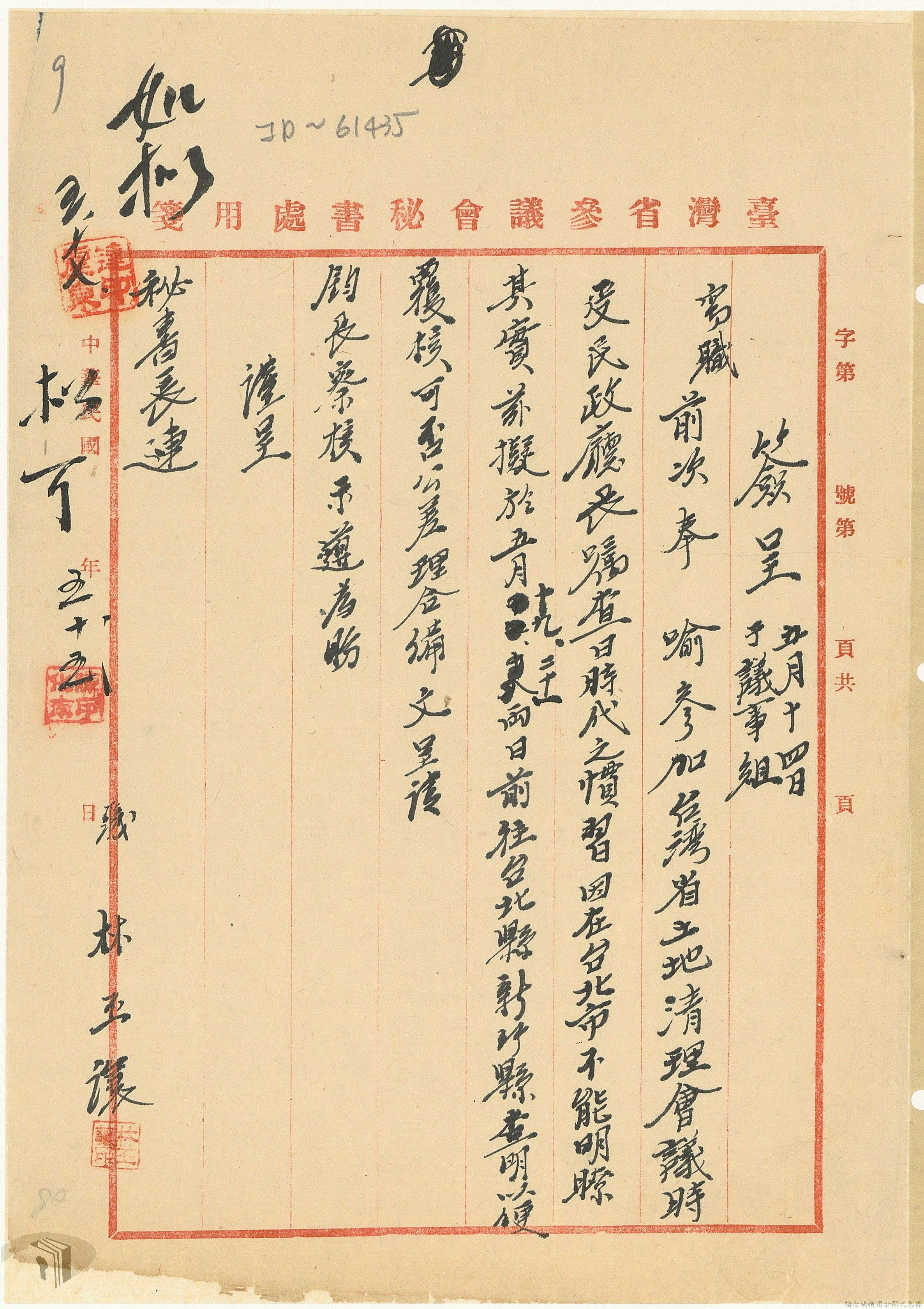 本案為37年間,有關臺灣省參議會向臺灣省政府地政處,查詢日軍設施用地復原及給付地主之地上物賠償金辦理情形;派員實地調查民眾土地案調查報告;檢送本省清理土地權利審查第2次會議記錄;臺灣省民政聽指示土地清理會議須實地勘查;函請國軍遷出民地之營舍以利耕種;發還民眾之土地;參議員強租民地案應限期補辦手續;民眾訴請恢復土地租用權;發還日軍強制徵收土地;臺灣省旅滬同鄉會長之請願書;省政府委託中國石油公司接收日本海軍燃料庫用地;民眾呈請認定永佃權。
