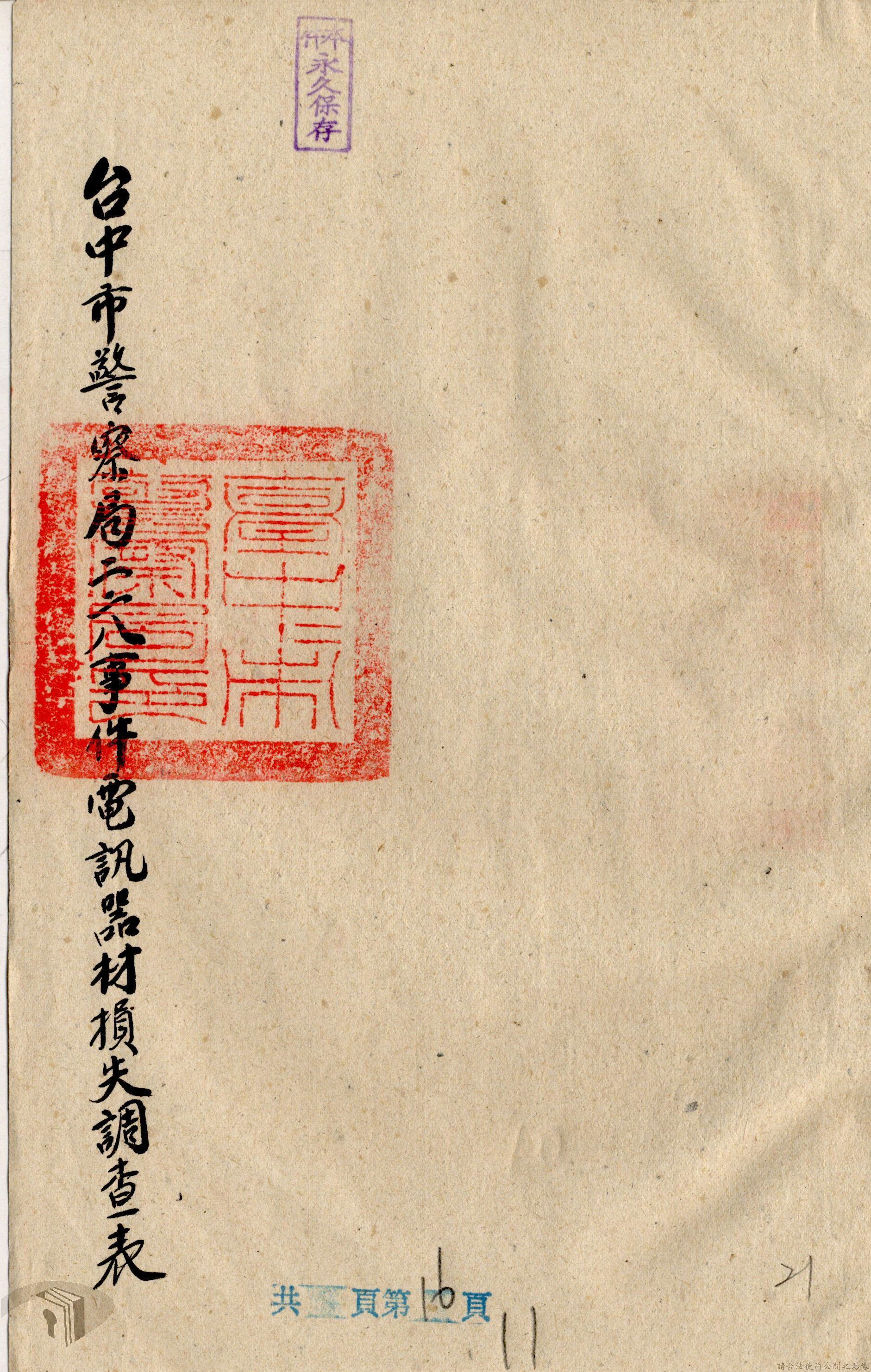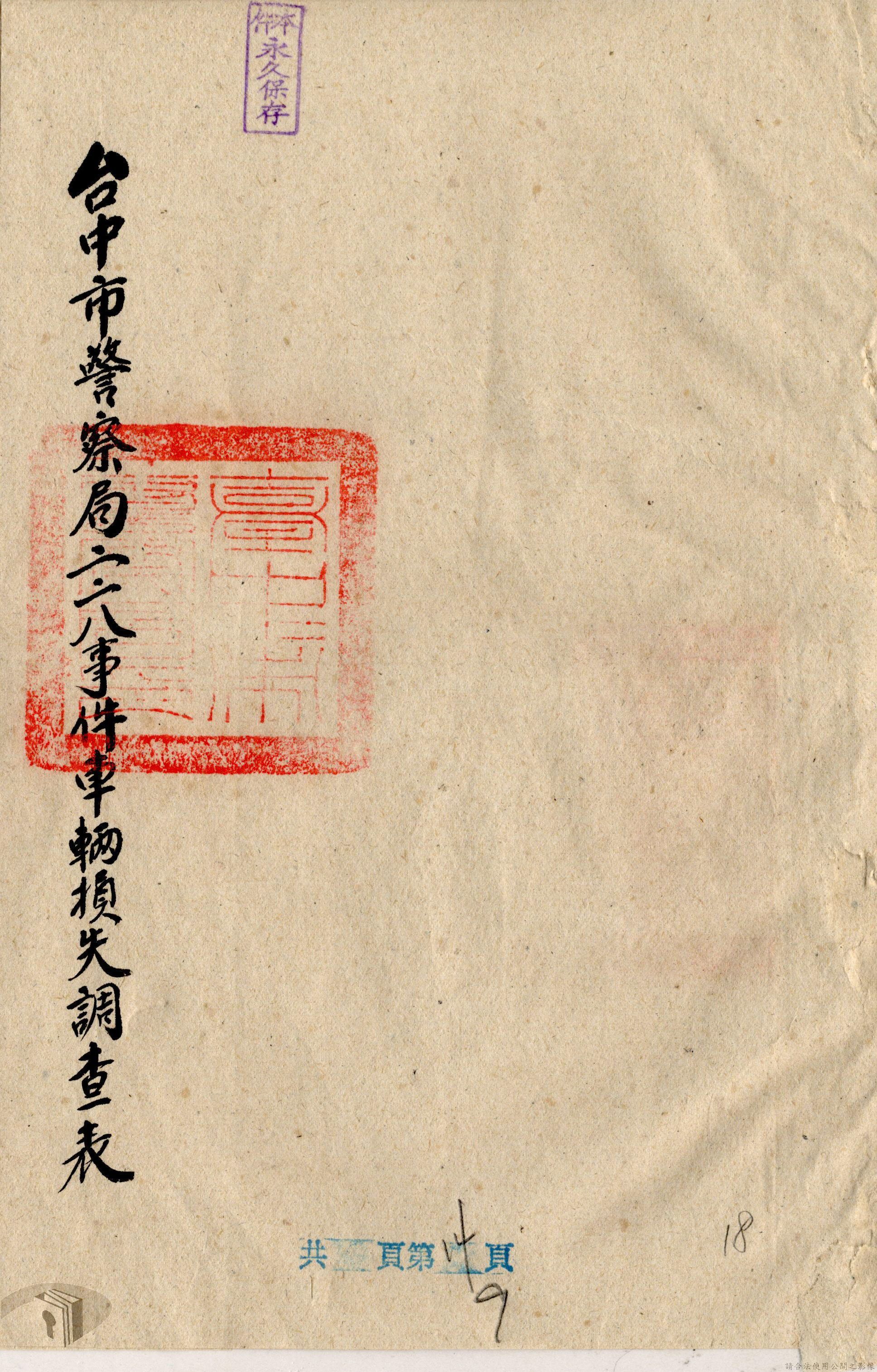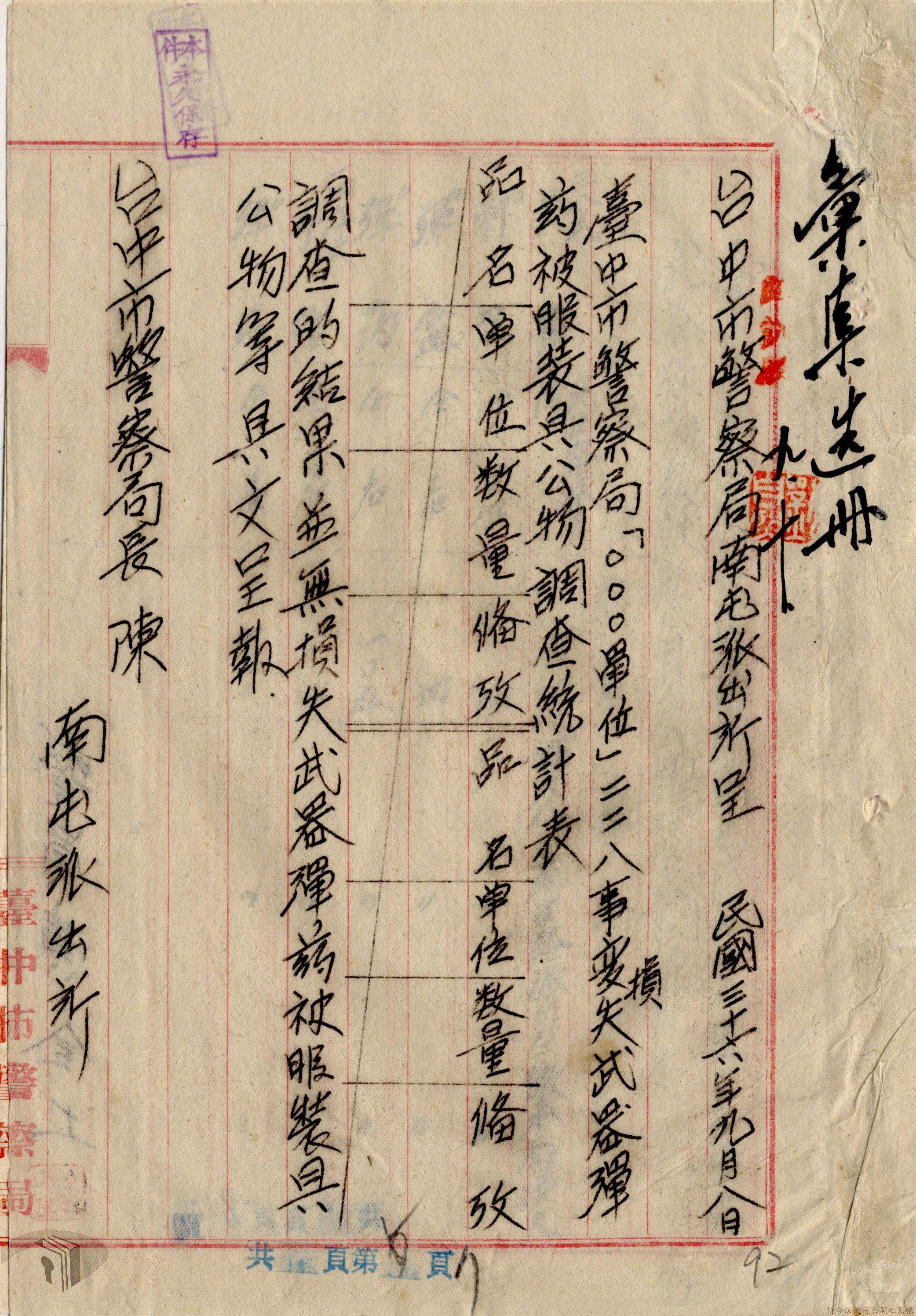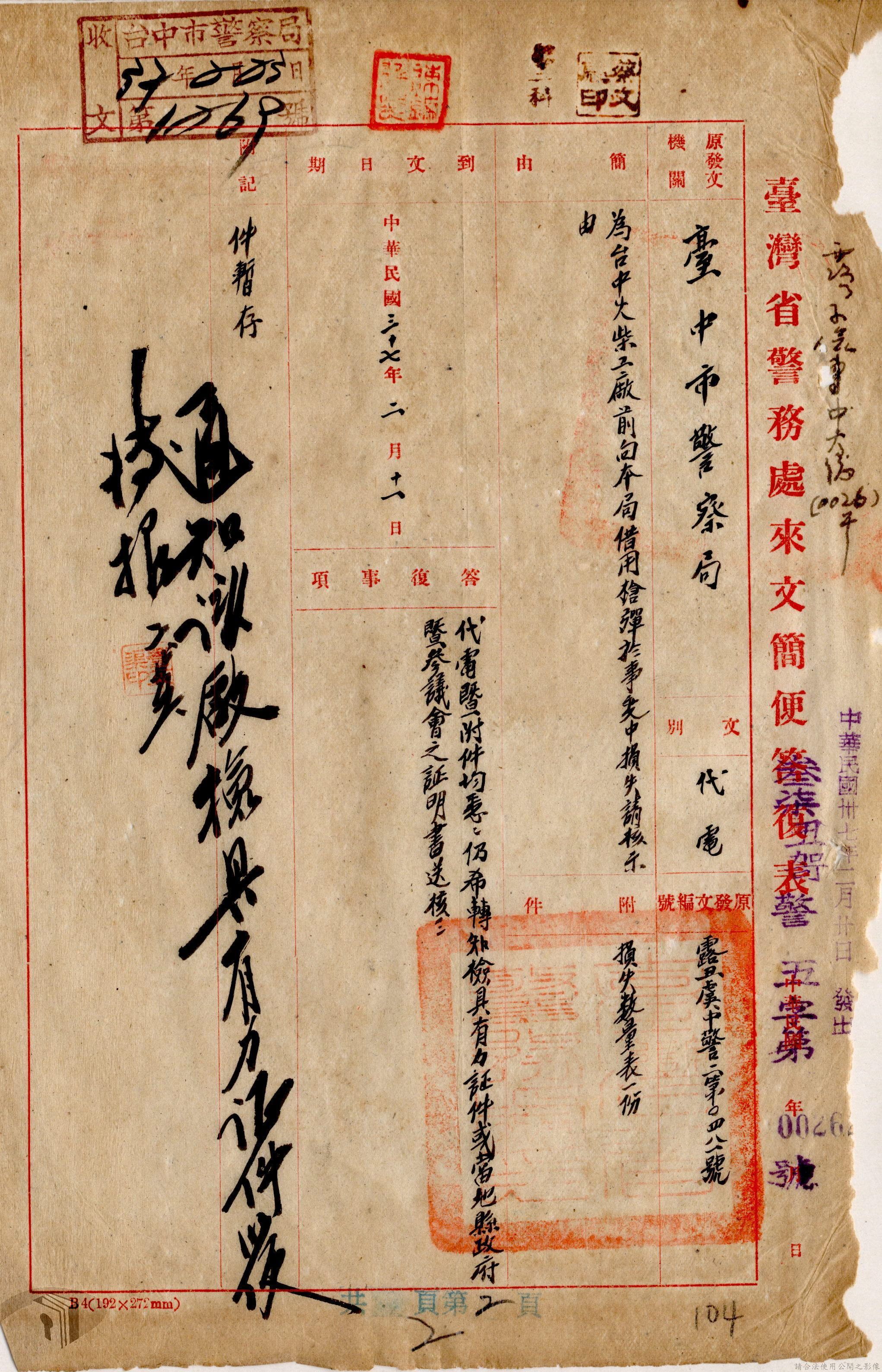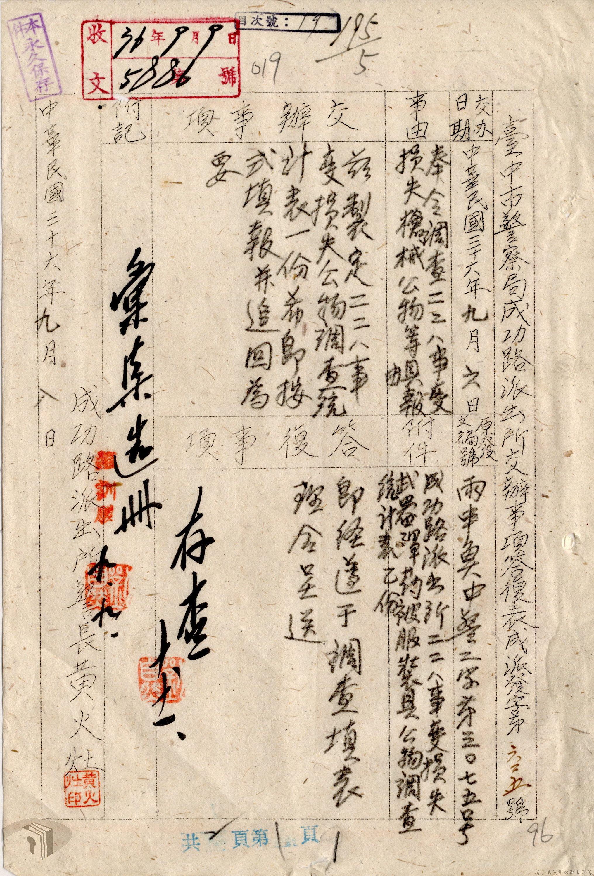 本案為36至37年間,臺中市政府警察局將各派出所二二八事件電訊器材、槍械、車輛損失調查表函送臺灣省行政長官公署警務處,並向臺灣省行政長官公署警務處及臺灣省警備司令部陳報有關追回二二八事件中借用槍械及各項公物損失情形。