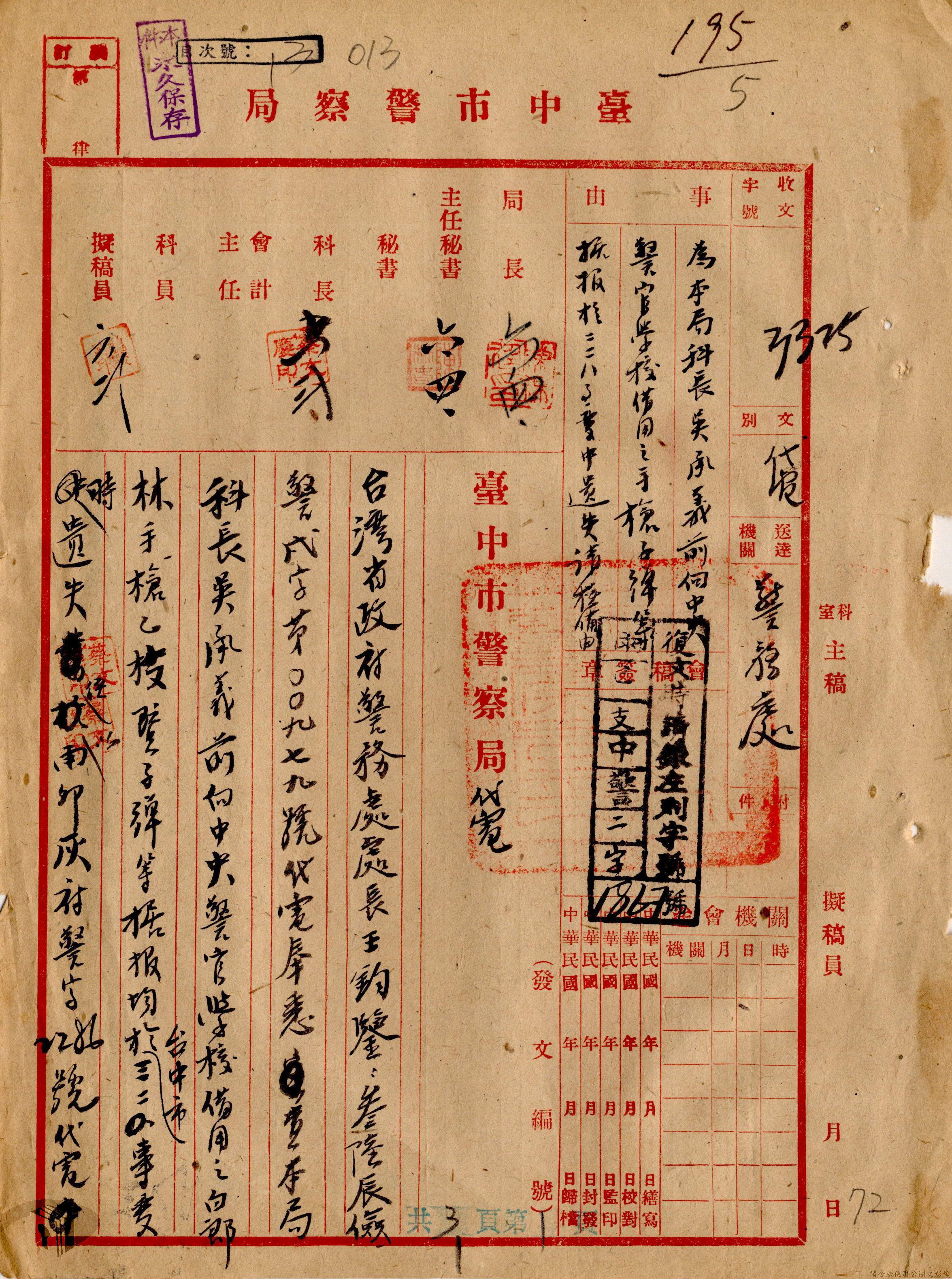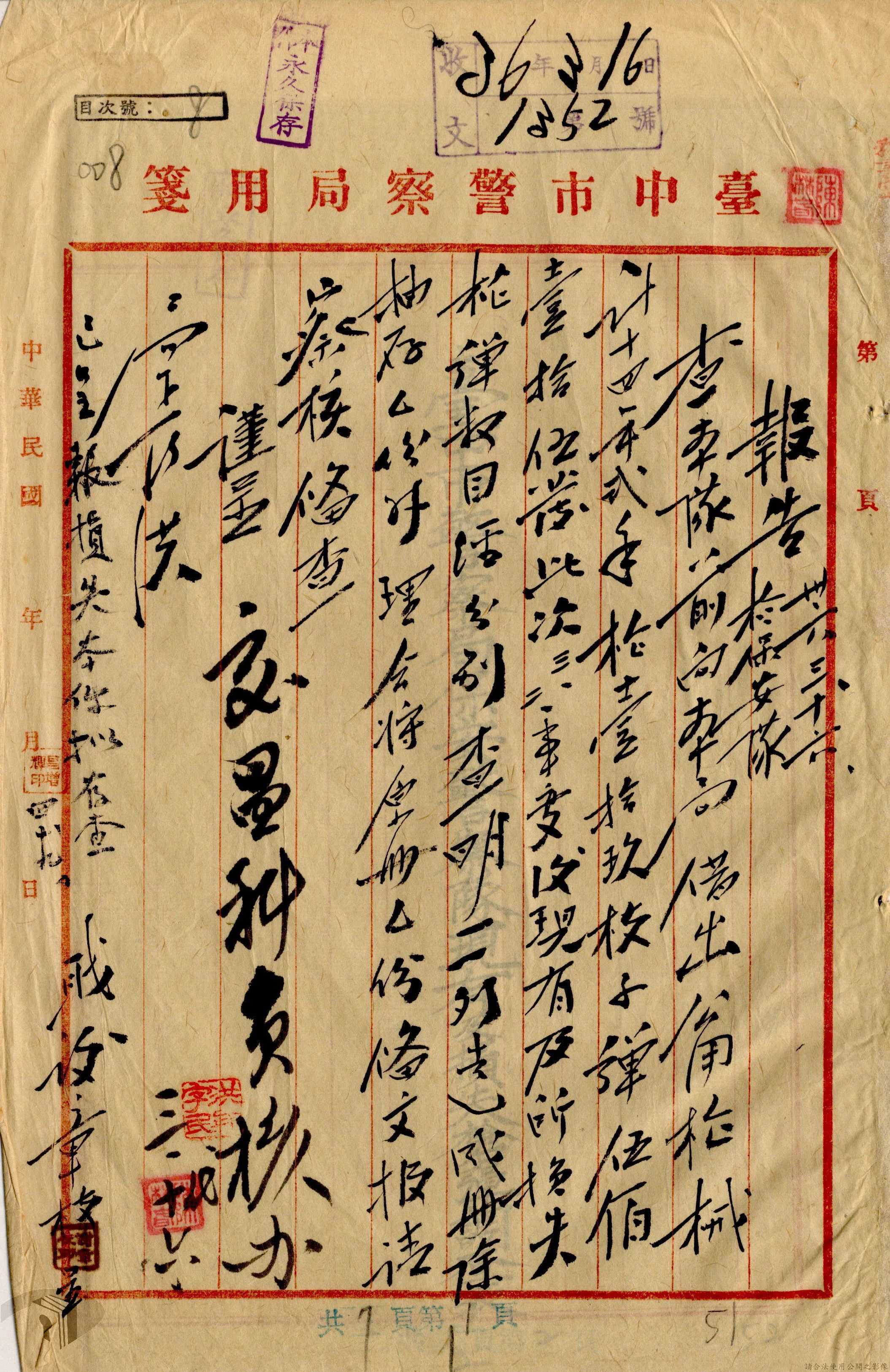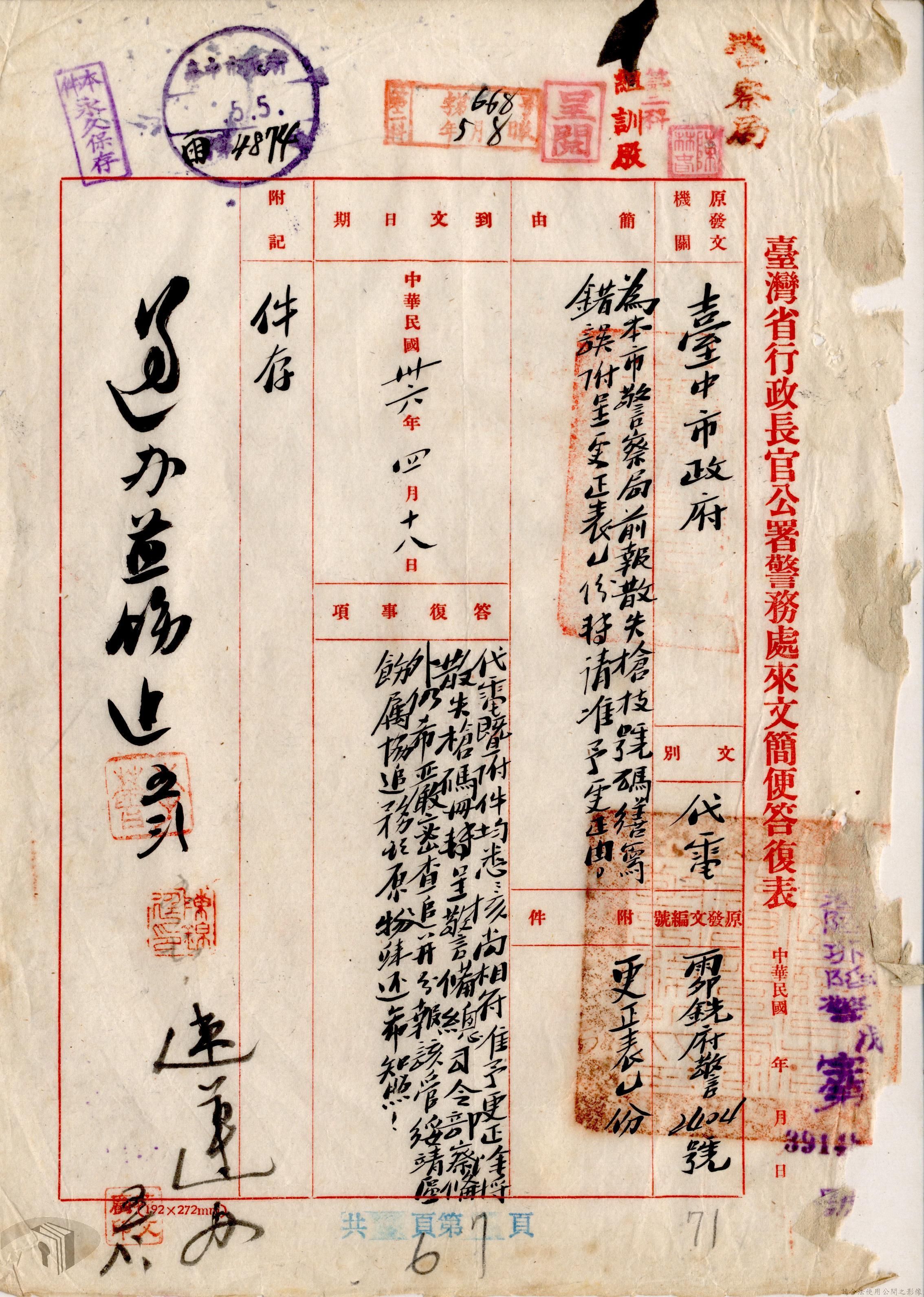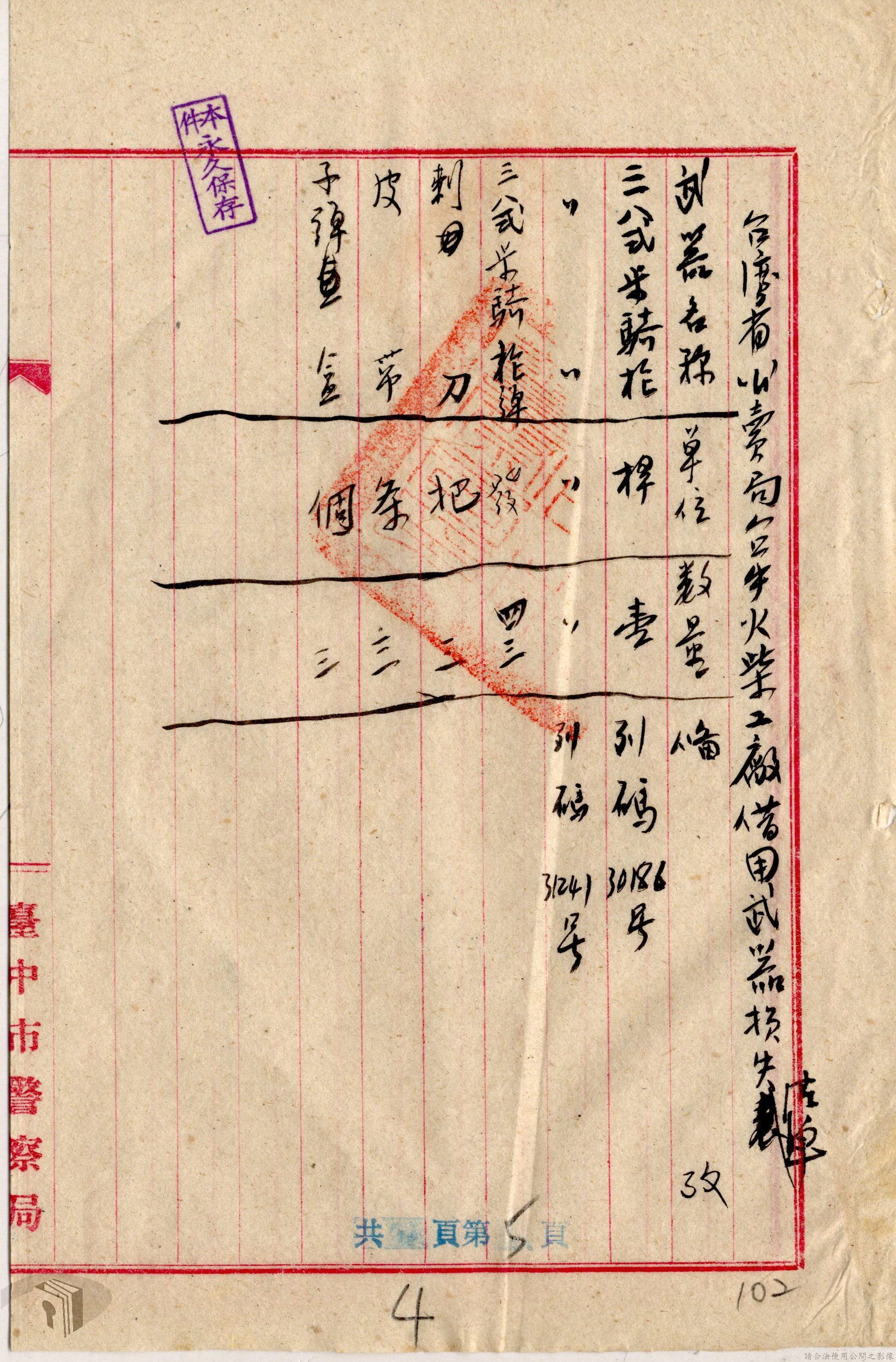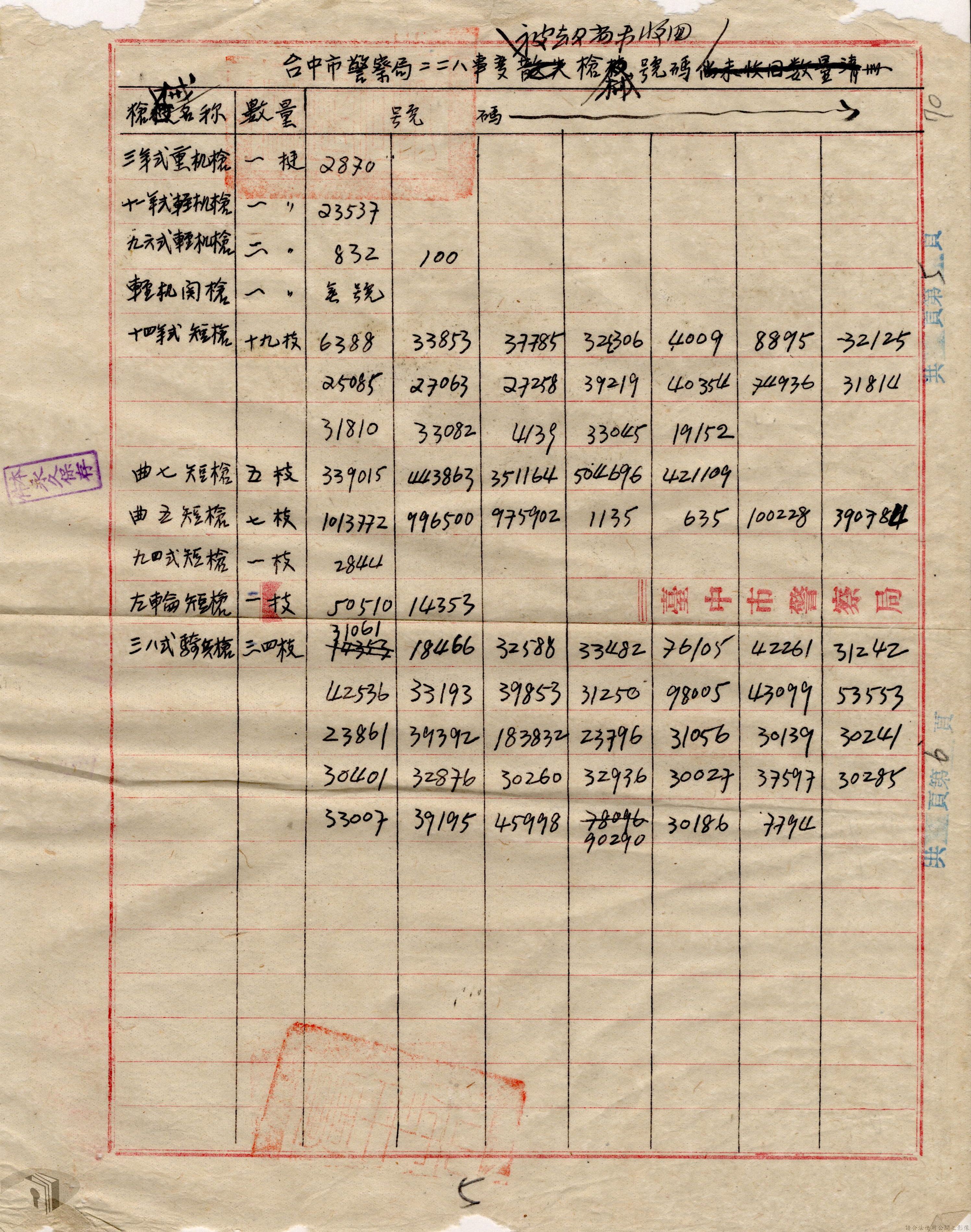 本案為36至37年間,臺中市政府警察局將各派出所二二八事件電訊器材、槍械、車輛損失調查表函送臺灣省行政長官公署警務處,並向臺灣省行政長官公署警務處及臺灣省警備司令部陳報有關追回二二八事件中借用槍械及各項公物損失情形。