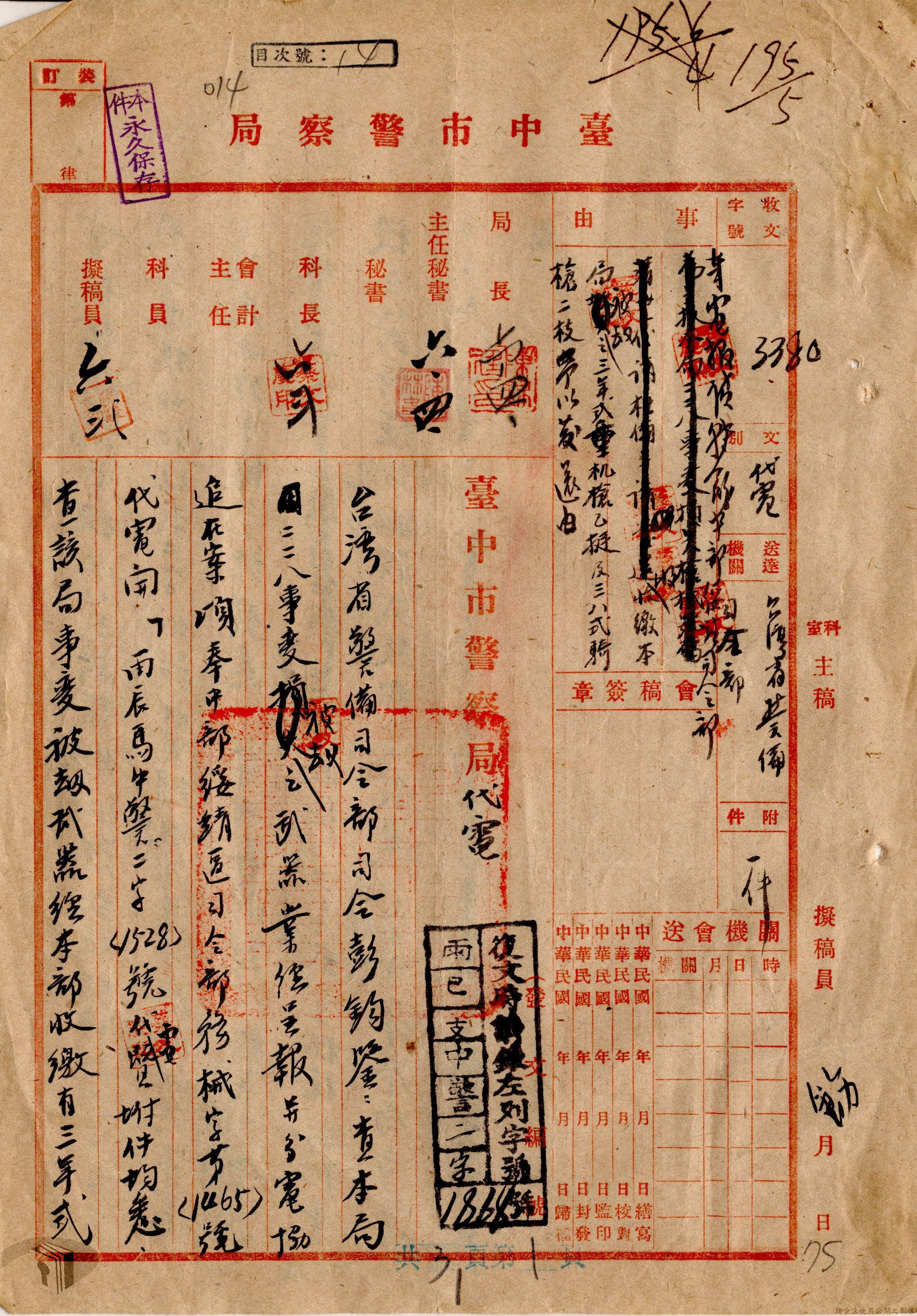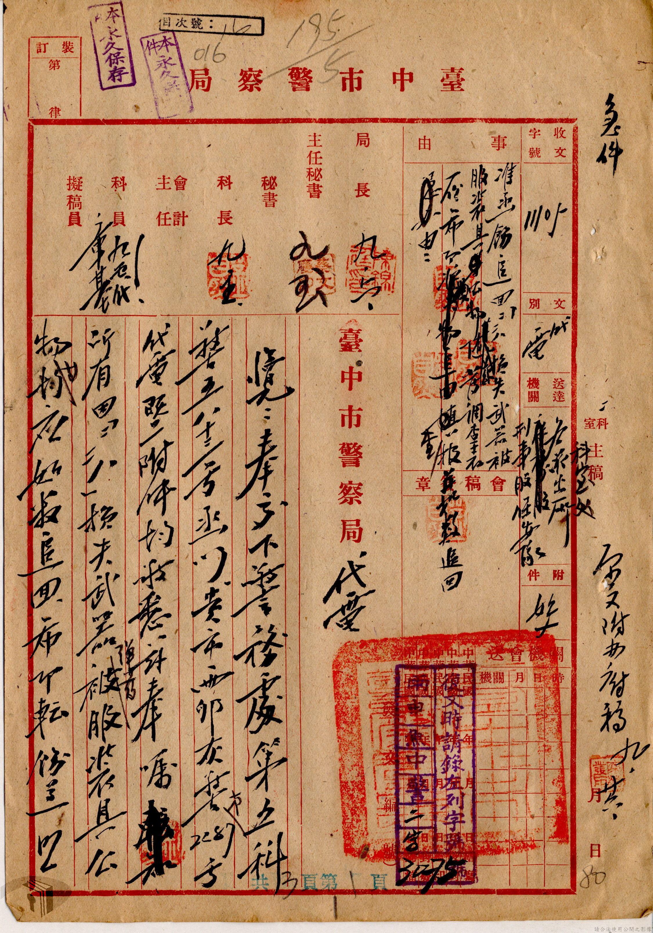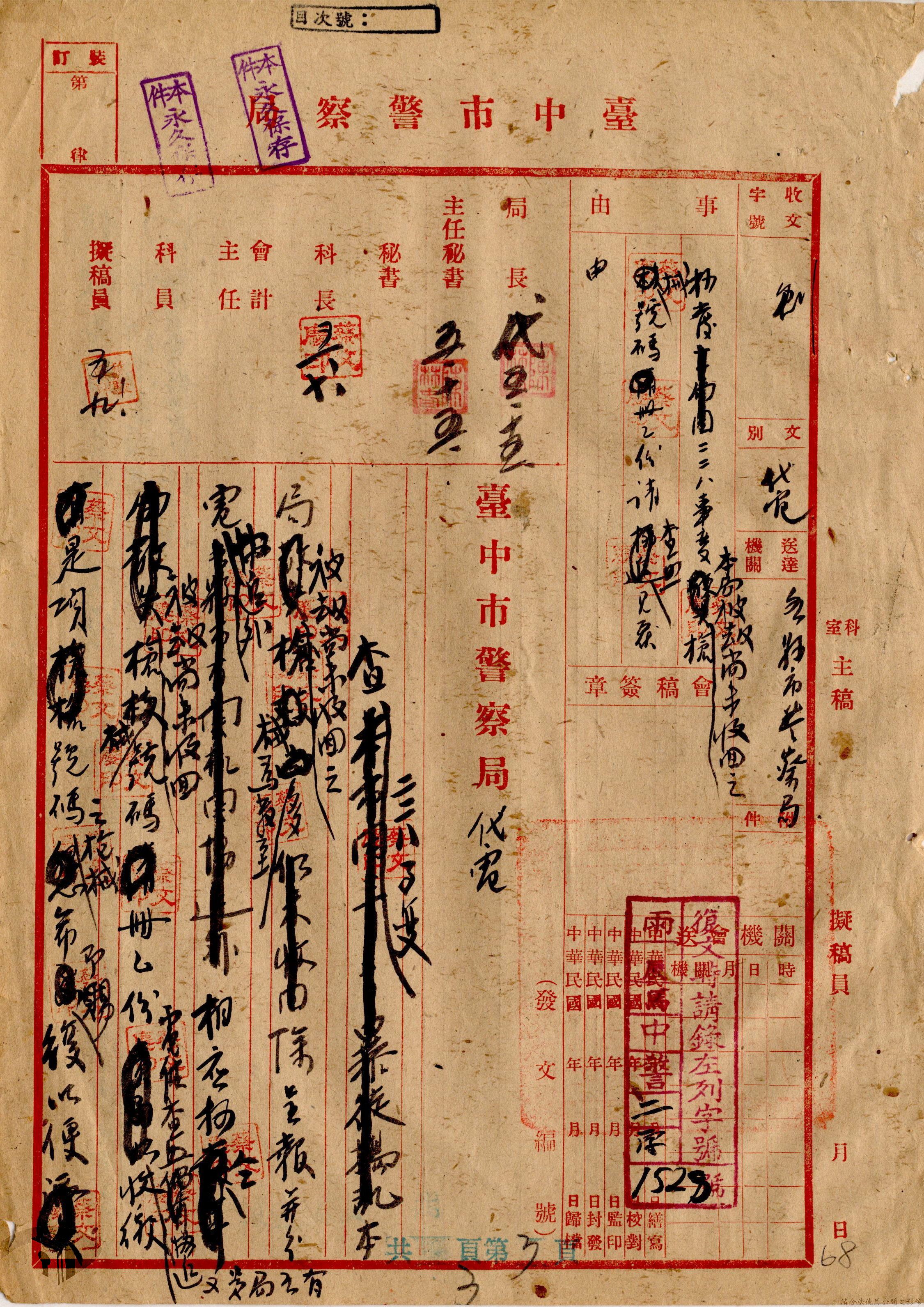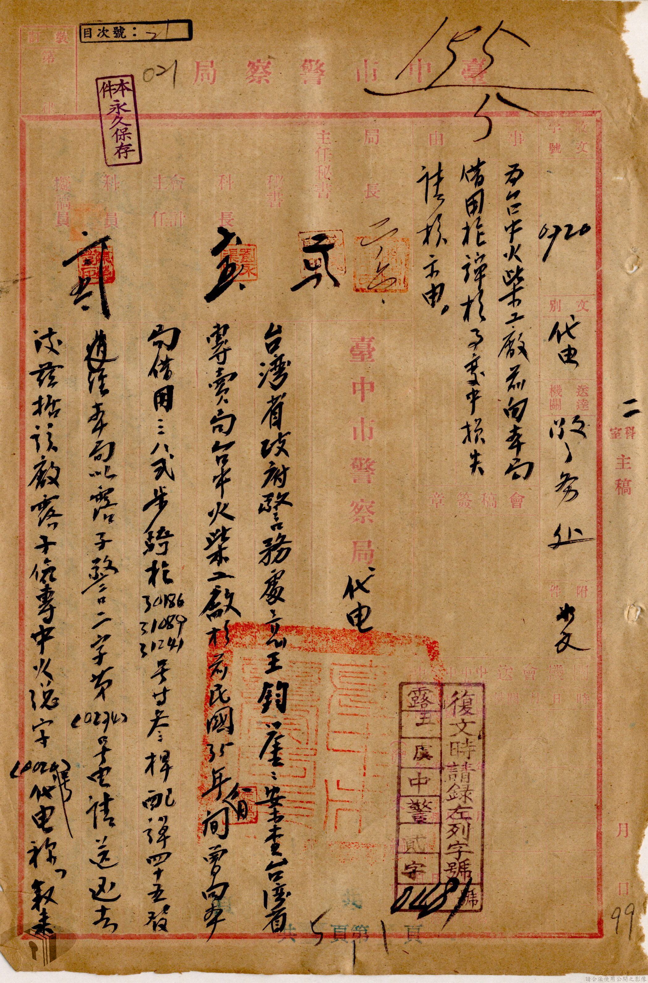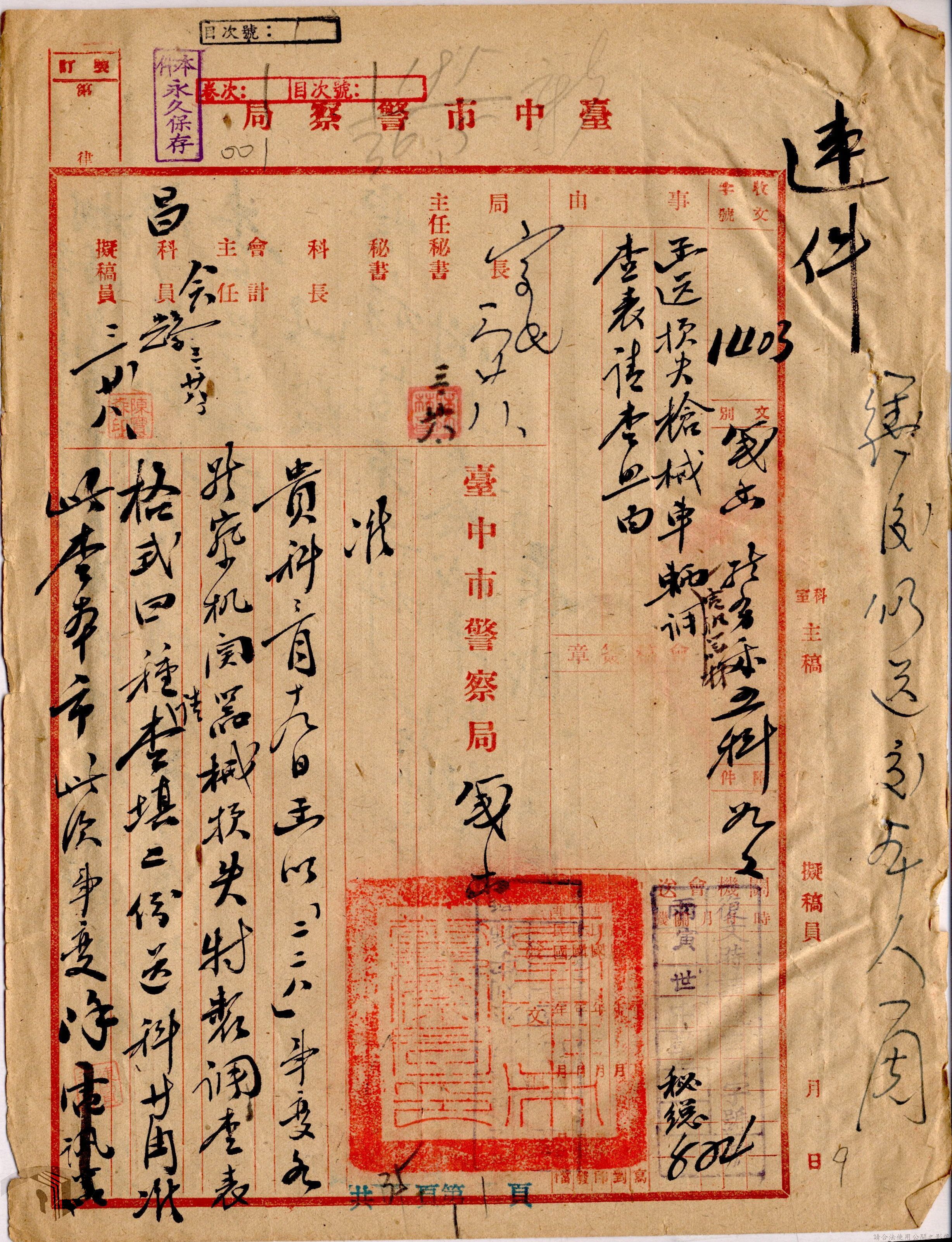 本案為36至37年間,臺中市政府警察局將各派出所二二八事件電訊器材、槍械、車輛損失調查表函送臺灣省行政長官公署警務處,並向臺灣省行政長官公署警務處及臺灣省警備司令部陳報有關追回二二八事件中借用槍械及各項公物損失情形。