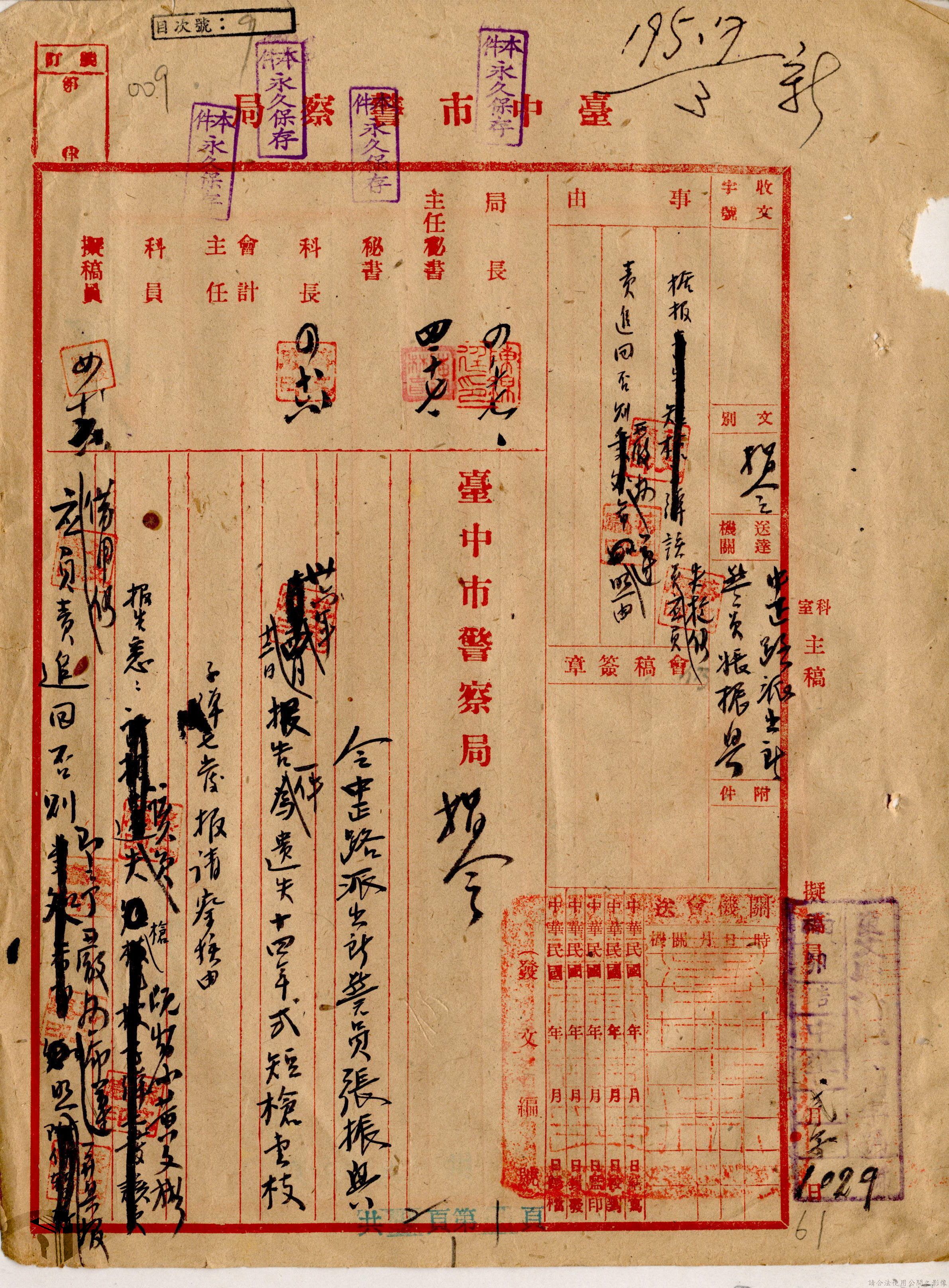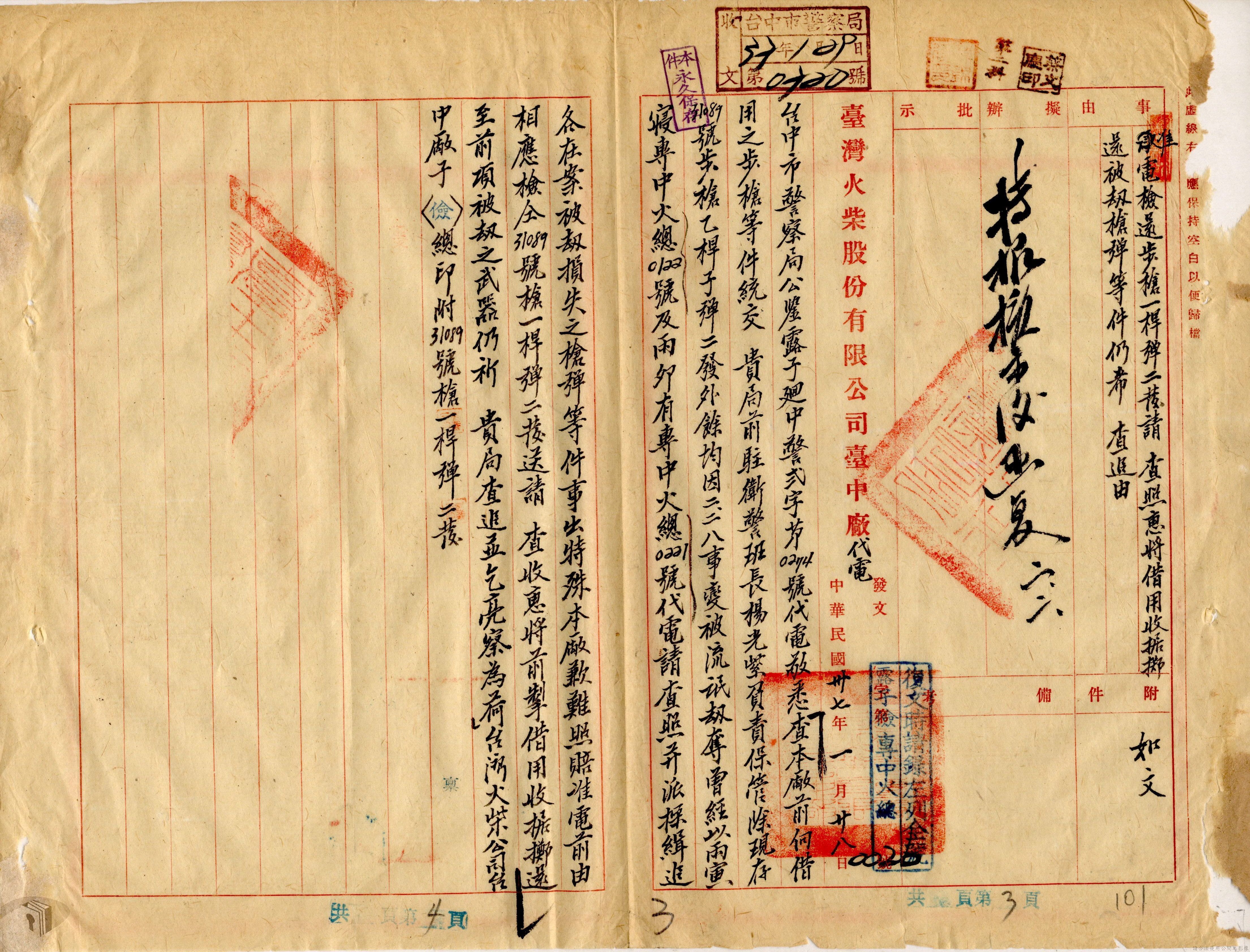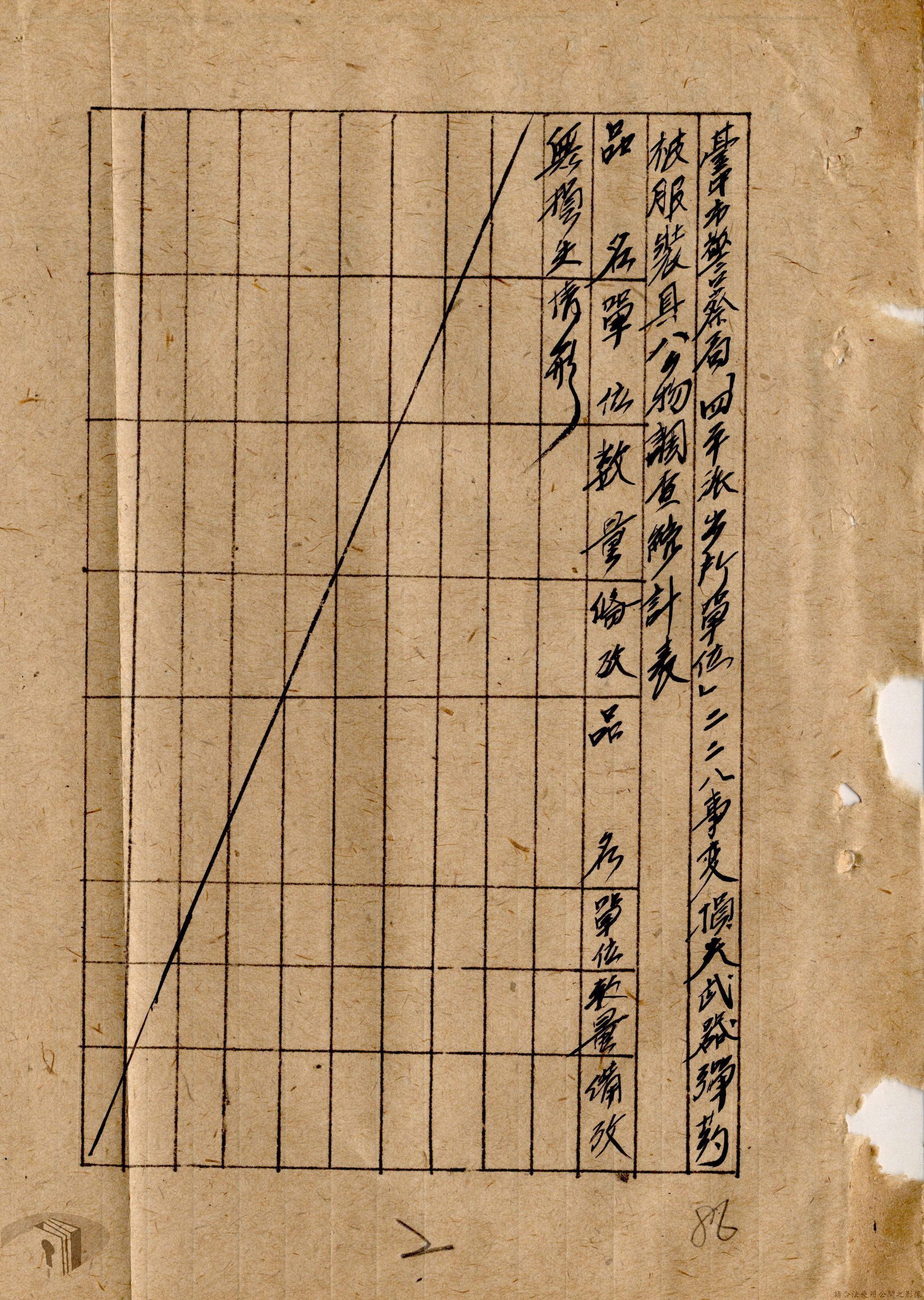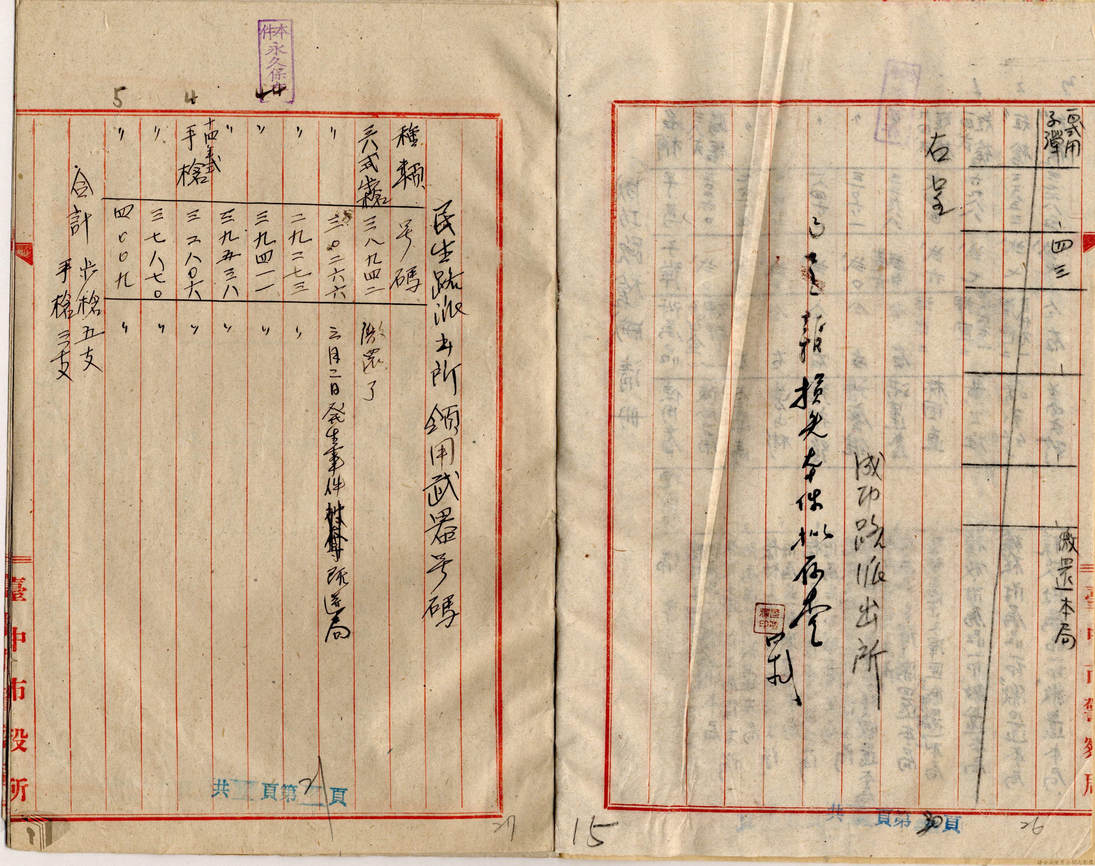本案為36至37年間,臺中市政府警察局將各派出所二二八事件電訊器材、槍械、車輛損失調查表函送臺灣省行政長官公署警務處,並向臺灣省行政長官公署警務處及臺灣省警備司令部陳報有關追回二二八事件中借用槍械及各項公物損失情形。