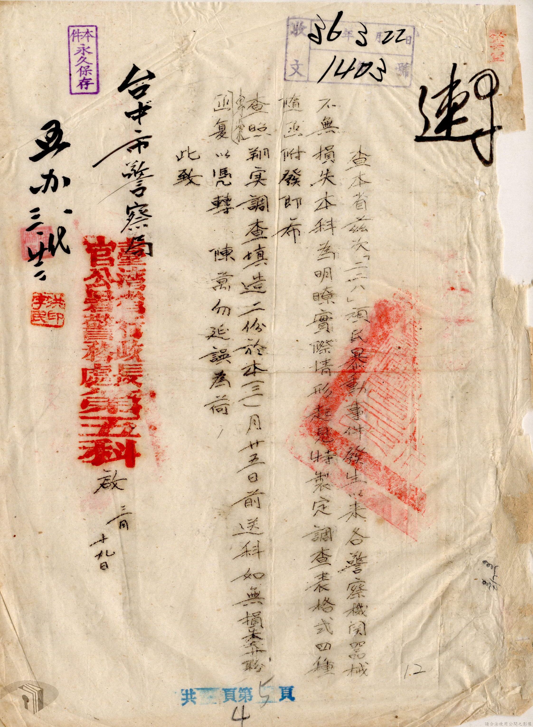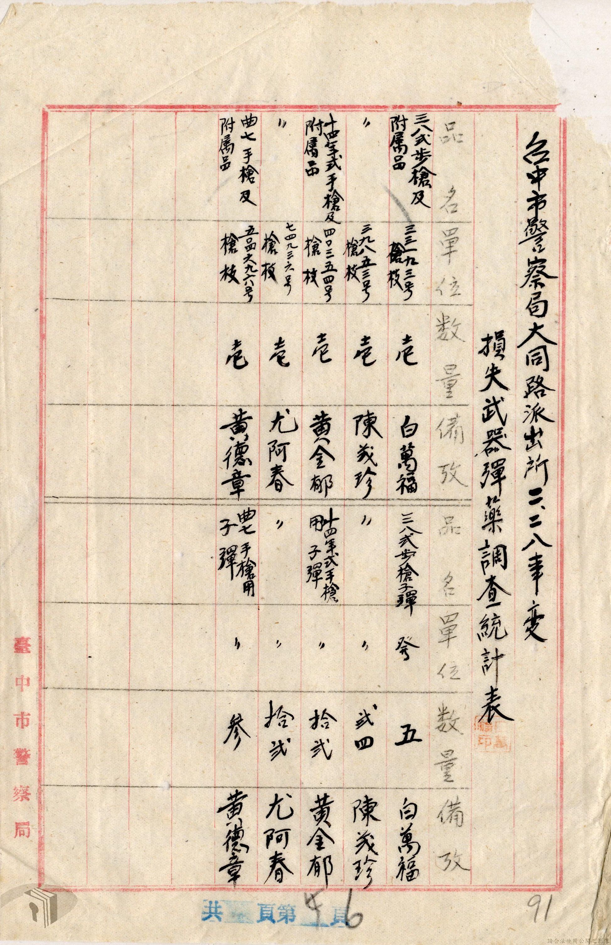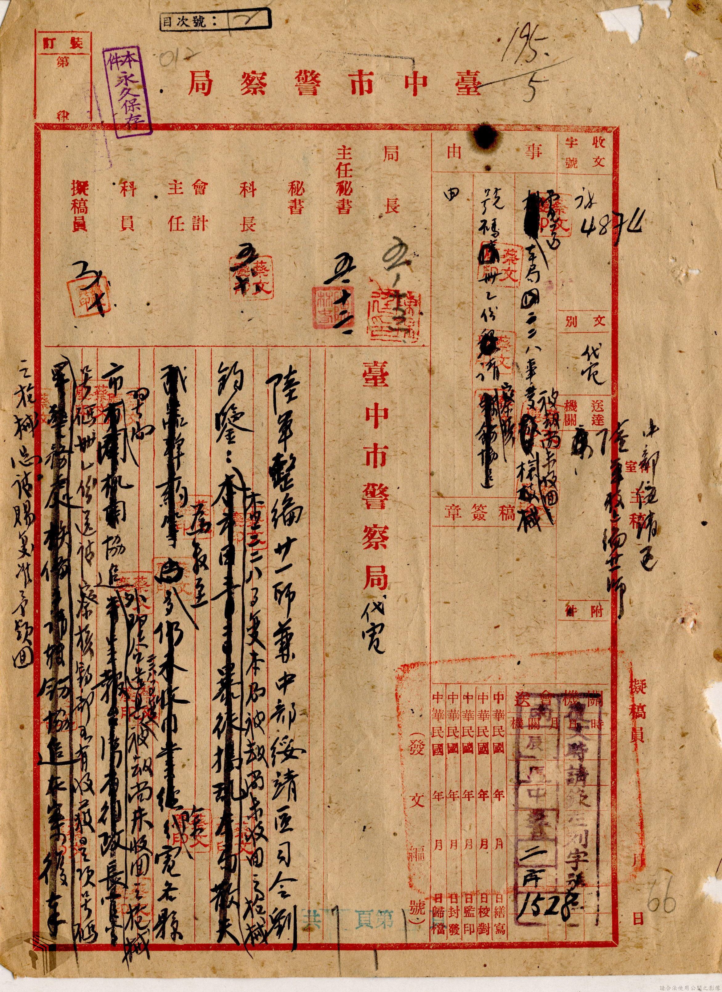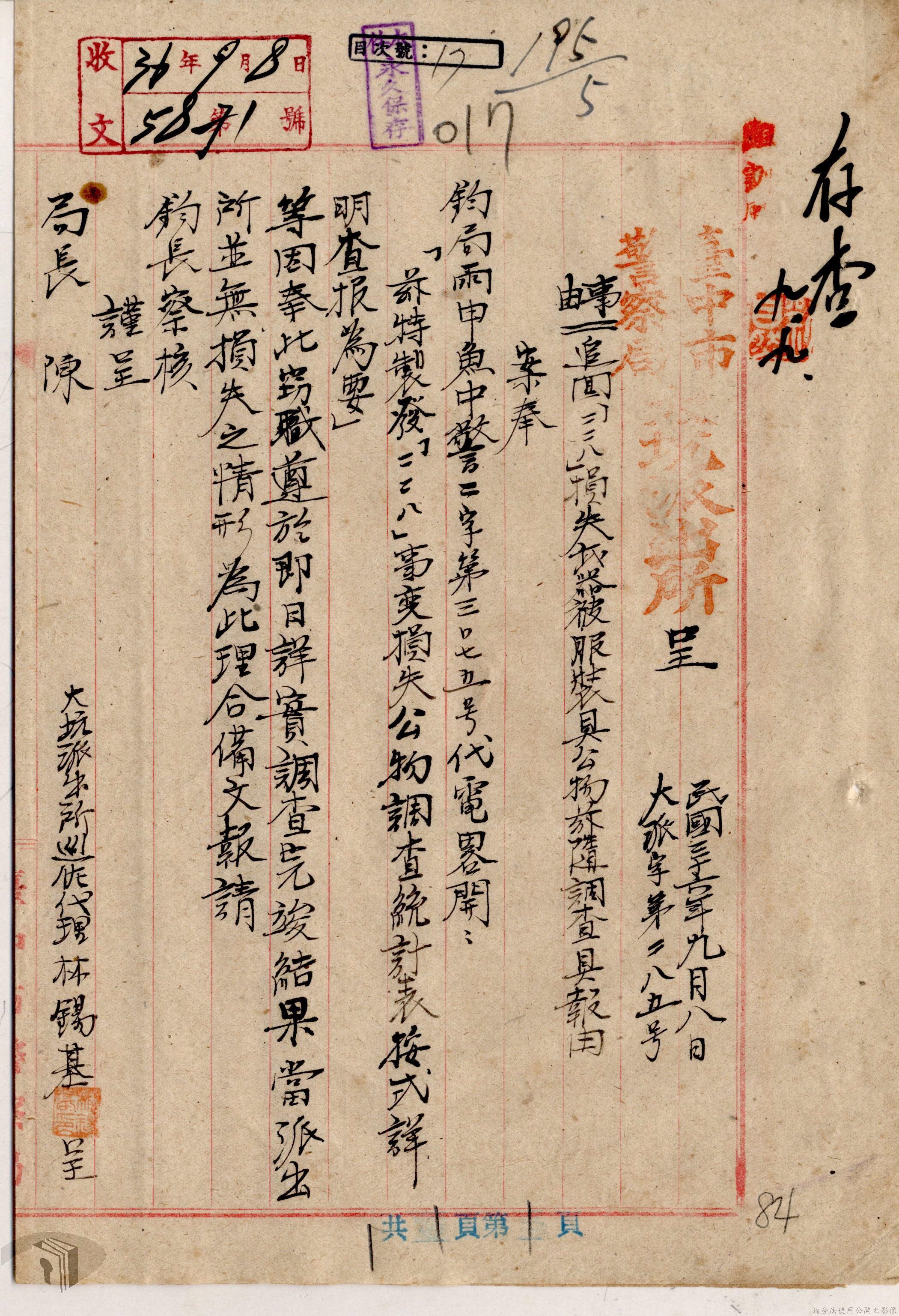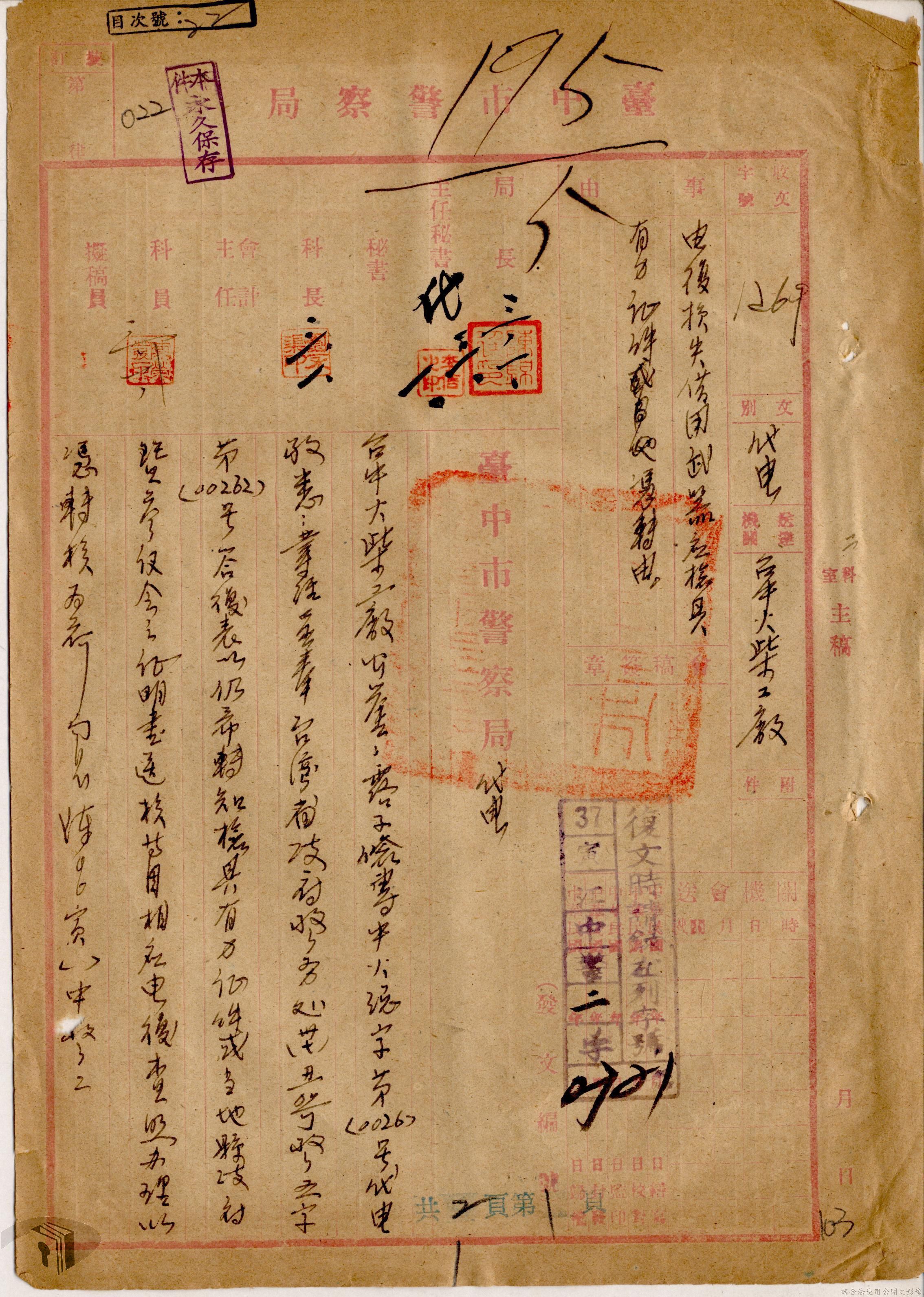 本案為36至37年間,臺中市政府警察局將各派出所二二八事件電訊器材、槍械、車輛損失調查表函送臺灣省行政長官公署警務處,並向臺灣省行政長官公署警務處及臺灣省警備司令部陳報有關追回二二八事件中借用槍械及各項公物損失情形。