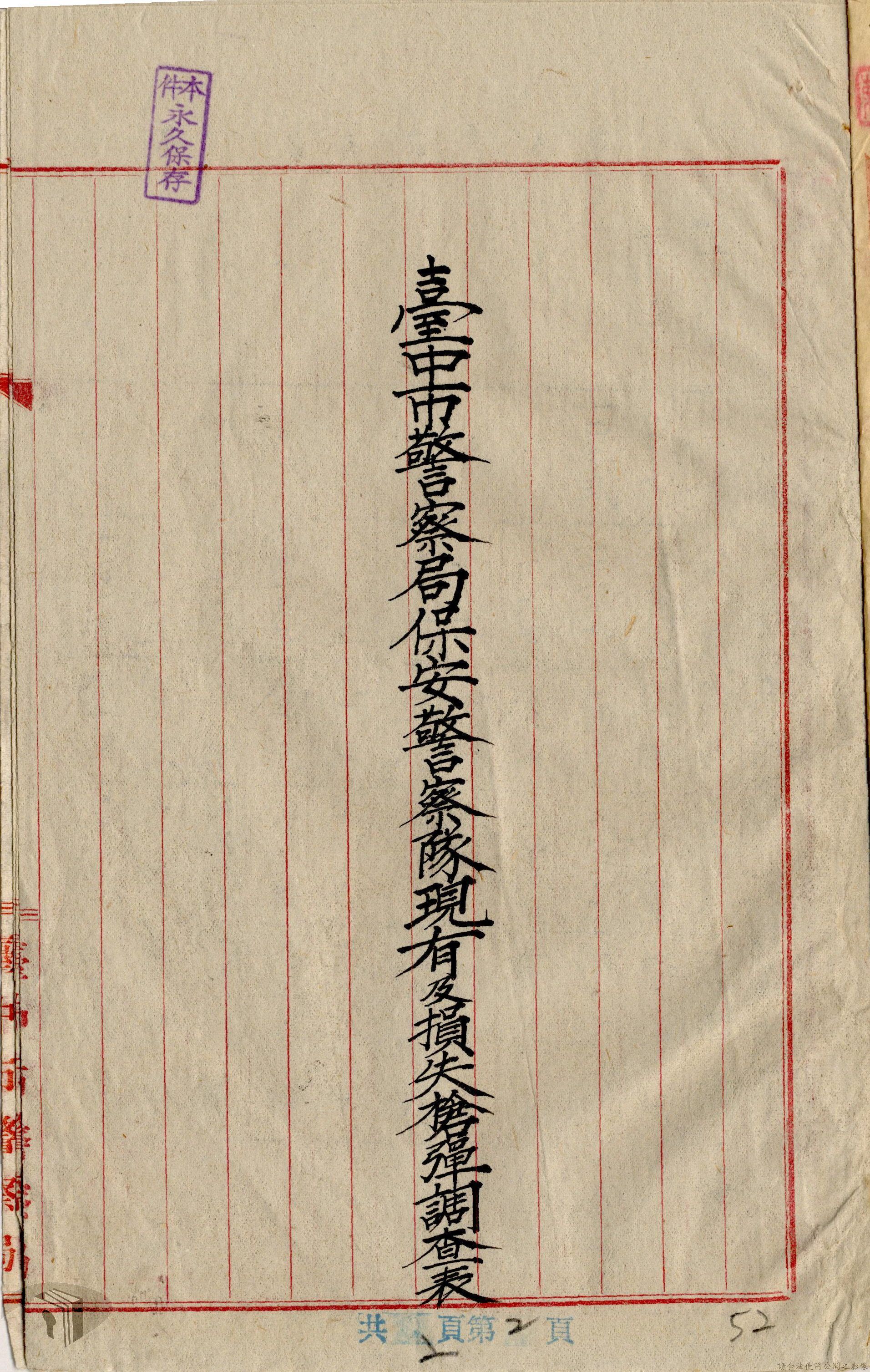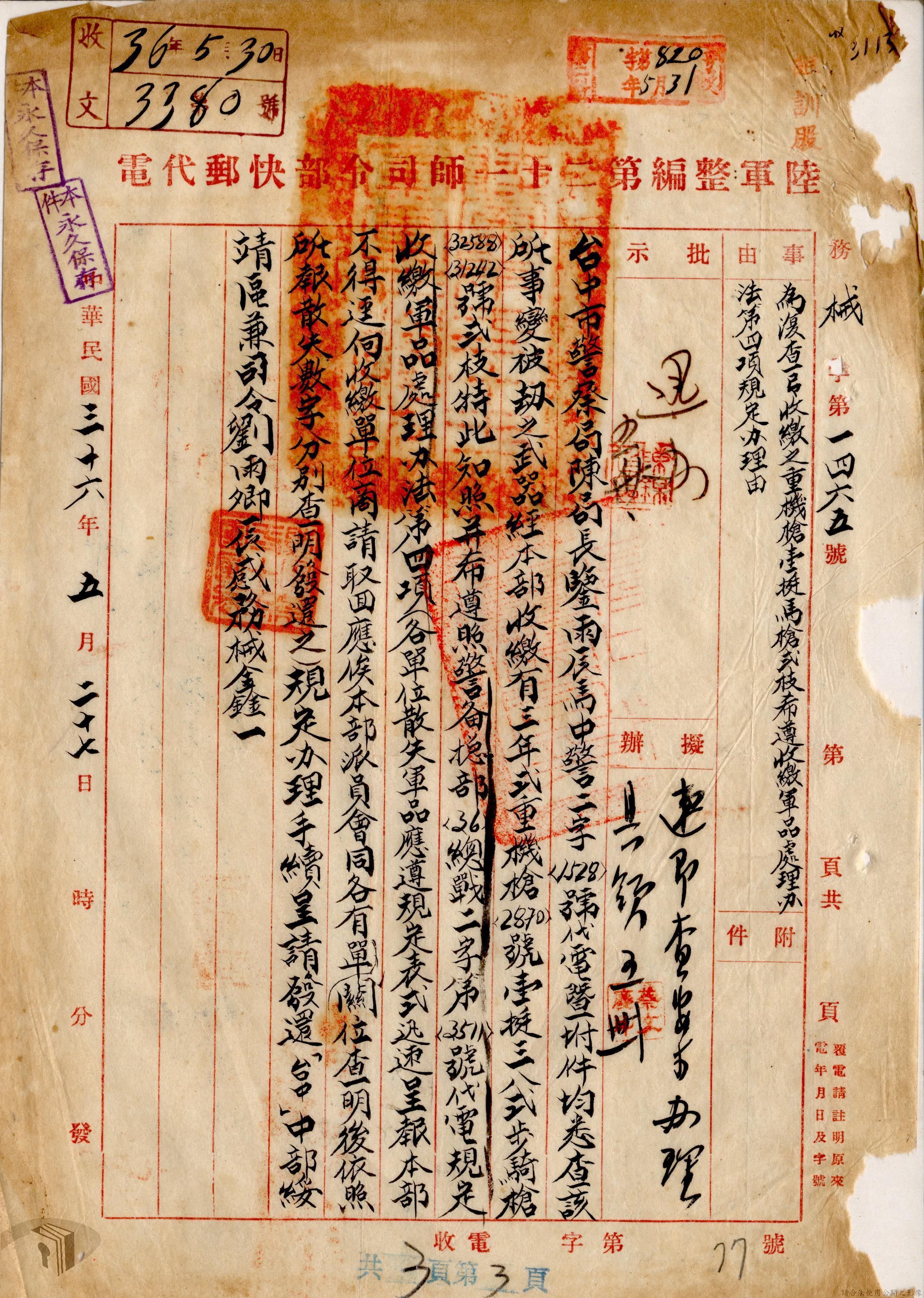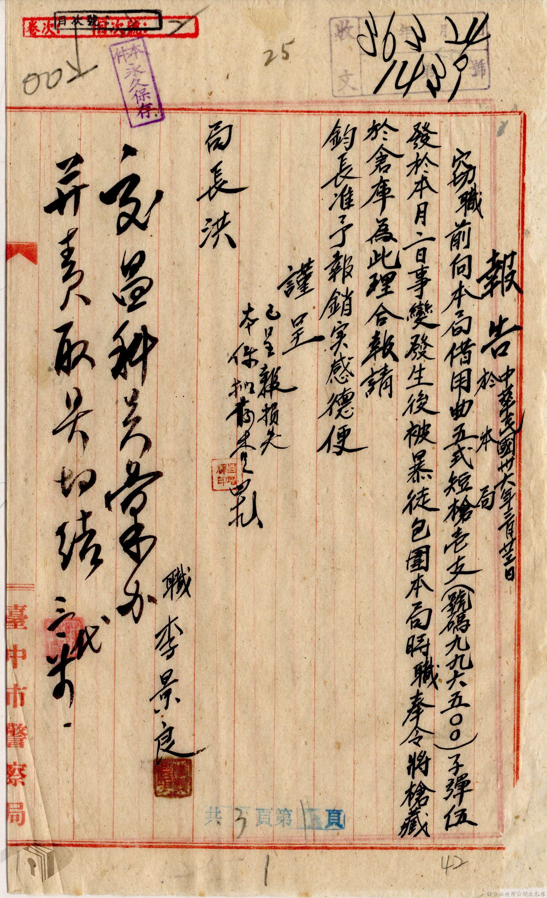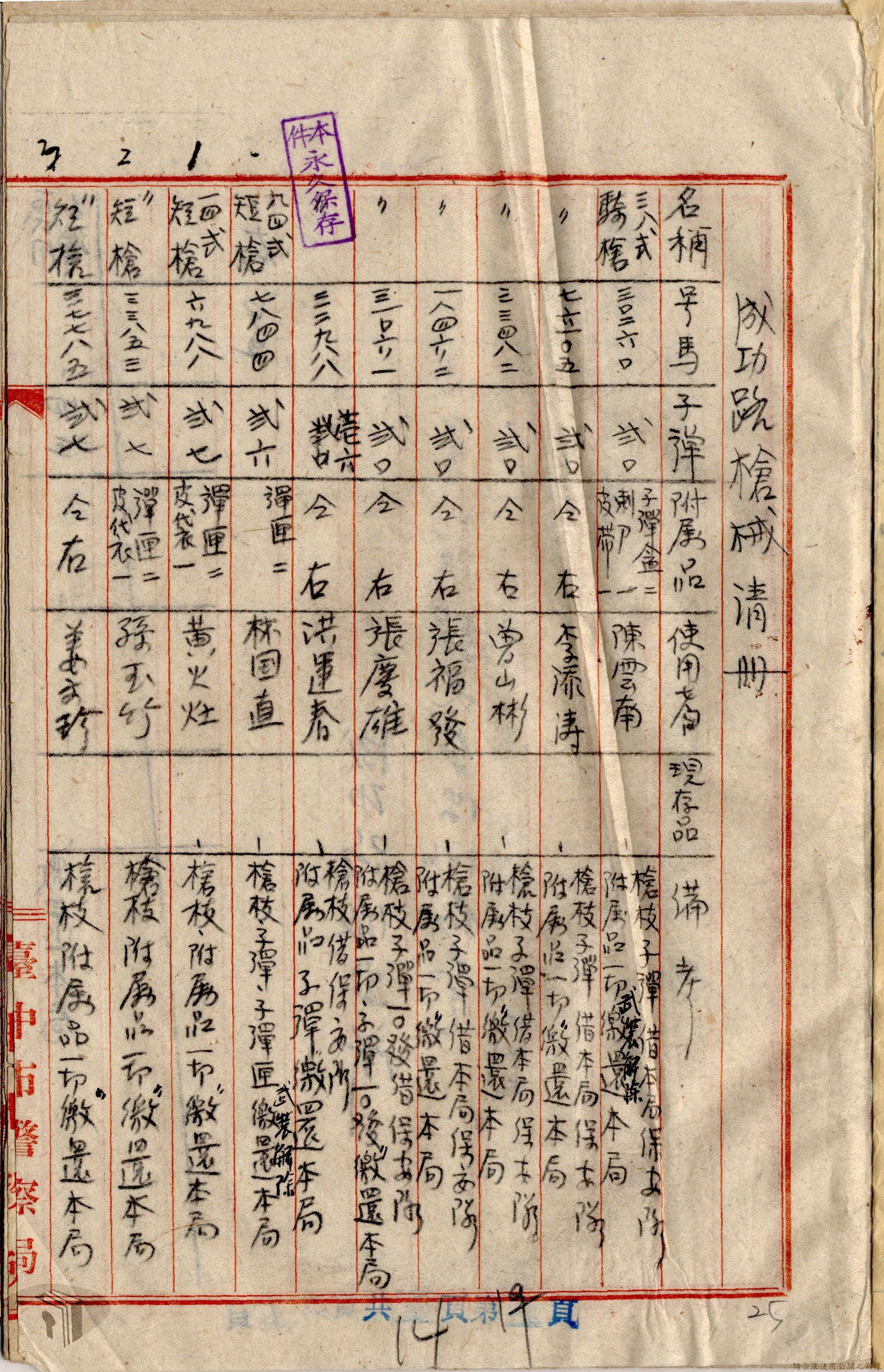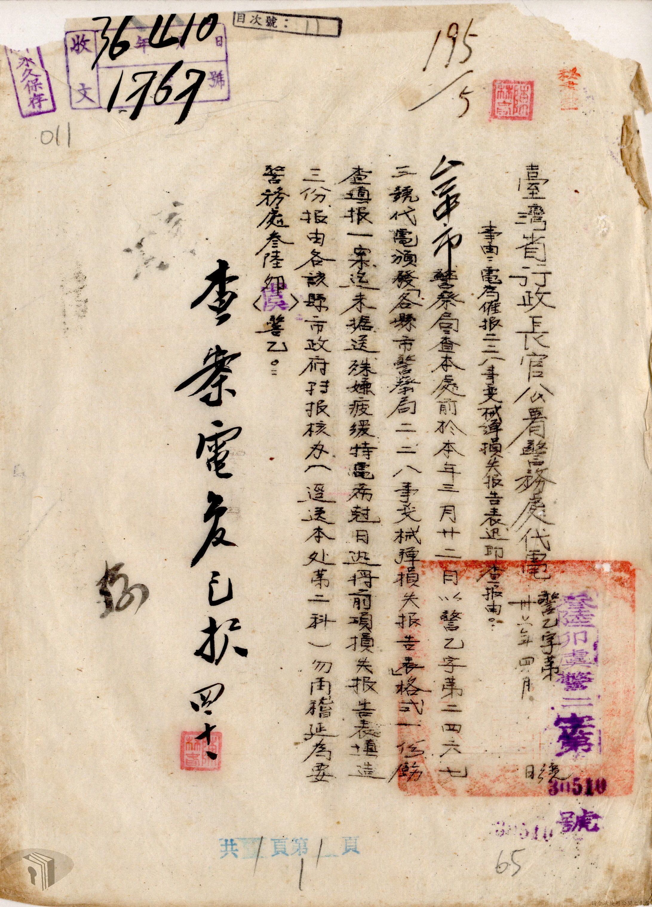 本案為36至37年間,臺中市政府警察局將各派出所二二八事件電訊器材、槍械、車輛損失調查表函送臺灣省行政長官公署警務處,並向臺灣省行政長官公署警務處及臺灣省警備司令部陳報有關追回二二八事件中借用槍械及各項公物損失情形。