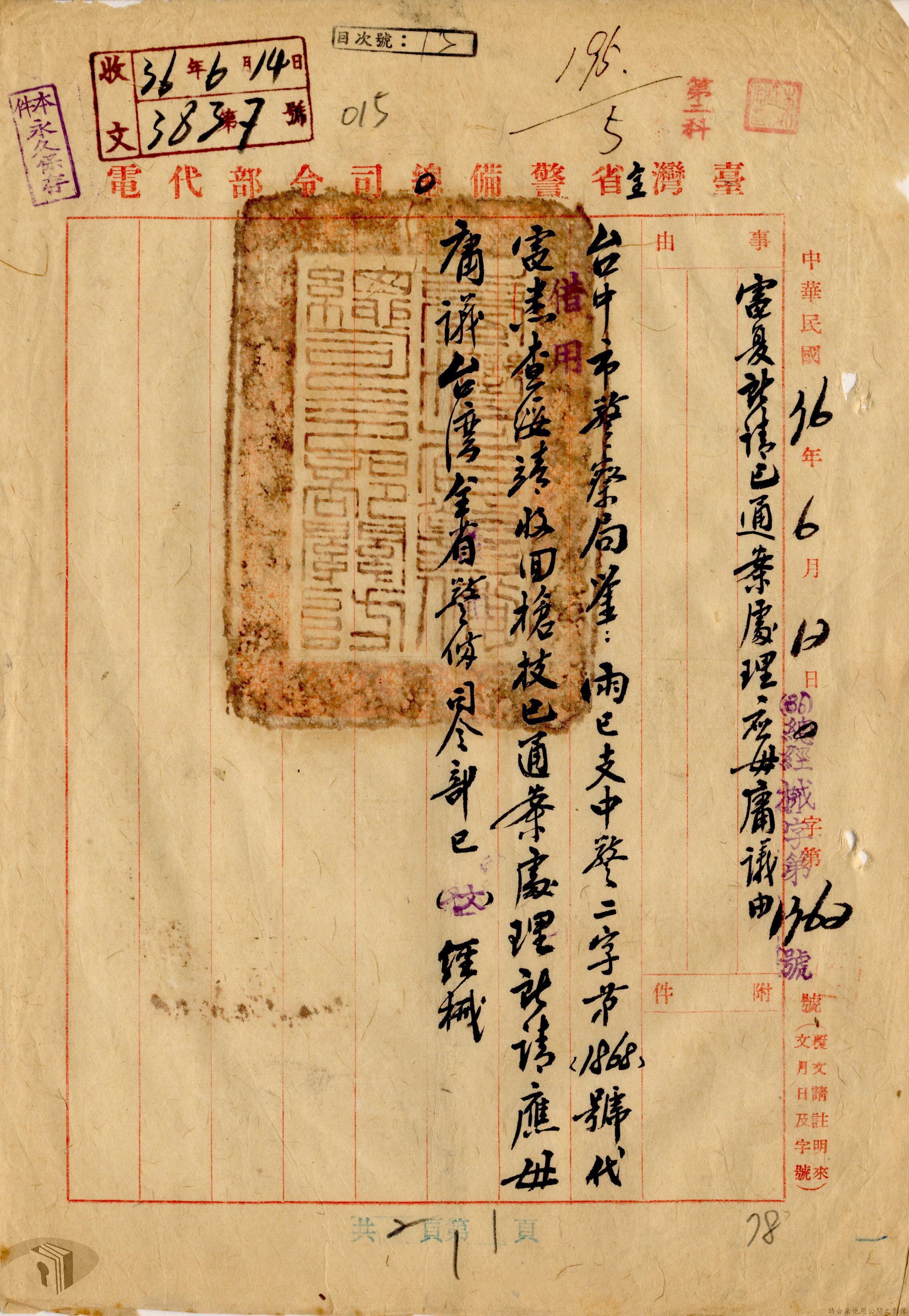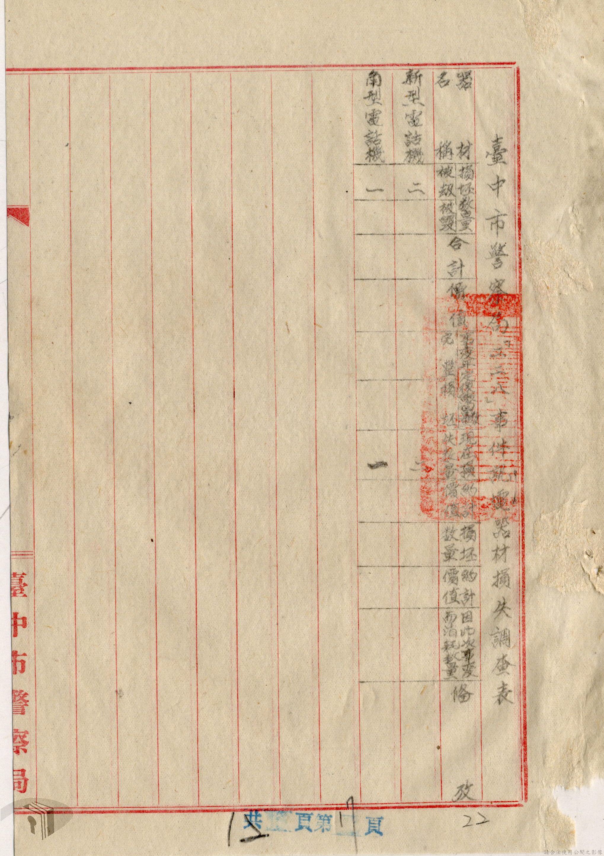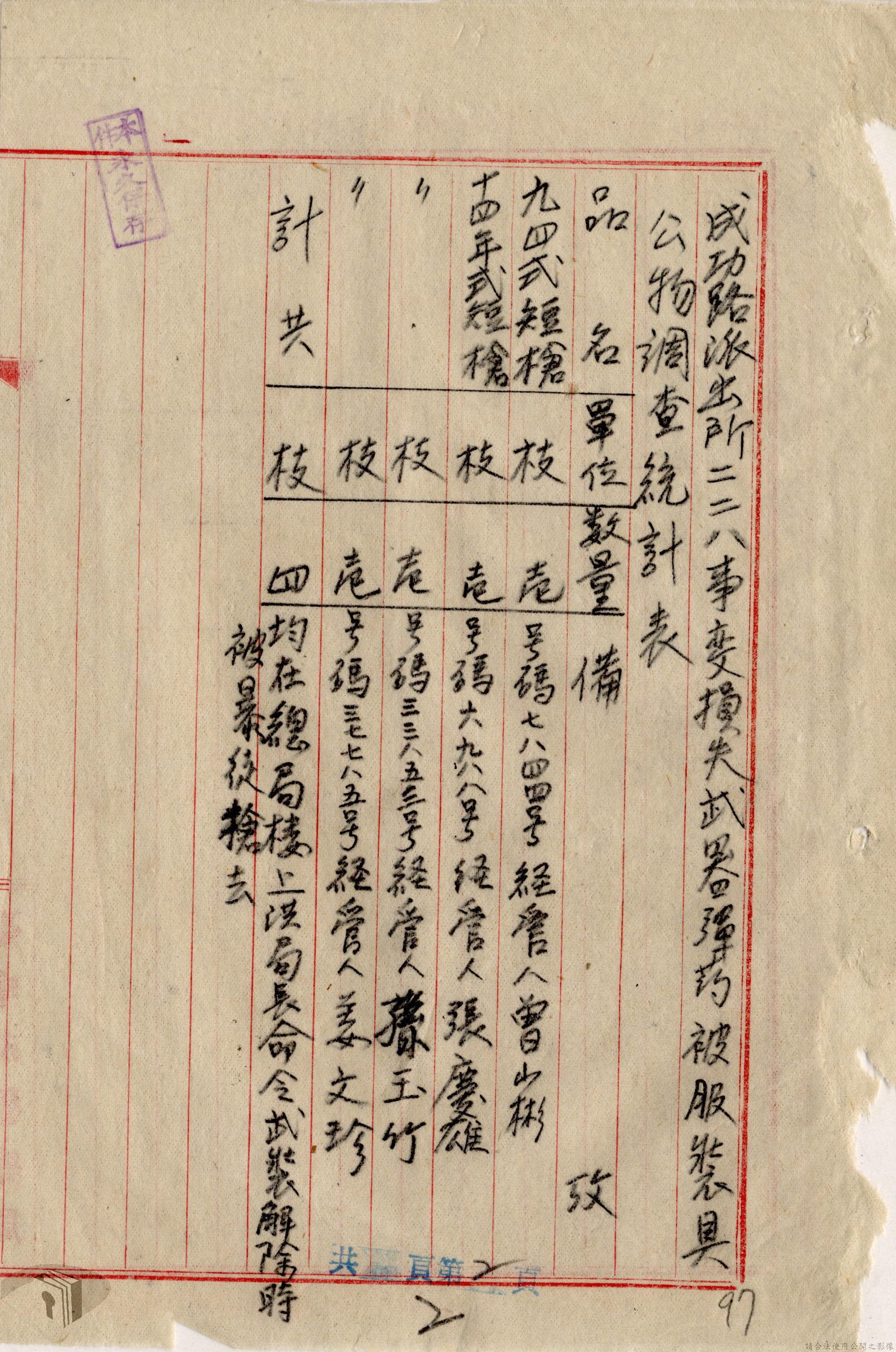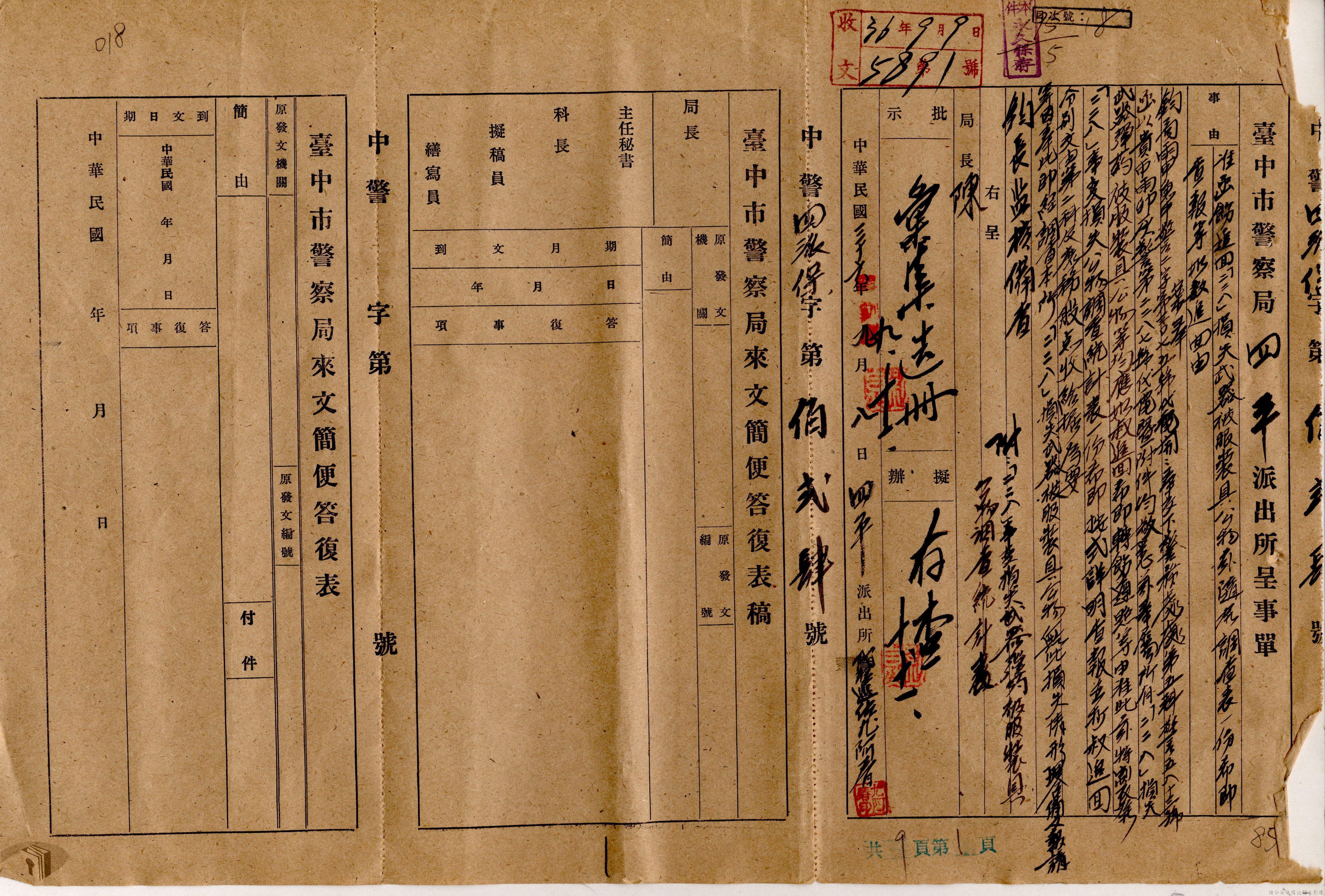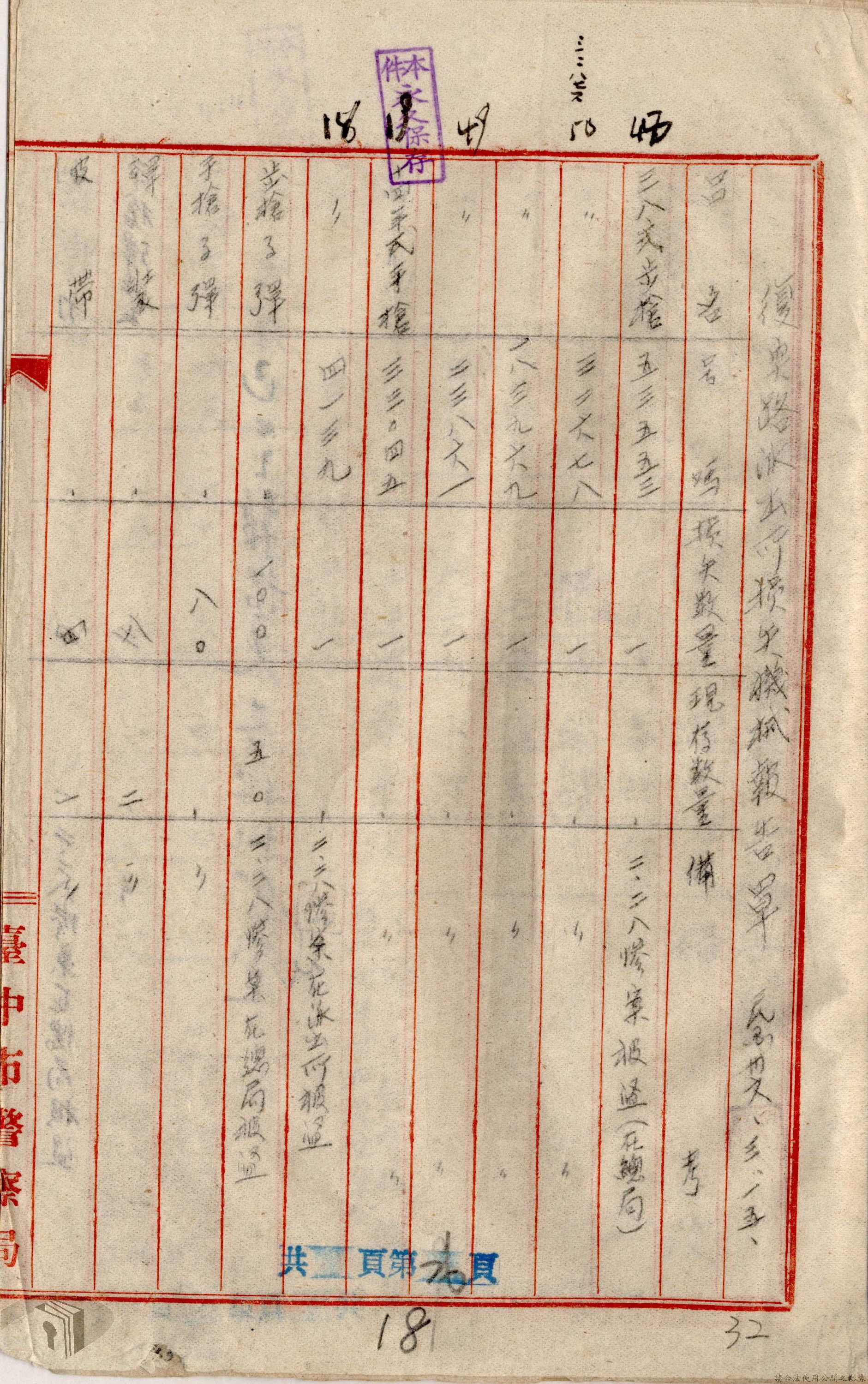 本案為36至37年間,臺中市政府警察局將各派出所二二八事件電訊器材、槍械、車輛損失調查表函送臺灣省行政長官公署警務處,並向臺灣省行政長官公署警務處及臺灣省警備司令部陳報有關追回二二八事件中借用槍械及各項公物損失情形。