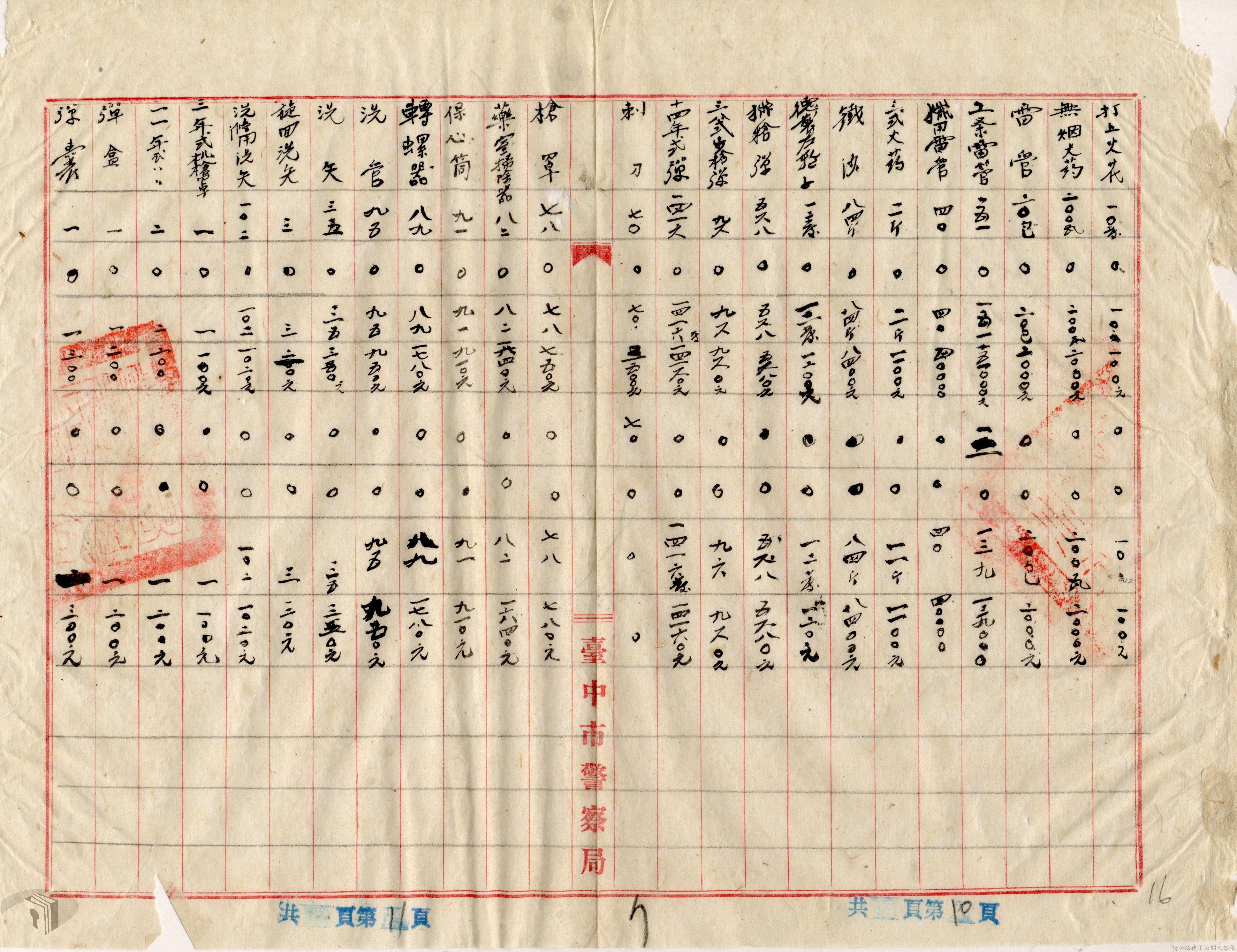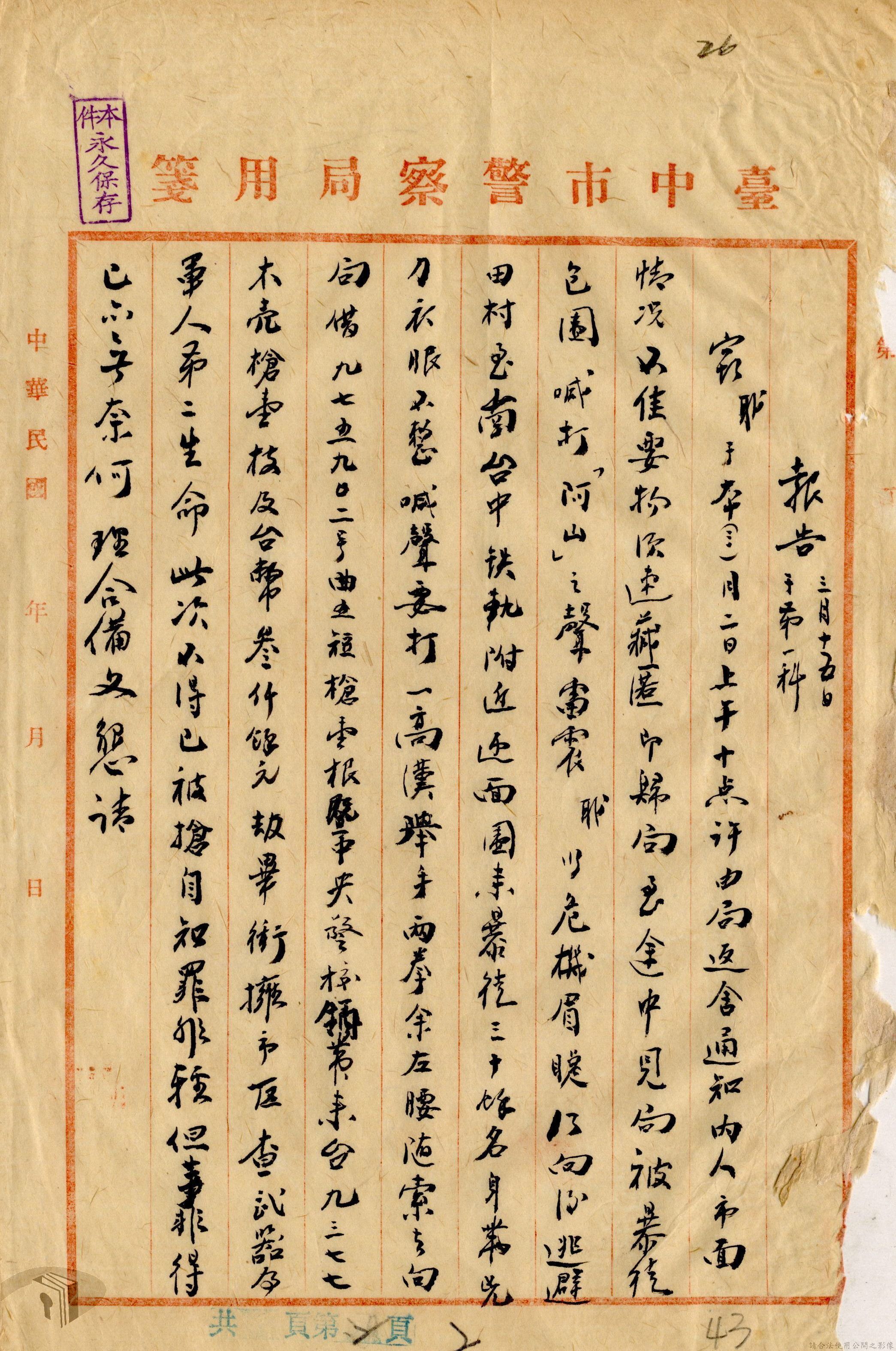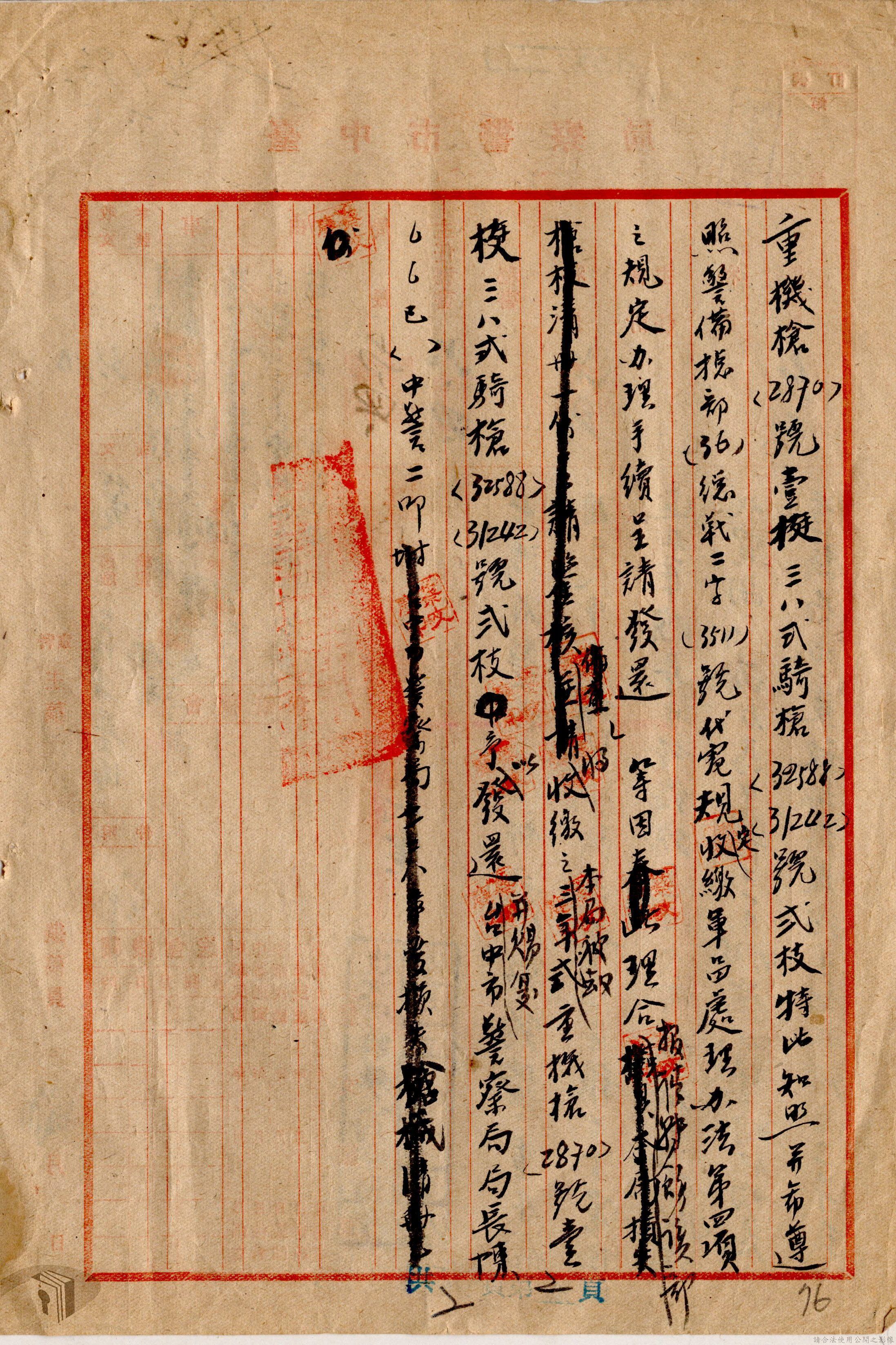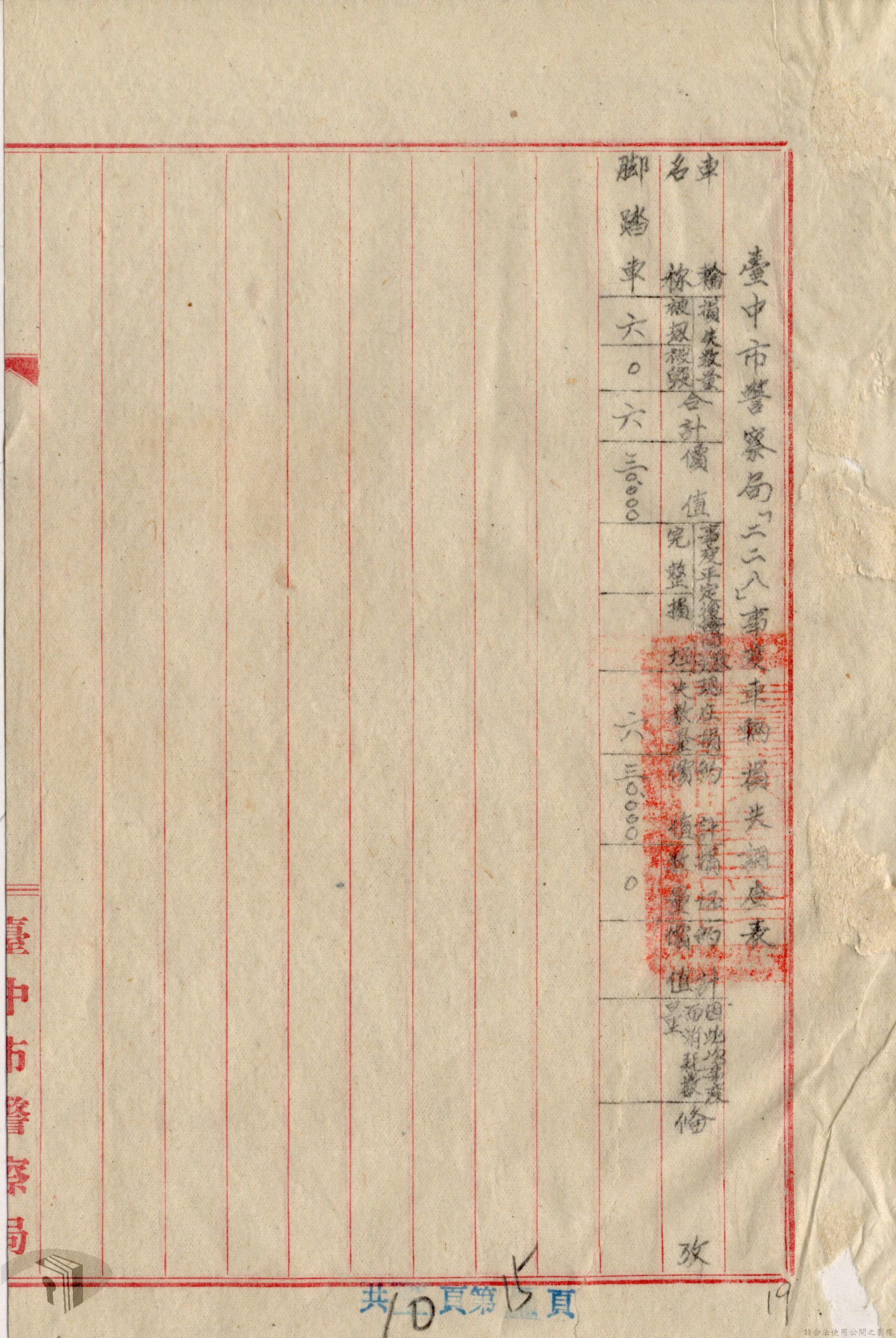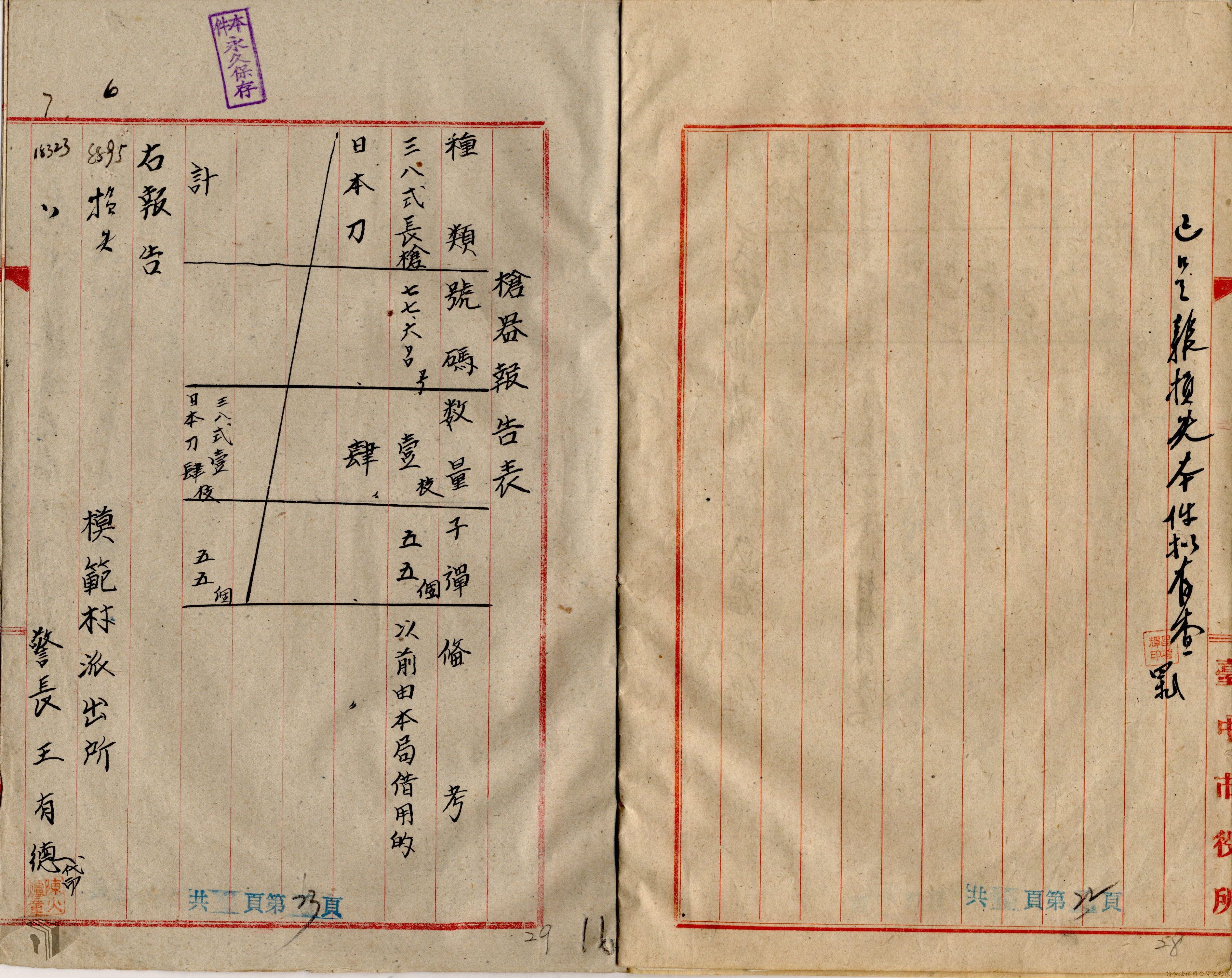 本案為36至37年間,臺中市政府警察局將各派出所二二八事件電訊器材、槍械、車輛損失調查表函送臺灣省行政長官公署警務處,並向臺灣省行政長官公署警務處及臺灣省警備司令部陳報有關追回二二八事件中借用槍械及各項公物損失情形。