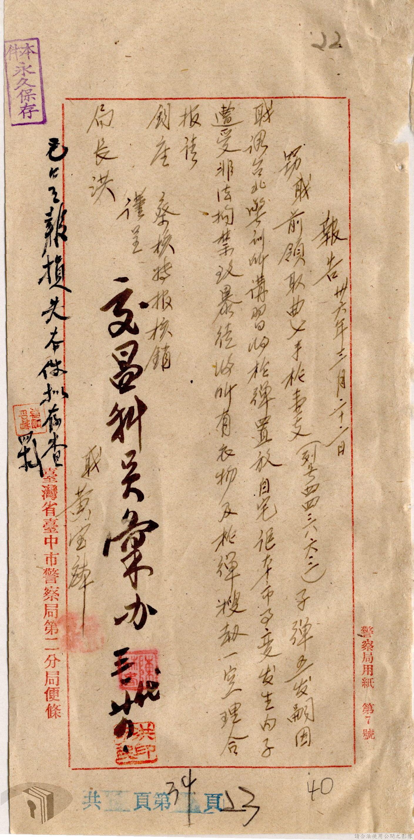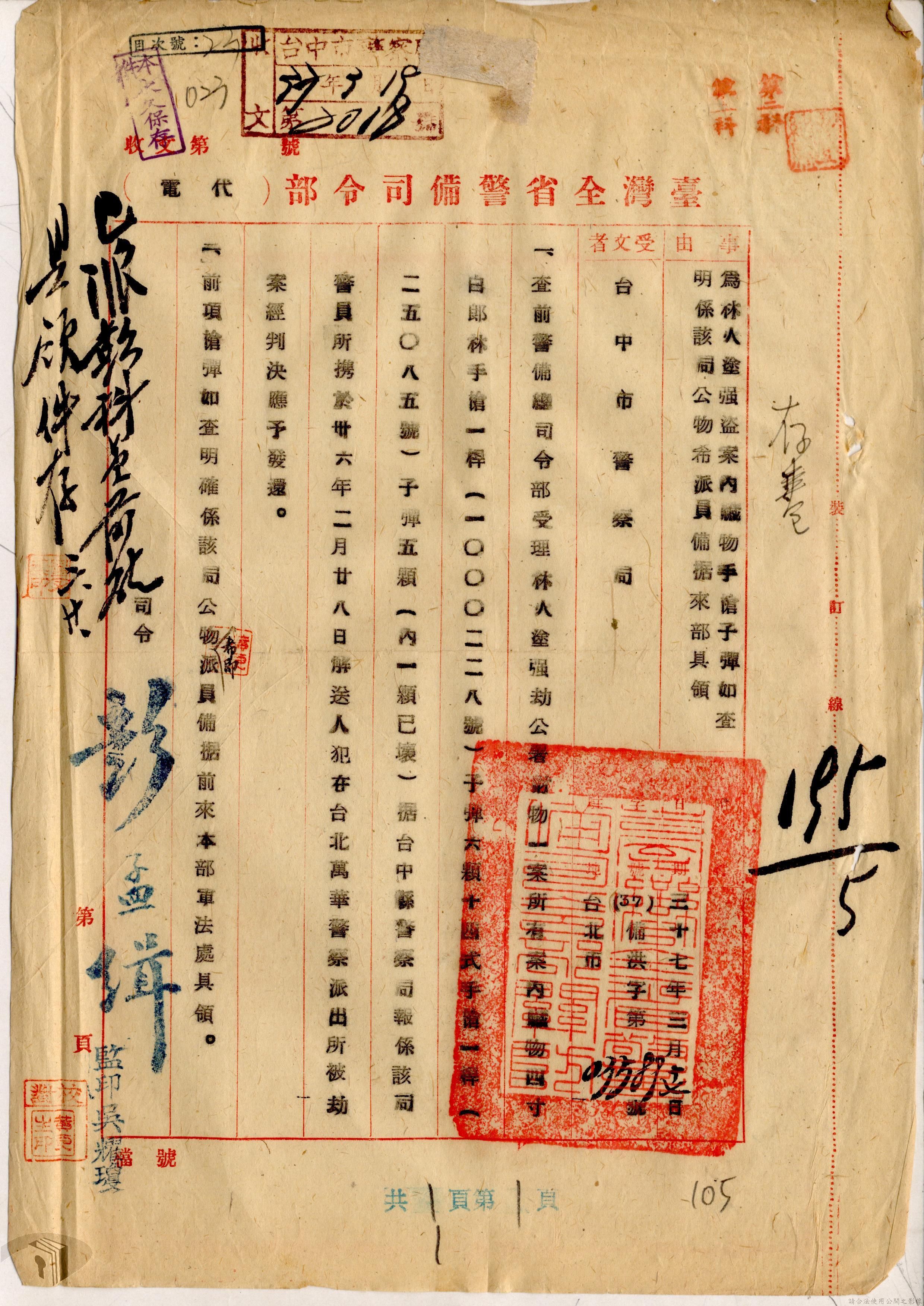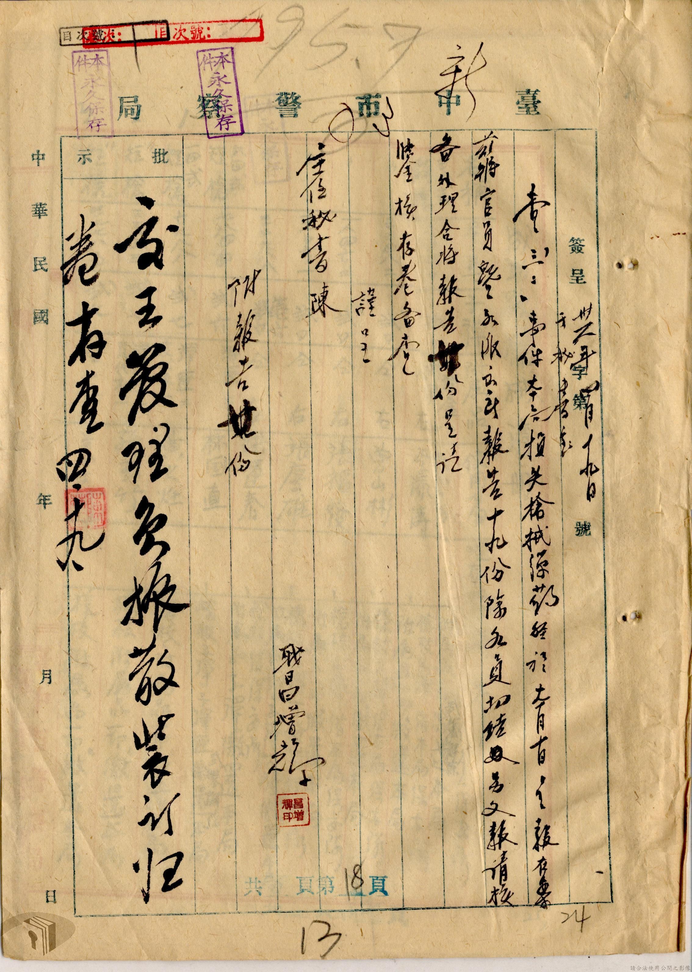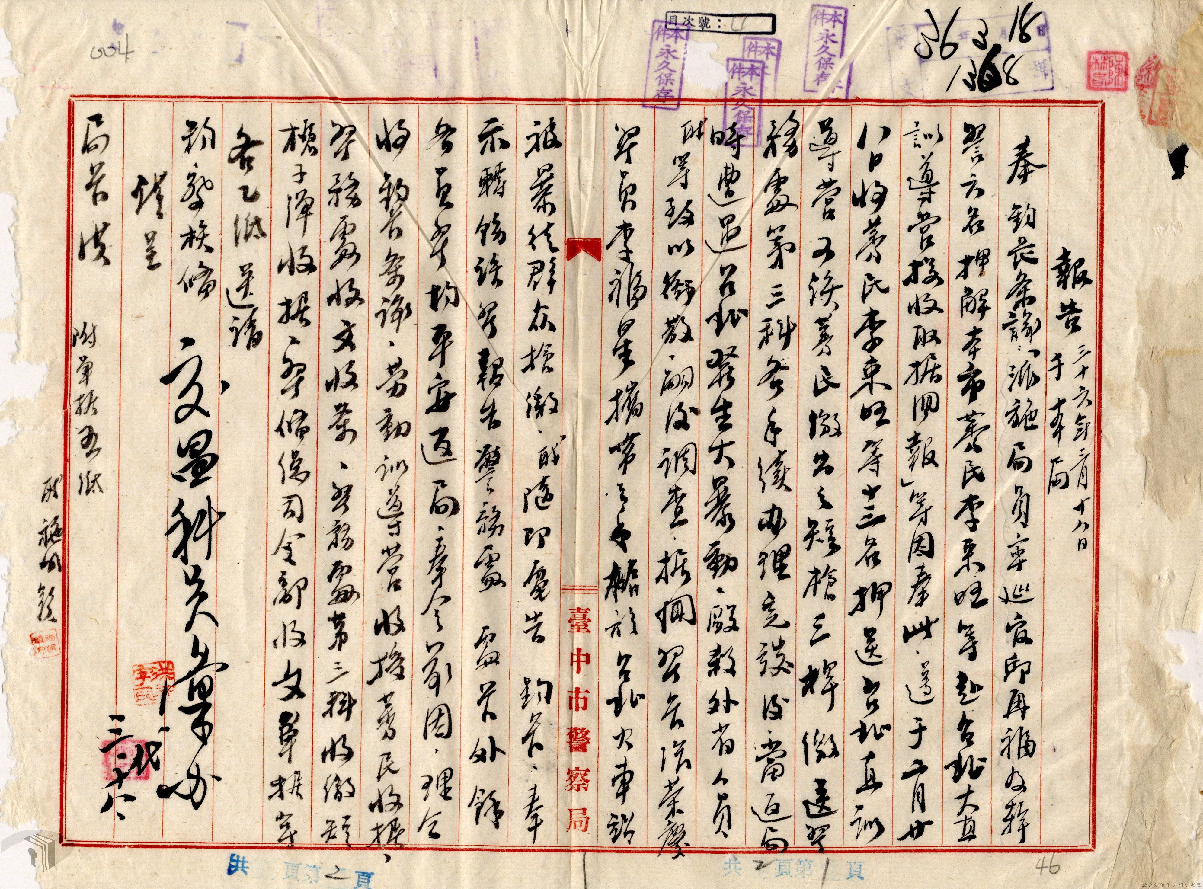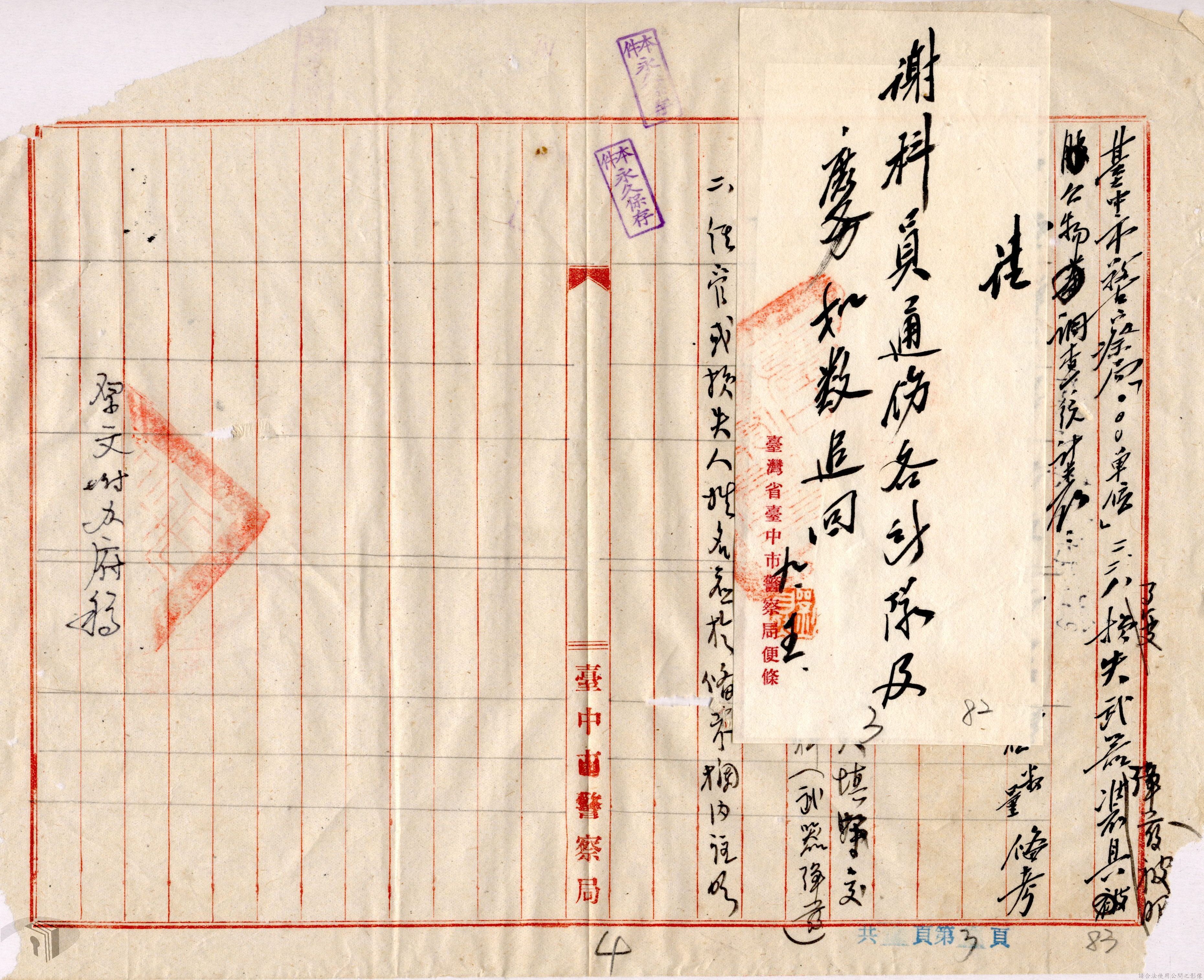 本案為36至37年間,臺中市政府警察局將各派出所二二八事件電訊器材、槍械、車輛損失調查表函送臺灣省行政長官公署警務處,並向臺灣省行政長官公署警務處及臺灣省警備司令部陳報有關追回二二八事件中借用槍械及各項公物損失情形。