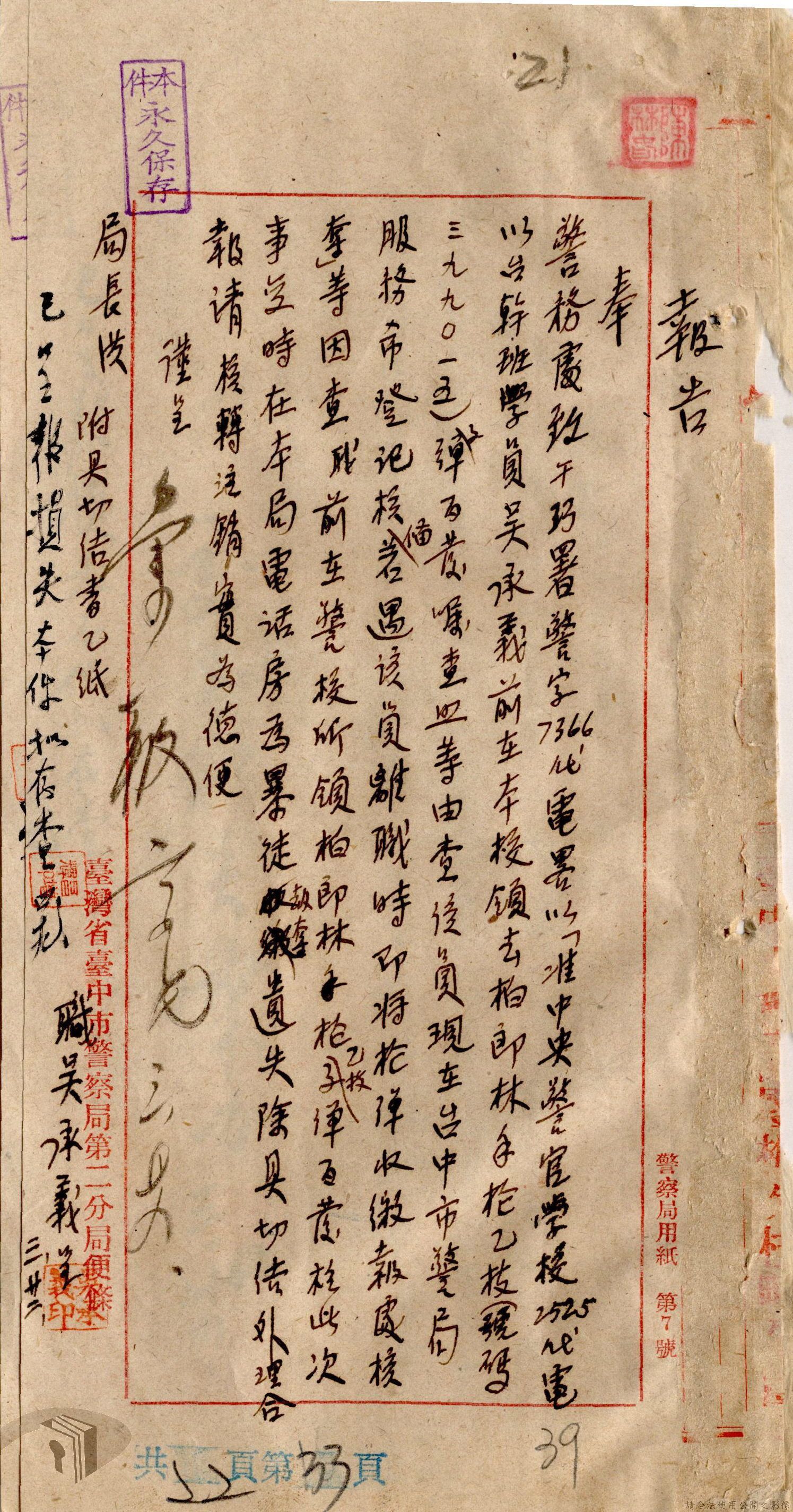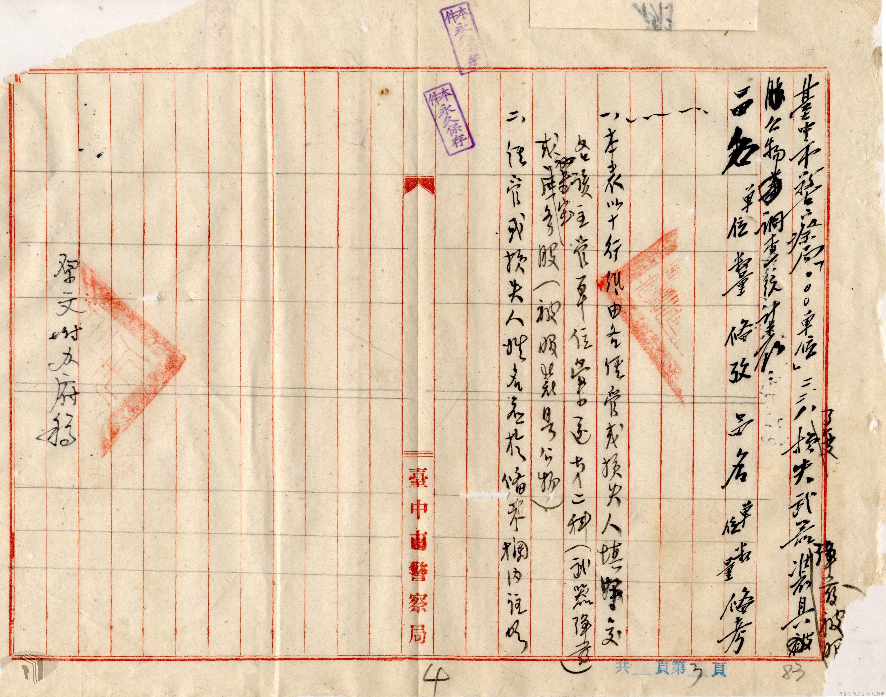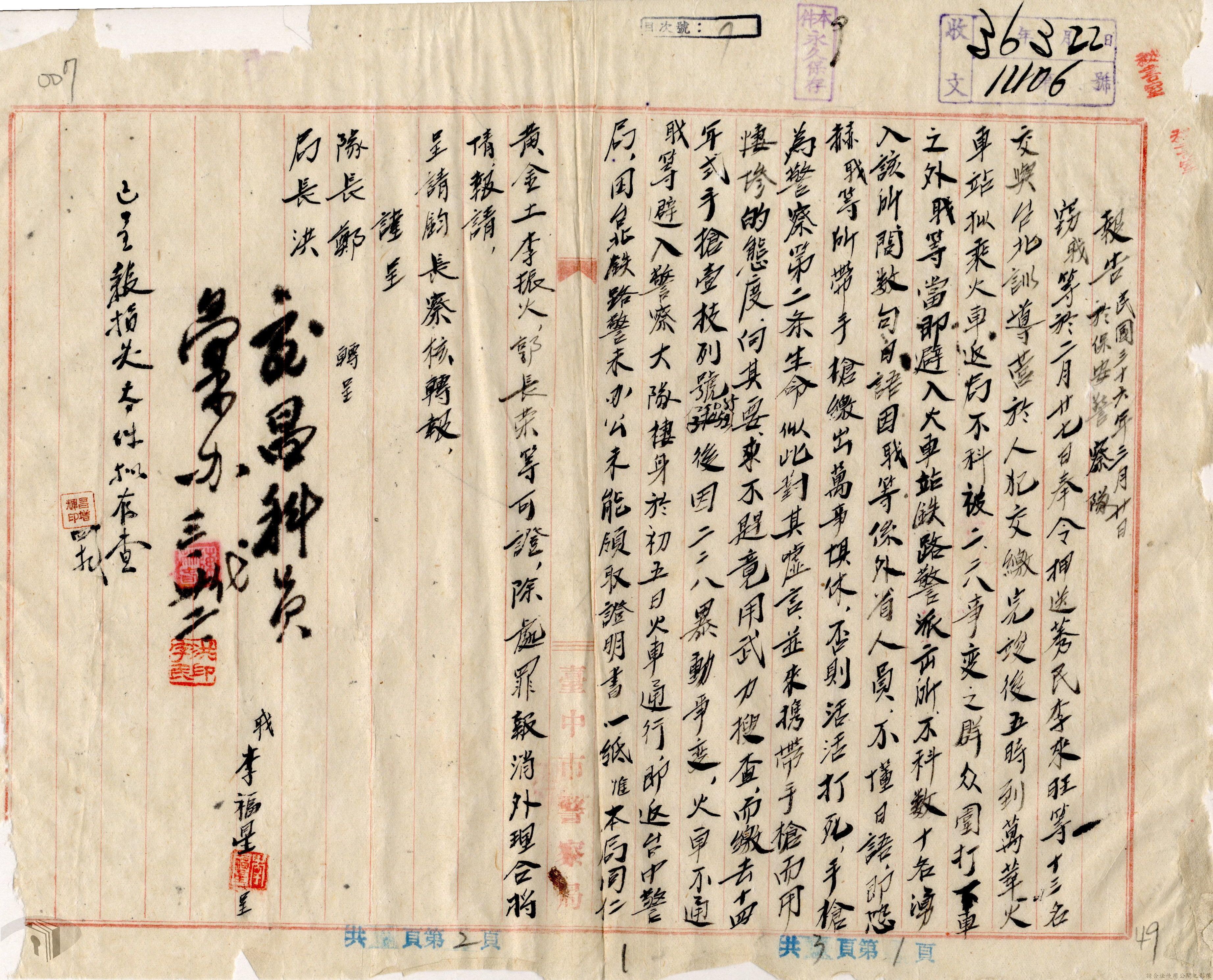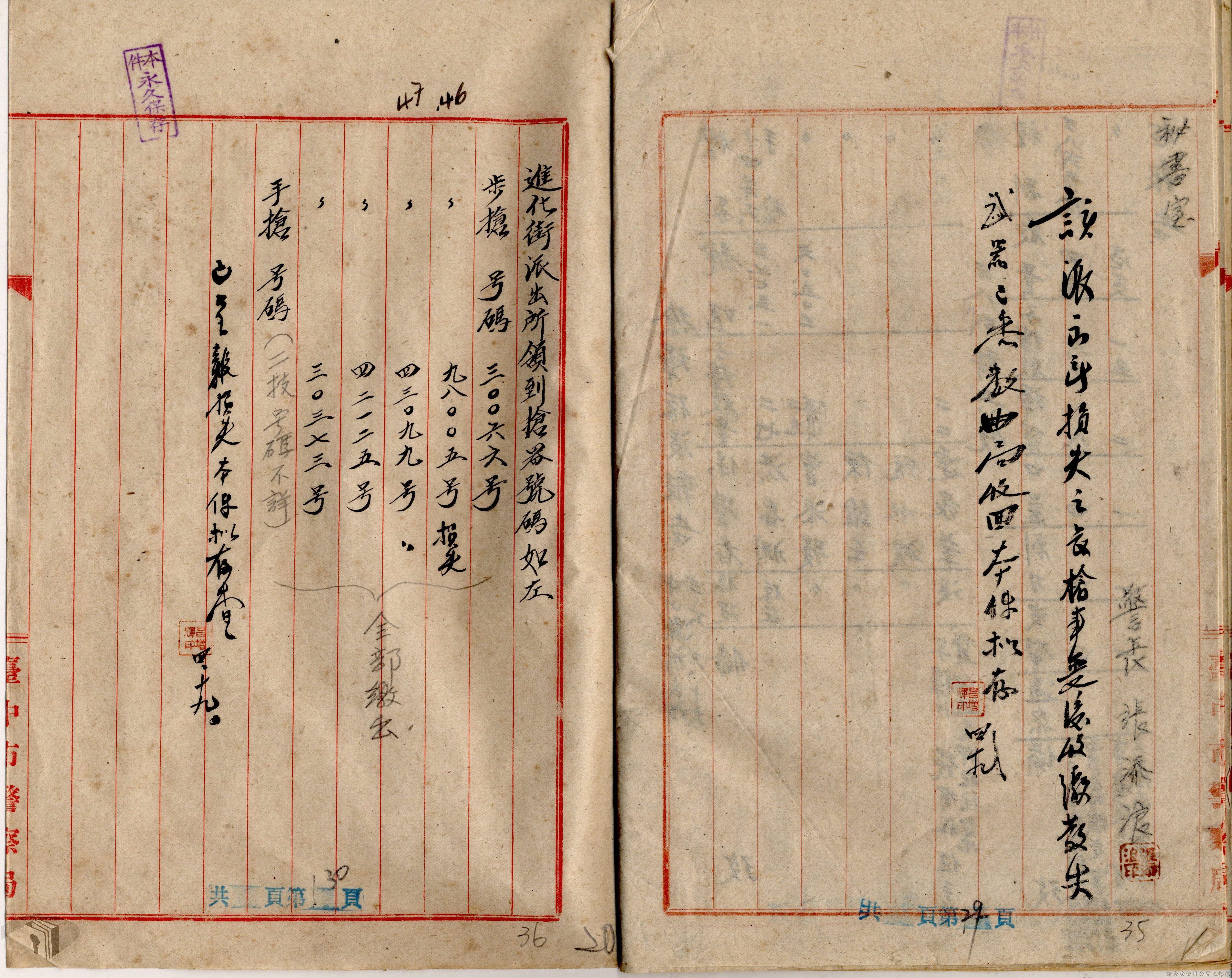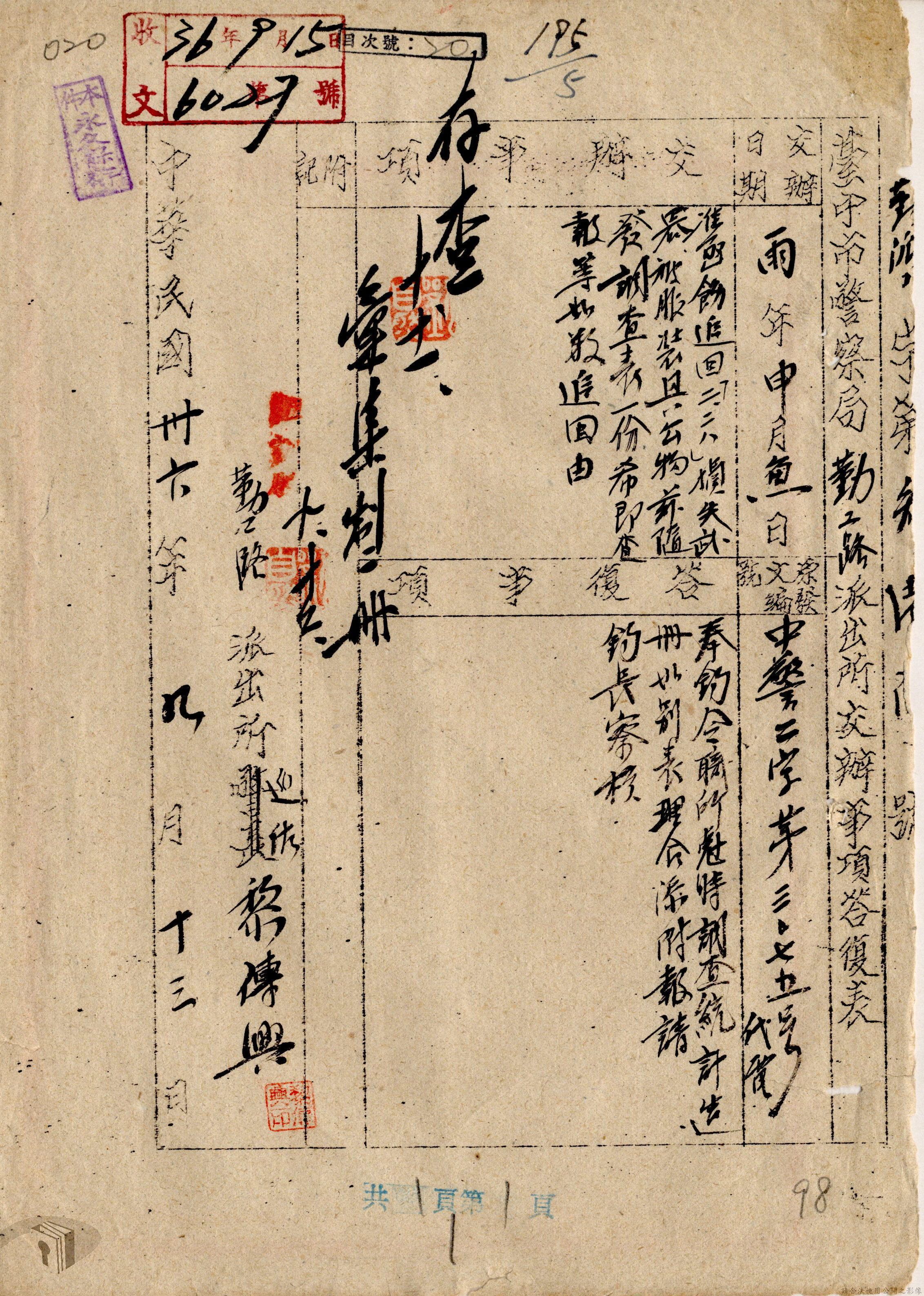本案為36至37年間,臺中市政府警察局將各派出所二二八事件電訊器材、槍械、車輛損失調查表函送臺灣省行政長官公署警務處,並向臺灣省行政長官公署警務處及臺灣省警備司令部陳報有關追回二二八事件中借用槍械及各項公物損失情形。