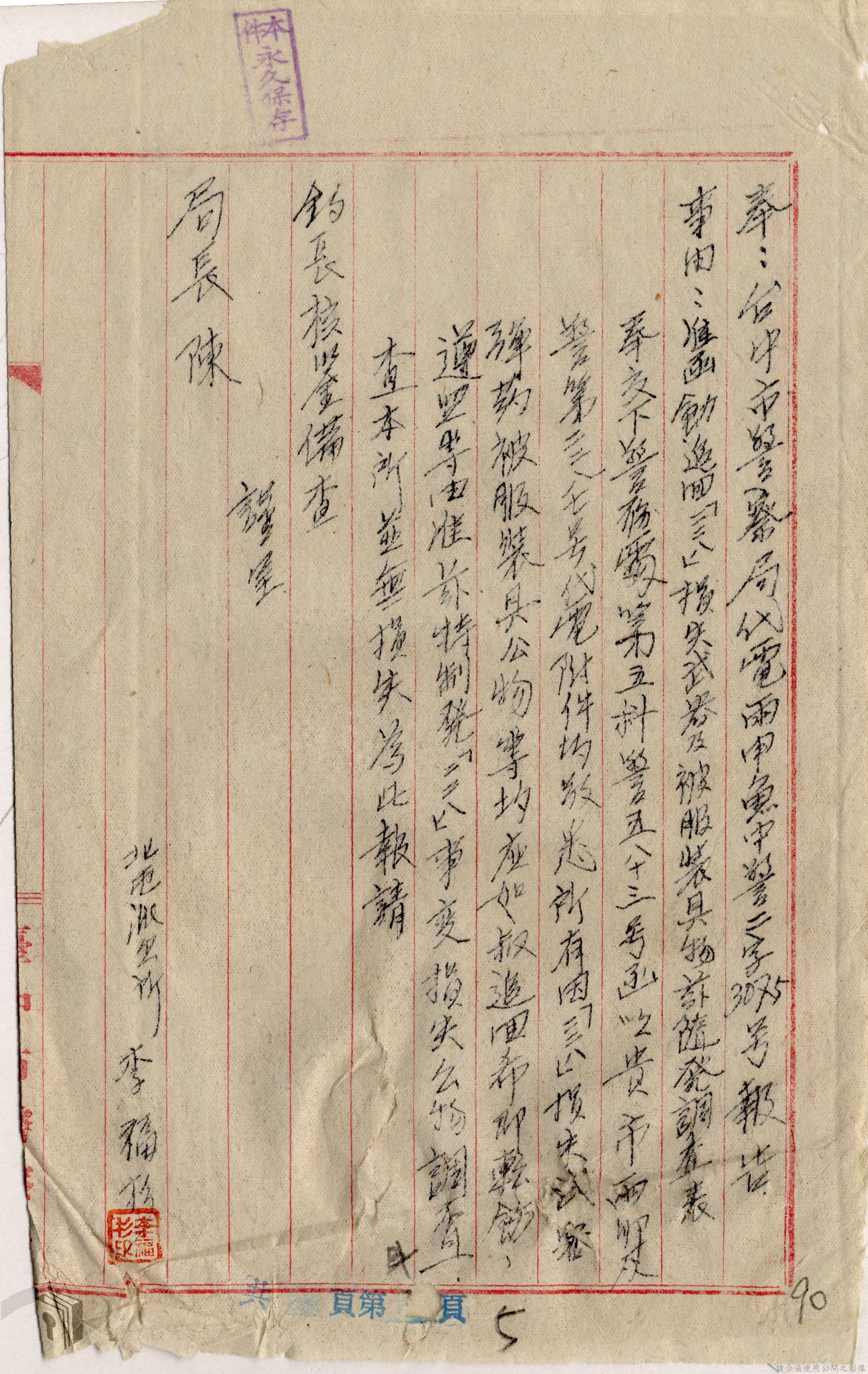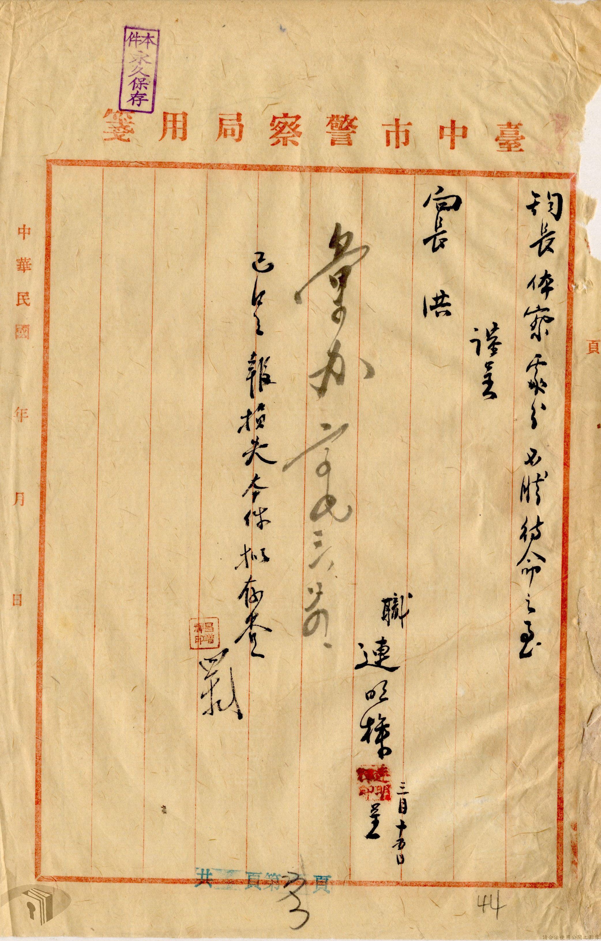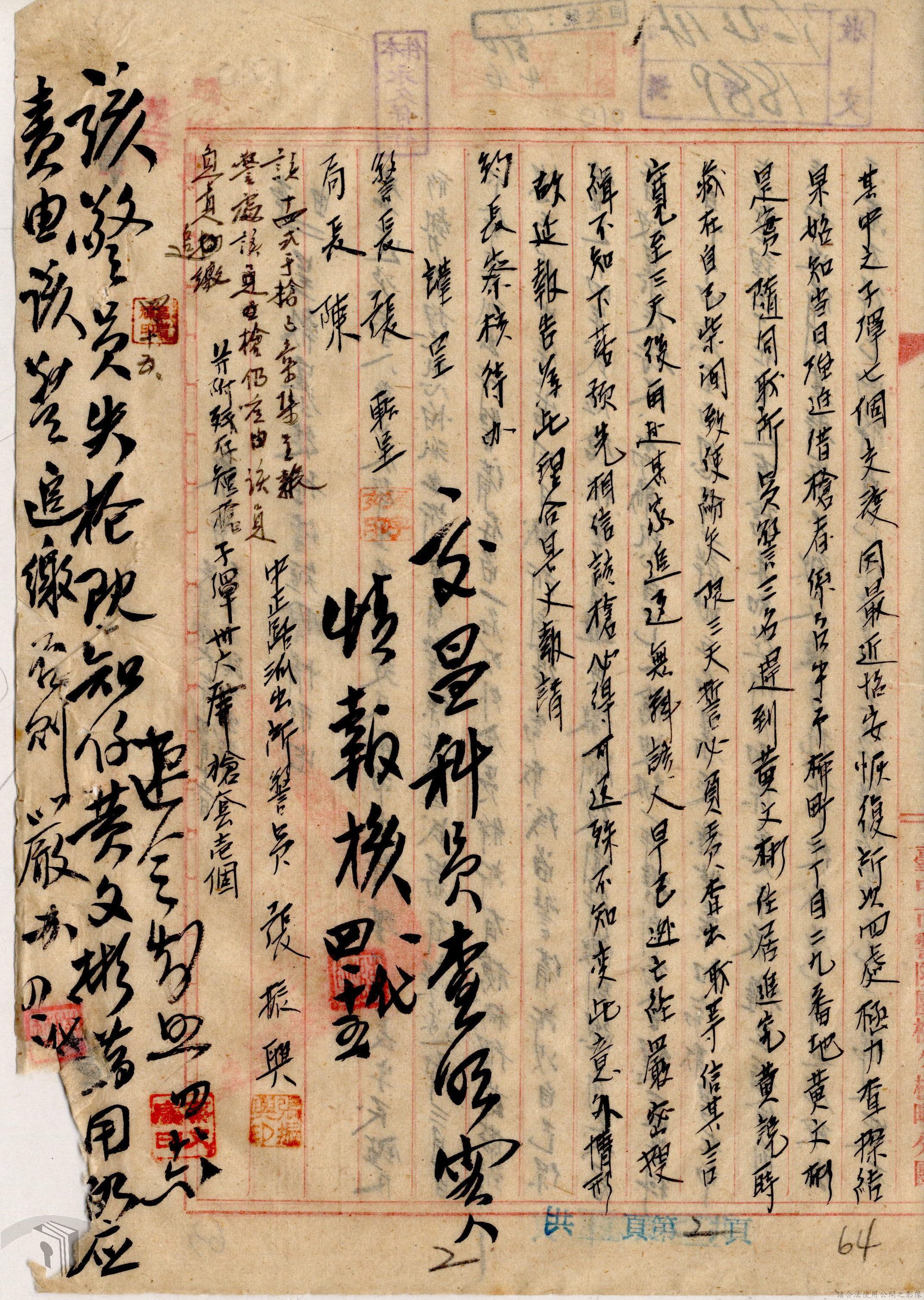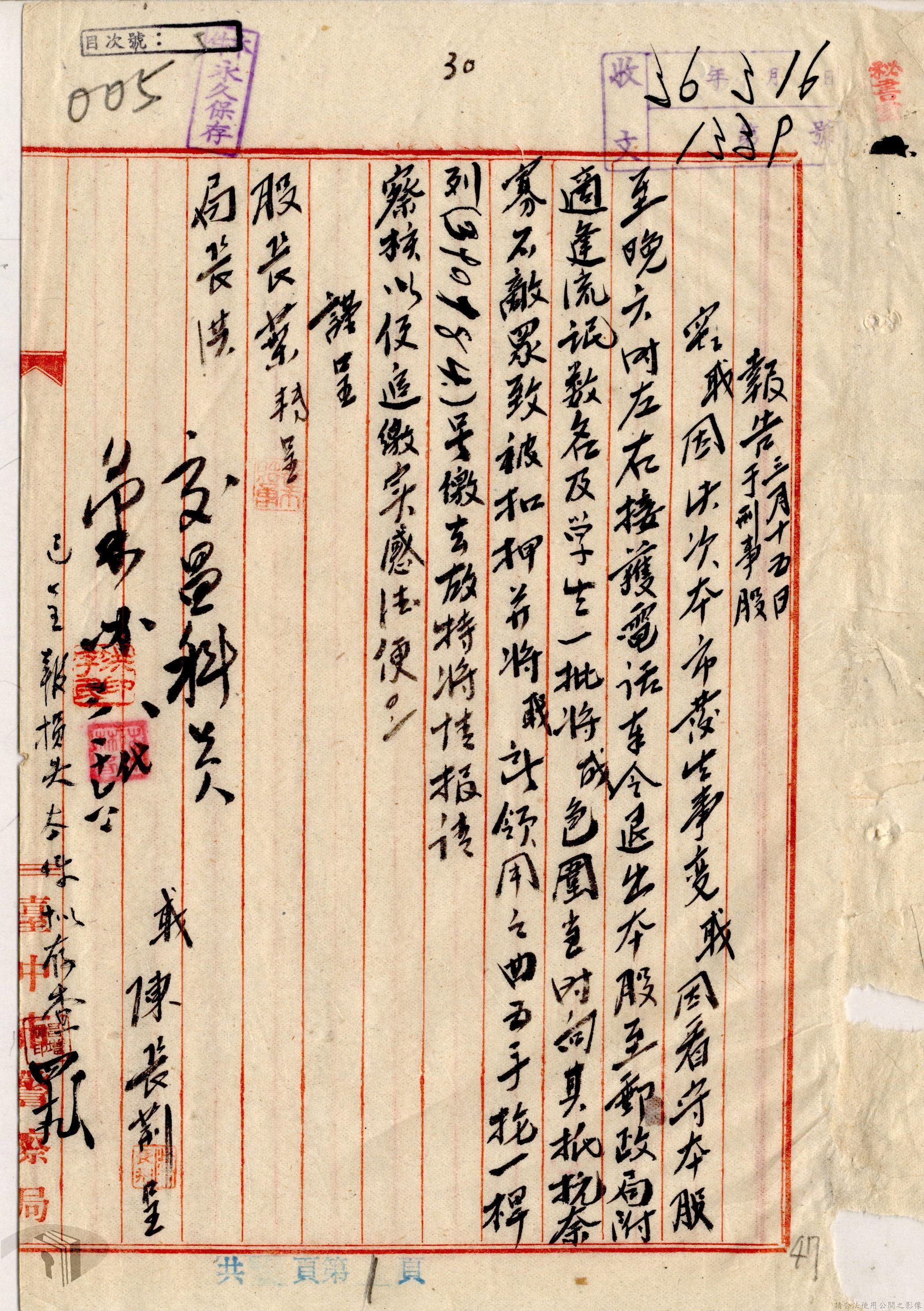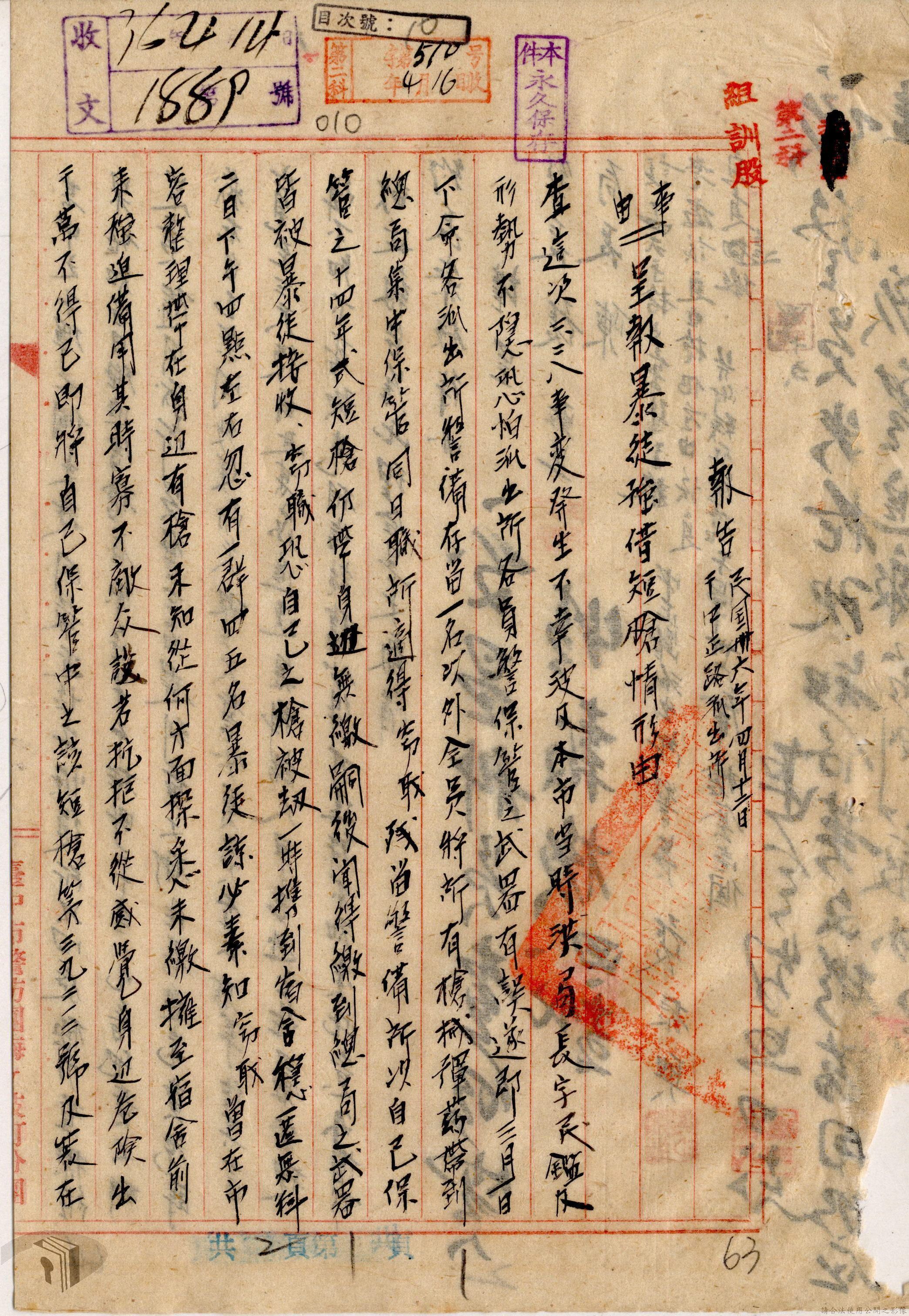 本案為36至37年間,臺中市政府警察局將各派出所二二八事件電訊器材、槍械、車輛損失調查表函送臺灣省行政長官公署警務處,並向臺灣省行政長官公署警務處及臺灣省警備司令部陳報有關追回二二八事件中借用槍械及各項公物損失情形。