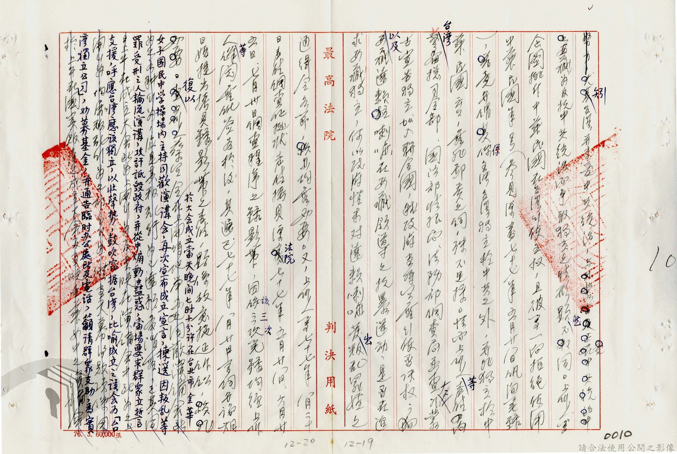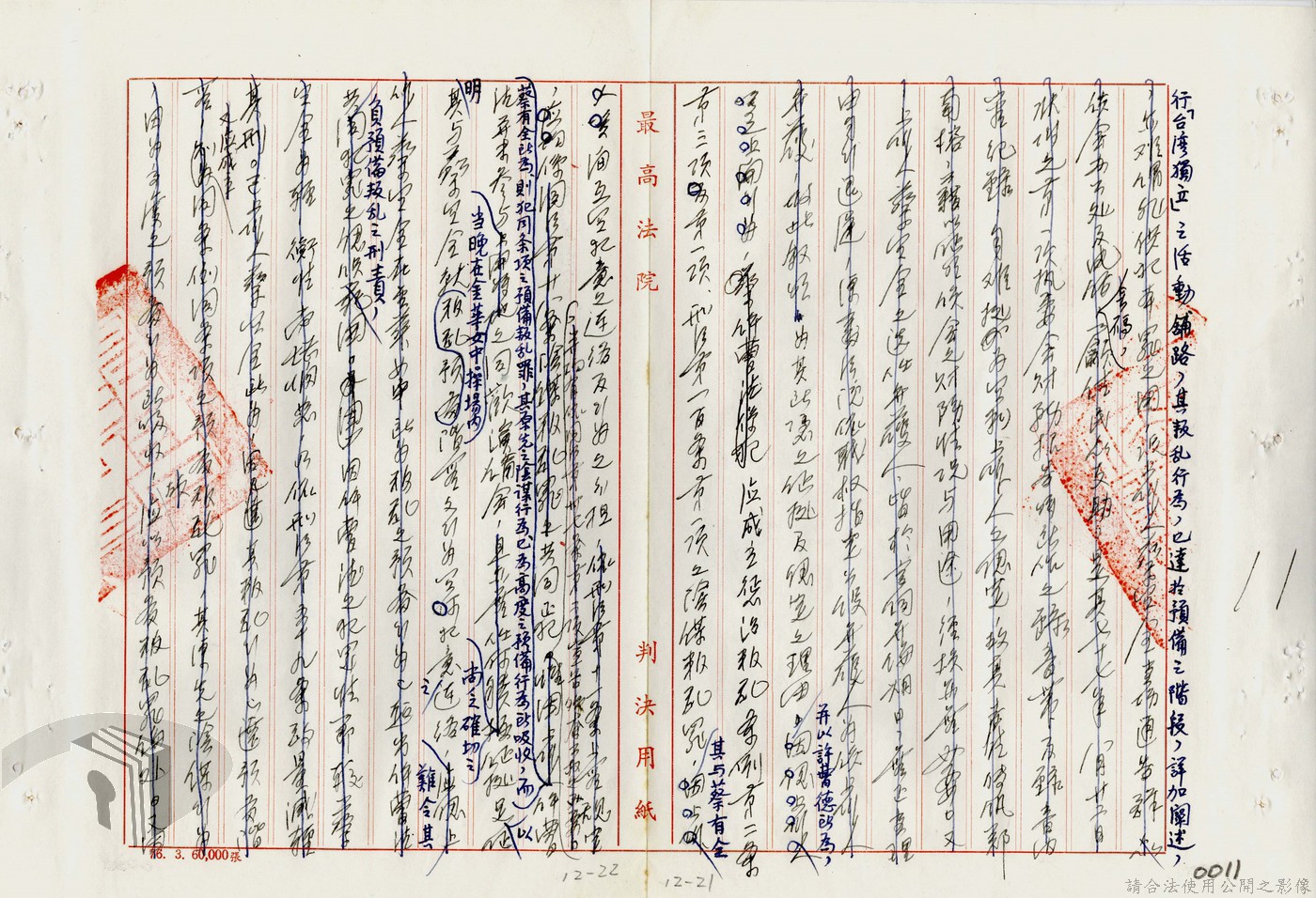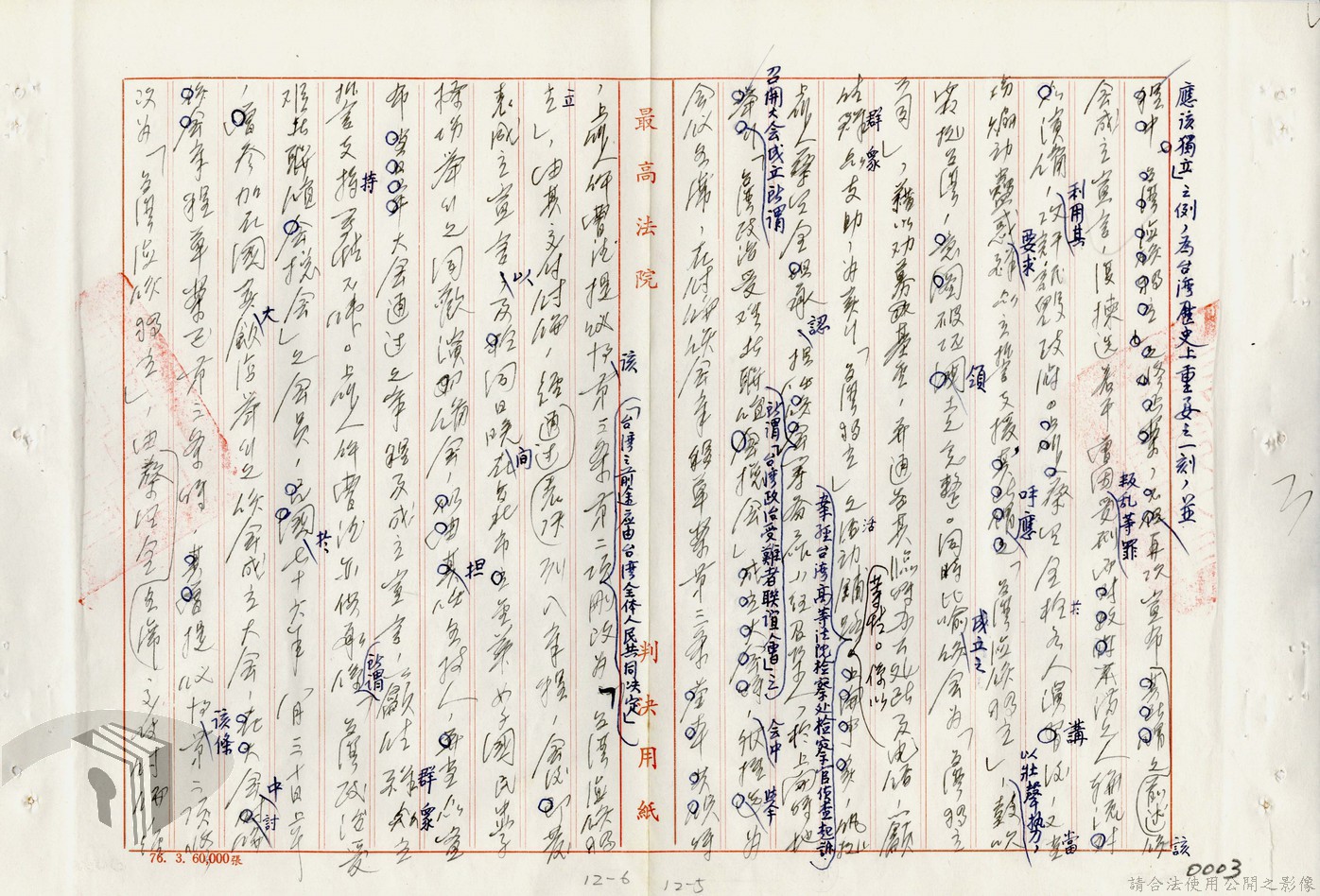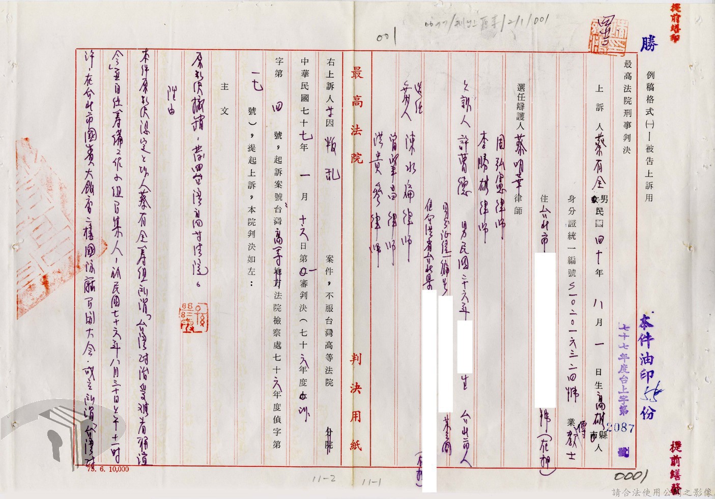 本案為77年間,多名被告因叛亂案件獲臺灣高等法院判決,後被告不服臺灣高等法院之判決結果,而向最高法院提起上訴,後獲最高法院撤銷原判決,發回臺灣高等法院及予以駁回之判決,並附上說明理由。附最高法院判決書。